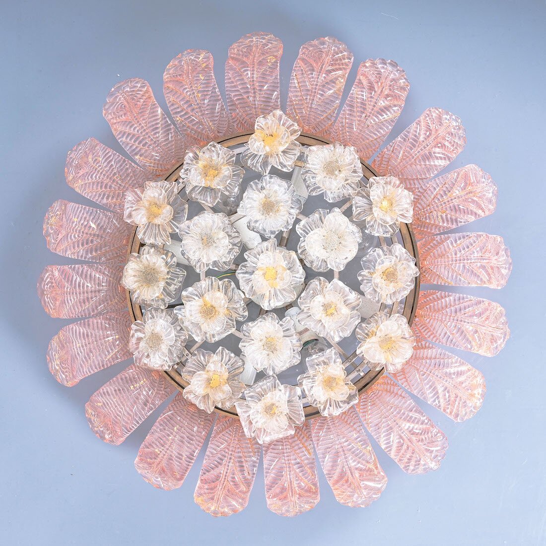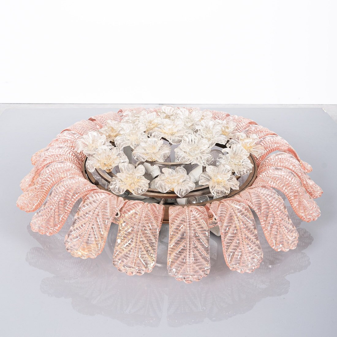Barovier Toso Glass Flower Flush Mount With Pink Leaves, Italy Mid Century