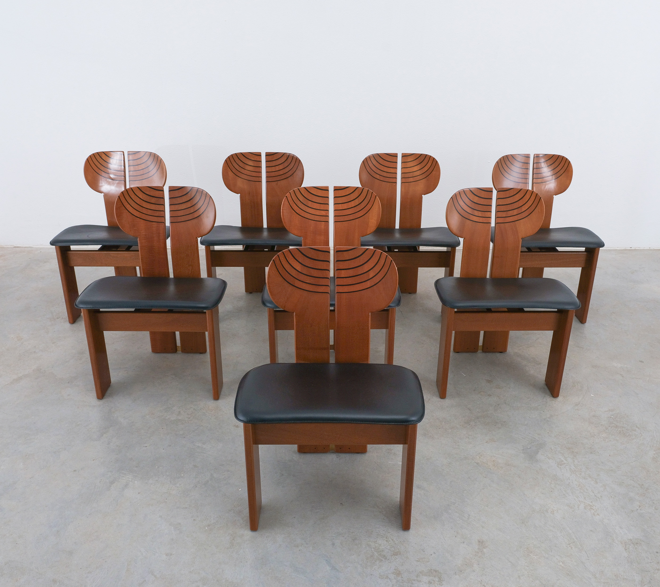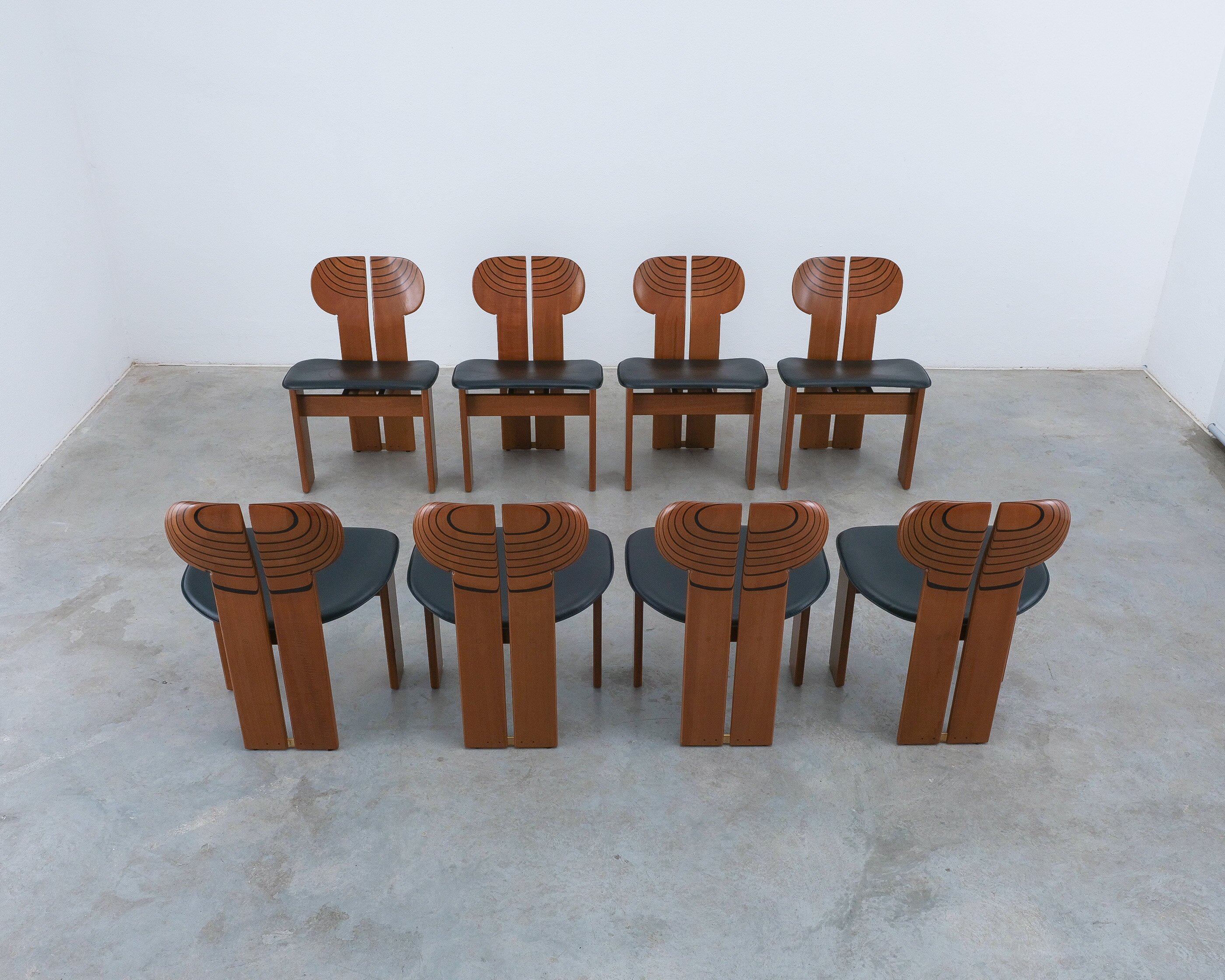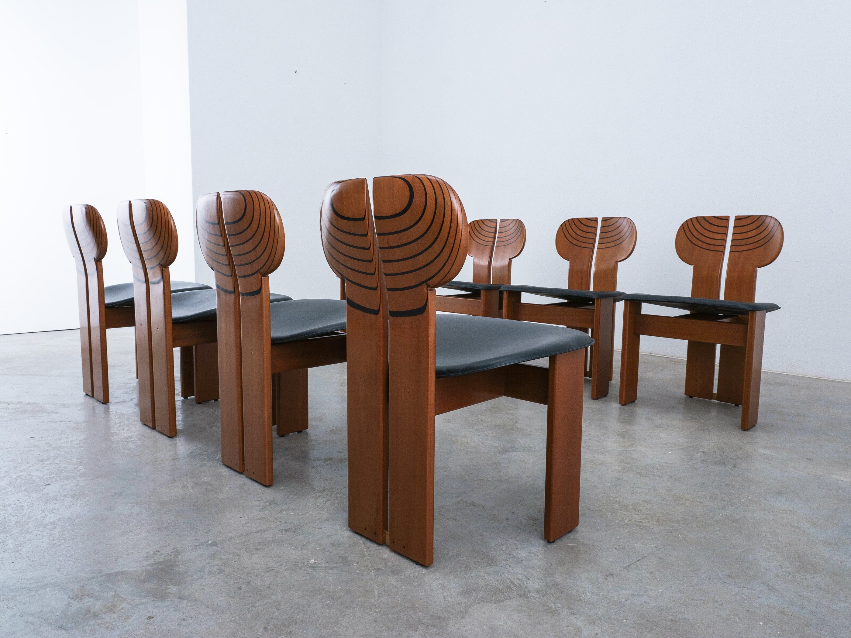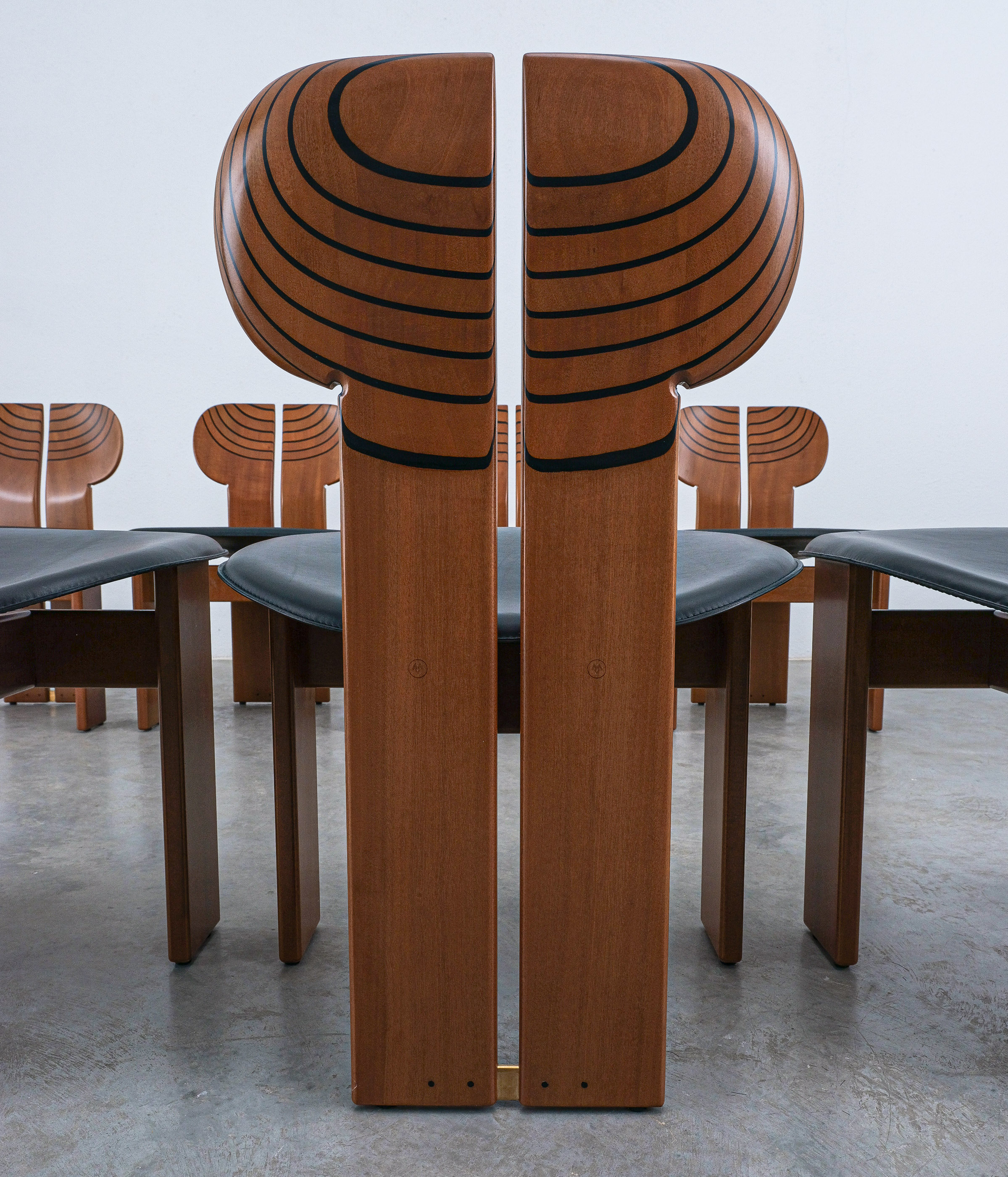 Afra & Tobia Scarpa "Africa" dining chairs for Maxalto, black leather, walnut, brass, Italy, circa 1975-1980, set of eight. Very good original condition.