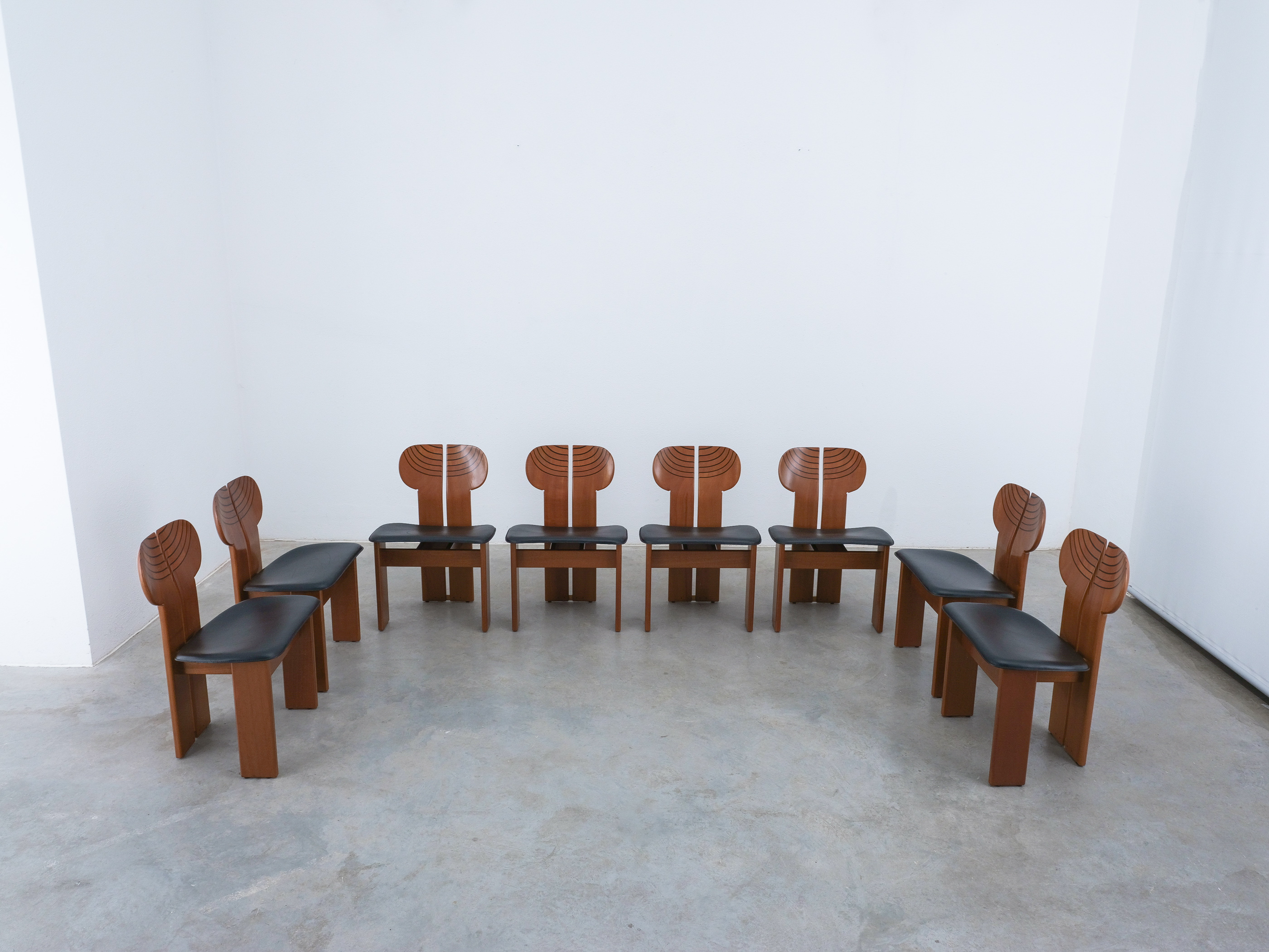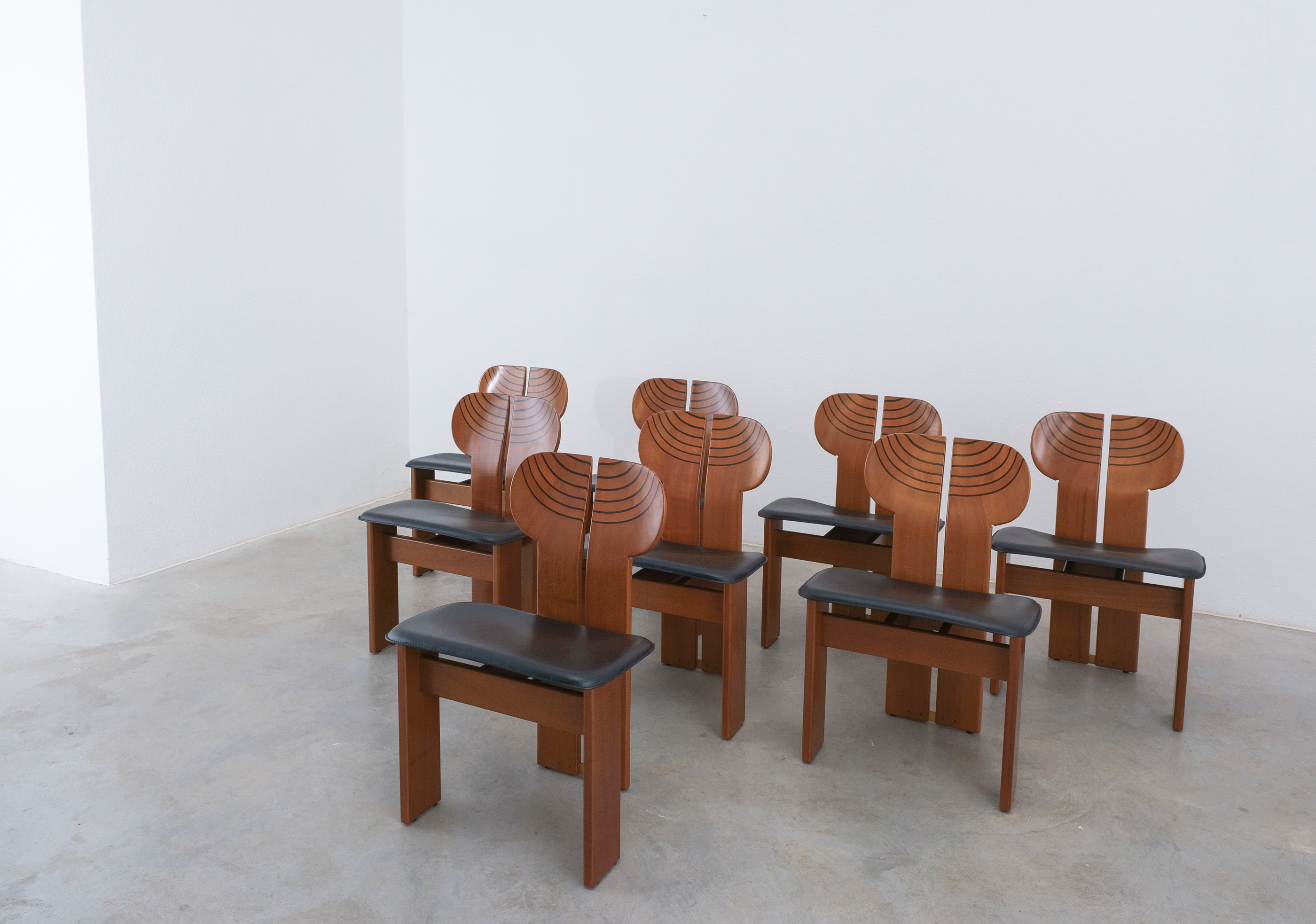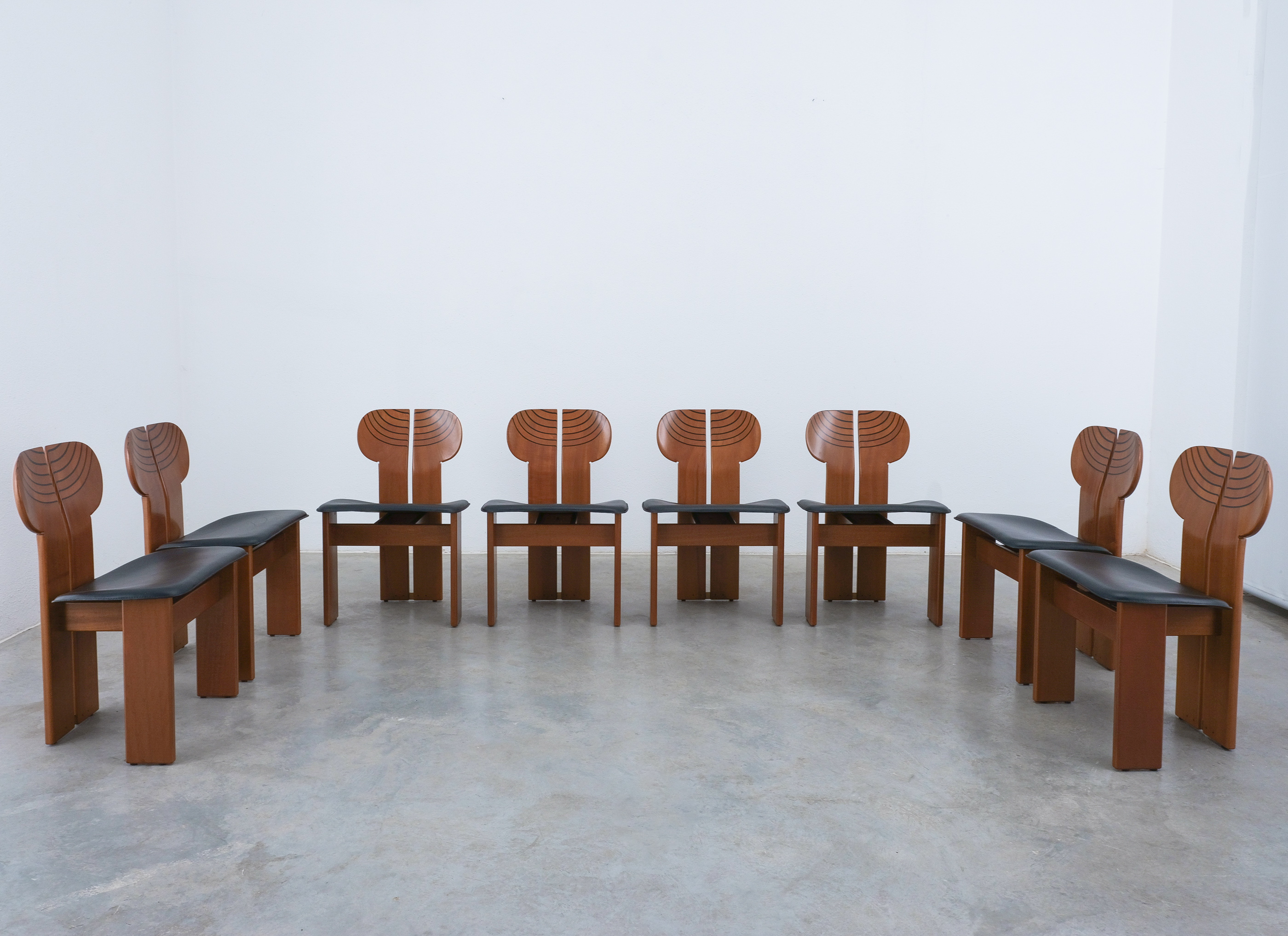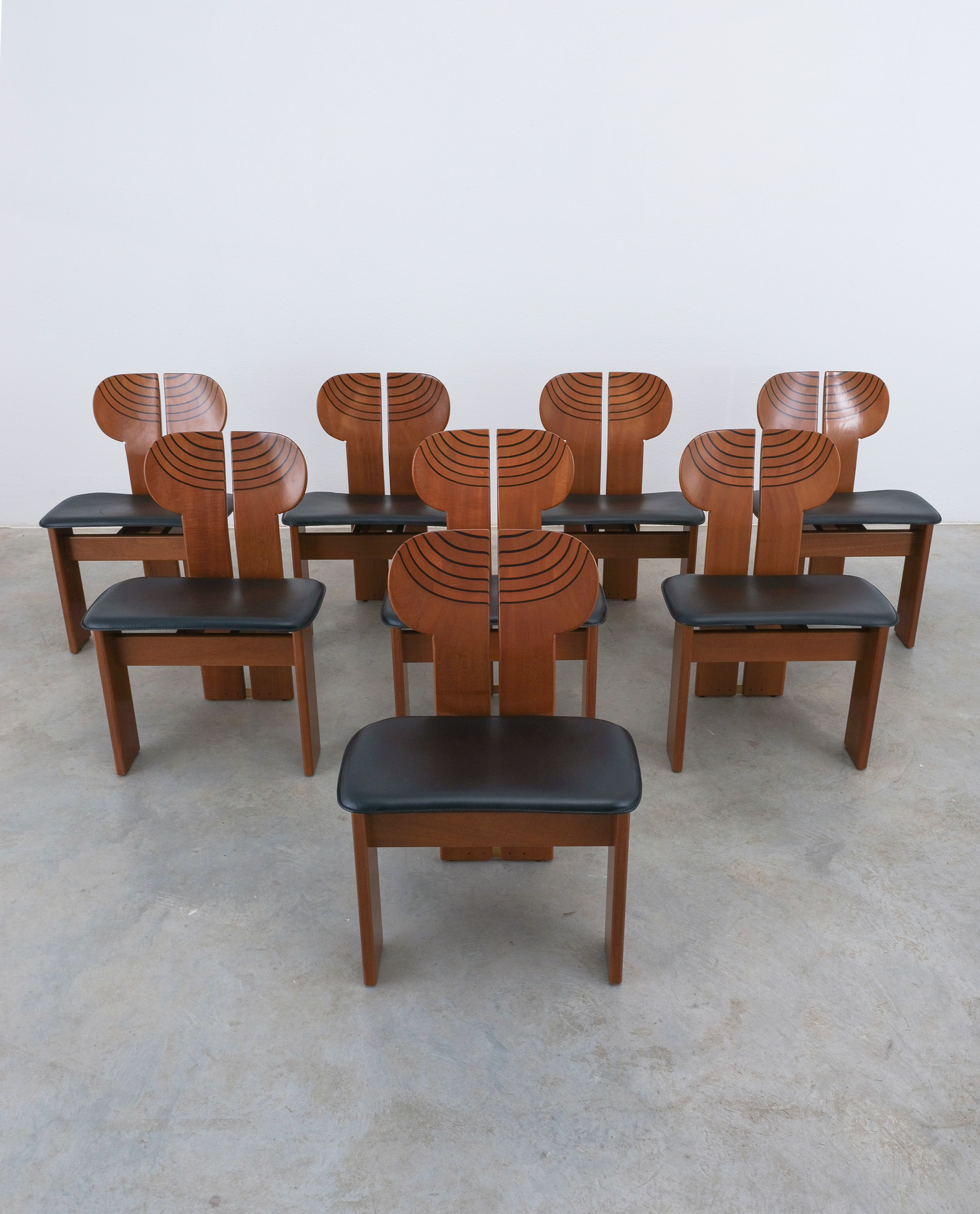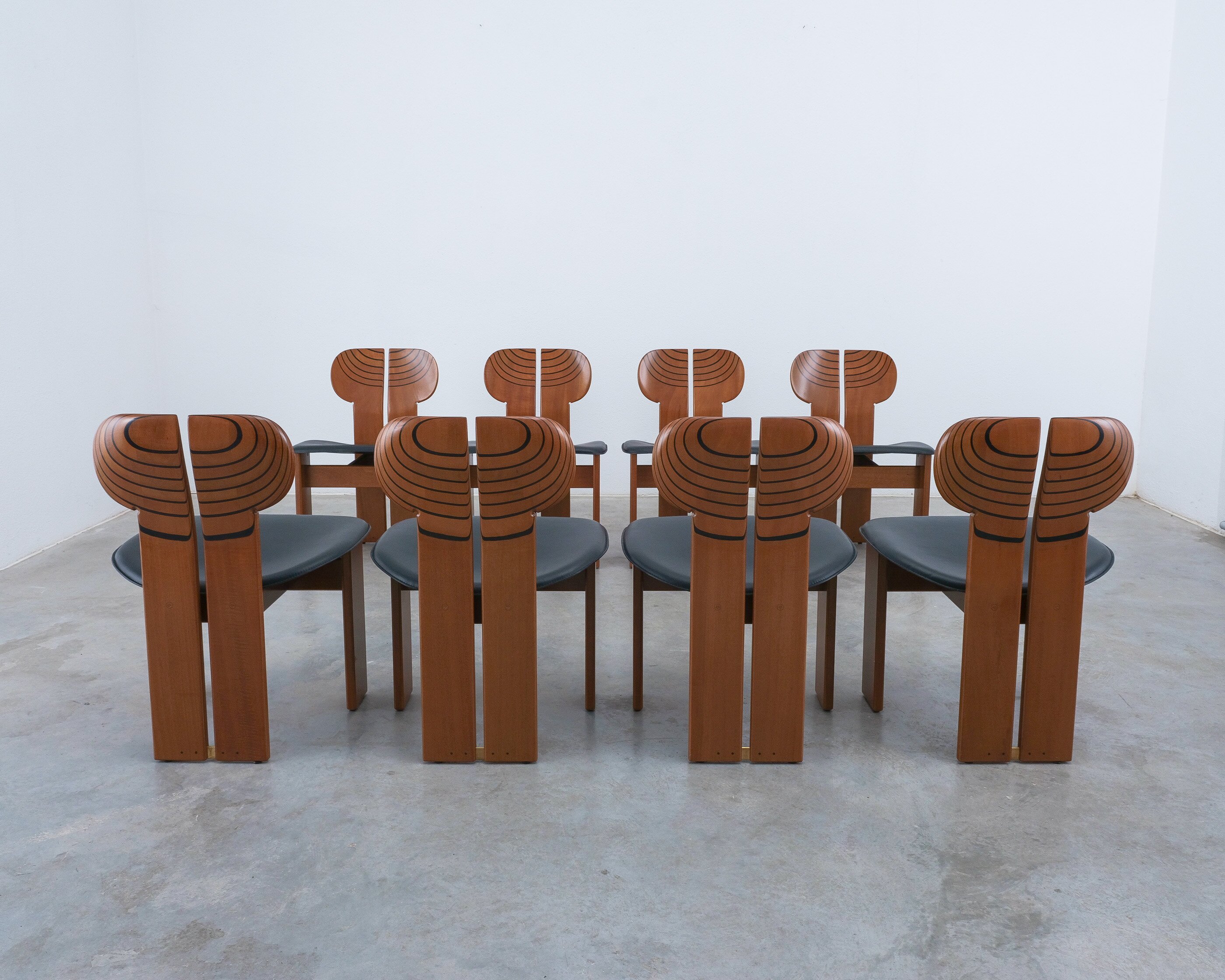 Afra & Tobia Scarpa "Africa" dining chairs for Maxalto, black leather, walnut, brass, Italy, circa 1975-1980, set of eight. Very good original condition.
