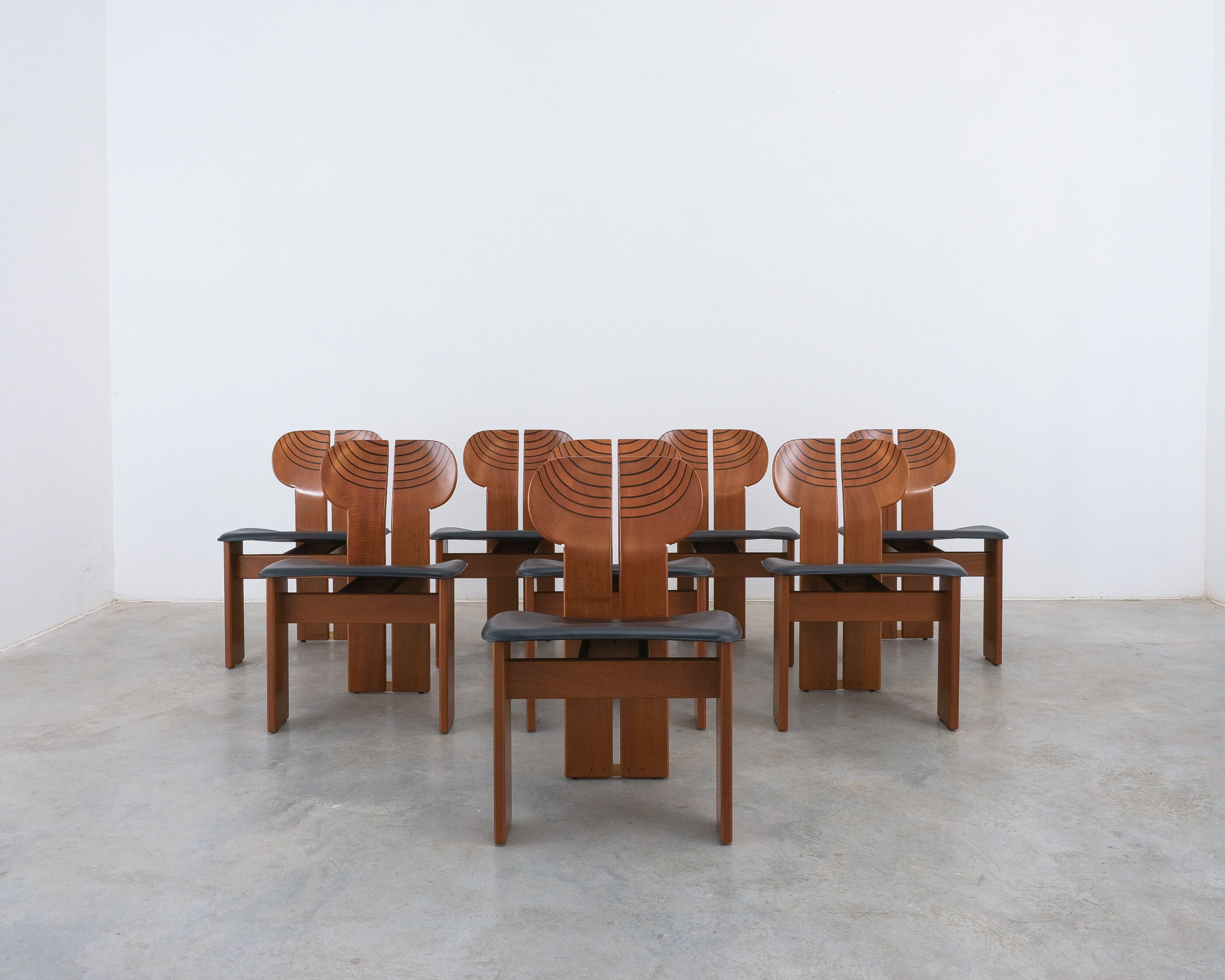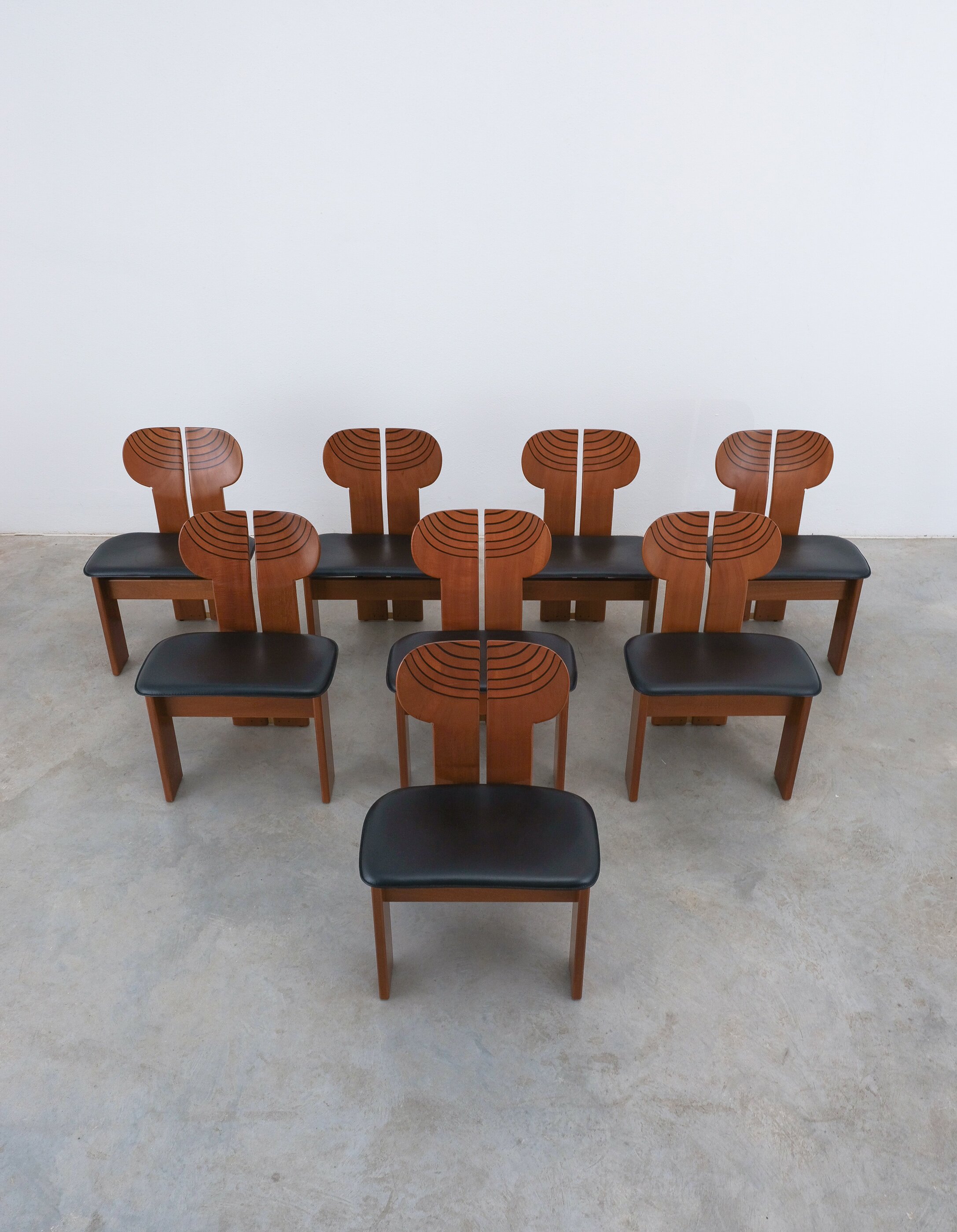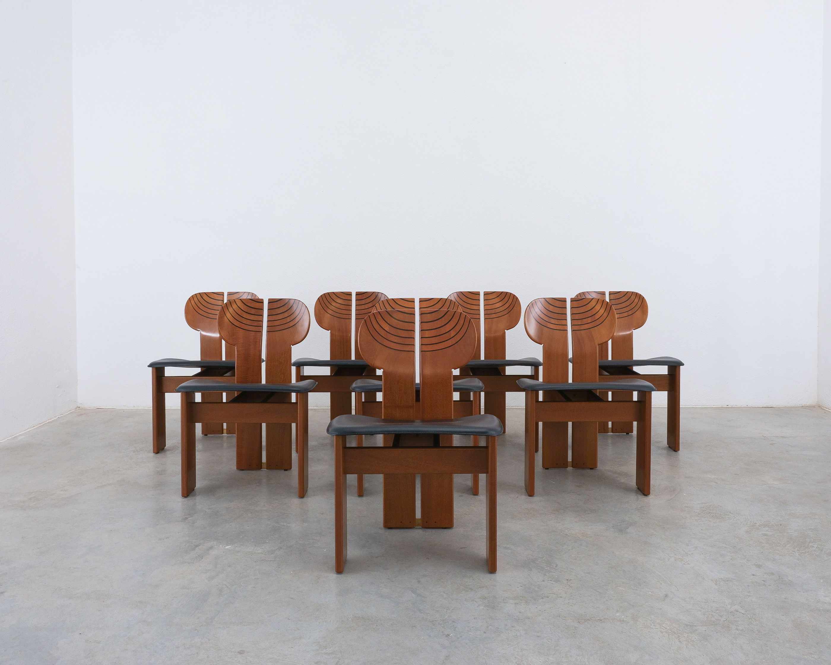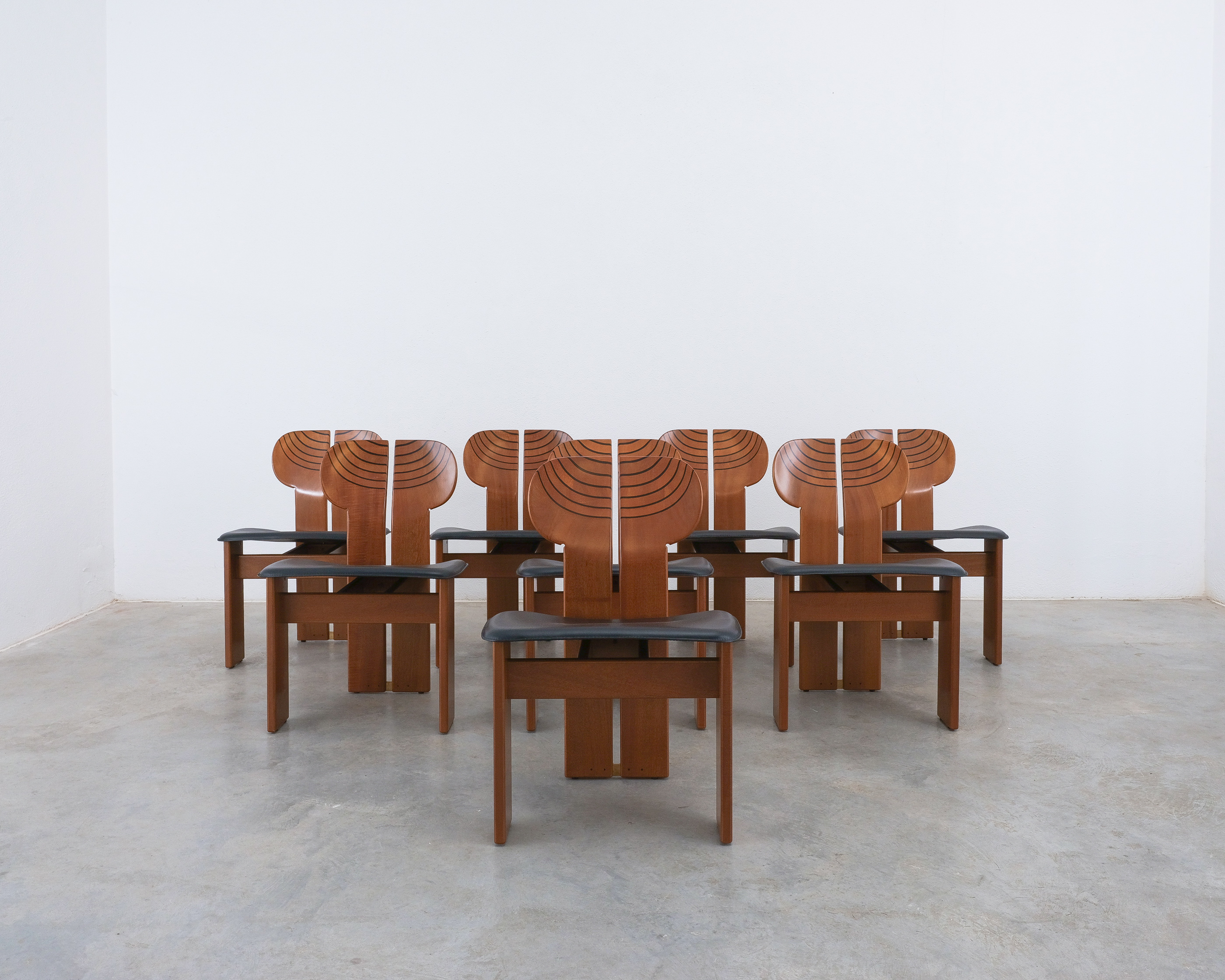 Afra & Tobia Scarpa "Africa" dining chairs for Maxalto, black leather, walnut, brass, Italy, circa 1975-1980, set of eight. Very good original condition.