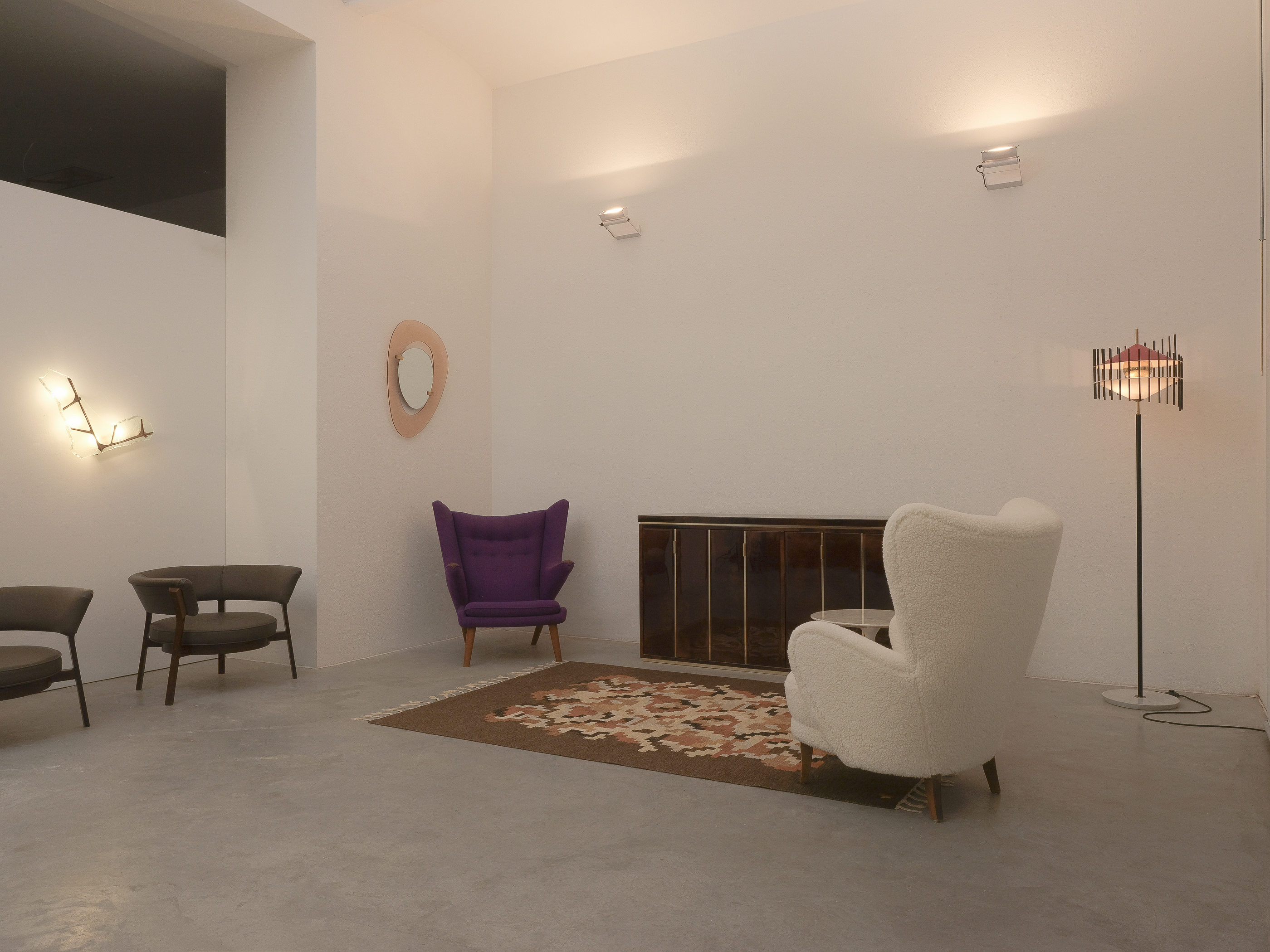 - Polished Brass, Lacquered Aluminum, Blackened Brass, Acrylic, Marble