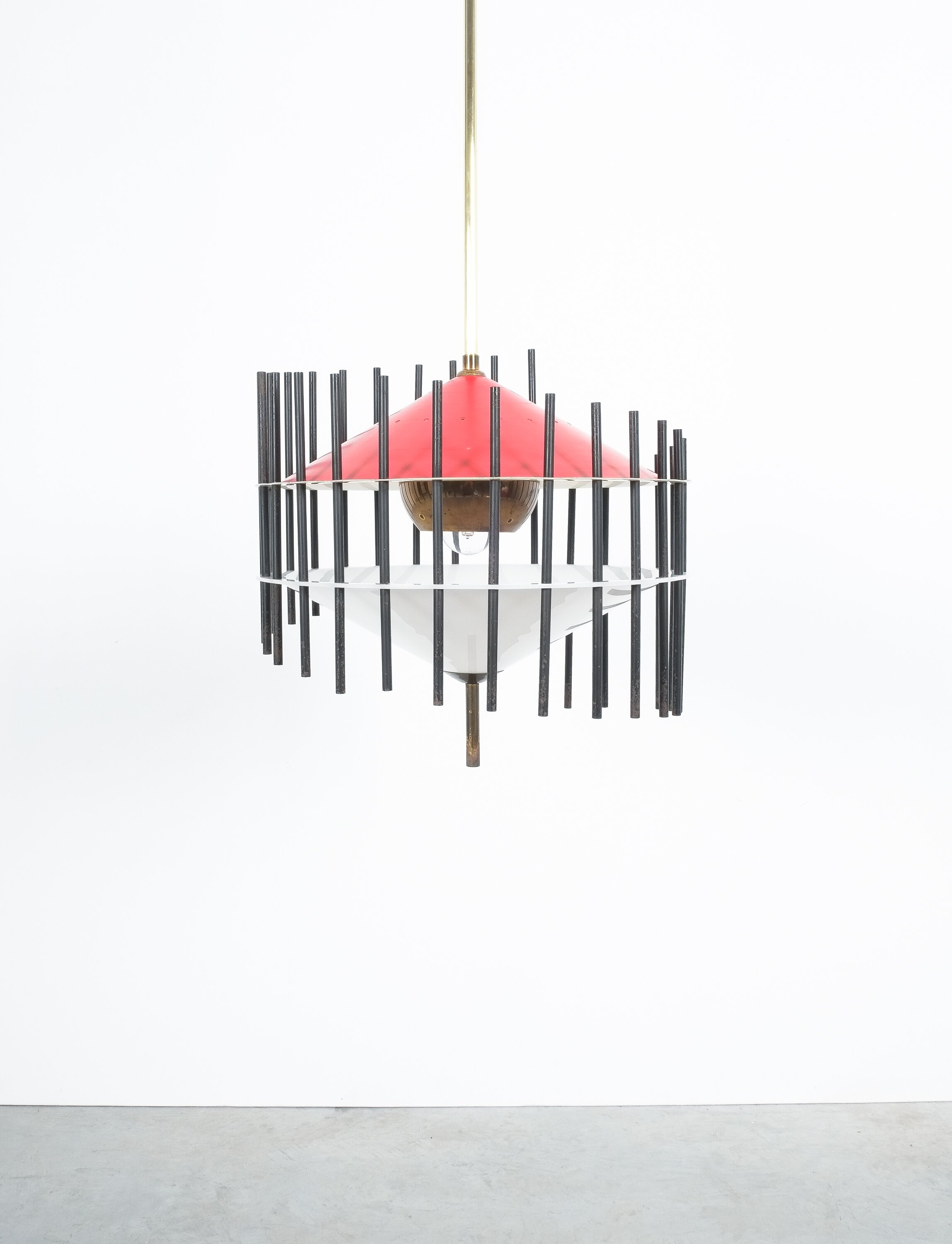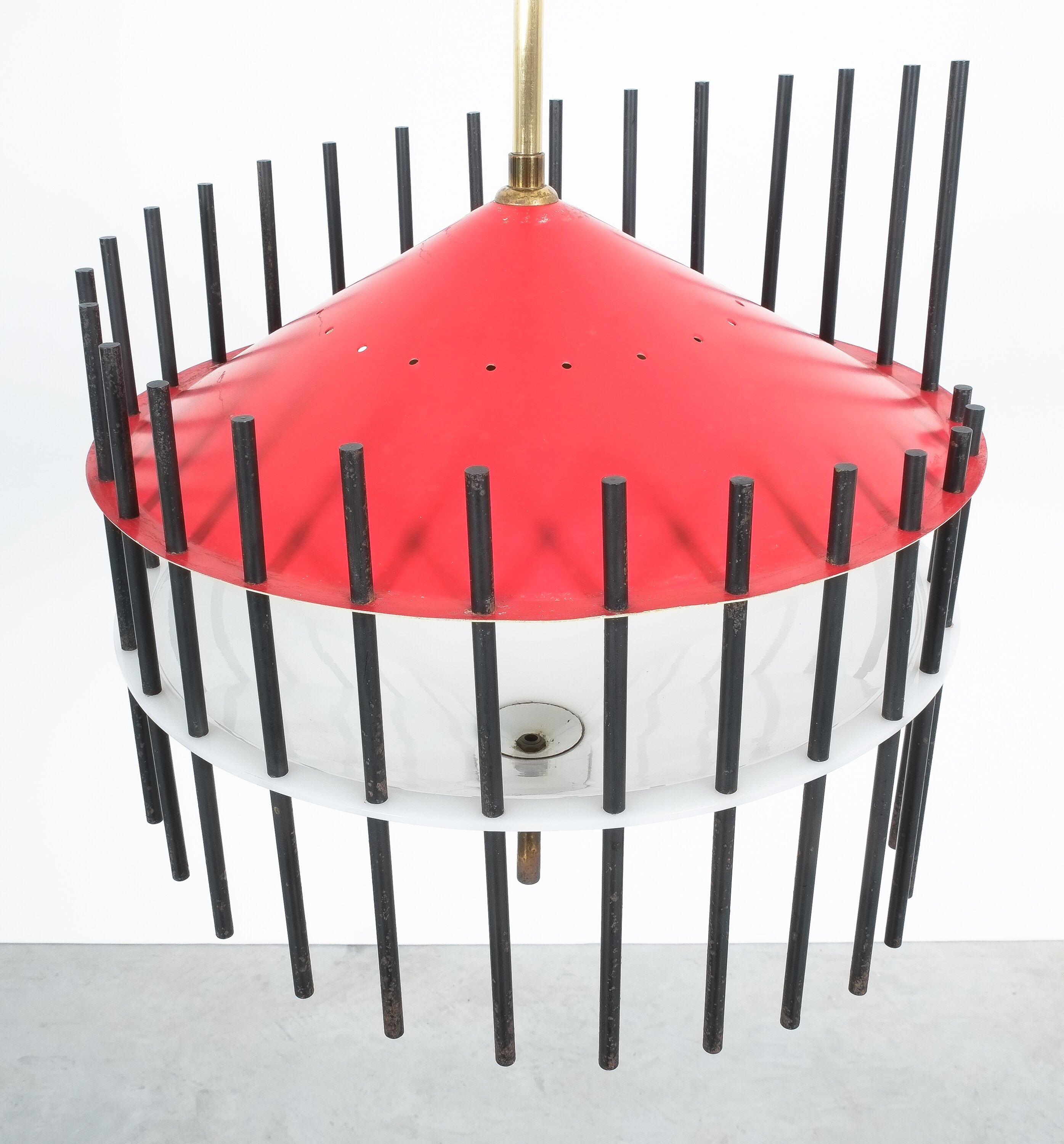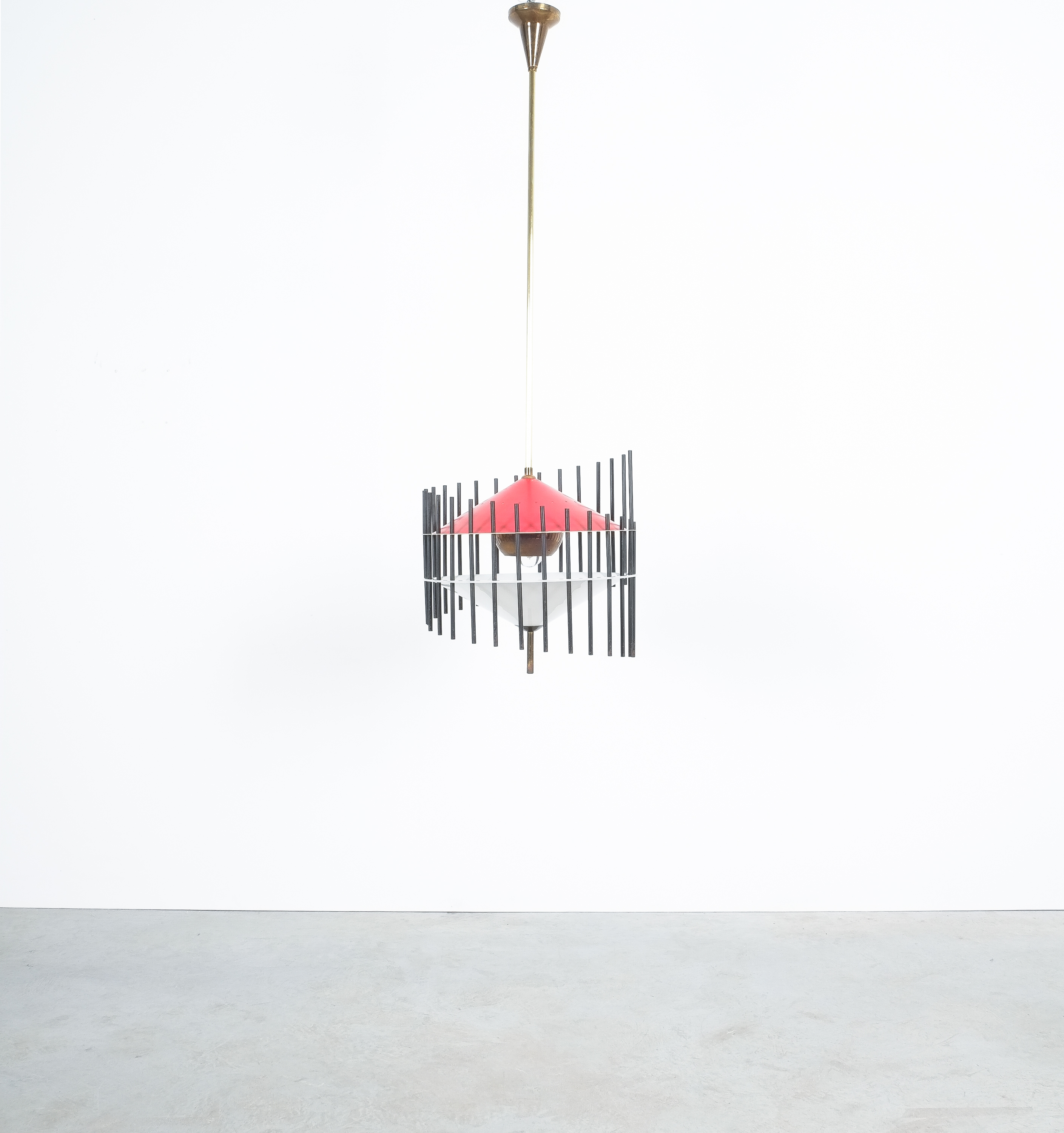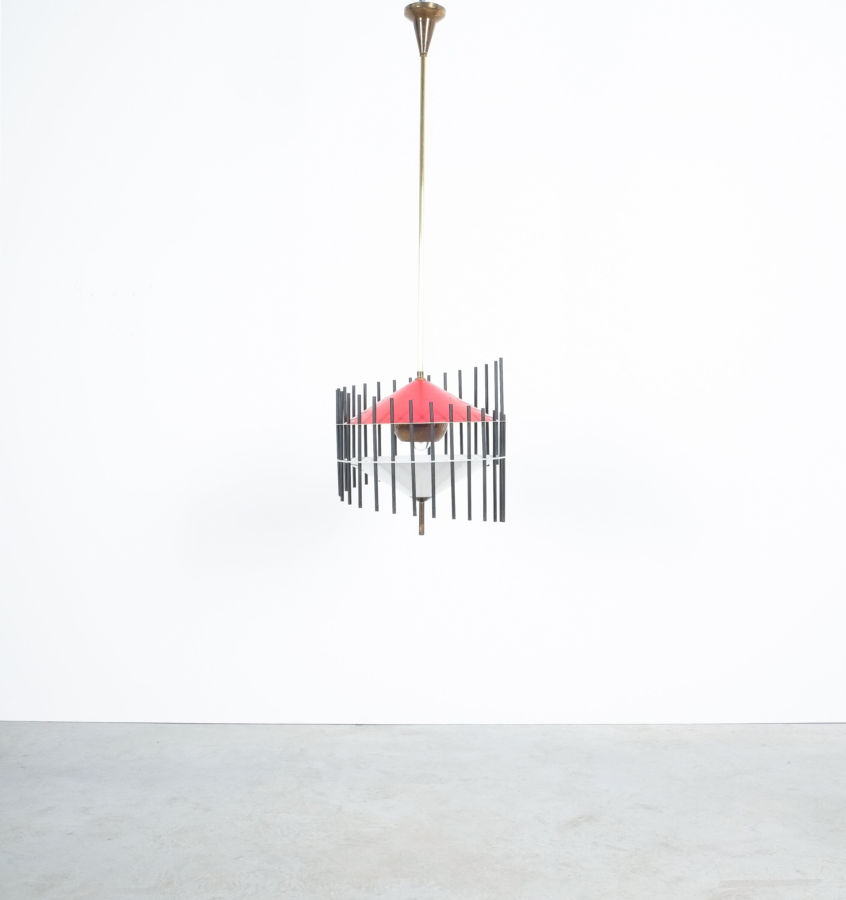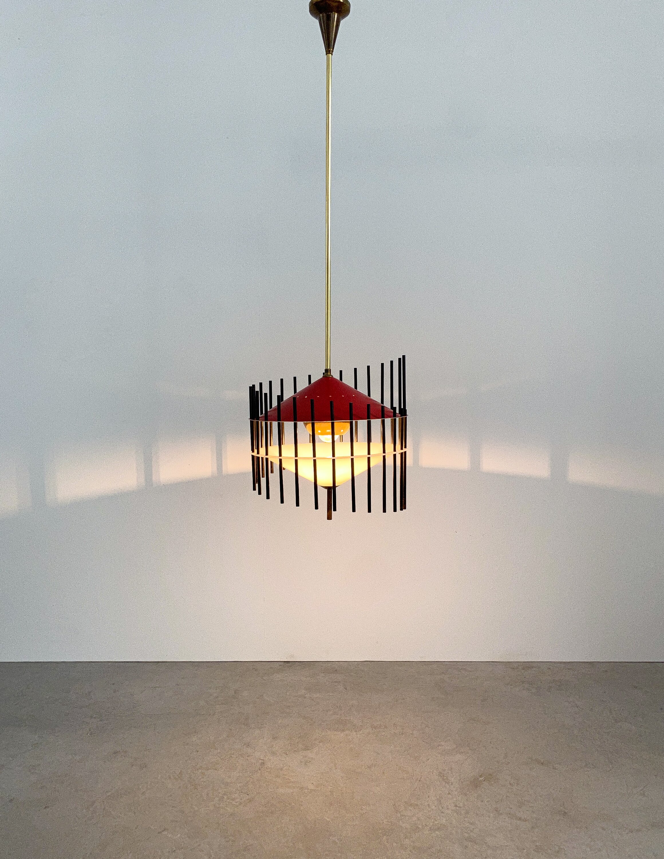 A rare masterpiece by Angelo Brotto comprised of brass, red painted aluminum, colored iron and acrylic diffuser. Delicately designed and constructed. It's in good, cleaned condition, newly rewired, featuring one bulb e26/27 max wattage 100W. The red shade shows wear commensurate with age so does the black iron tubes, the brass parts show the original patina. Generally in very good original condition with no major flaws. We can replace the ceiling rod with a cable if that is desired. We can also customize the height easily.