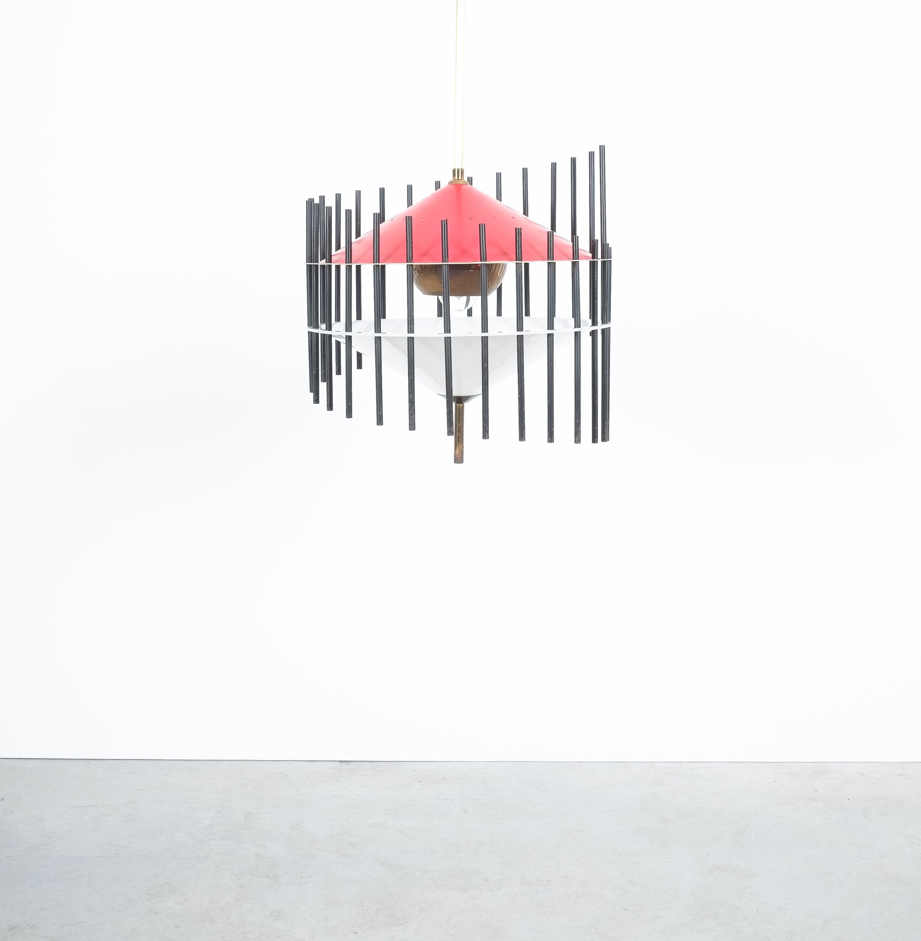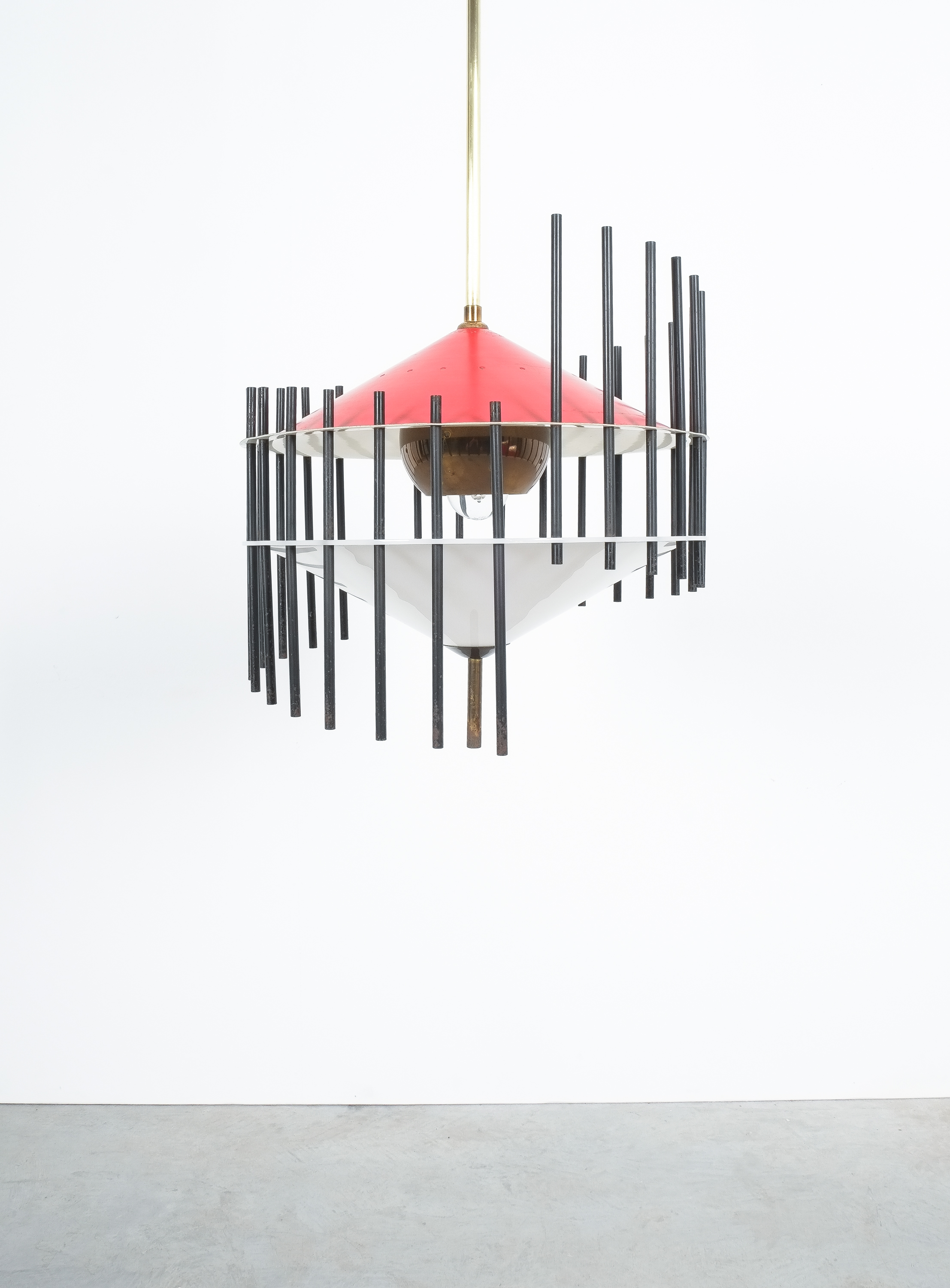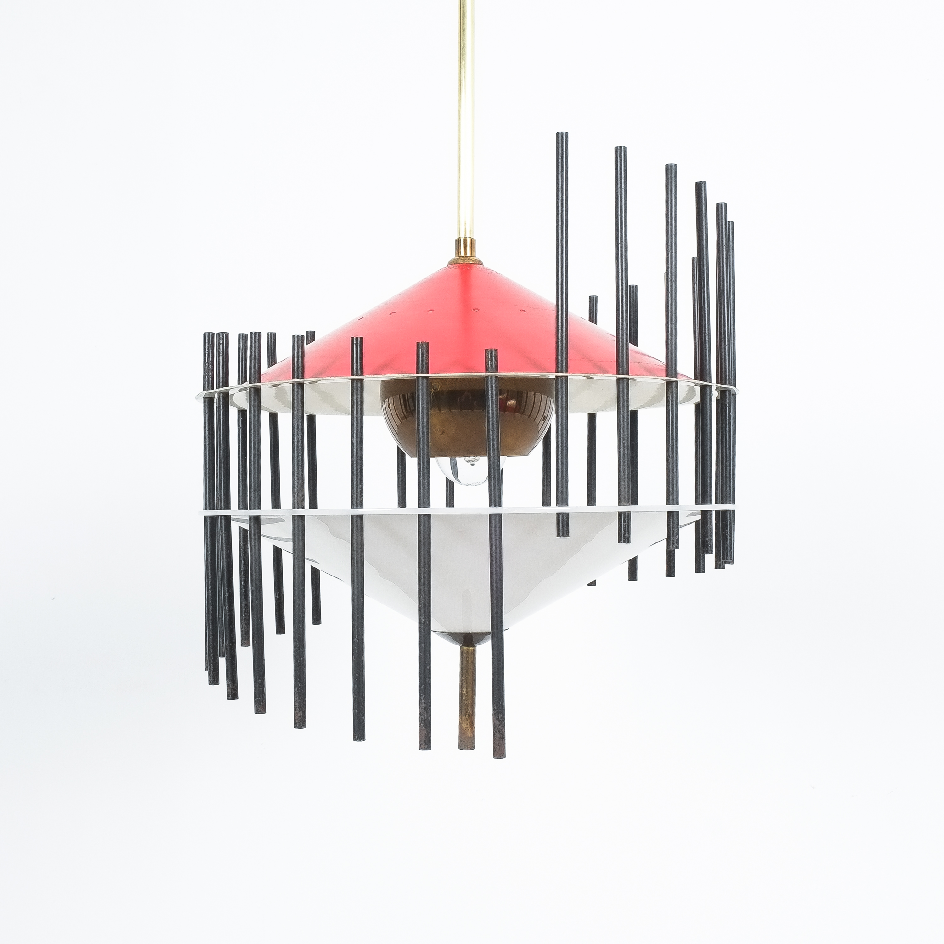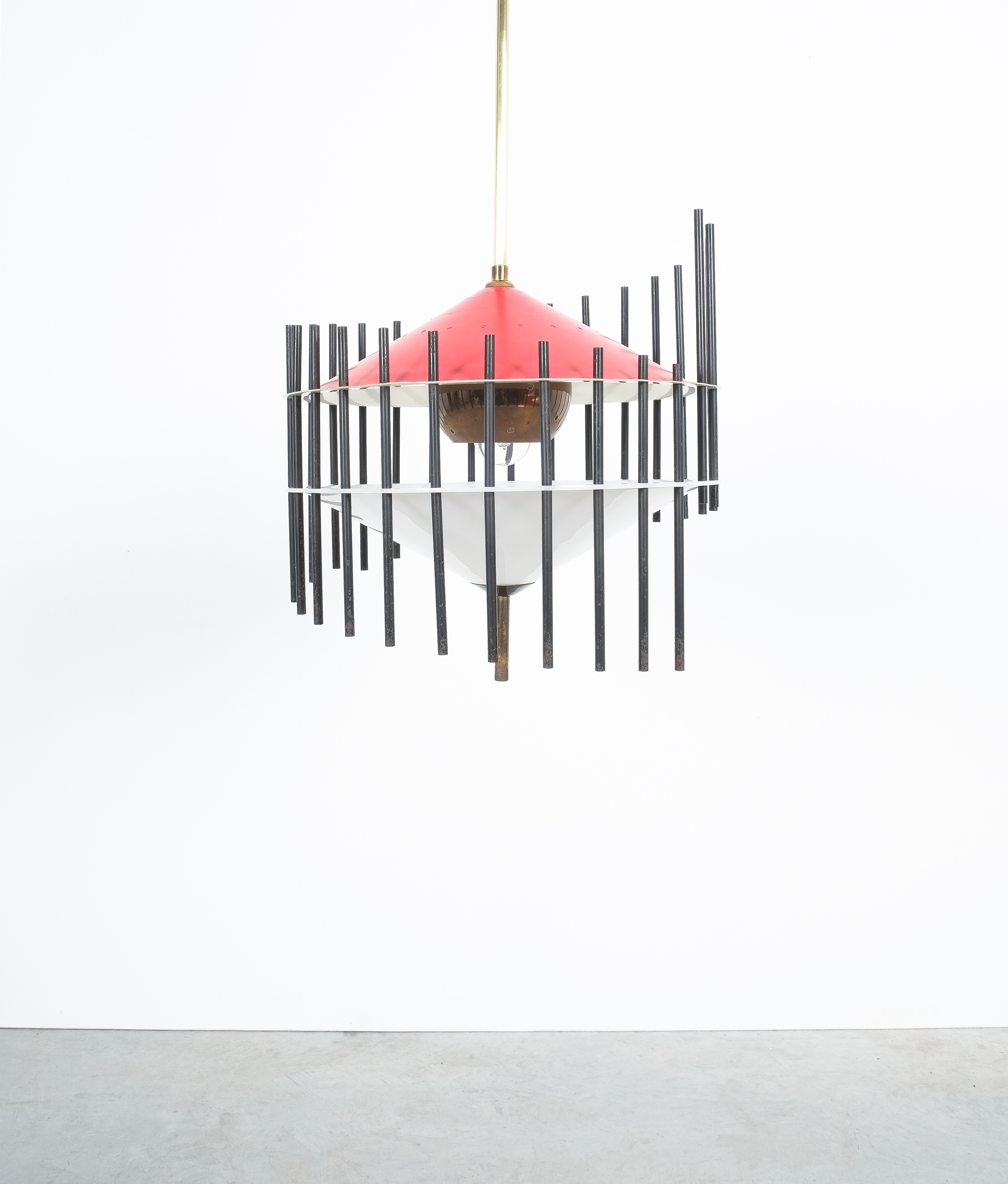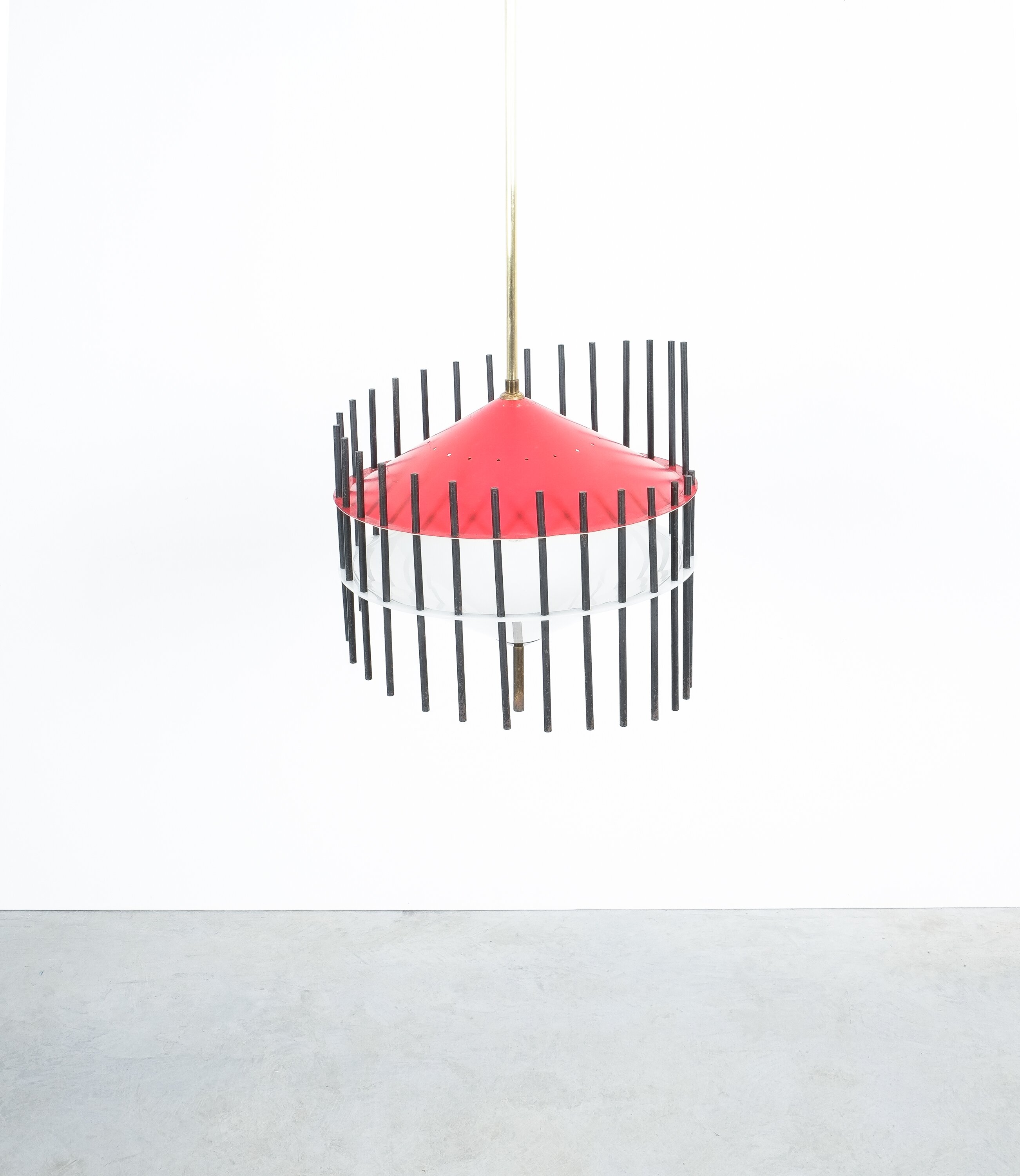 A rare masterpiece by Angelo Brotto comprised of brass, red painted aluminum, colored iron and acrylic diffuser. Delicately designed and constructed. It's in good, cleaned condition, newly rewired, featuring one bulb e26/27 max wattage 100W. The red shade shows wear commensurate with age so does the black iron tubes, the brass parts show the original patina. Generally in very good original condition with no major flaws. We can replace the ceiling rod with a cable if that is desired. We can also customize the height easily.