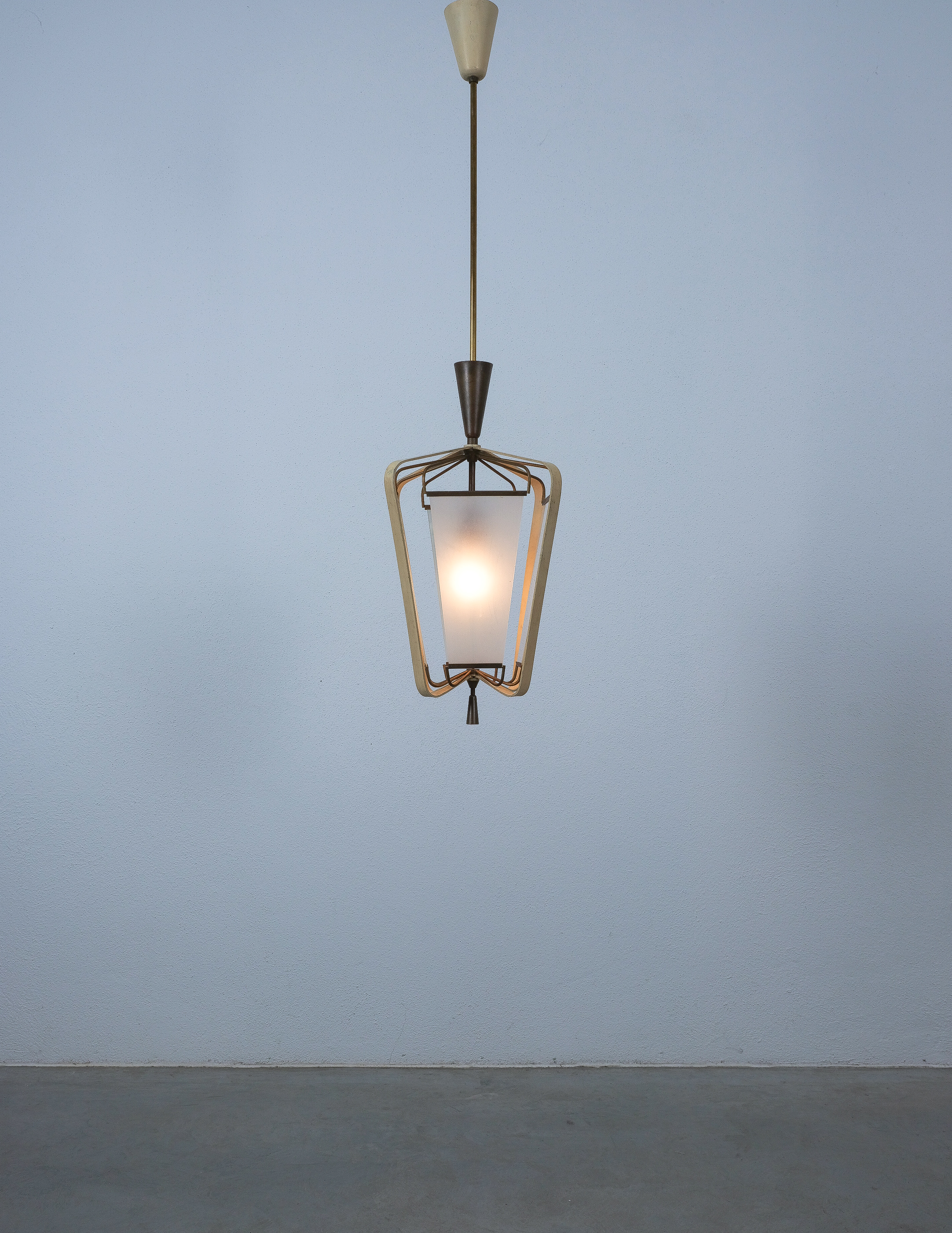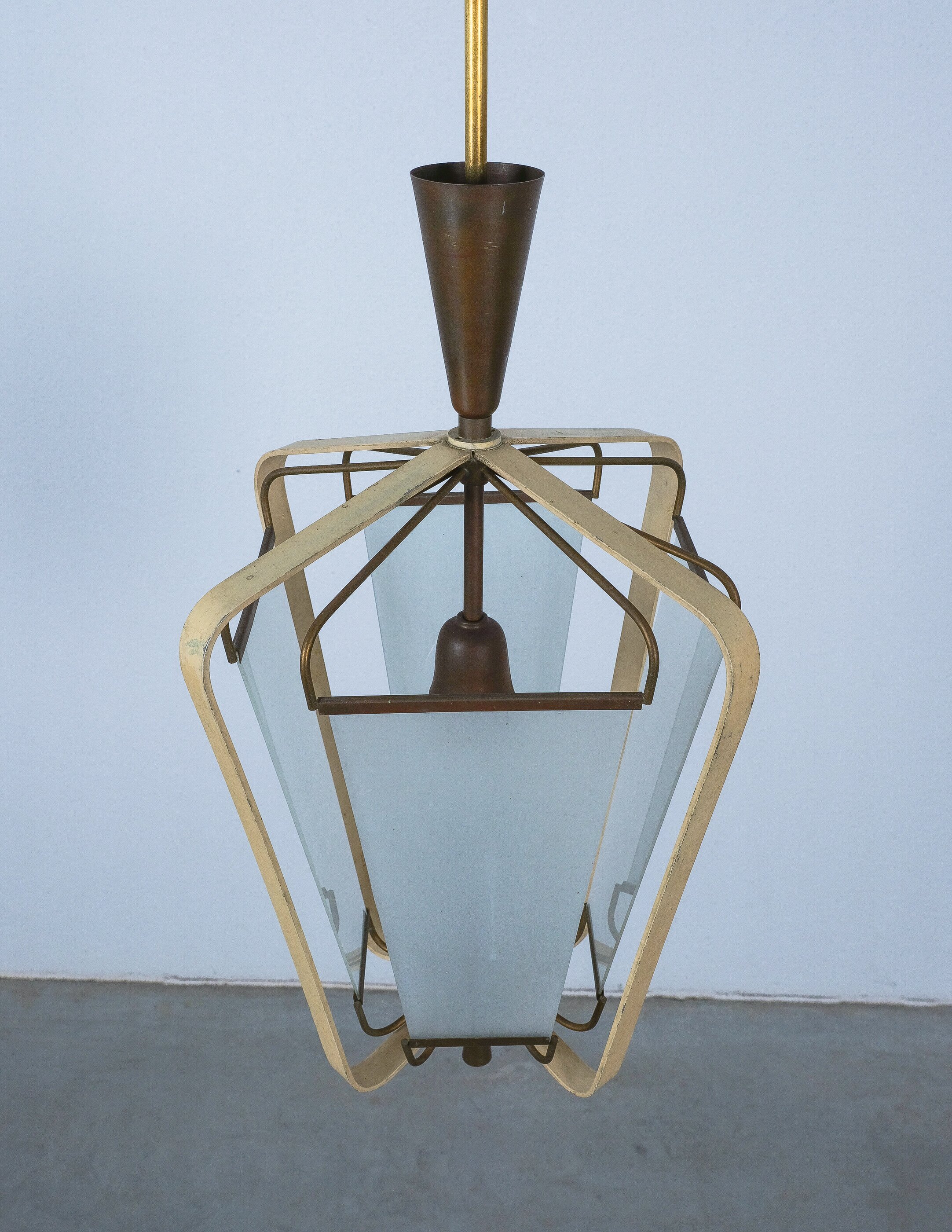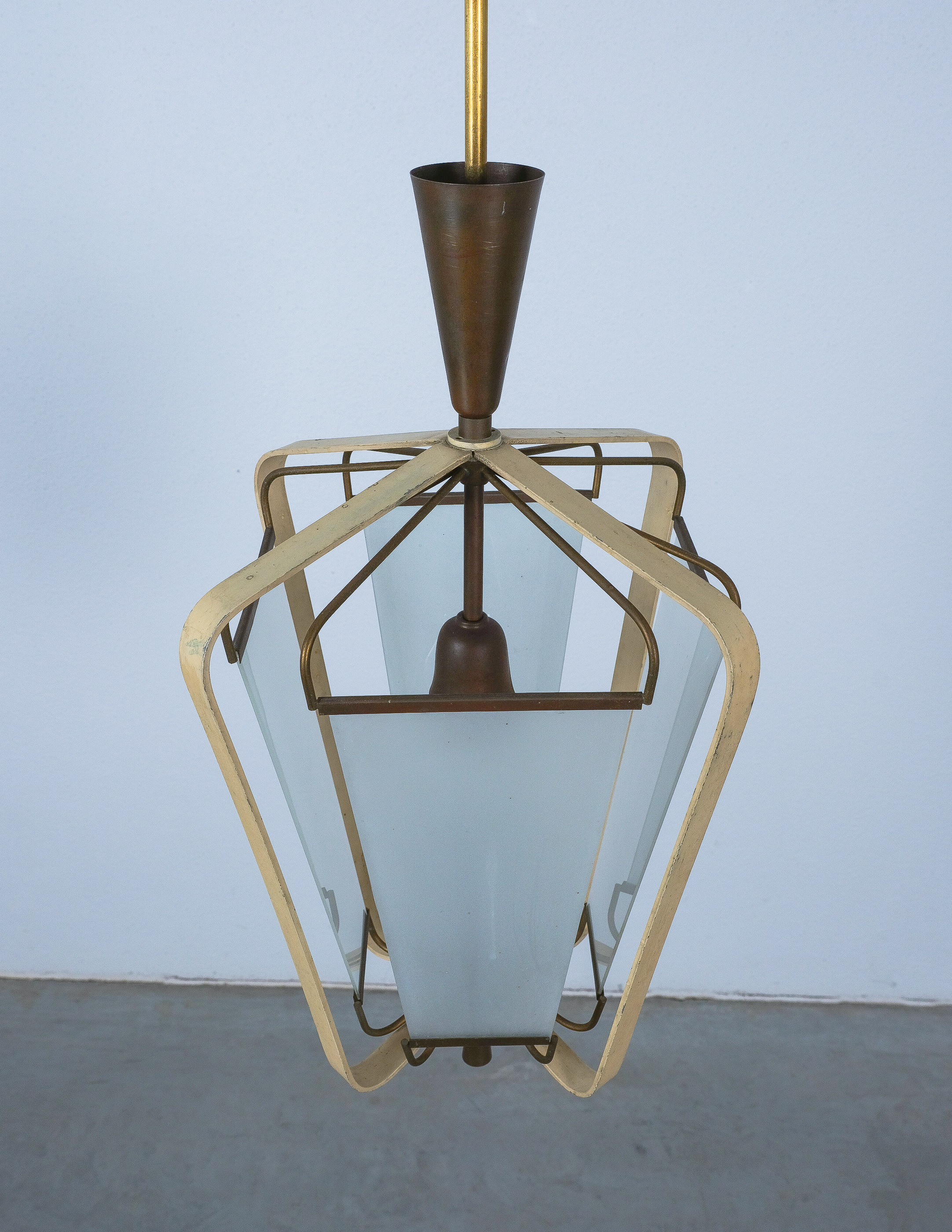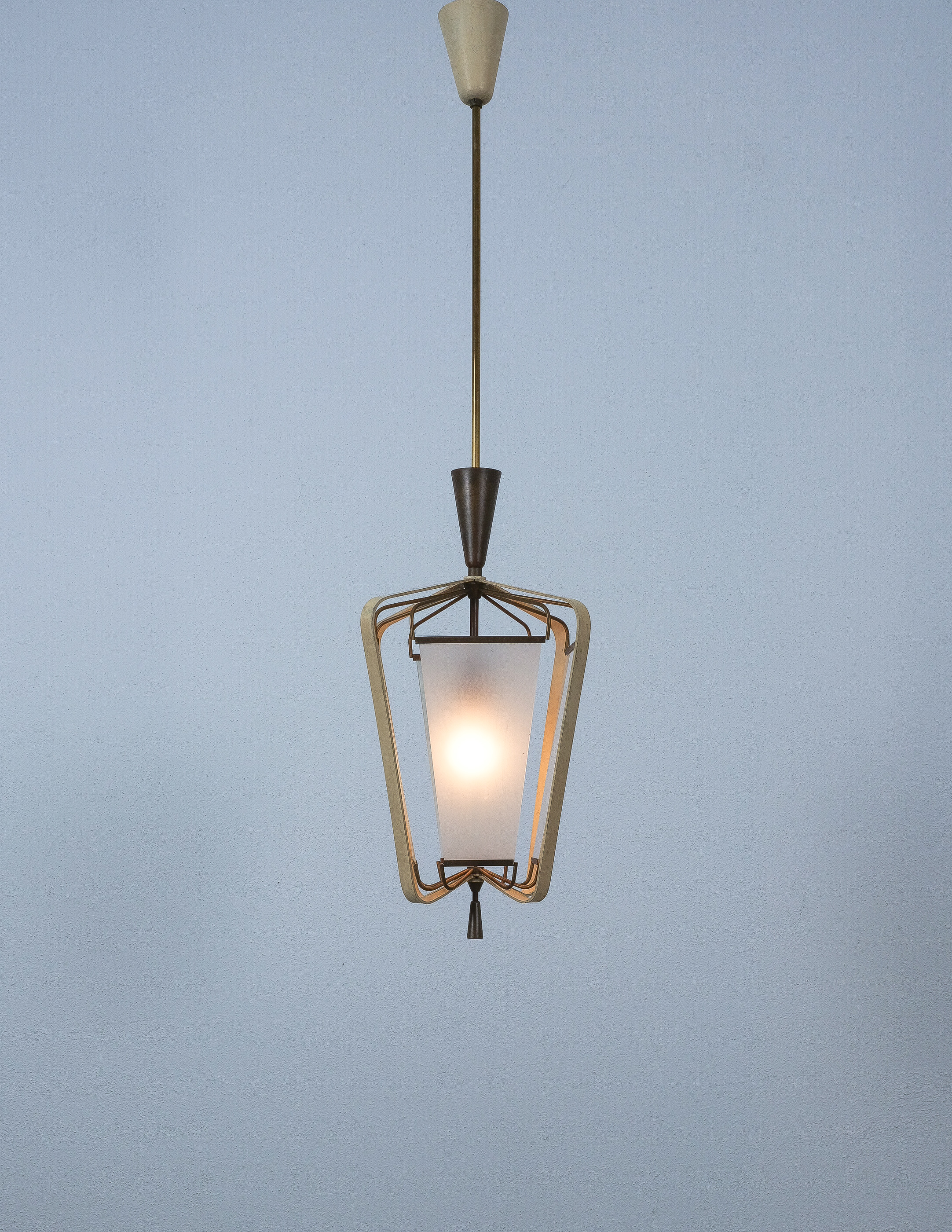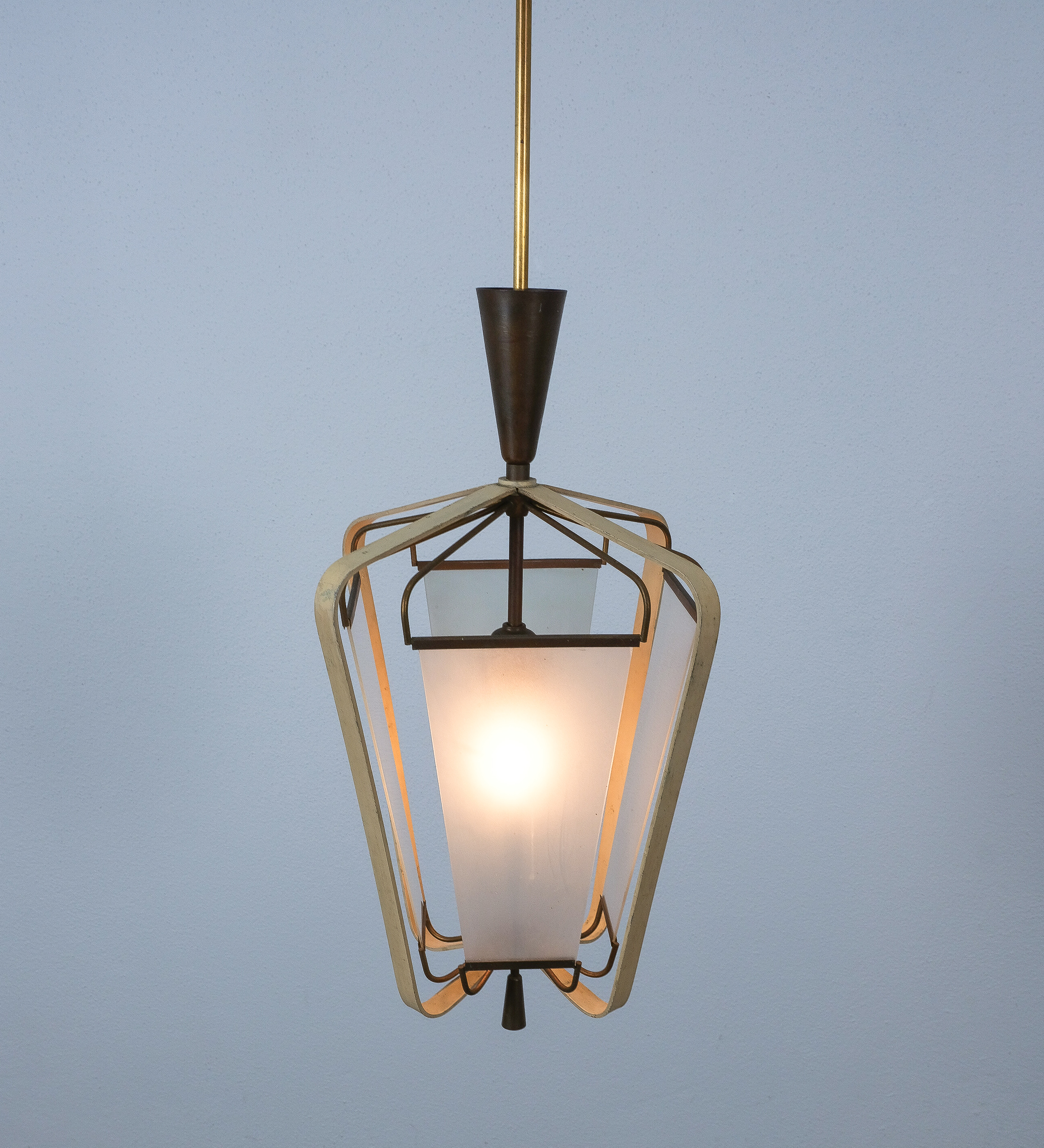 This is a rare model, that hardly shows up; it's in its original condition, rewired, cleaned and working perfectly. It's conceived around the idea of a lantern contextualizing the modern era which was a typical approach for the 1950's. The brass structure, including tapering ivory or cream enameled metal frame and satin or acid-etched glass panel shades is ending with a decorative brass finial. The original ivory enameled canopy as the cap for covering the connection from stem to lantern are present. It's in good original condition with no damages, cracks or chips to the glass (except for the hidden parts linked to the frame) The original patina we have left, but cleaned the light thoroughly.