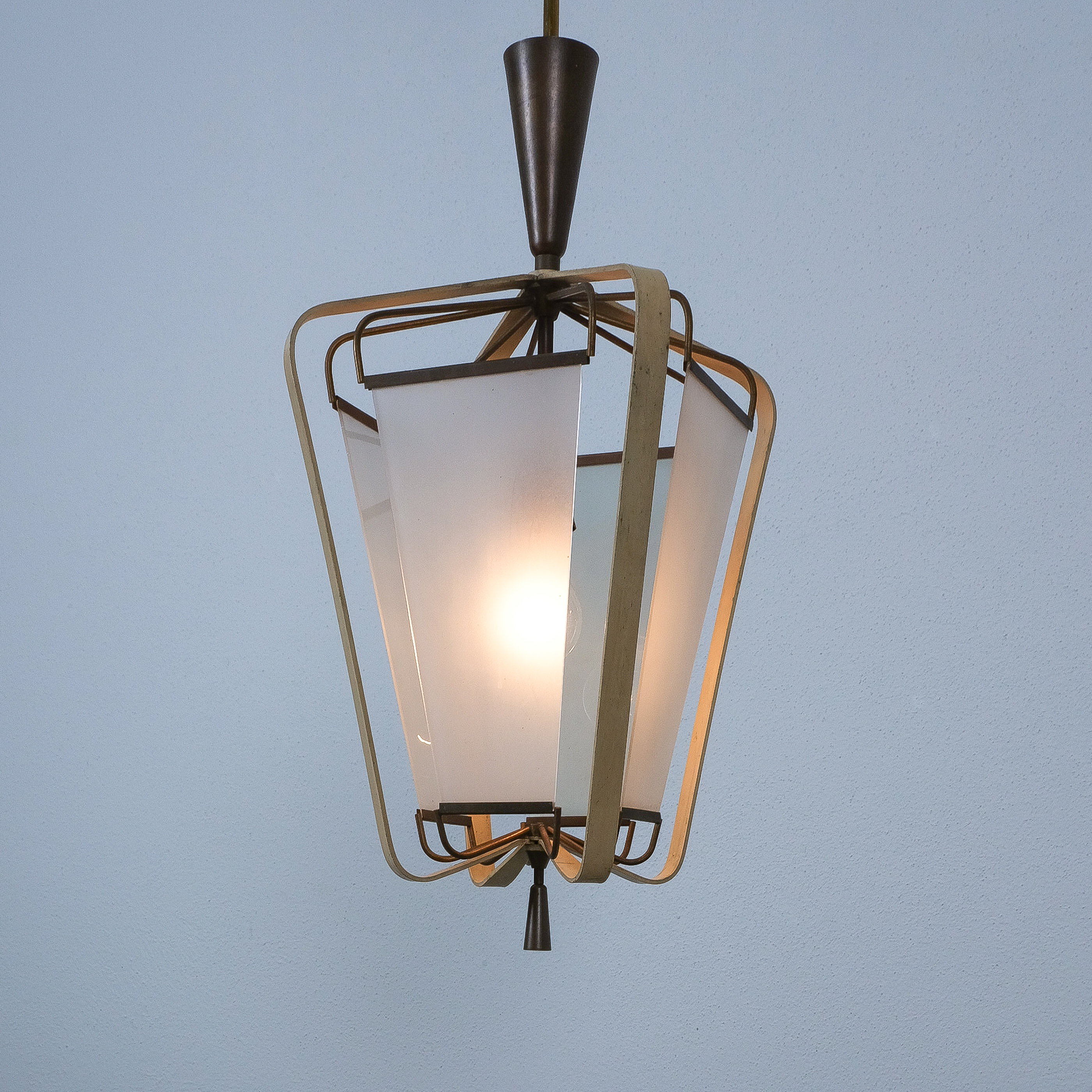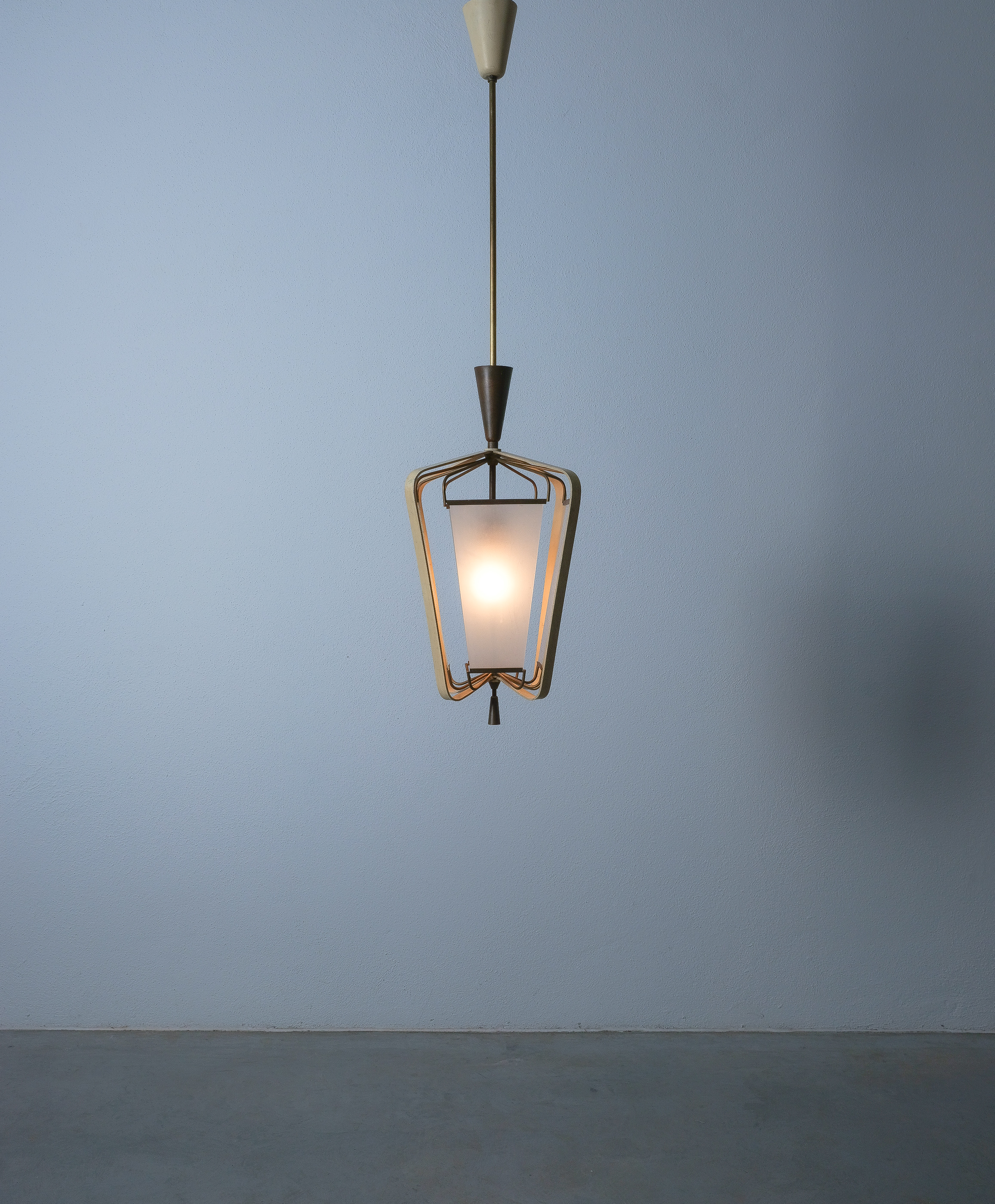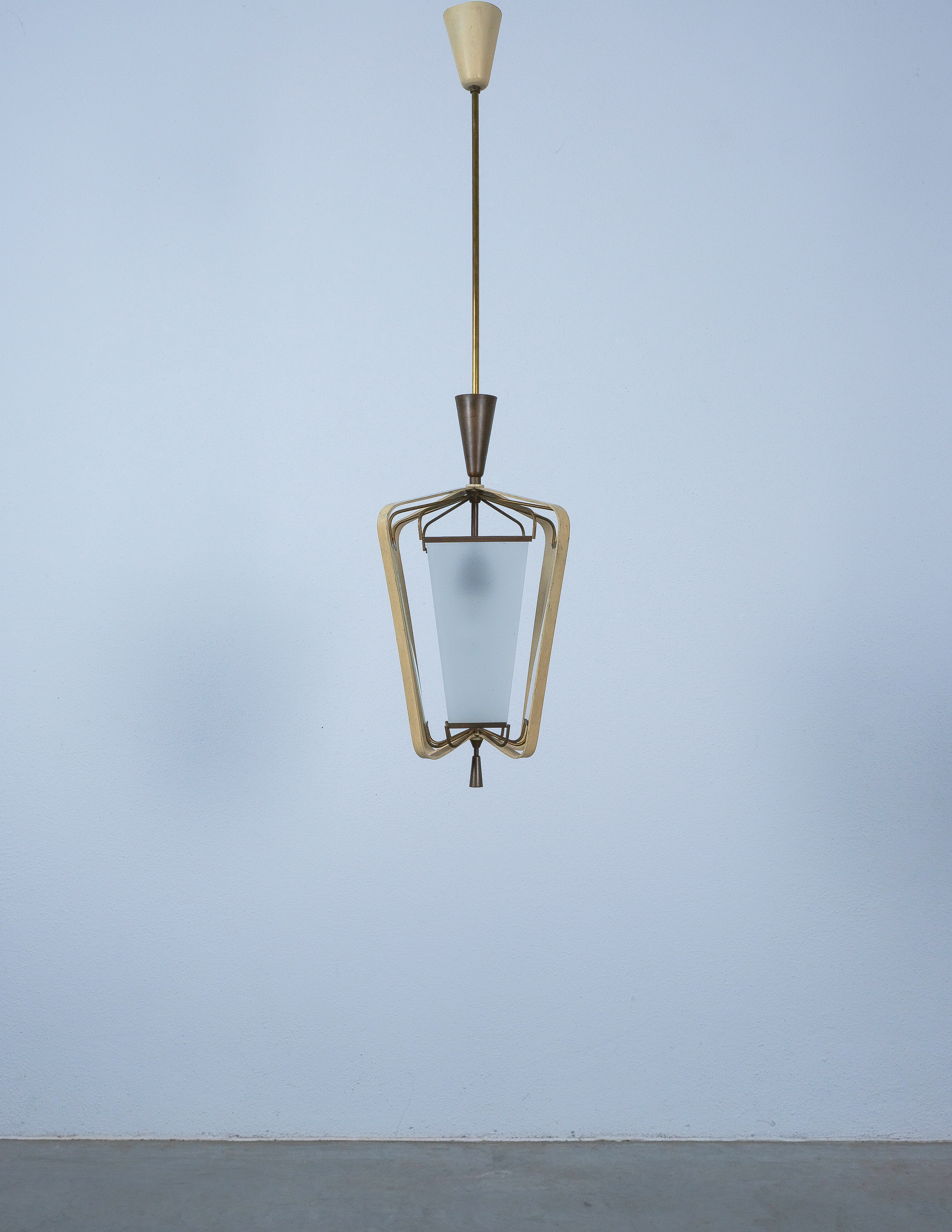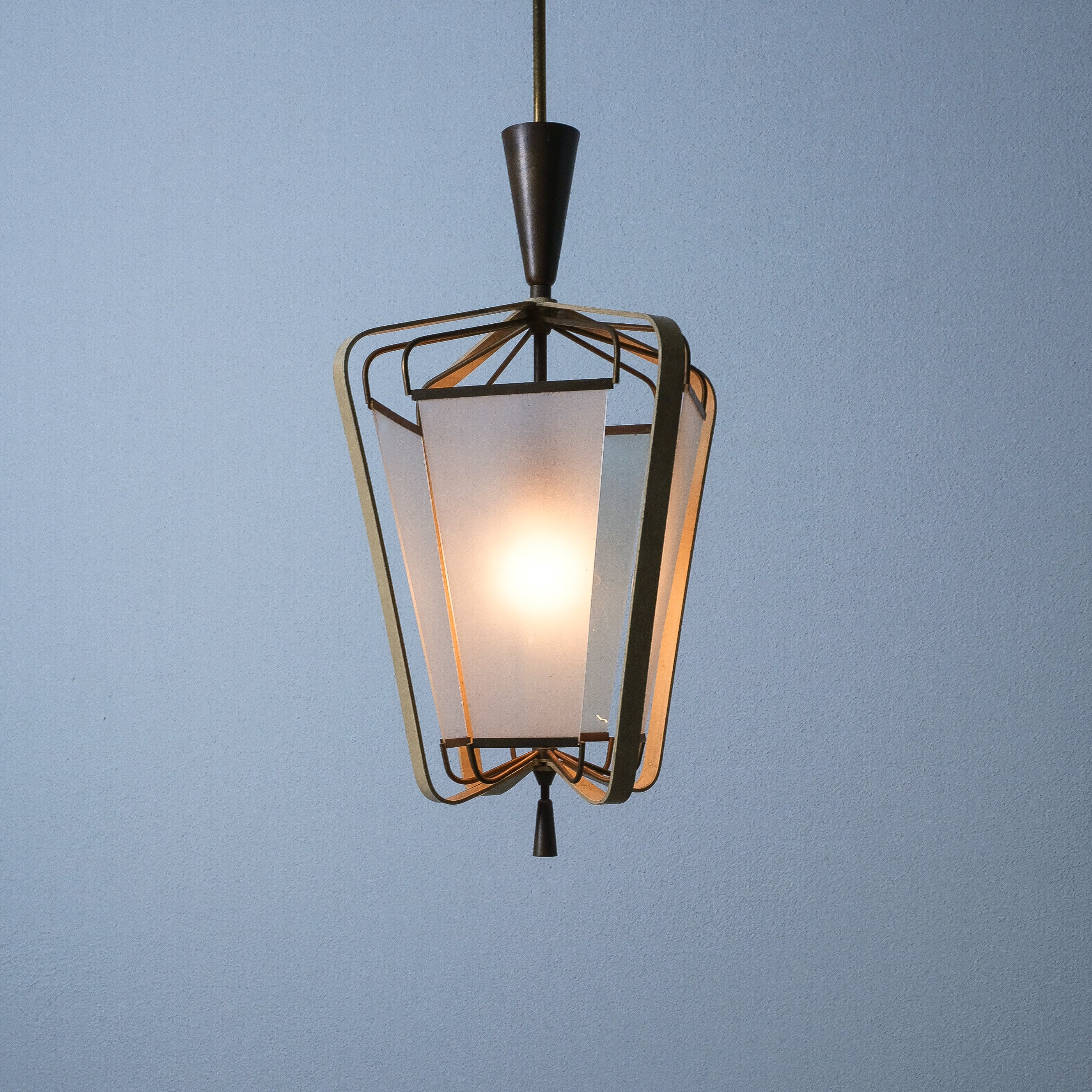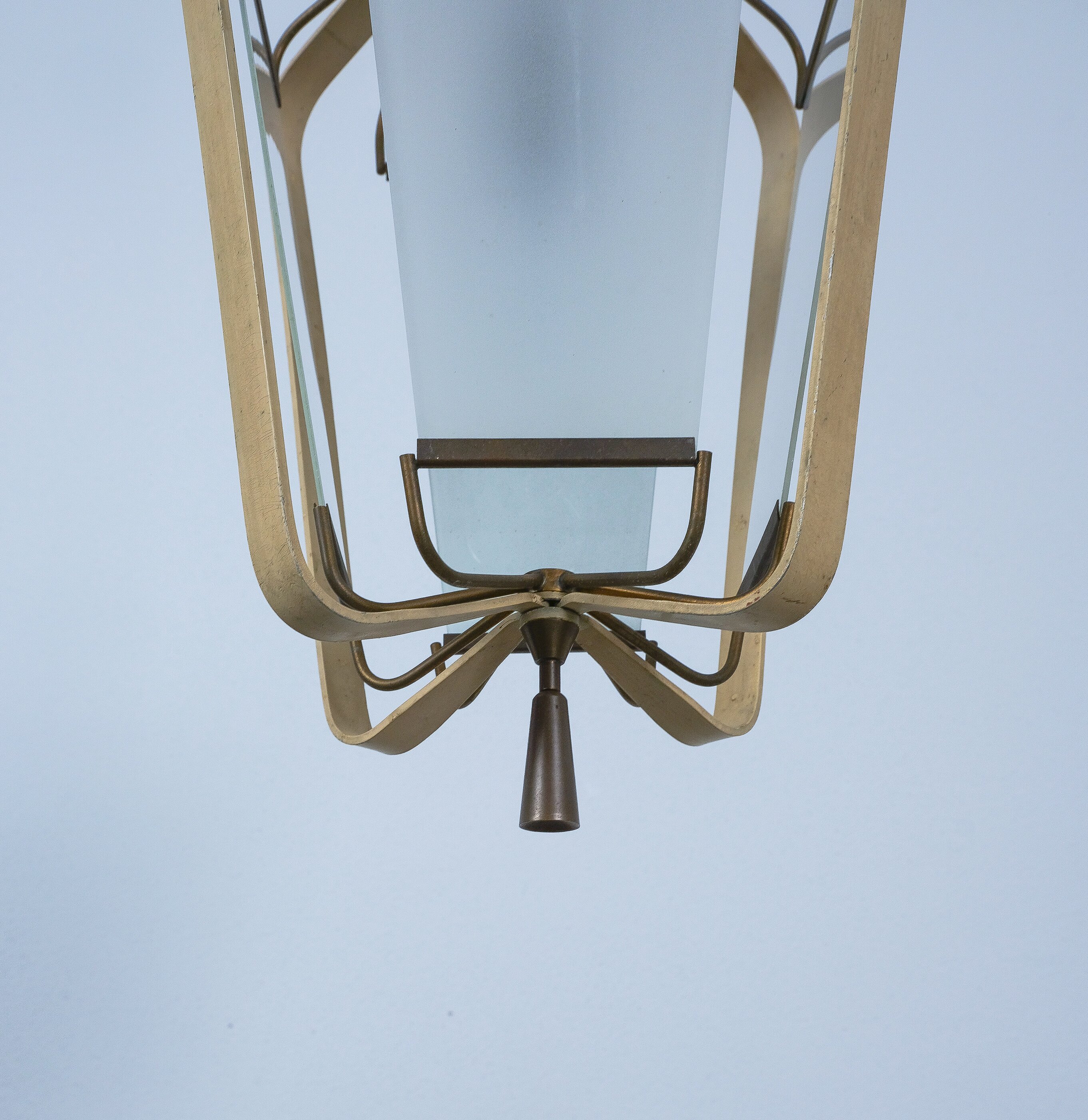 This is a rare model, that hardly shows up; it's in its original condition, rewired, cleaned and working perfectly. It's conceived around the idea of a lantern contextualizing the modern era which was a typical approach for the 1950's. The brass structure, including tapering ivory or cream enameled metal frame and satin or acid-etched glass panel shades is ending with a decorative brass finial. The original ivory enameled canopy as the cap for covering the connection from stem to lantern are present. It's in good original condition with no damages, cracks or chips to the glass (except for the hidden parts linked to the frame) The original patina we have left, but cleaned the light thoroughly.
