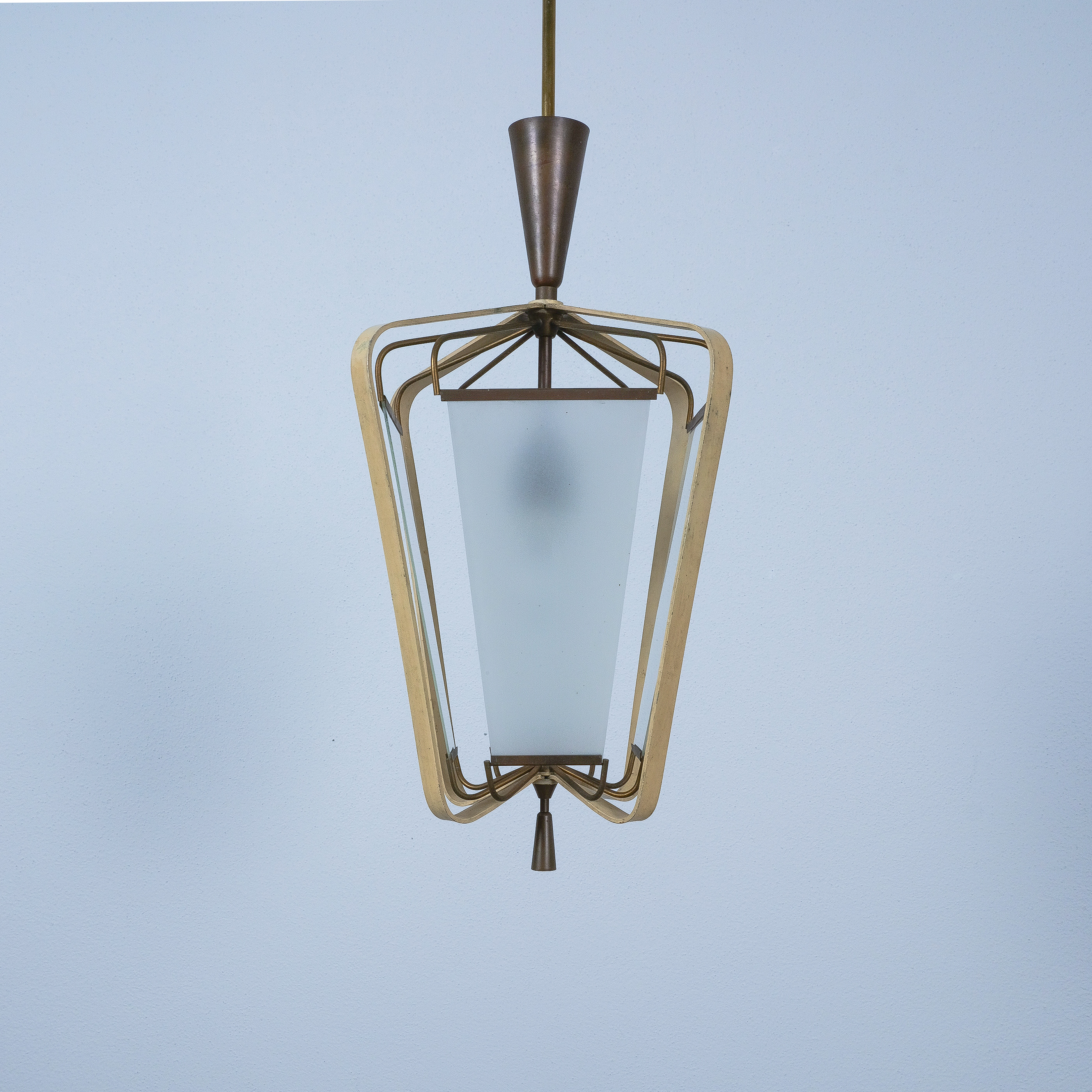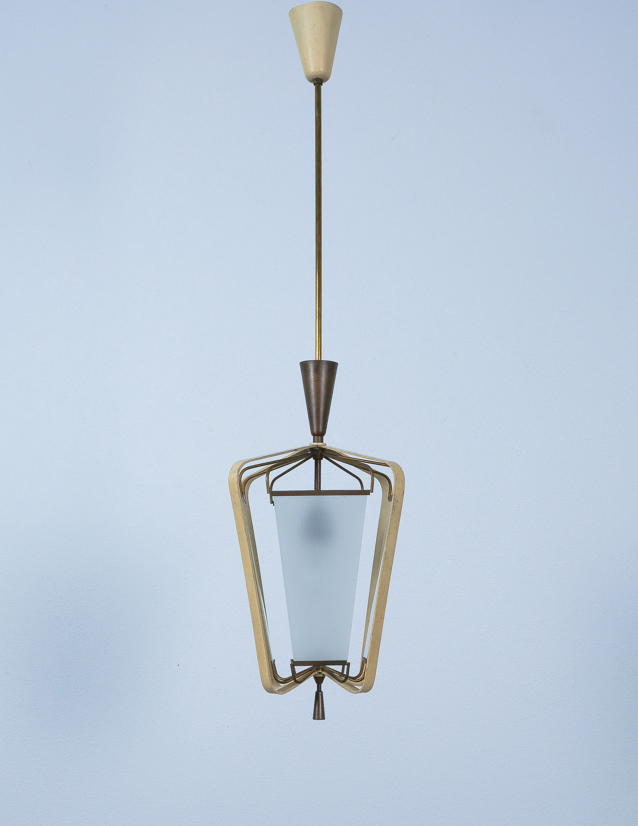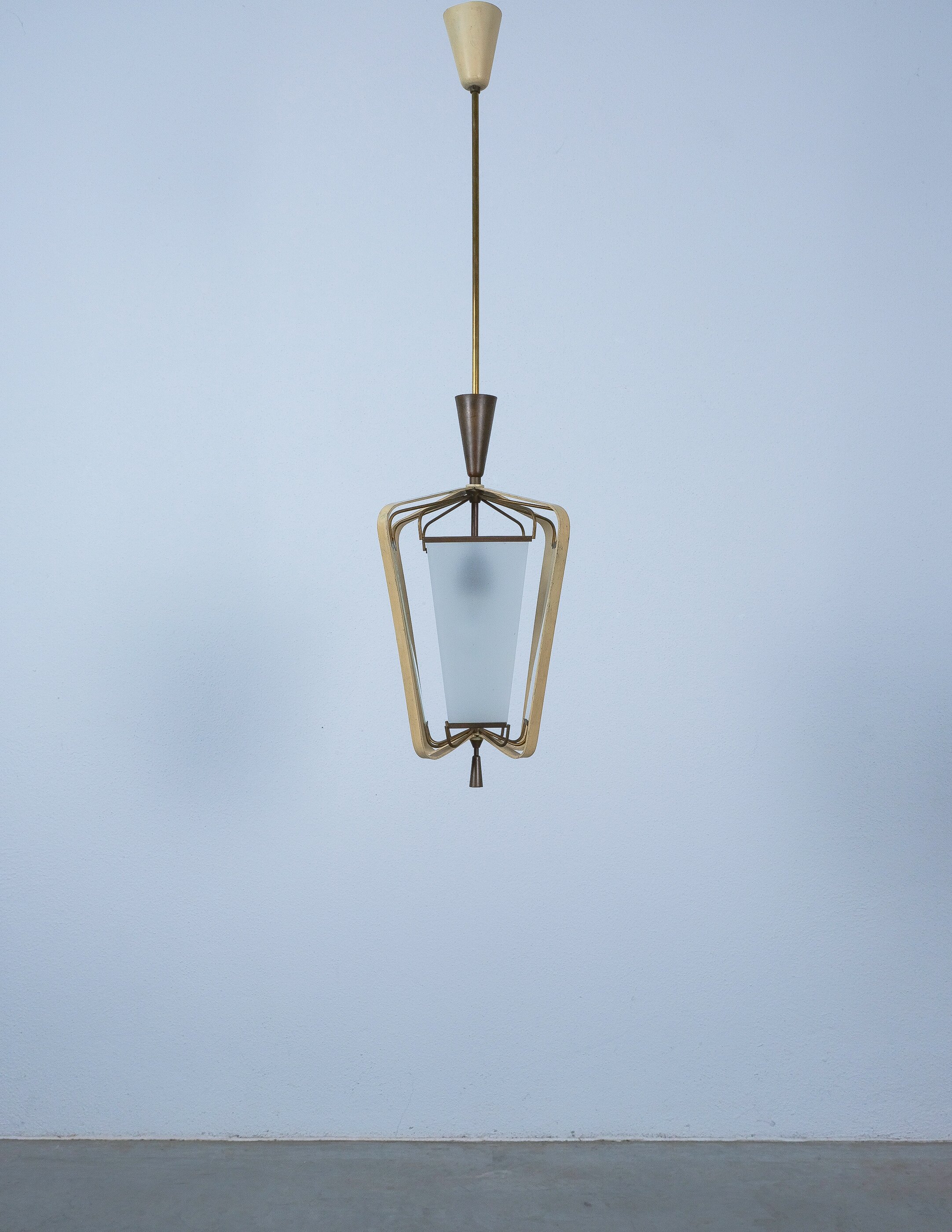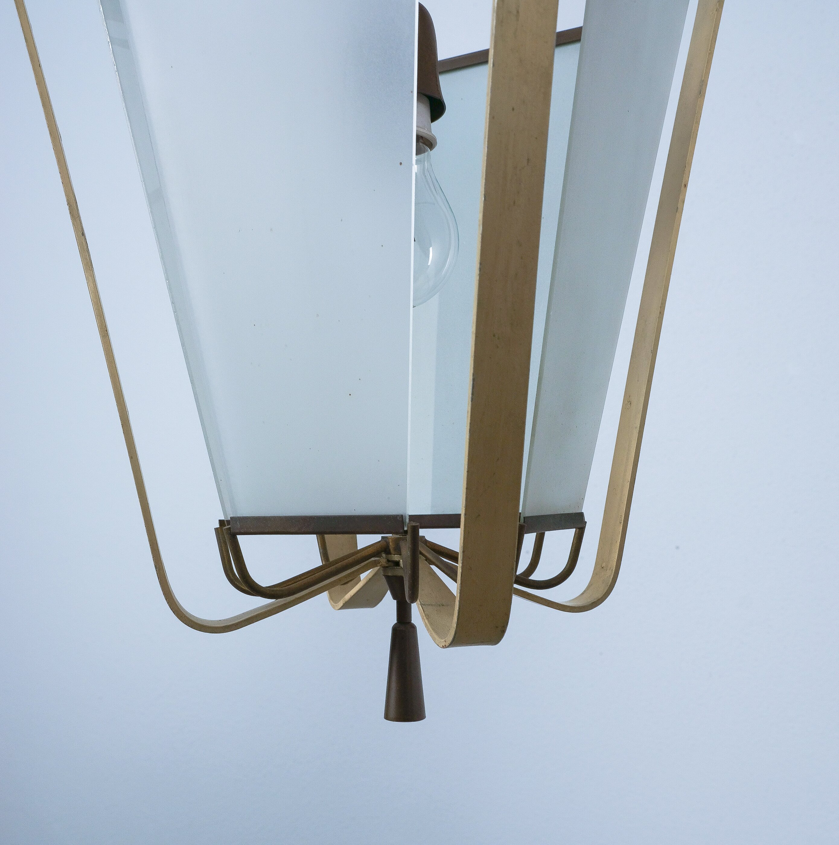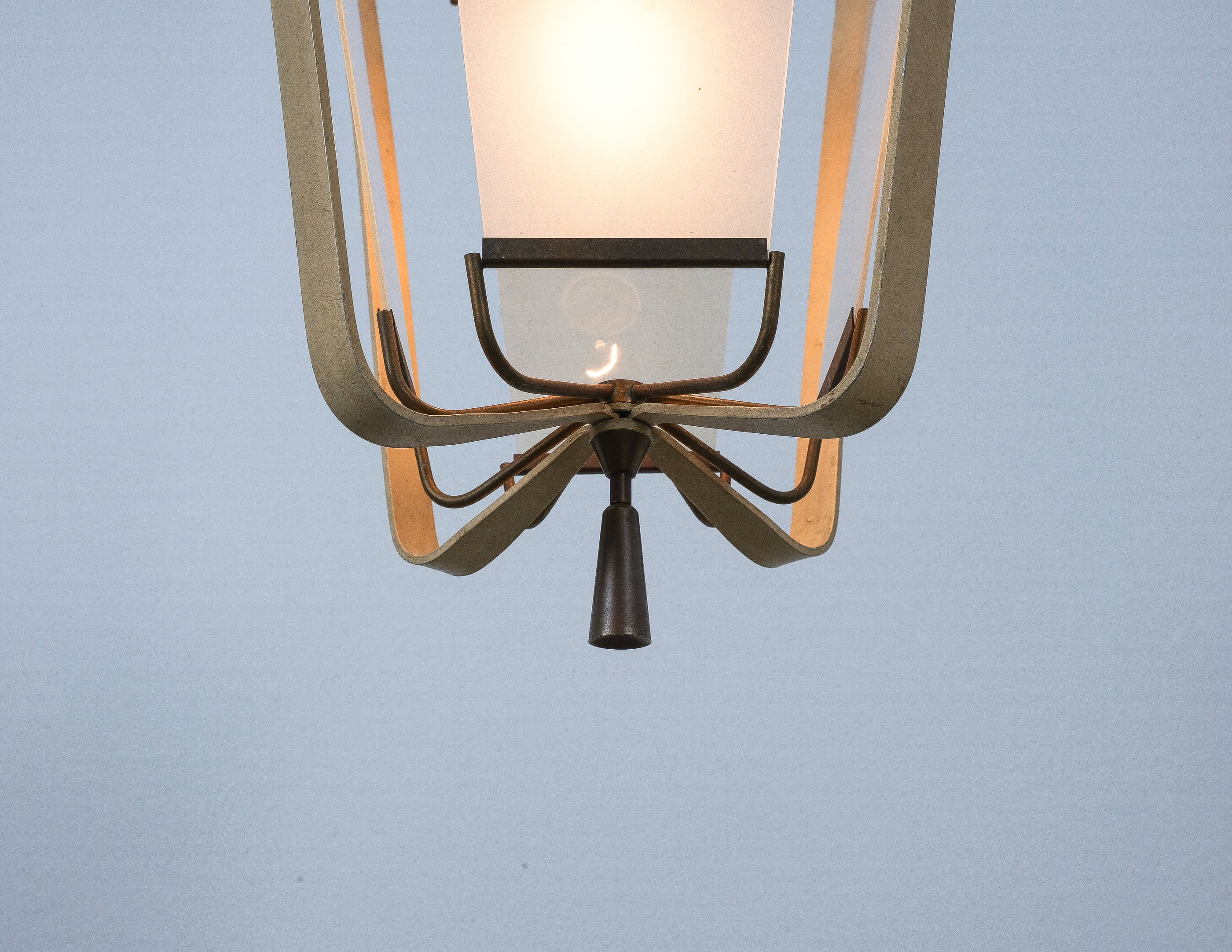 This is a rare model, that hardly shows up; it's in its original condition, rewired, cleaned and working perfectly. It's conceived around the idea of a lantern contextualizing the modern era which was a typical approach for the 1950's. The brass structure, including tapering ivory or cream enameled metal frame and satin or acid-etched glass panel shades is ending with a decorative brass finial. The original ivory enameled canopy as the cap for covering the connection from stem to lantern are present. It's in good original condition with no damages, cracks or chips to the glass (except for the hidden parts linked to the frame) The original patina we have left, but cleaned the light thoroughly.