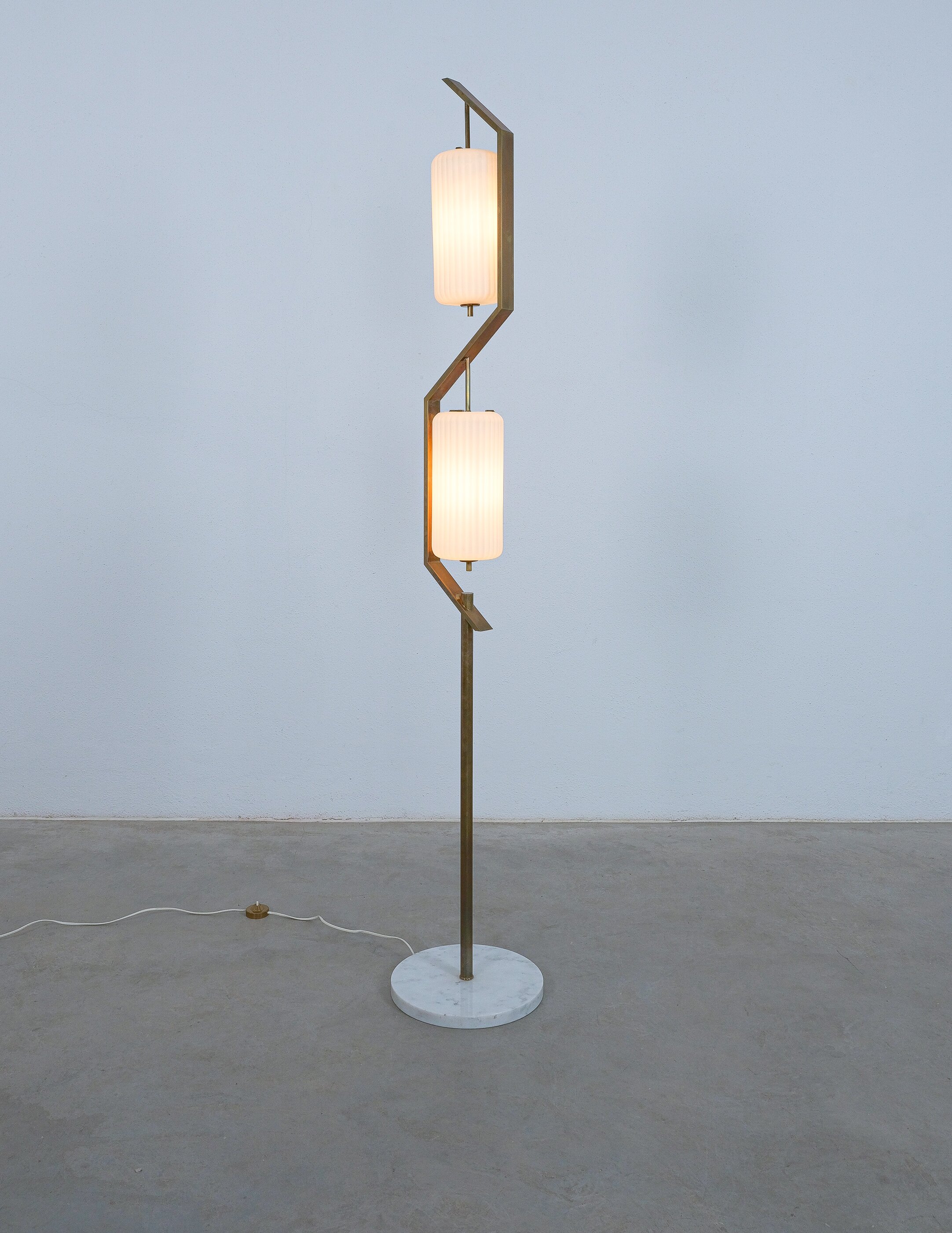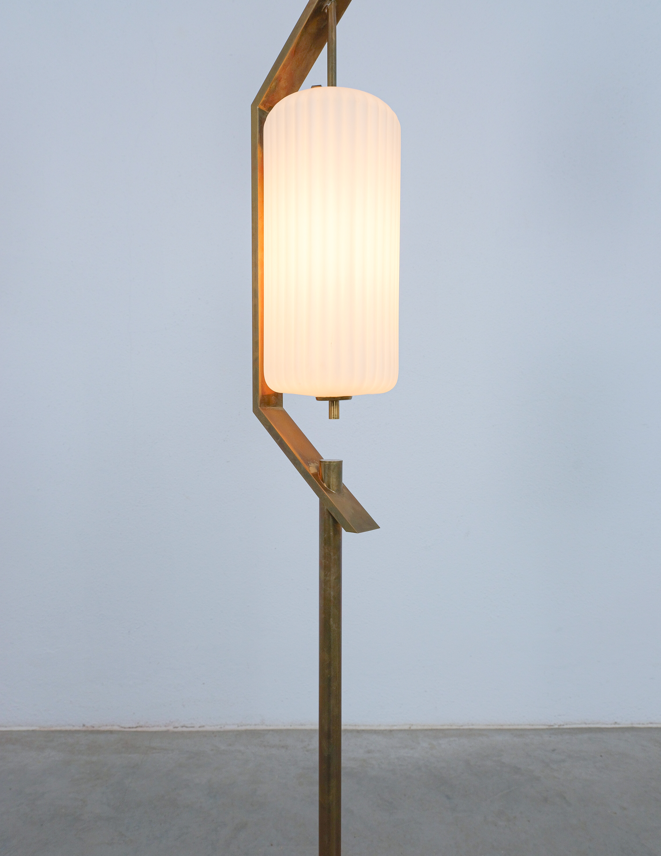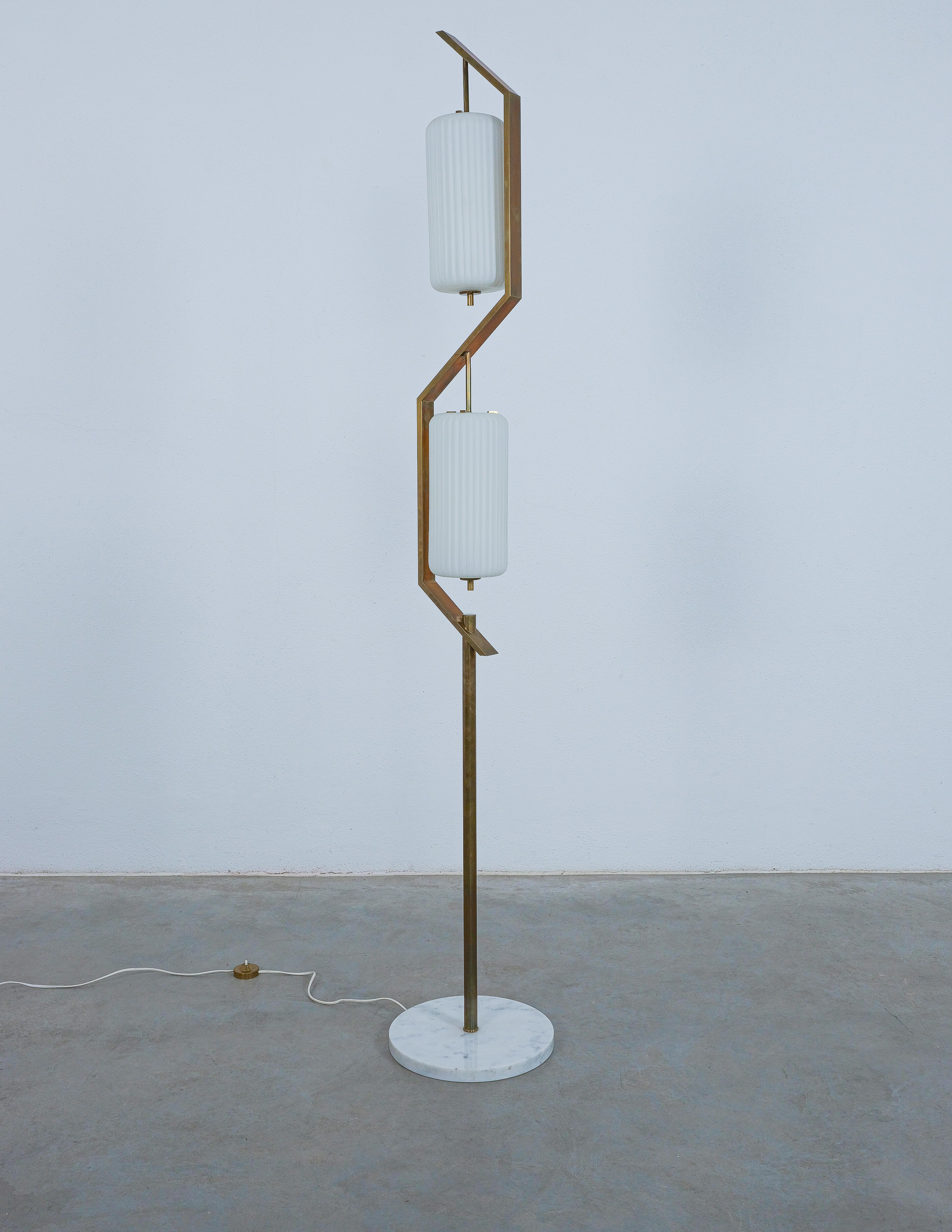 Rare floor lamp in opal glass, brass and marble conceived by Angelo Lelii. This piece is an original lamp produced by Arredoluce with a mark on the switch, that is rarely seen in this condition. The floor light embodies the creative impulse and avant-garde spirit that Angelo Lelii brought to the design world, pioneering new approaches and pushing the boundaries of innovation. With its innovative materials and meticulous attention to details and form, this floor lamp stands as an elegant and timeless piece and collectible. The condition is good to very good, with a nice patina and no noticeable damages. The glass shows a minimal chip, so does the marble base. Considering age and use during the last 65+ years it's in astounding vintage condition. We have not rewired it to preserve the original condition as much as possible.