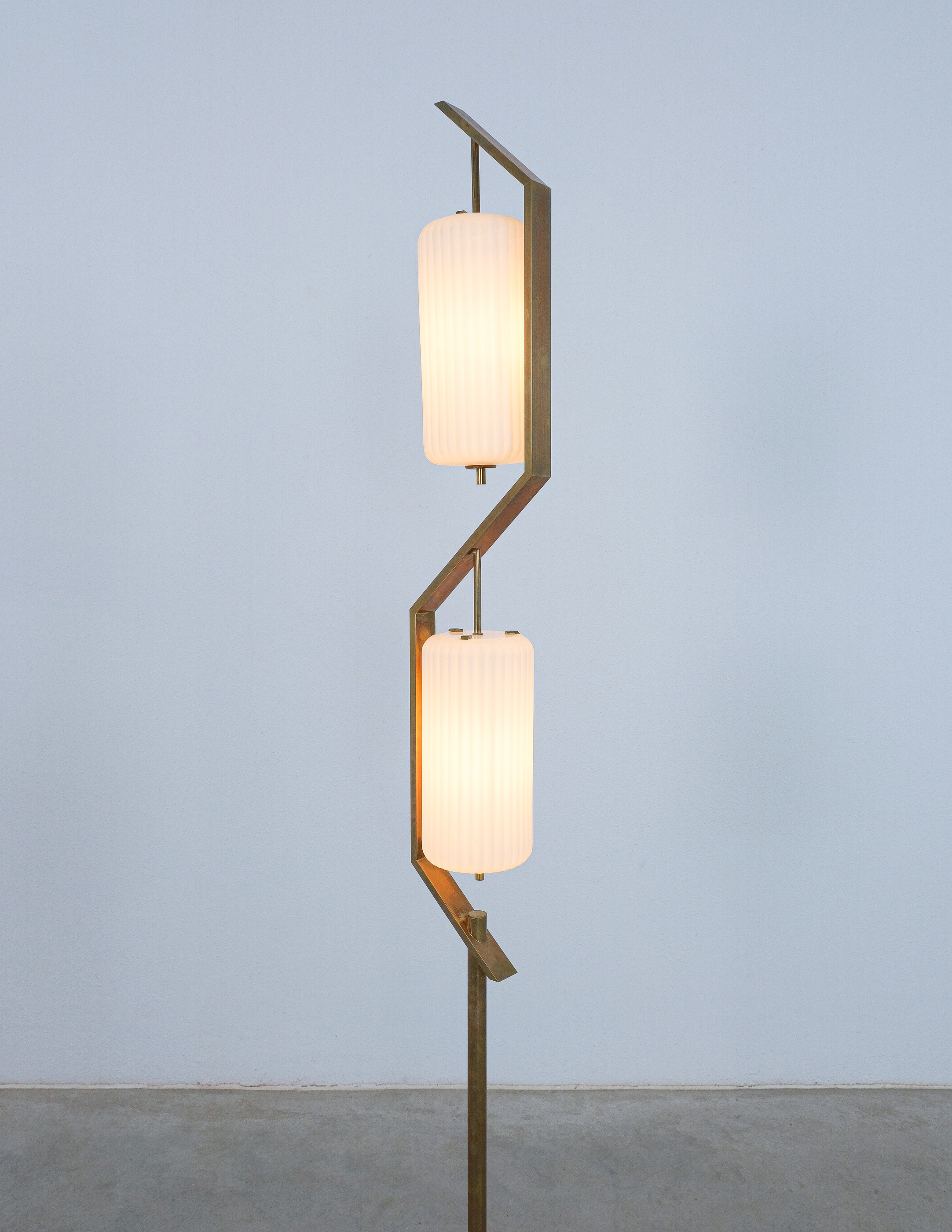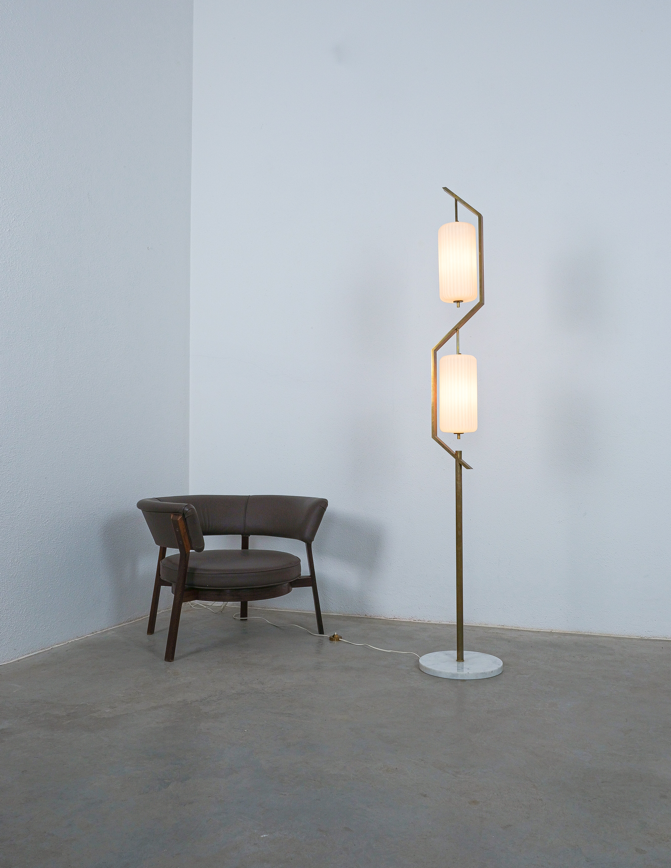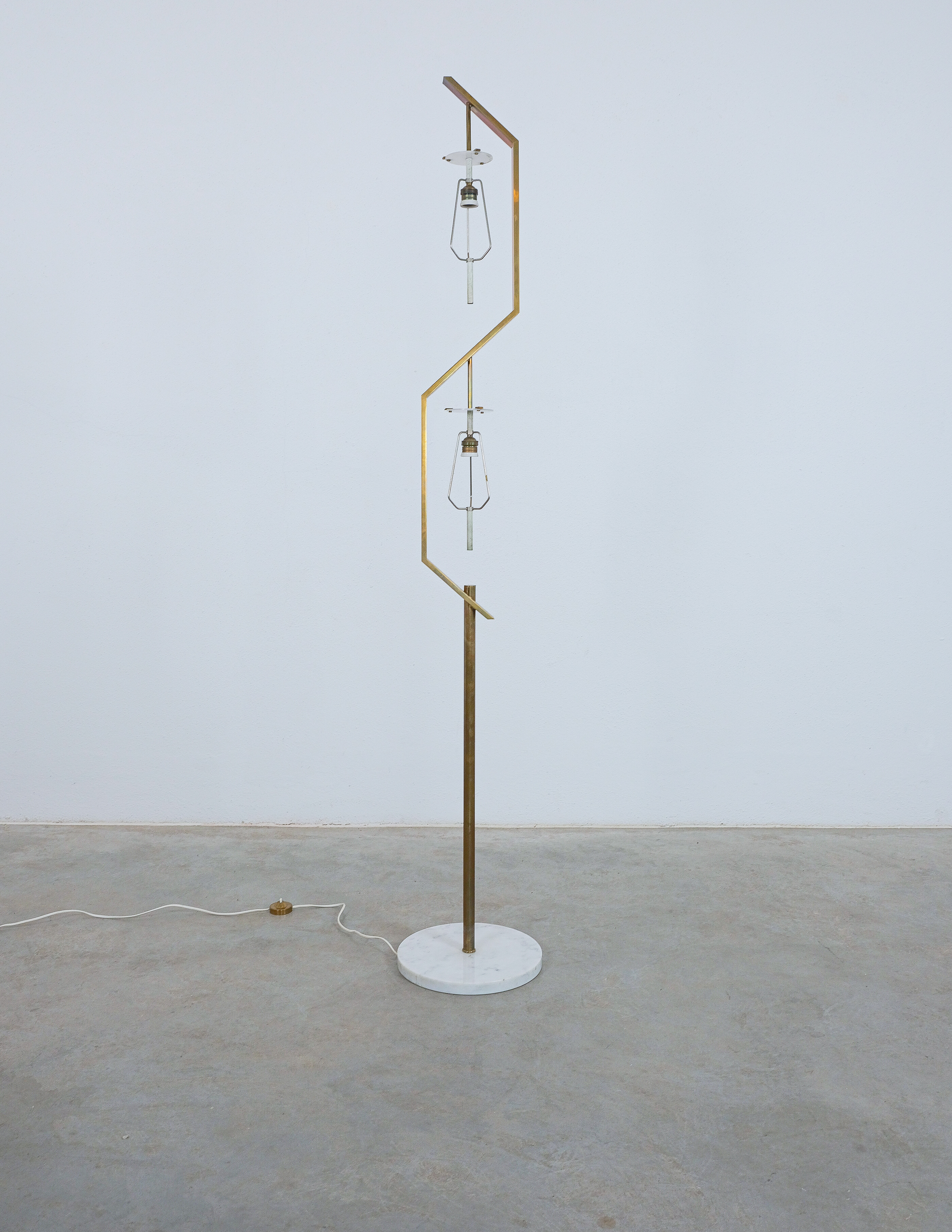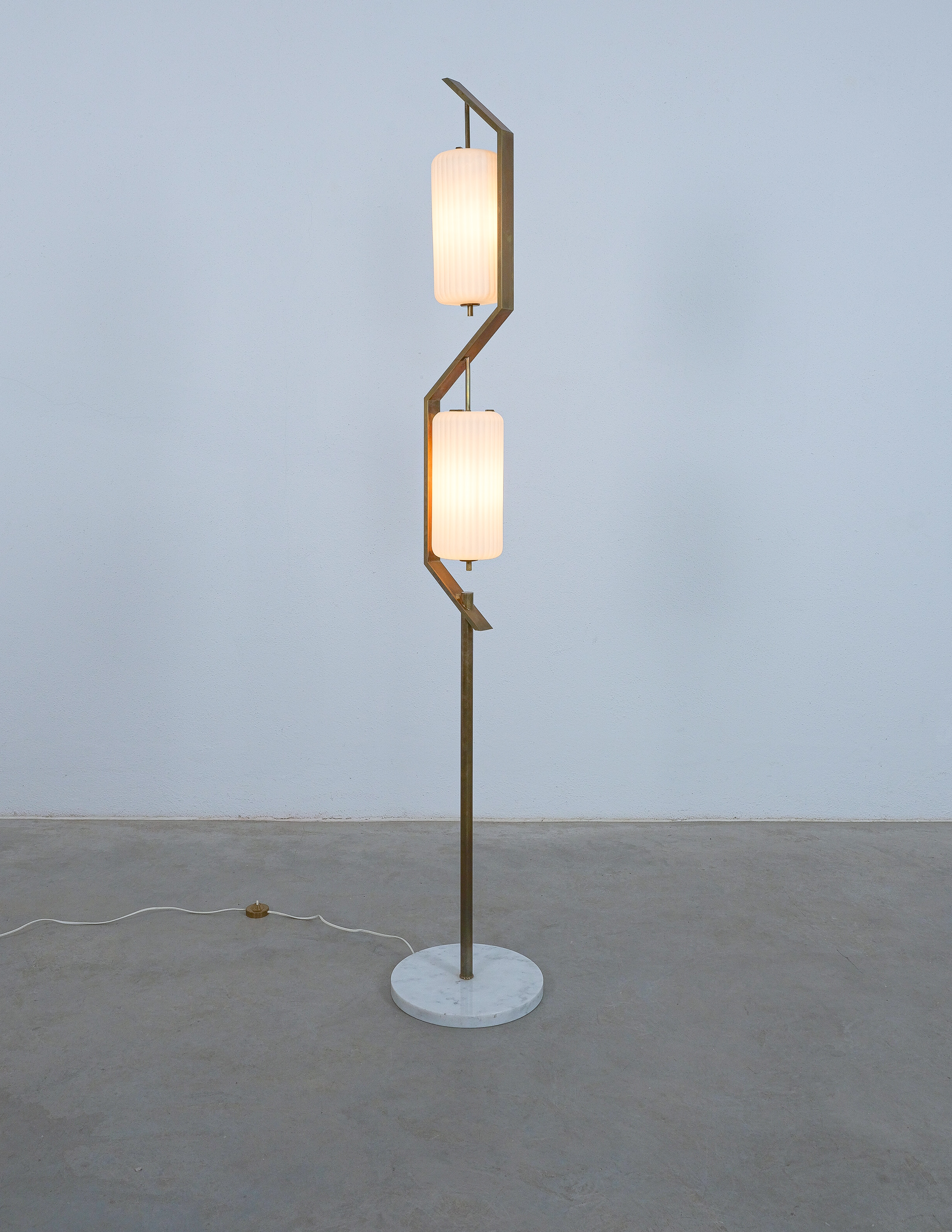 Rare floor lamp in opal glass, brass and marble conceived by Angelo Lelii. This piece is an original lamp produced by Arredoluce with a mark on the switch, that is rarely seen in this condition. The floor light embodies the creative impulse and avant-garde spirit that Angelo Lelii brought to the design world, pioneering new approaches and pushing the boundaries of innovation. With its innovative materials and meticulous attention to details and form, this floor lamp stands as an elegant and timeless piece and collectible. The condition is good to very good, with a nice patina and no noticeable damages. The glass shows a minimal chip, so does the marble base. Considering age and use during the last 65+ years it's in astounding vintage condition. We have not rewired it to preserve the original condition as much as possible.