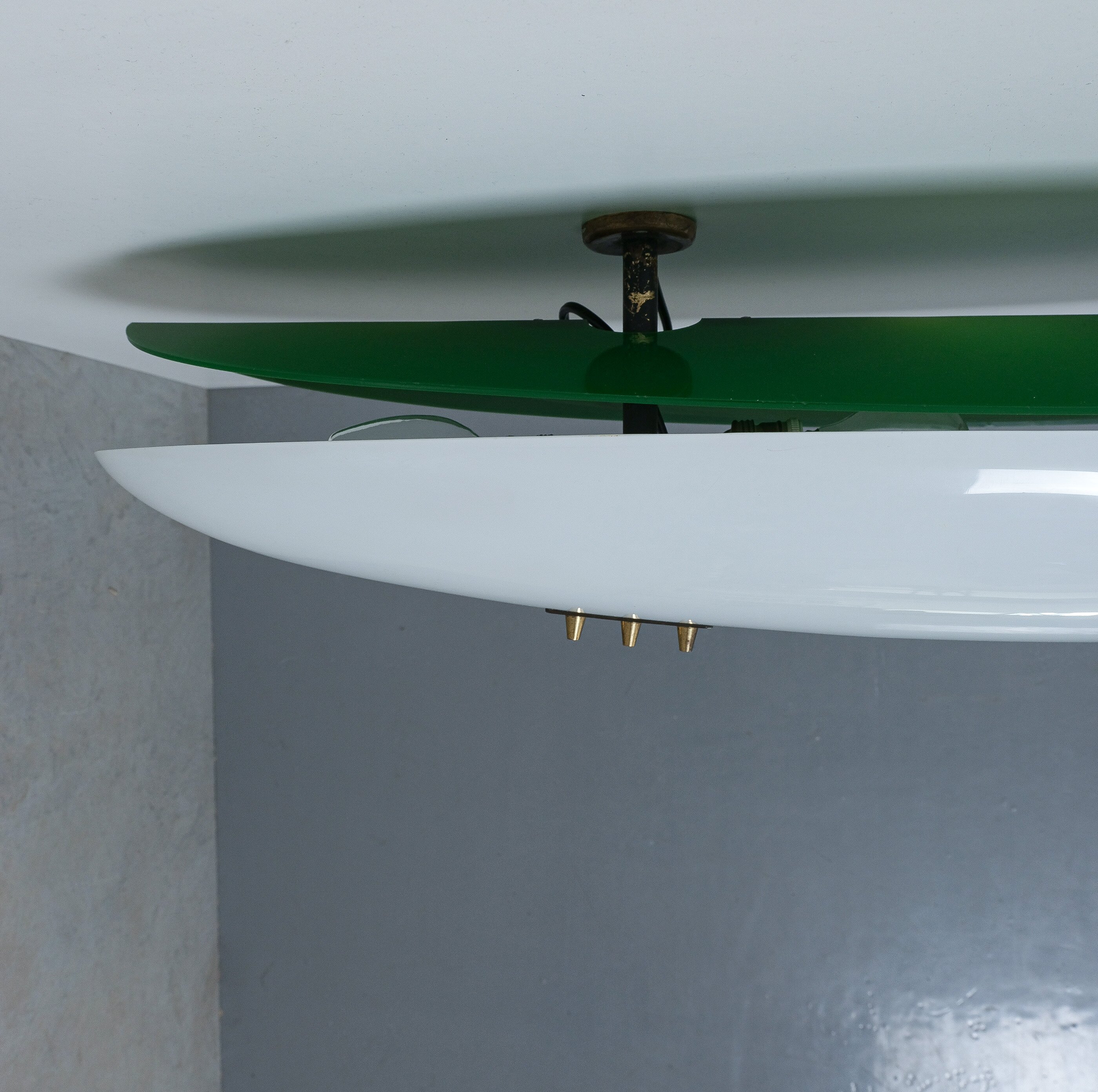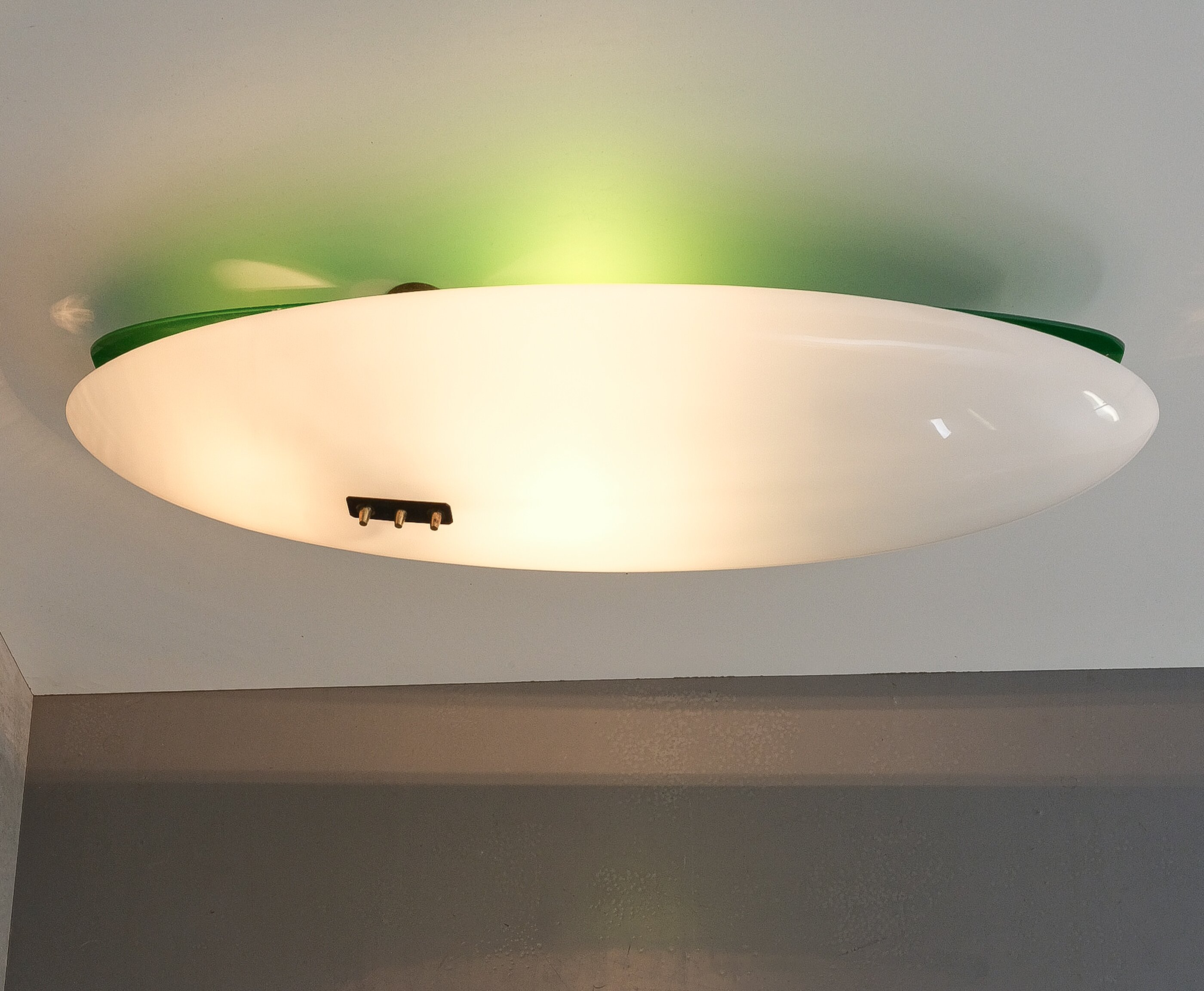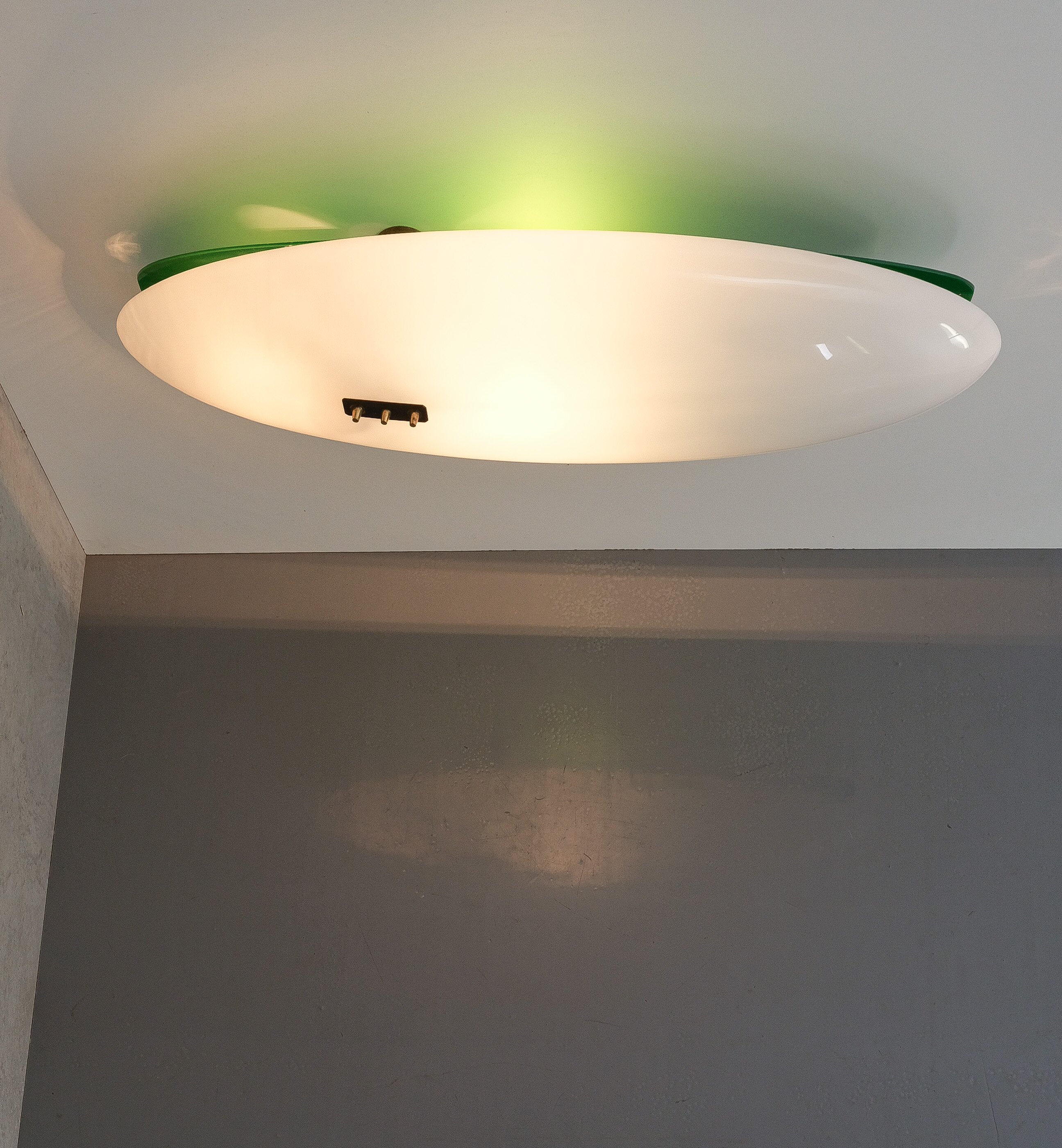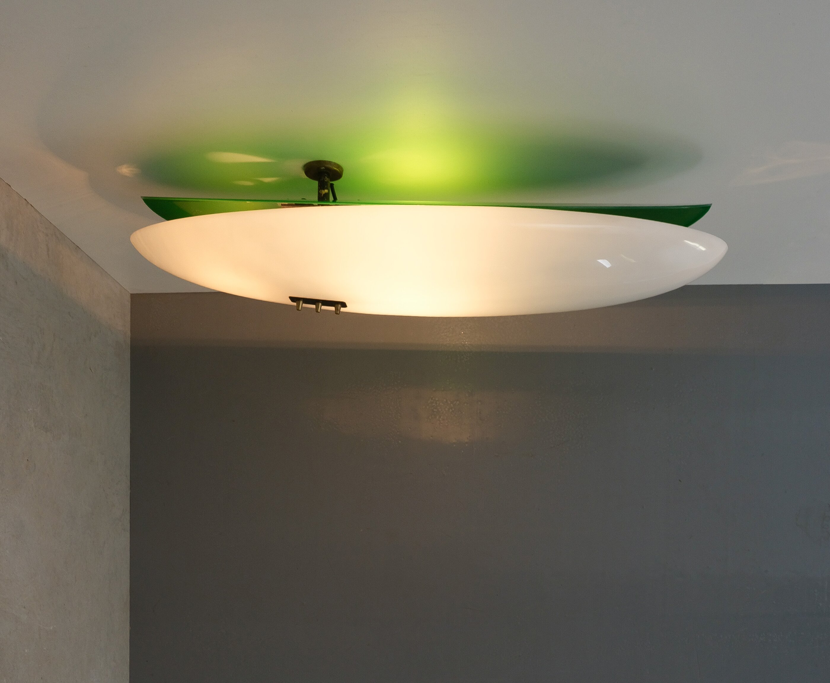 This long stretched flush mount can also be used as a large accentuating wall piece and casting an even light with a soft green glow. Formally it reminds us the wall fixtures model 12643 by Angelo Lelii that we also do offer in our gallery. It's made from lucite (white and green) and a brass structure with two bulb sockets (e14 and e27). Total watts are about 100-115W, we recommend Led's as usual minimize the heat emission. The lamp is in good vintage condition with no damages, patina to the brass.
