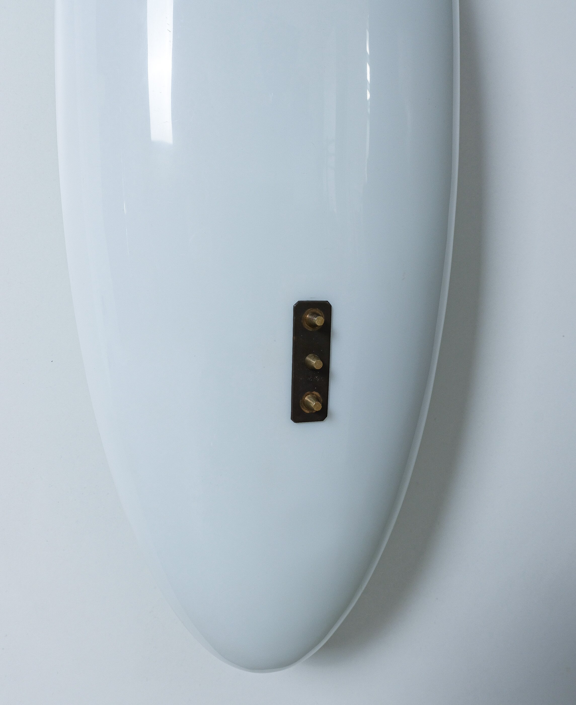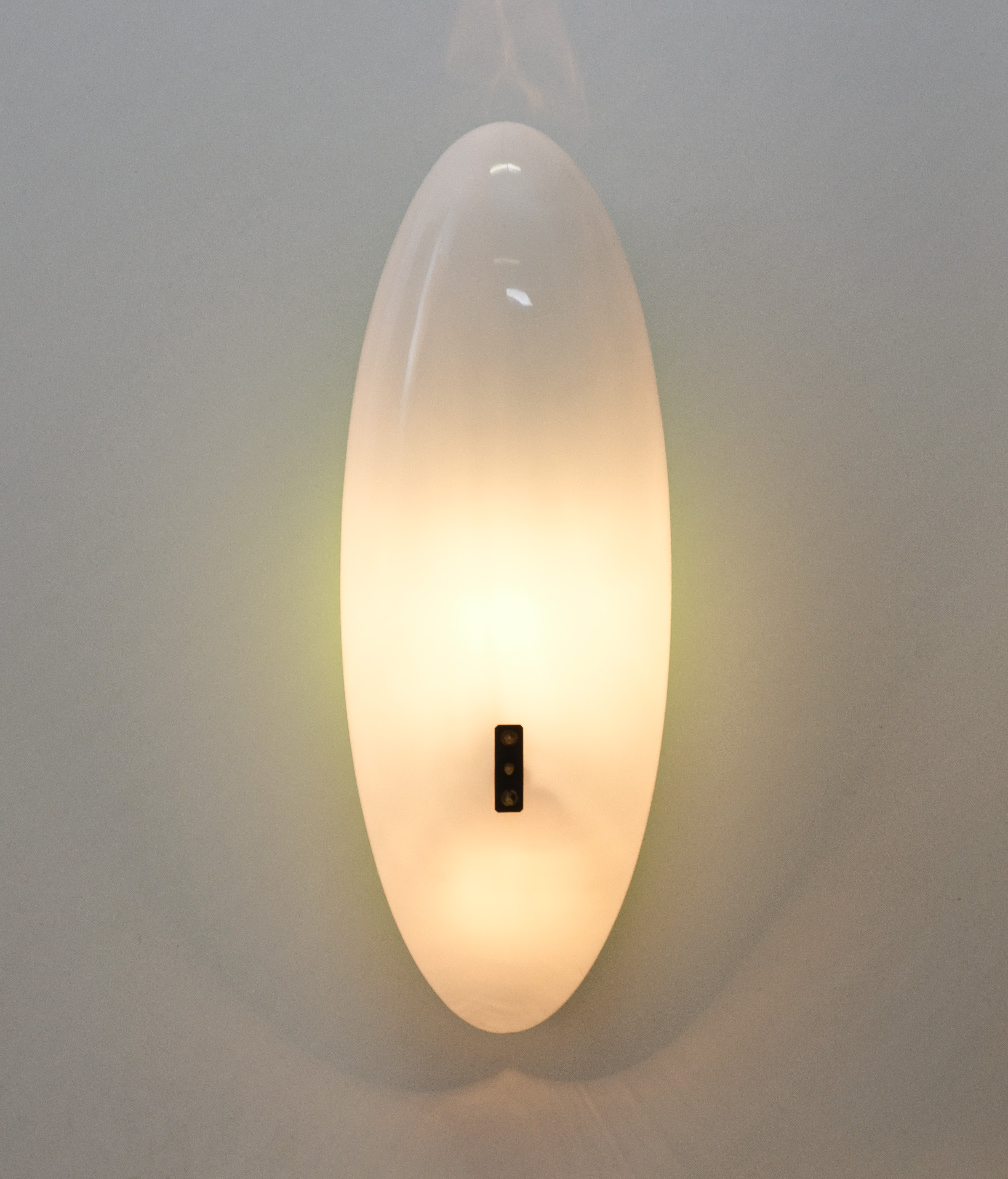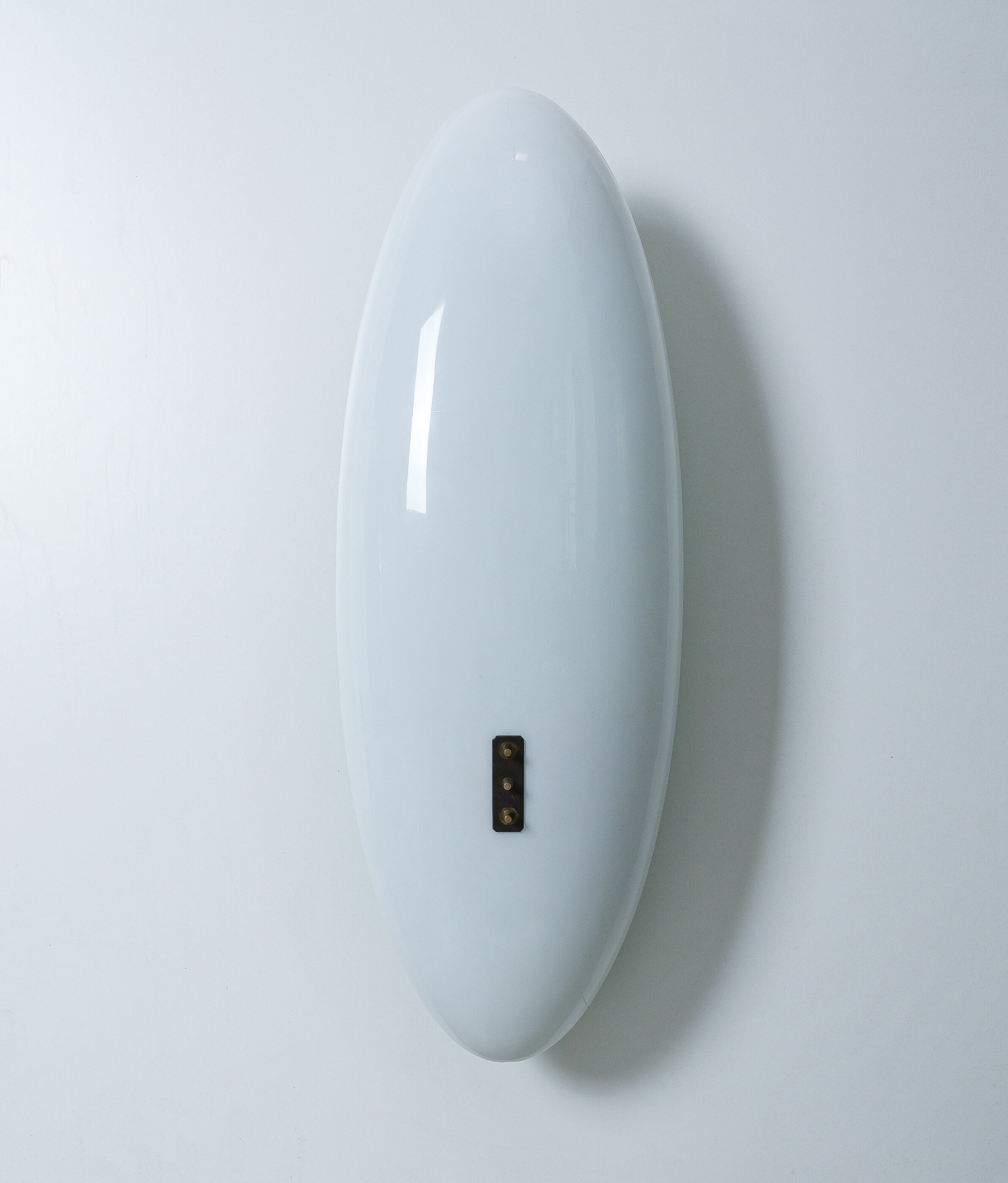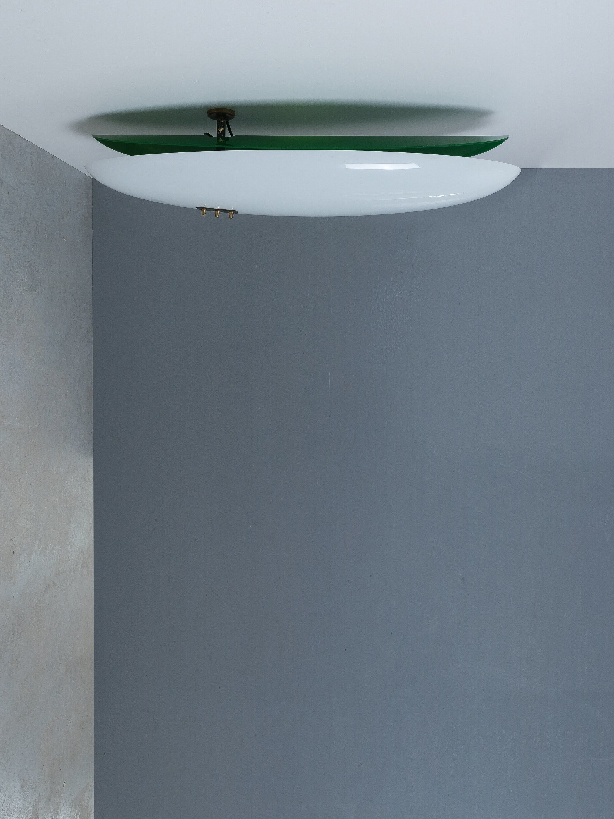 This long stretched flush mount can also be used as a large accentuating wall piece and casting an even light with a soft green glow. Formally it reminds us the wall fixtures model 12643 by Angelo Lelii that we also do offer in our gallery. It's made from lucite (white and green) and a brass structure with two bulb sockets (e14 and e27). Total watts are about 100-115W, we recommend Led's as usual minimize the heat emission. The lamp is in good vintage condition with no damages, patina to the brass.