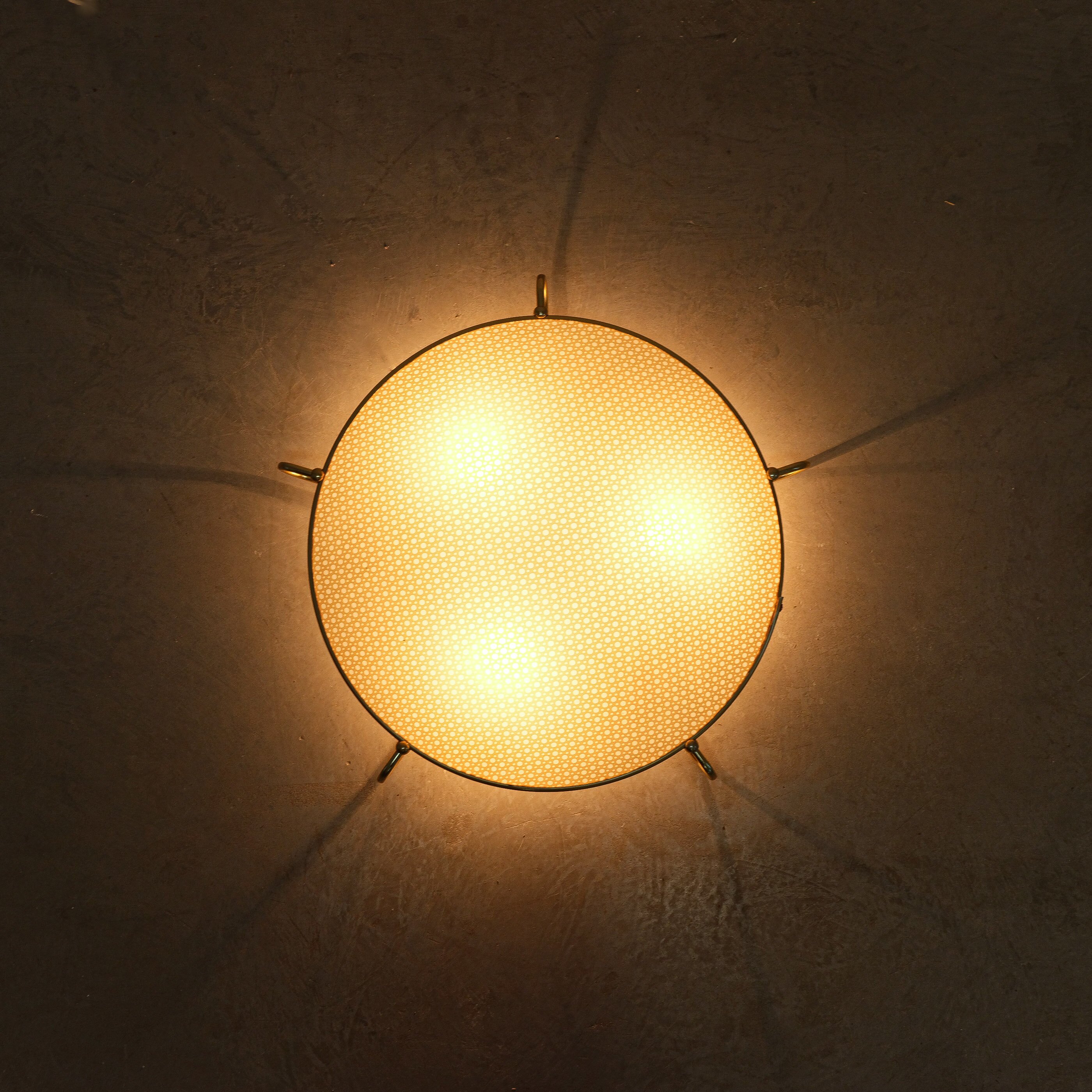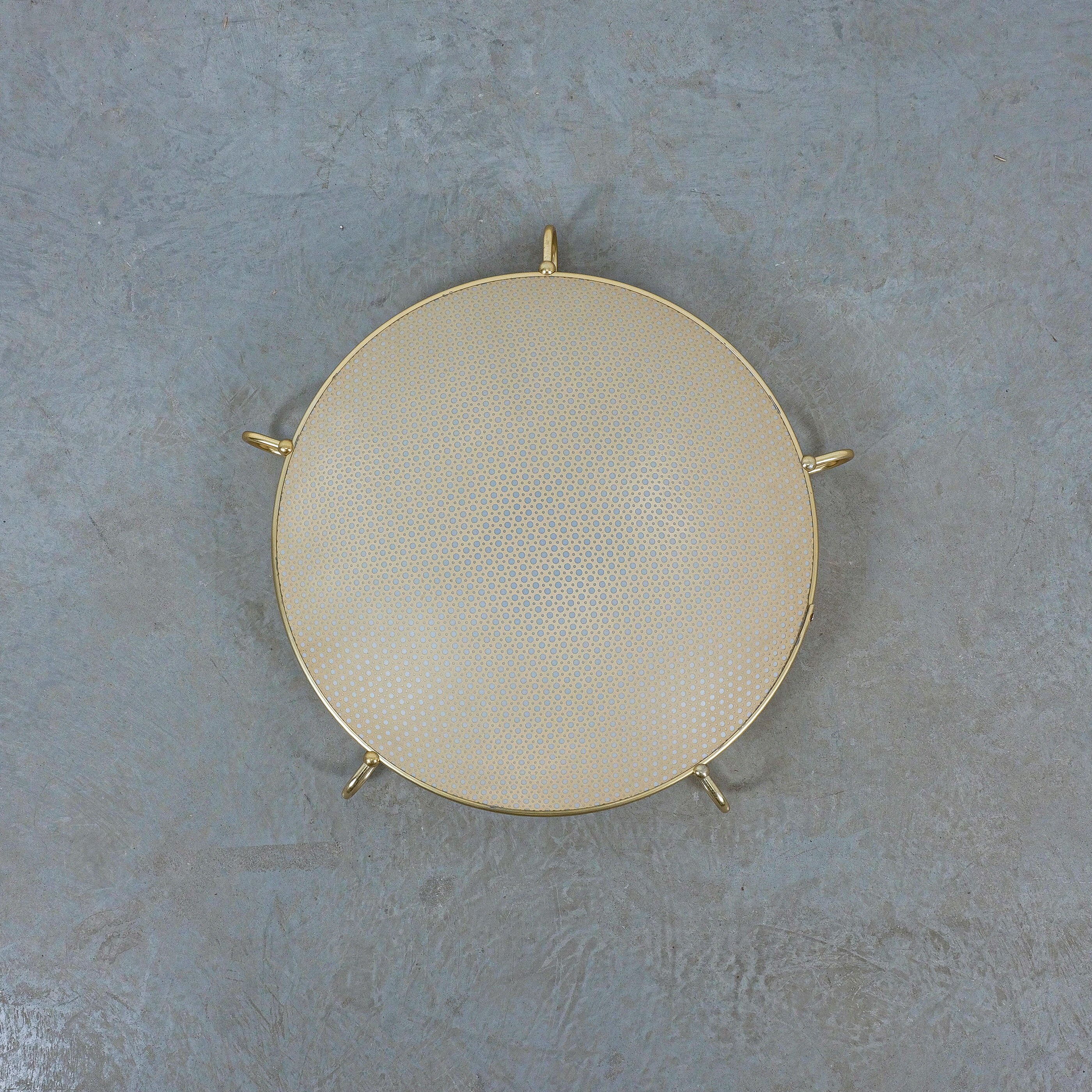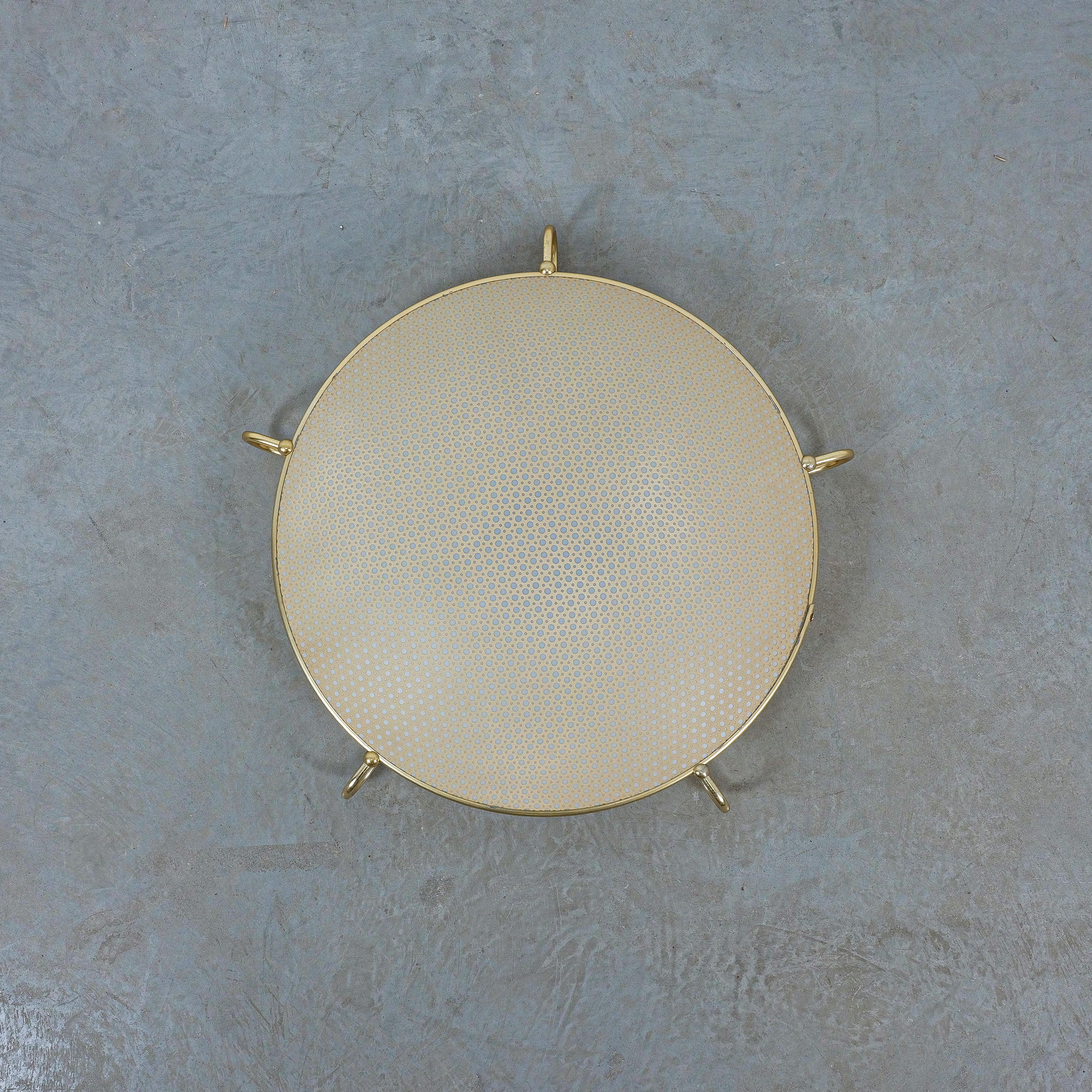 Flush-mount, circa 1955. This light features a stretched double layered shade with brass and aluminum hardware. It is in good vintage condition, checked, working condition. Three bulbs with e27/26 each with 60W max. Led's are possible and recommended, dimmable (depending on the type of bulb) Rewired for the US. Large Mid-century Vinyl flush mount, Germany 1950