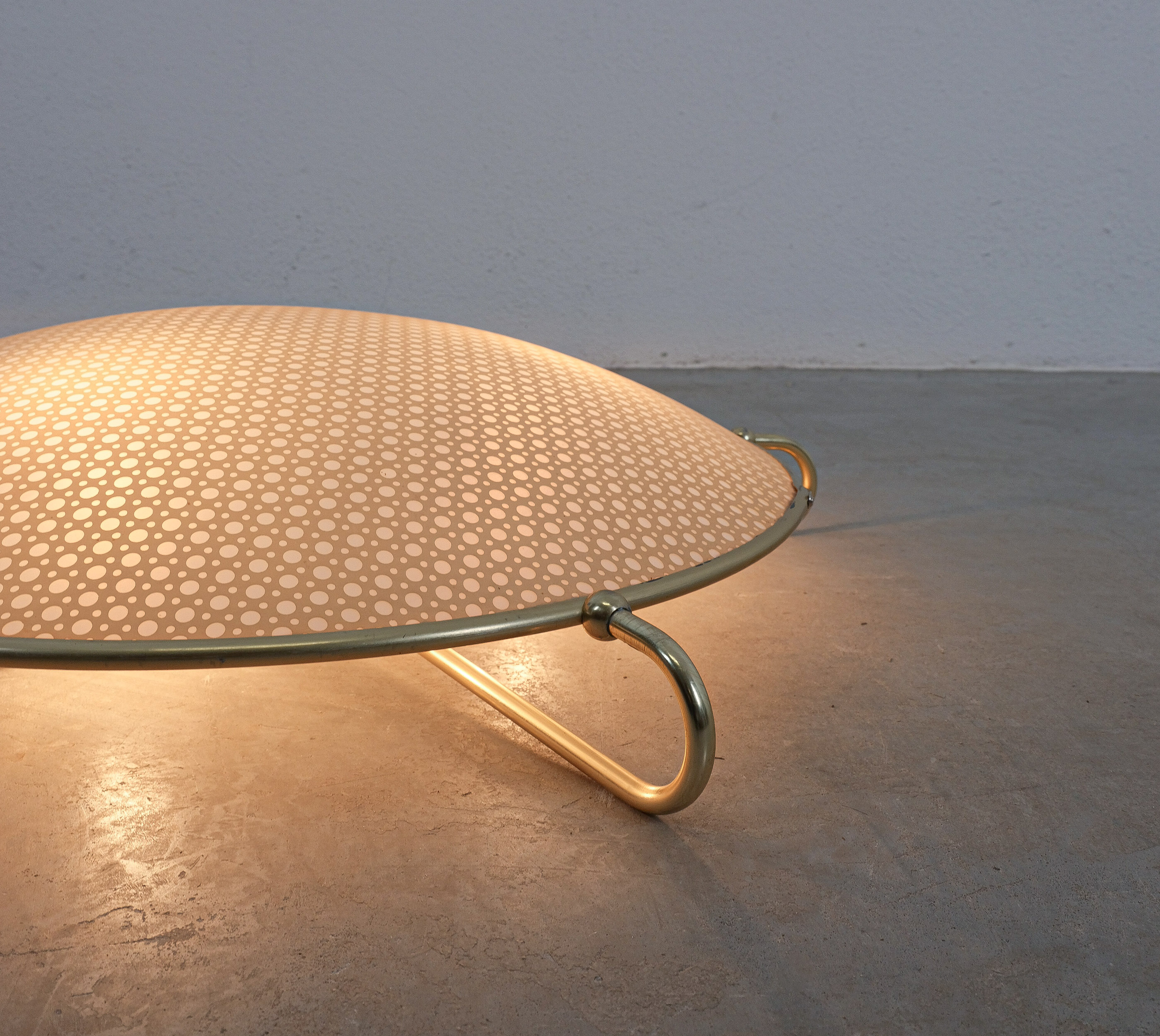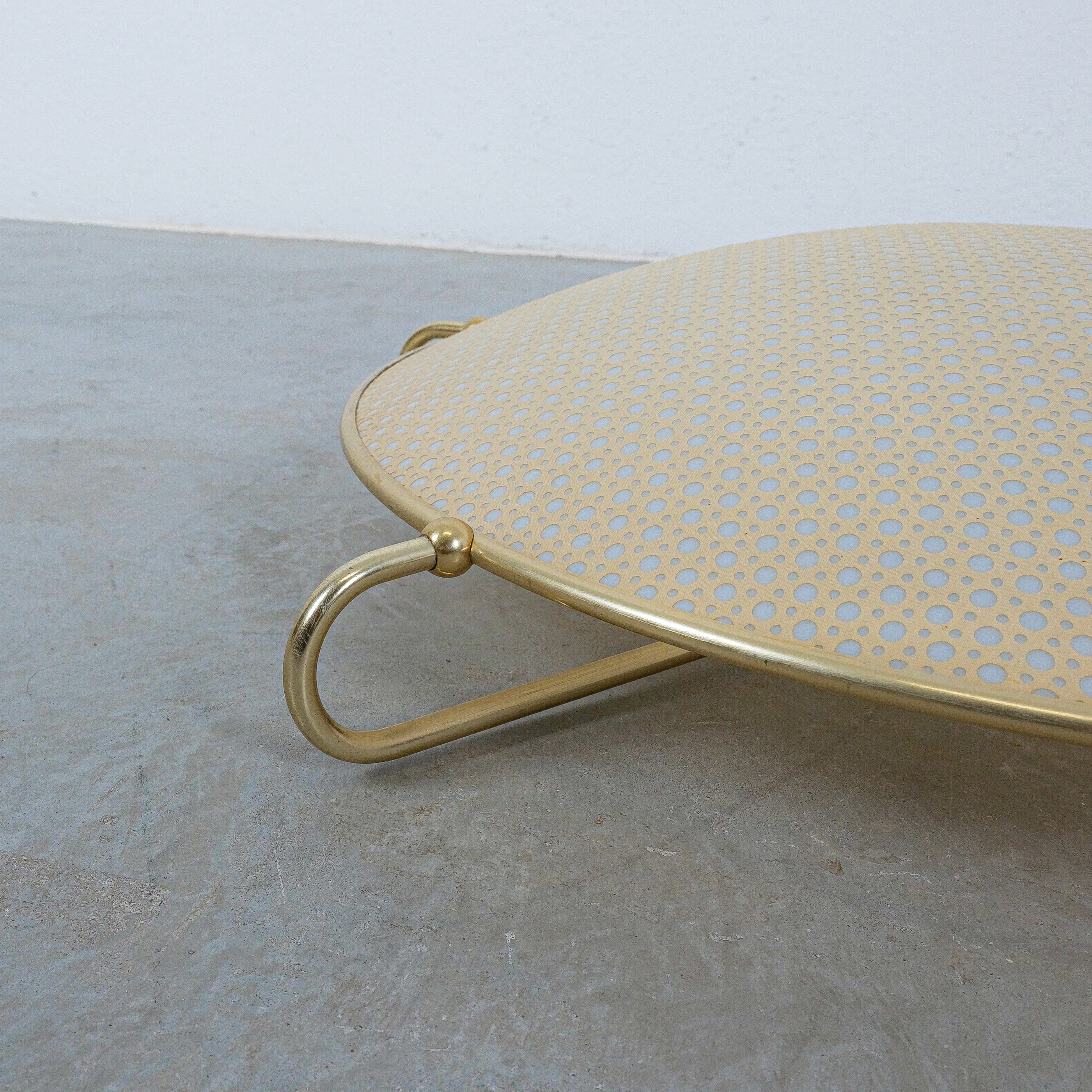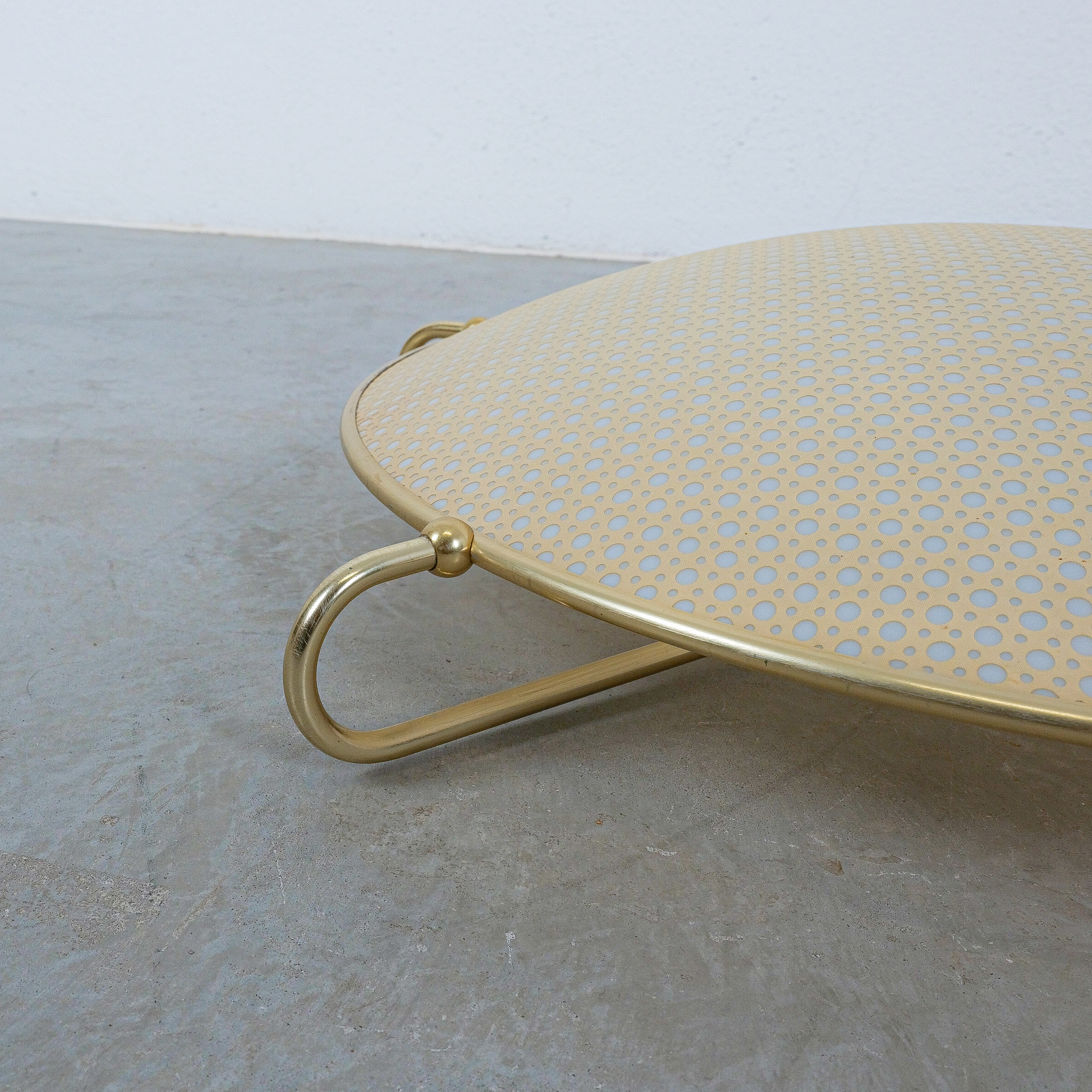 Flush-mount, circa 1955. This light features a stretched double layered shade with brass and aluminum hardware. It is in good vintage condition, checked, working condition. Three bulbs with e27/26 each with 60W max. Led's are possible and recommended, dimmable (depending on the type of bulb) Rewired for the US. Large Mid-century Vinyl flush mount, Germany 1950