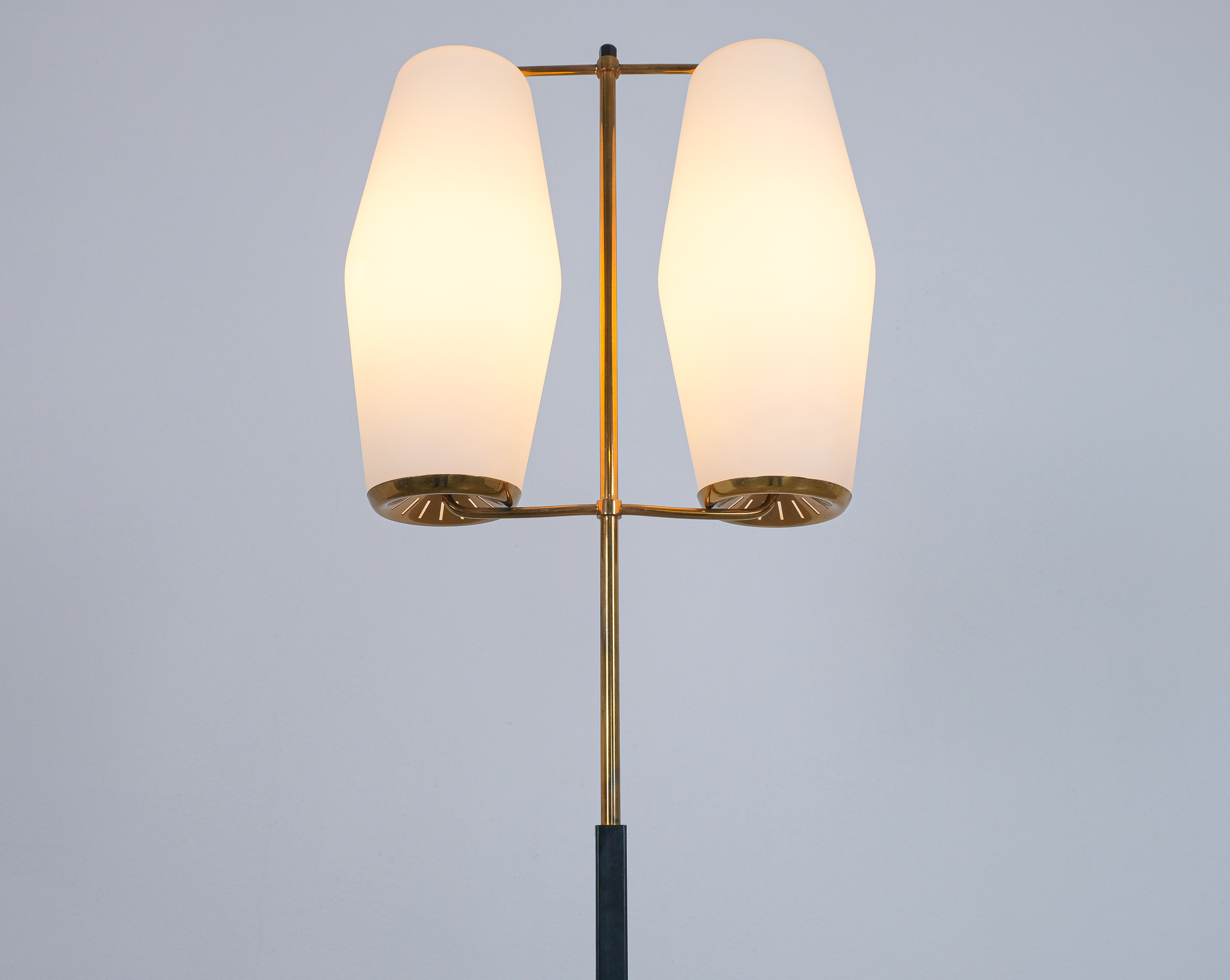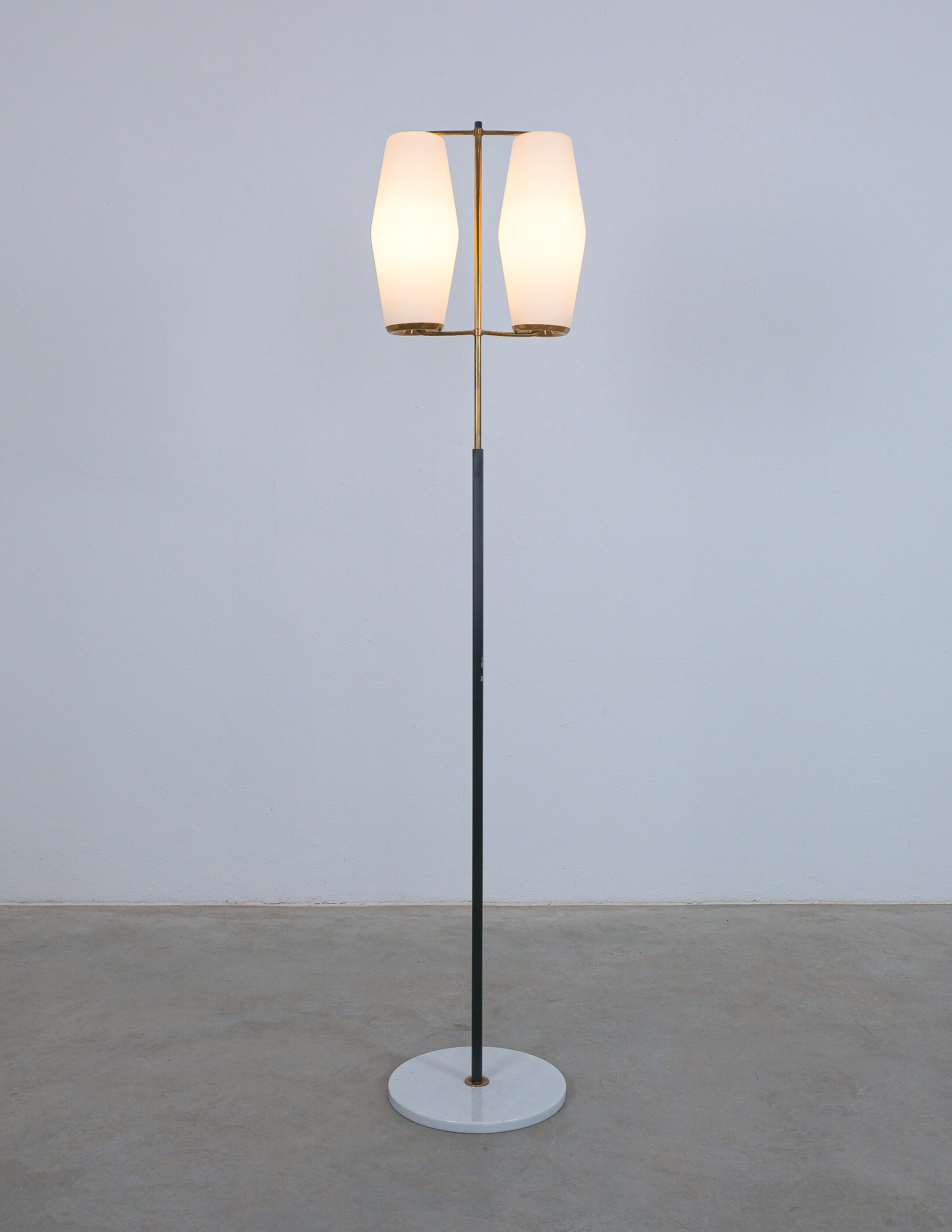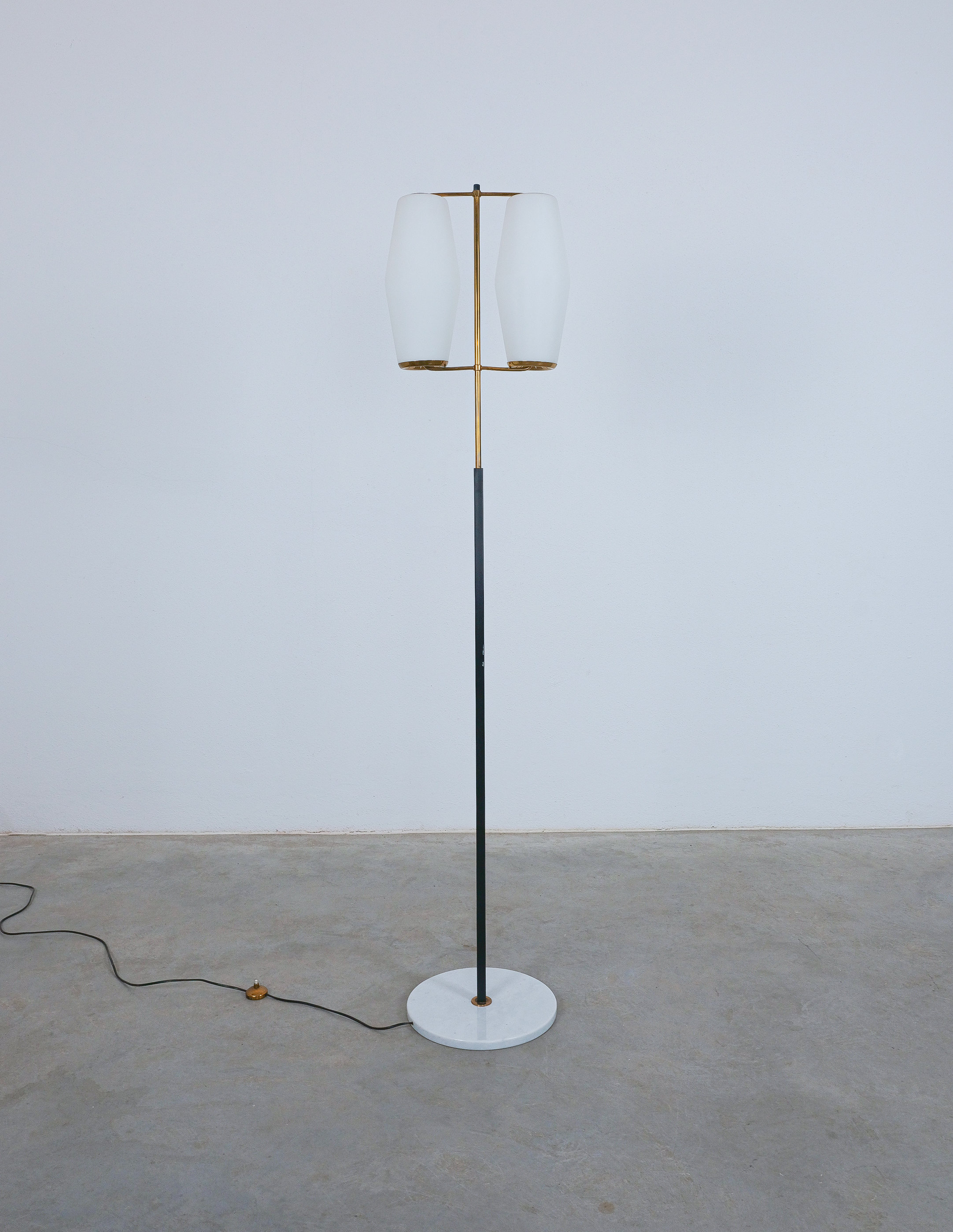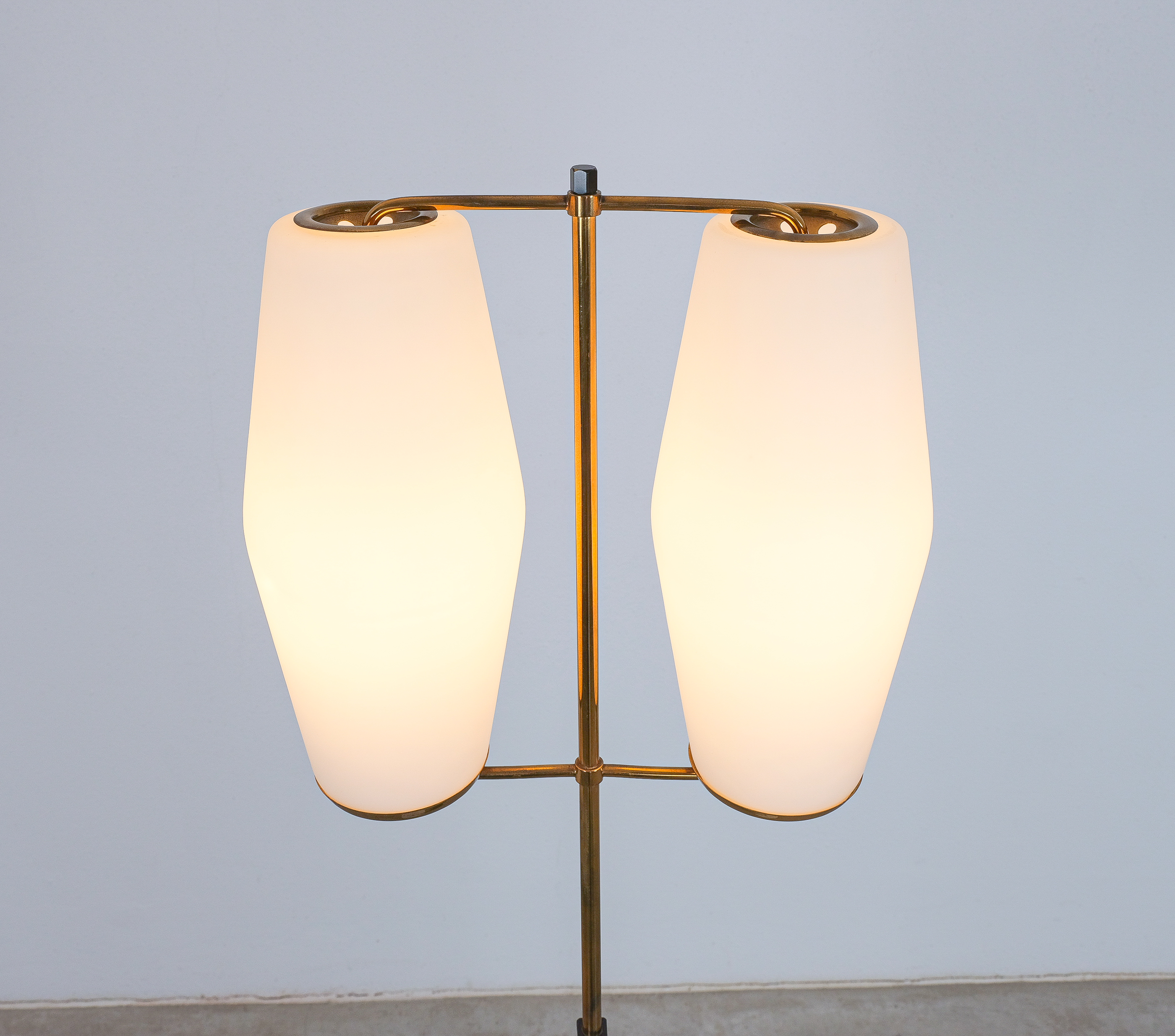 Early vintage original floor lamp with 2 large opal glass shades designed by Bruno Gatta produced for Stilnovo. It's marked (label on the inside). Symmetrical brass and glass lamp, very subtle and almost quite art-deco in style with its clear geometry and elegant lines. The stem is held in brass and blackened brass, the base is from marble. Each opaline glass takes one e26/27 bulb with 60W. Led's are recommended due to heat emission, the wattage can also be higher that way if required.
