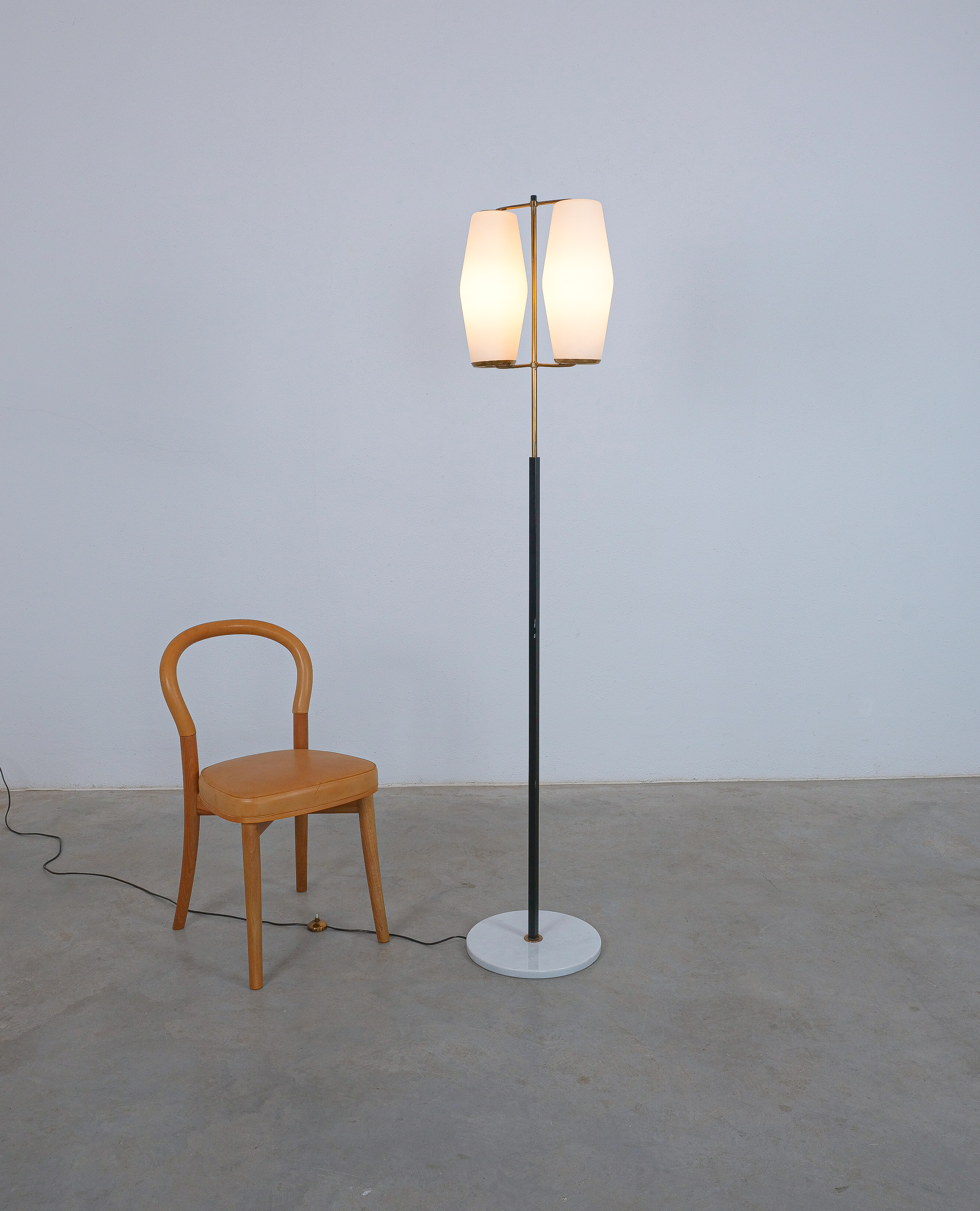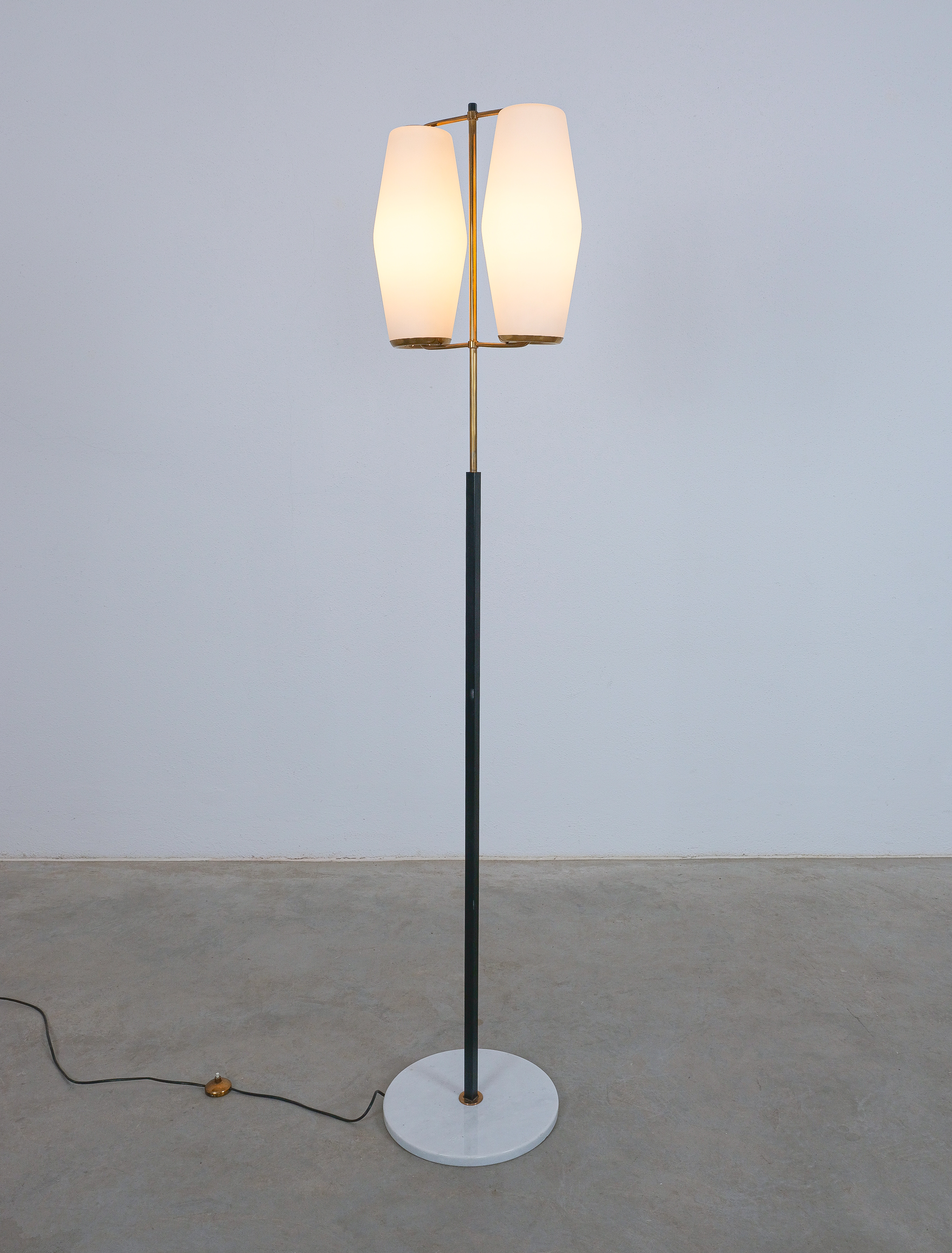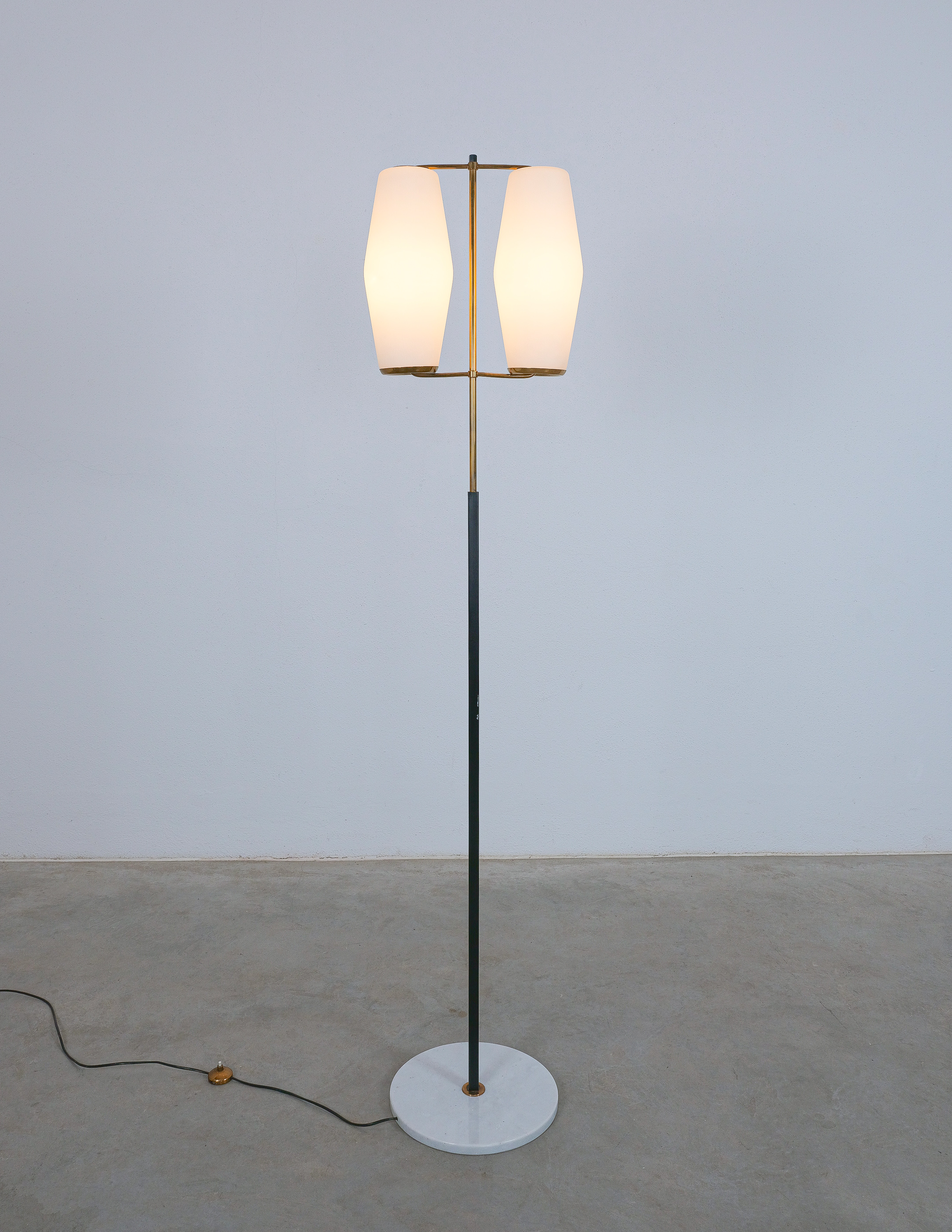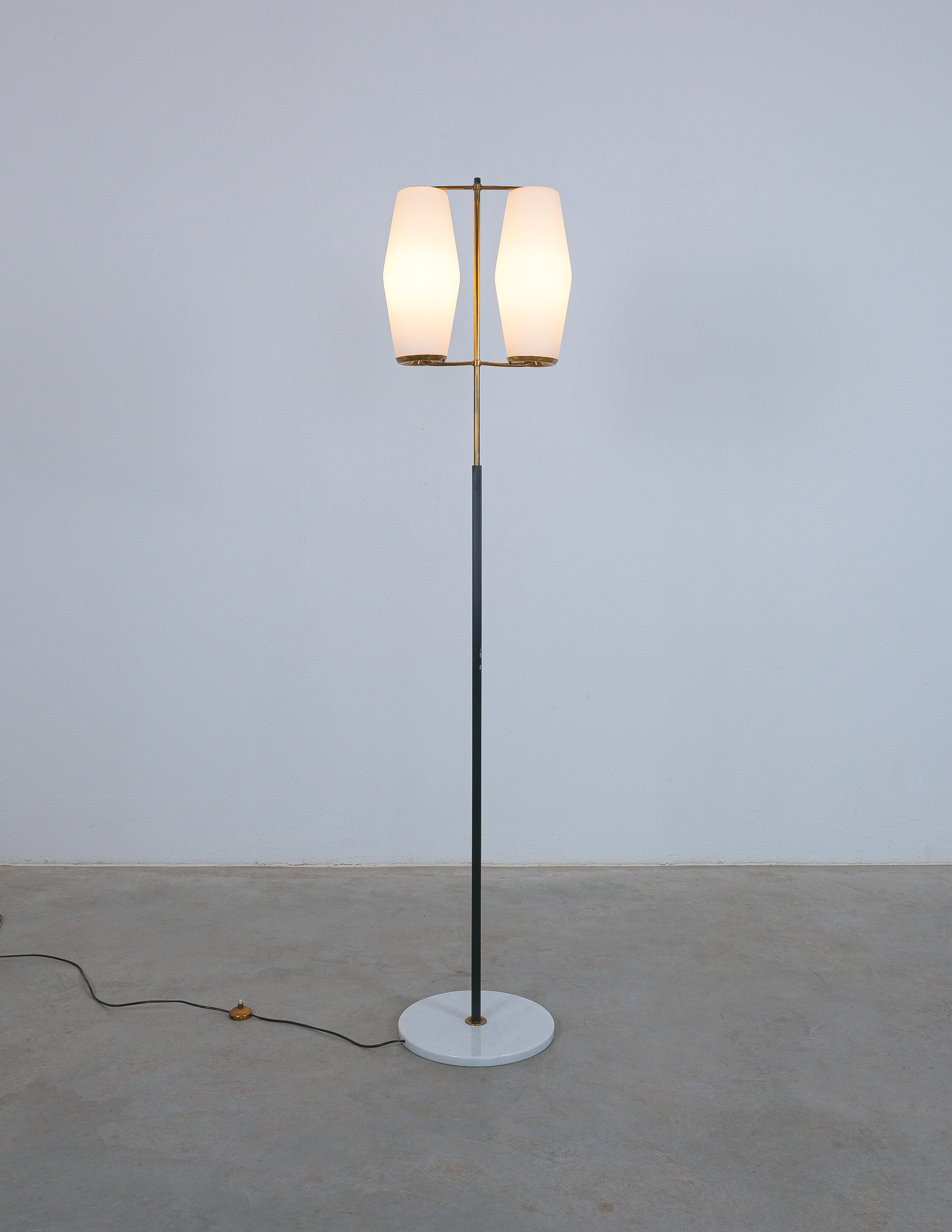 Early vintage original floor lamp with 2 large opal glass shades designed by Bruno Gatta produced for Stilnovo. It's marked (label on the inside). Symmetrical brass and glass lamp, very subtle and almost quite art-deco in style with its clear geometry and elegant lines. The stem is held in brass and blackened brass, the base is from marble. Each opaline glass takes one e26/27 bulb with 60W. Led's are recommended due to heat emission, the wattage can also be higher that way if required.