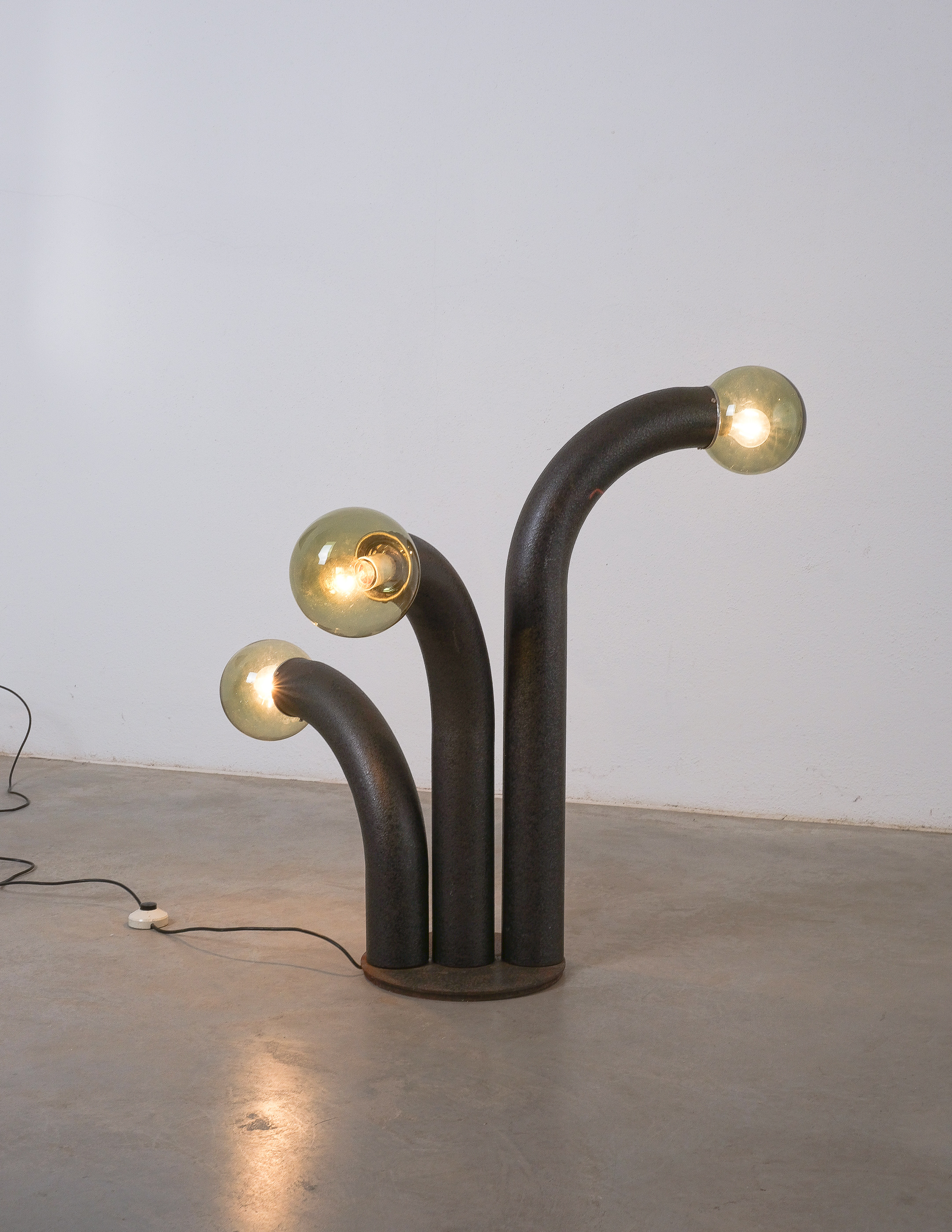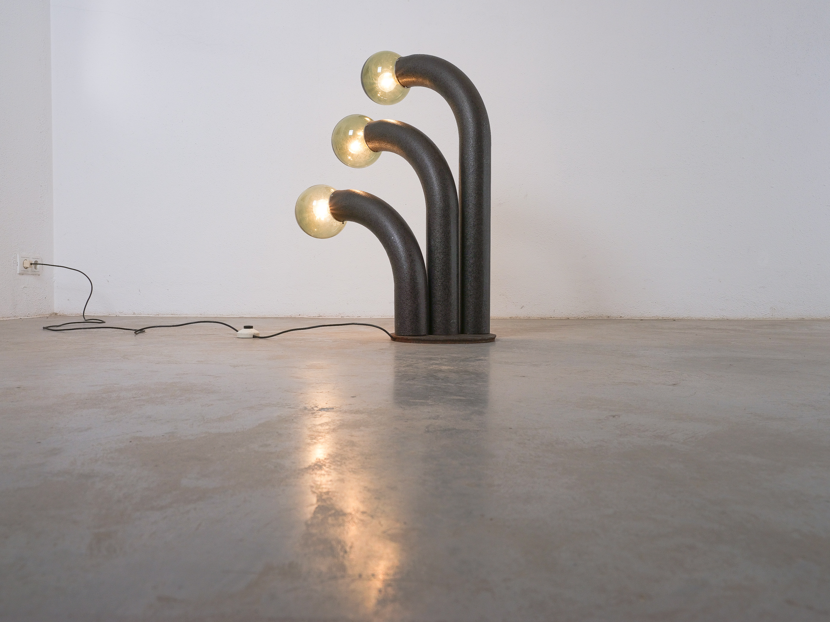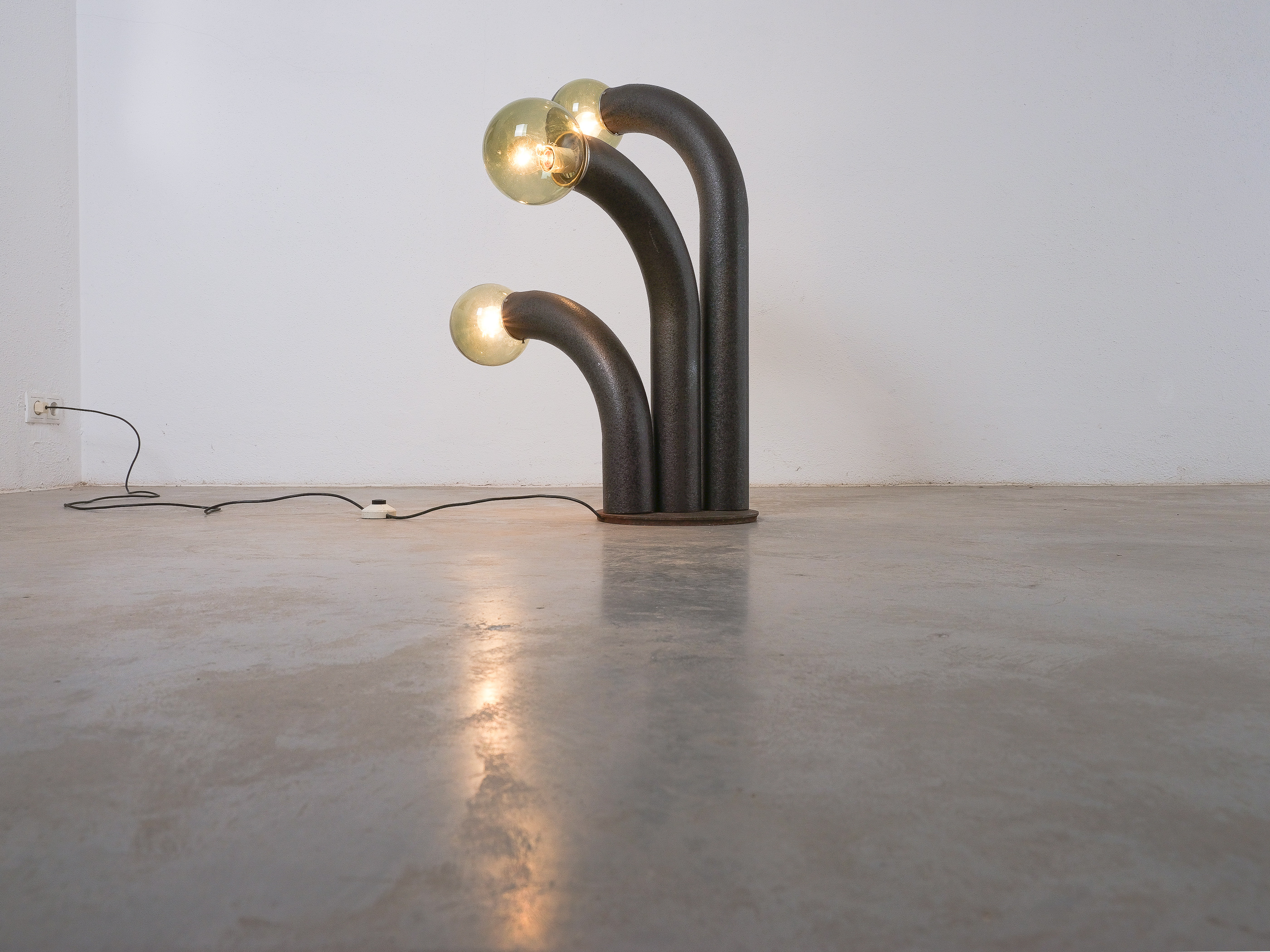 Unique floor lamp made from iron and green glass. The 3 independent heavy tubes are pivoting individually in all kinds of directions. It's a very rough and heavy piece of furniture that is great for a dramatic brutalist setting or in a fire-place scenario. We had it gently cleaned and left the original patina. It is in good original condition. It shows a fissure at the bottom of the stem and a chip at the top rim. Three bulbs with a max of 100W each, (e27) Led's recommended due to heat emission of standard bulbs.