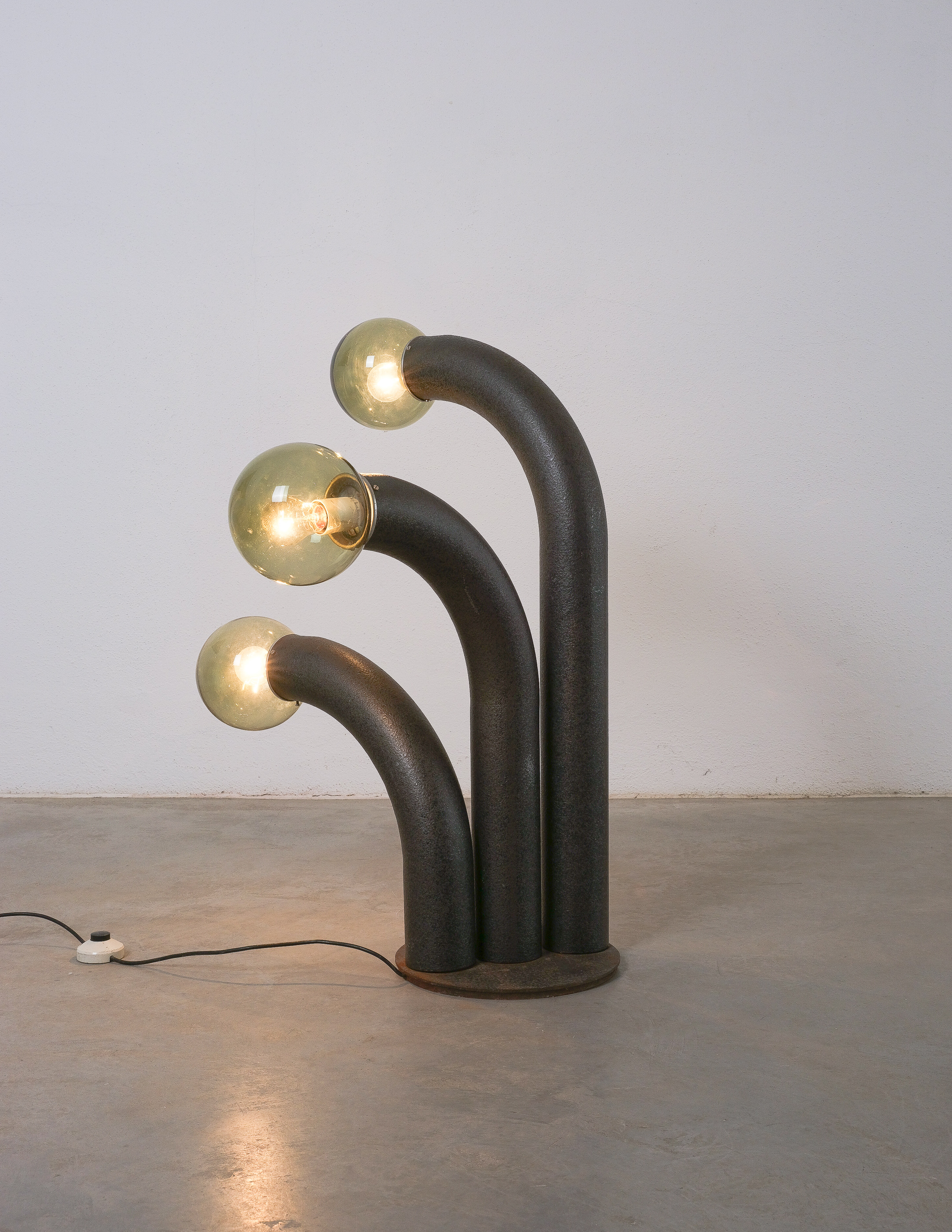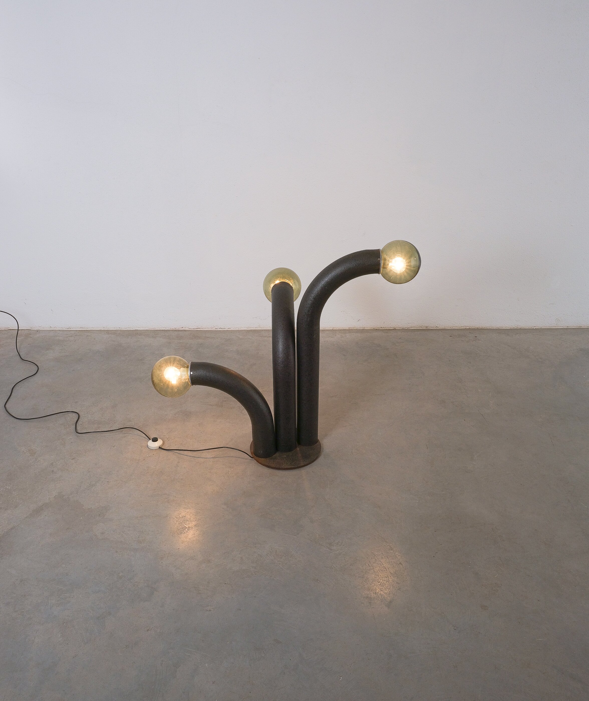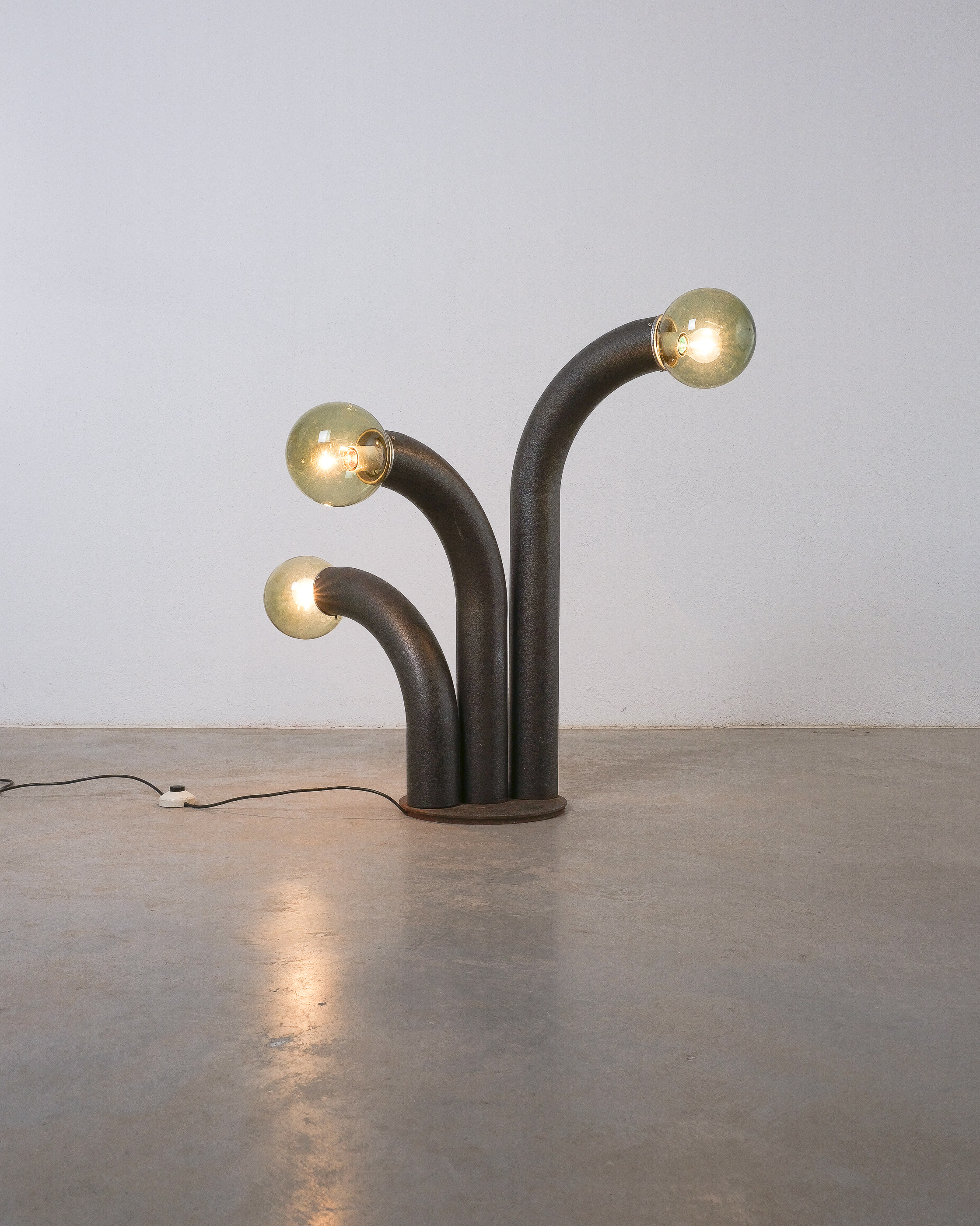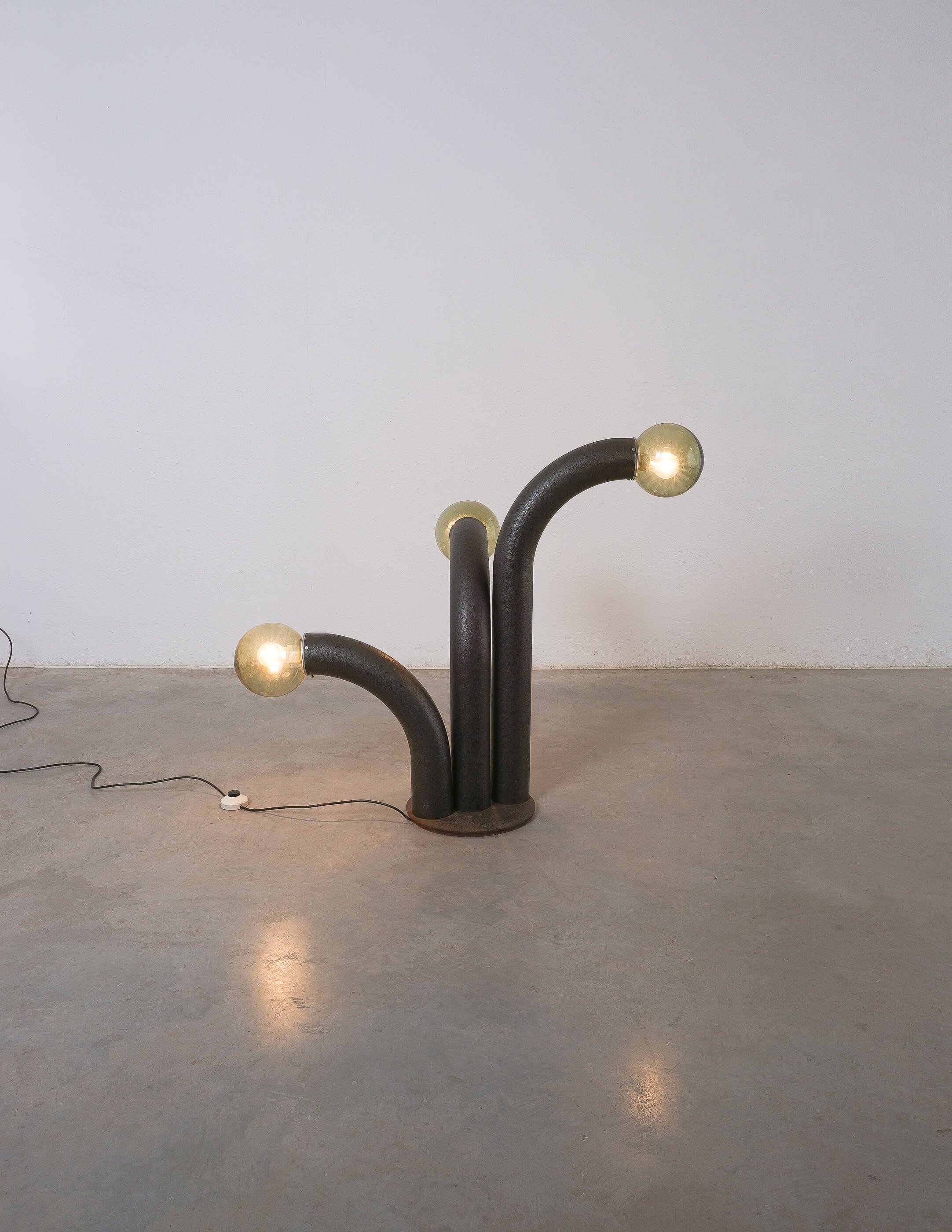 Unique floor lamp made from iron and green glass. The 3 independent heavy tubes are pivoting individually in all kinds of directions. It's a very rough and heavy piece of furniture that is great for a dramatic brutalist setting or in a fire-place scenario. We had it gently cleaned and left the original patina. It is in good original condition. It shows a fissure at the bottom of the stem and a chip at the top rim. Three bulbs with a max of 100W each, (e27) Led's recommended due to heat emission of standard bulbs.