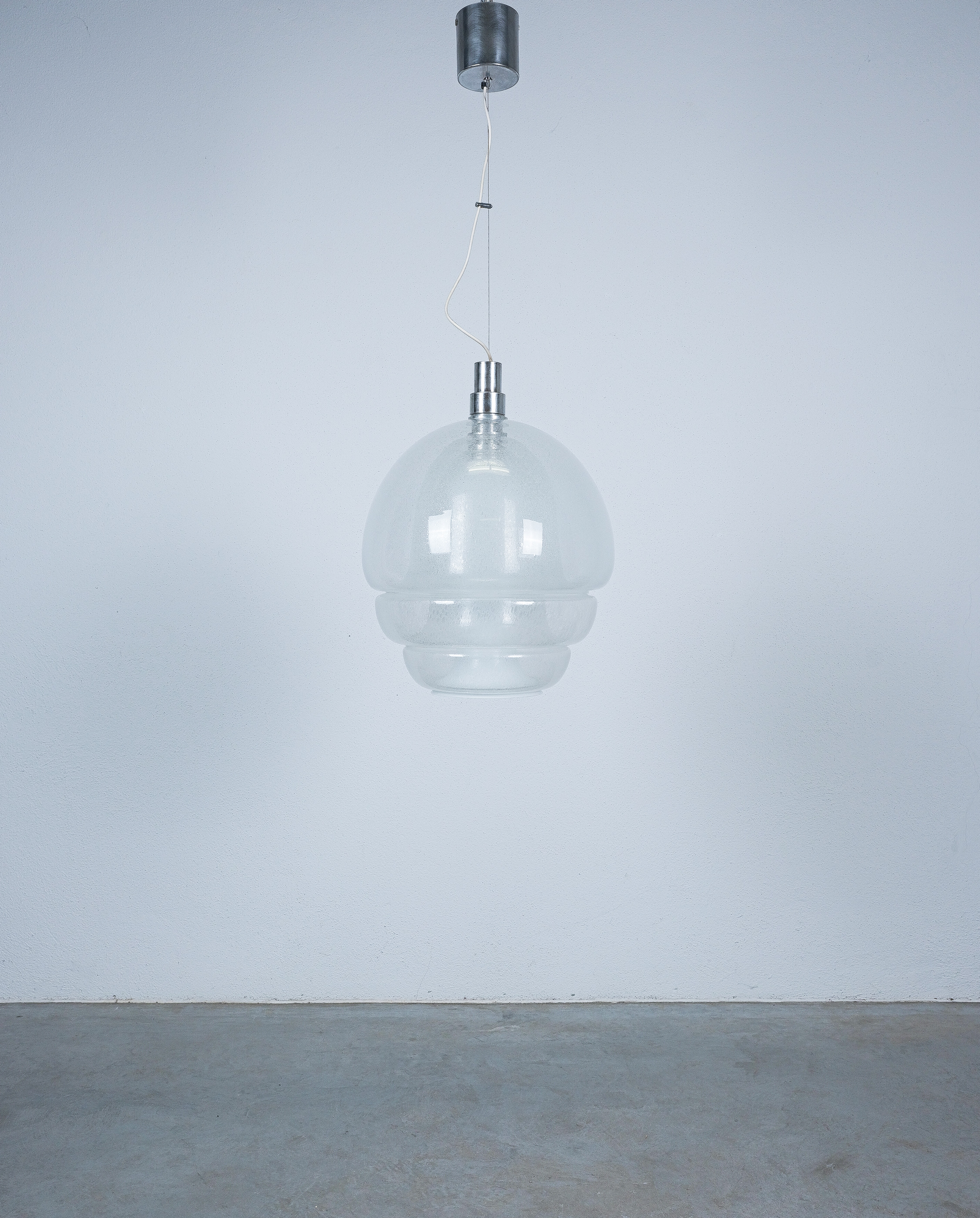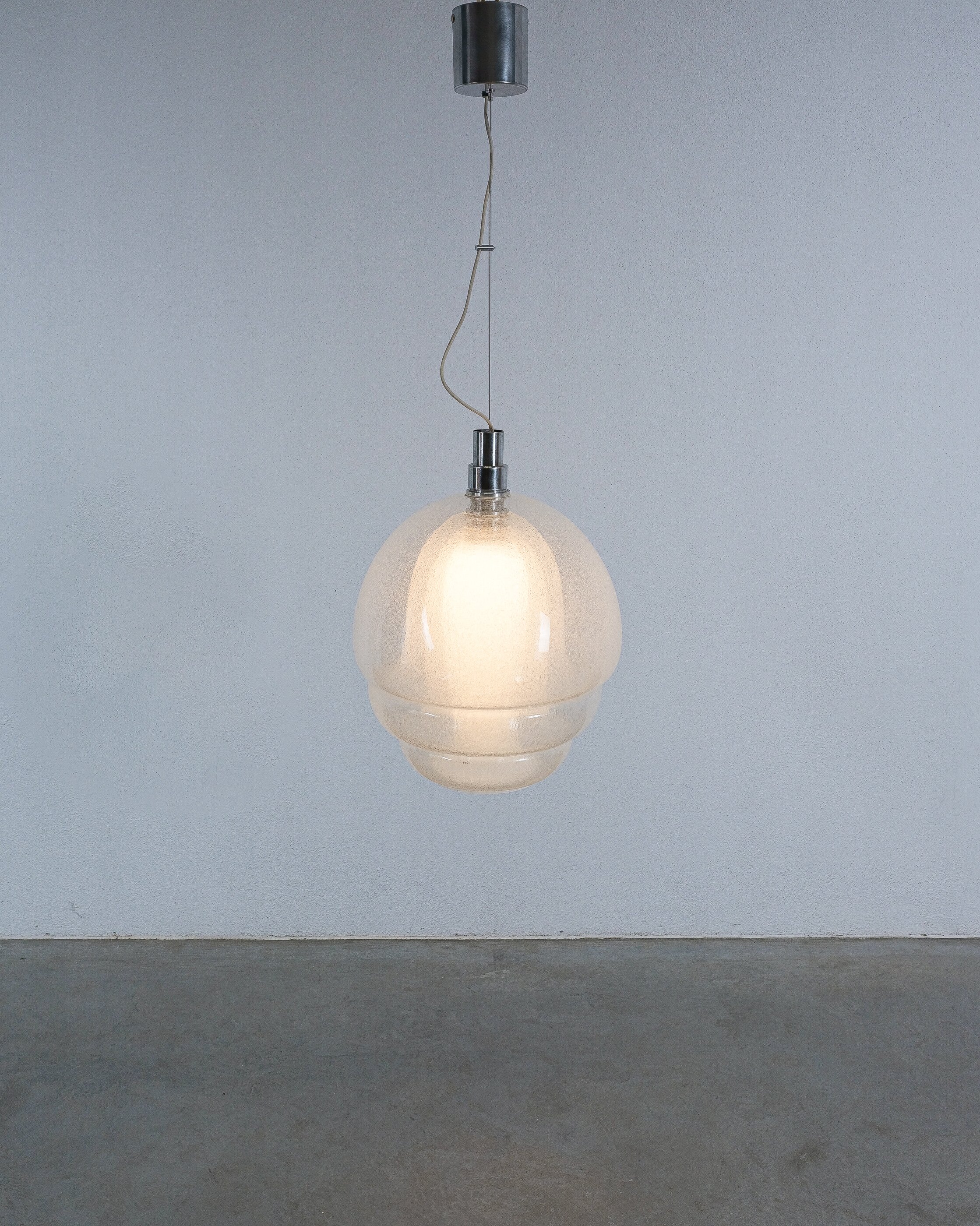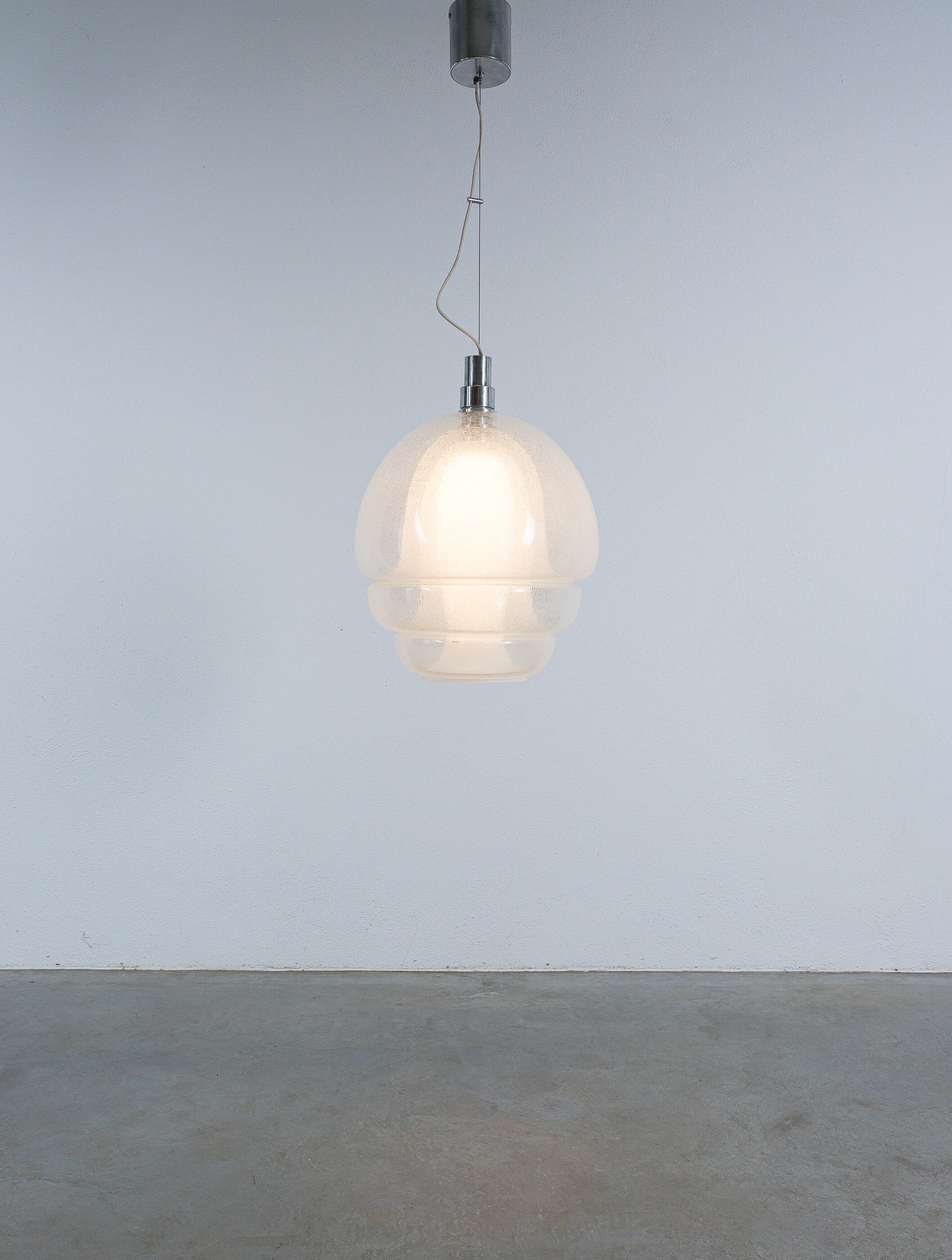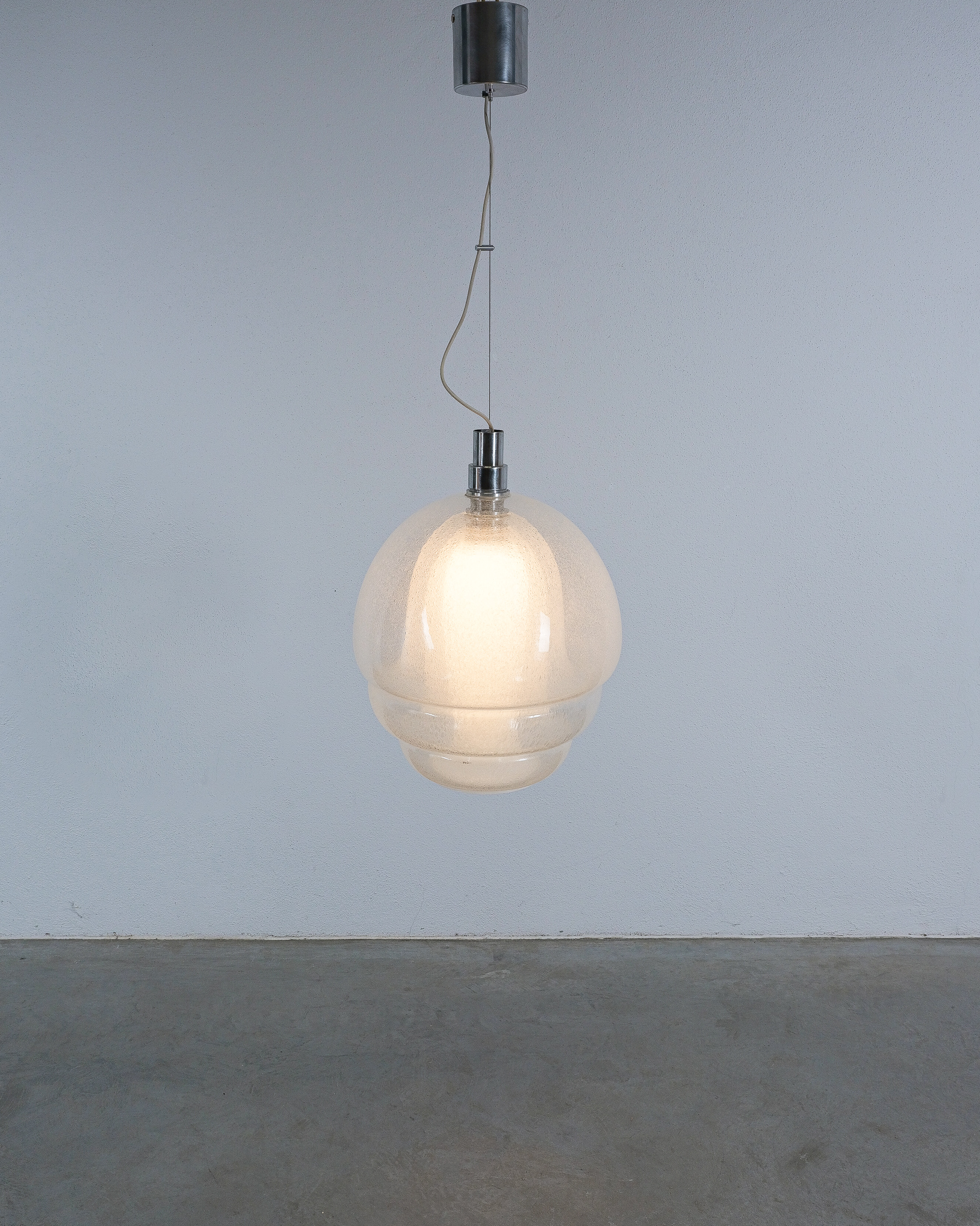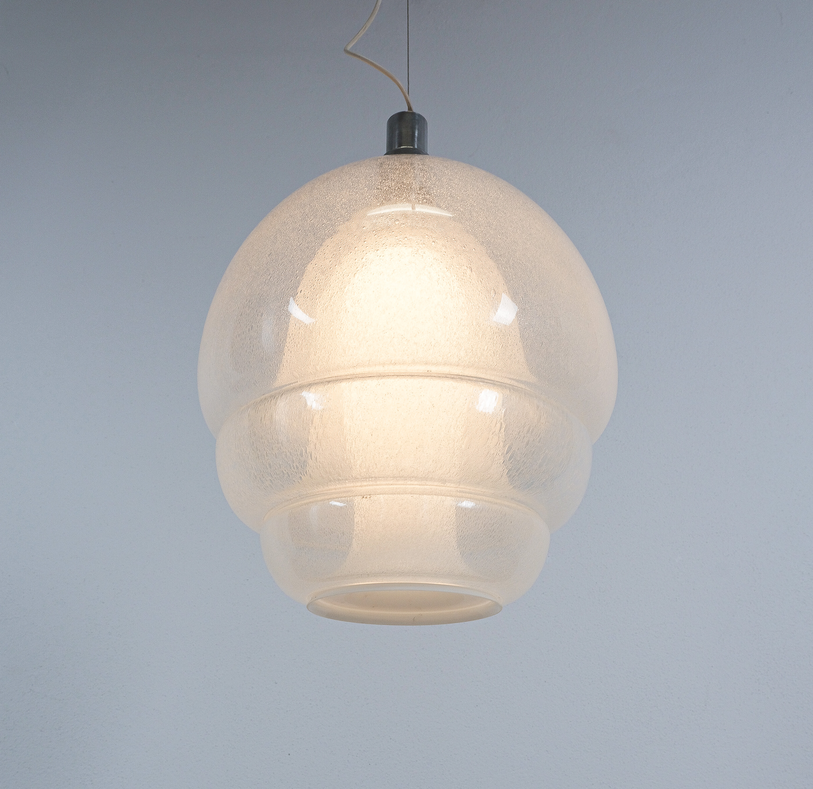Featuring four interlocking glass parts handblown into a single mold this stunning piece is done in Pulegoso technique (bubbled glass). The LS 134 Medusa Hanging Lamp is a striking example of mid-century Italian craftsmanship. This sculptural pendant lamp features four layers of hand-blown Murano glass—a technique known as "soffiature"—each with delicate bubble inclusions that enhance its organic, fluid form. Named "Medusa," the Italian word for jellyfish, the lamp reflects its namesake’s graceful, floating appearance. The lamp is in very good, undamaged condition, it takes one large e27 bulb with 100W max (we recommend Led's for lesser heat emission).