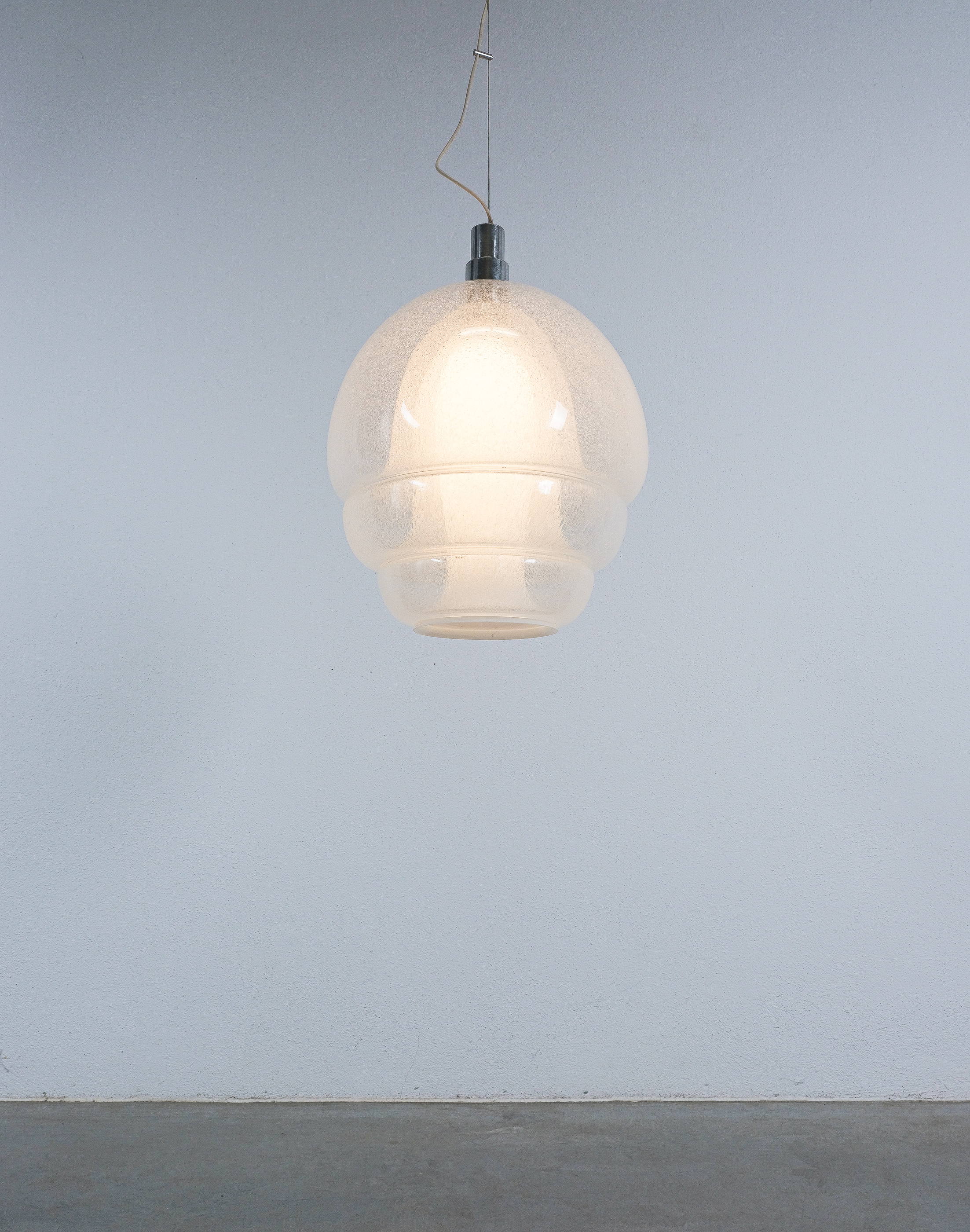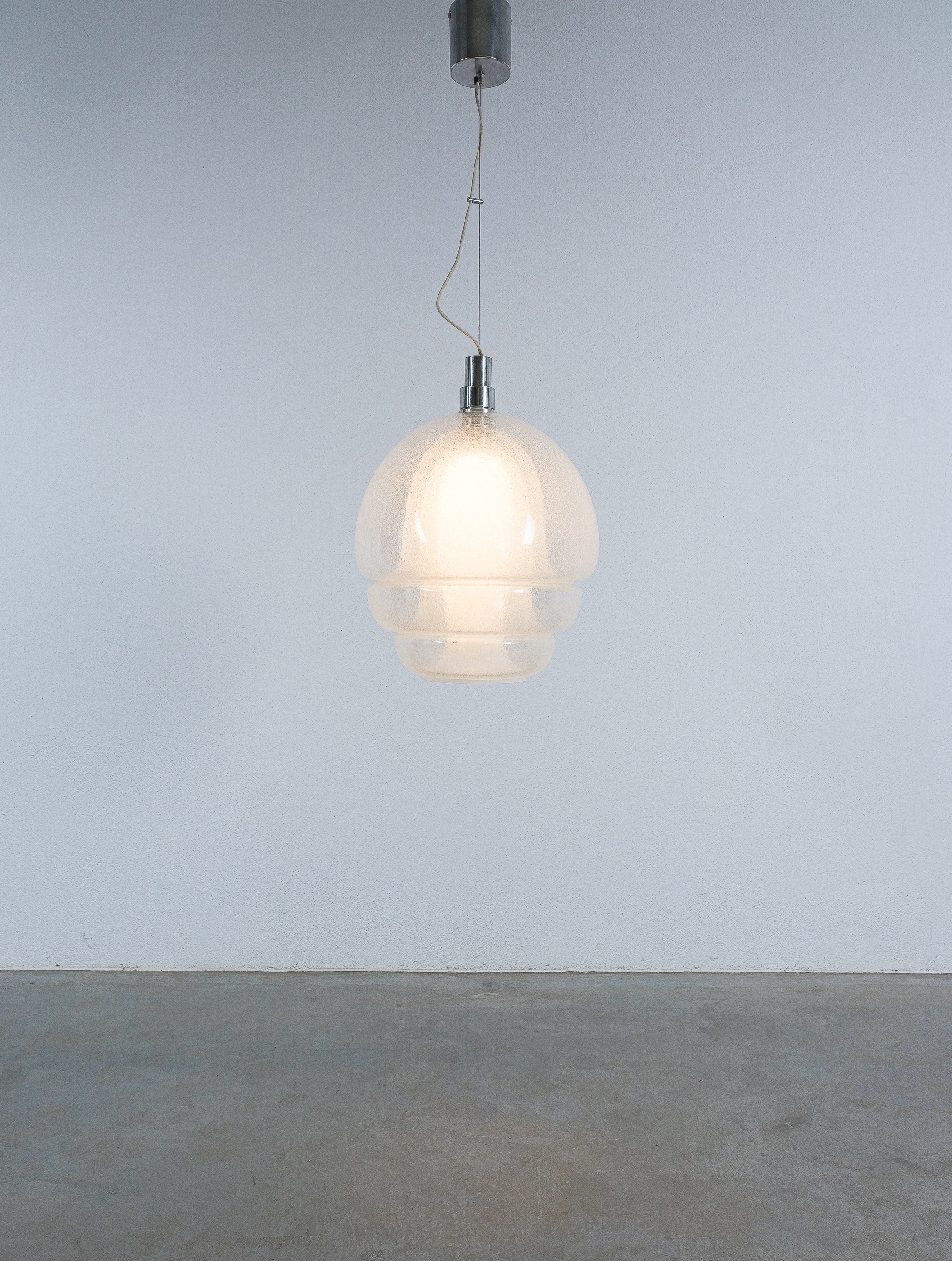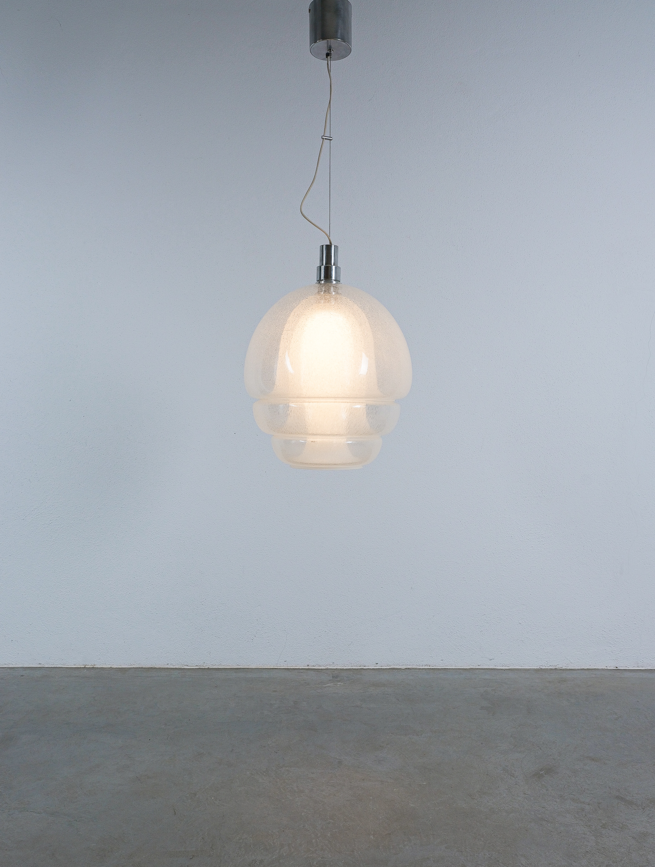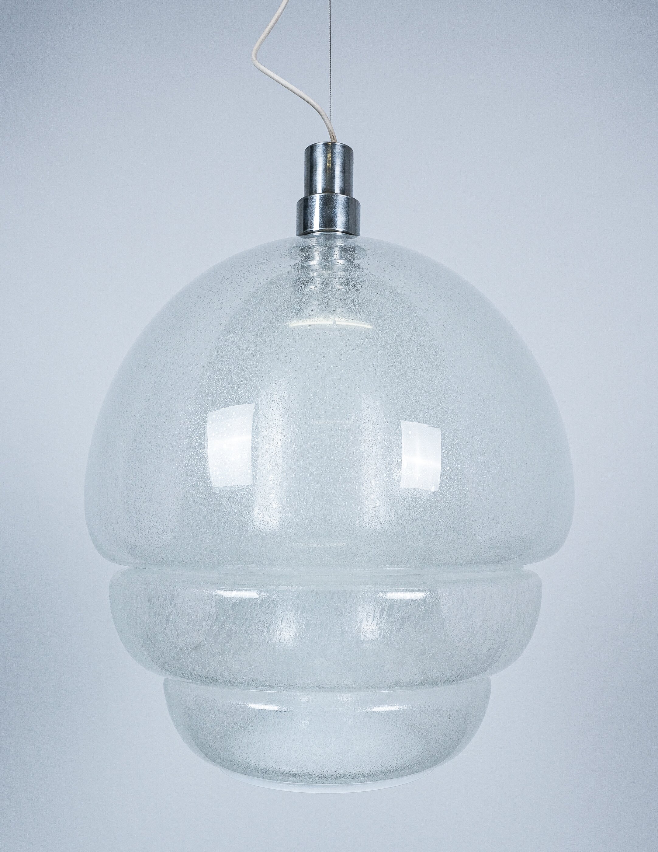 Featuring four interlocking glass parts handblown into a single mold this stunning piece is done in Pulegoso technique (bubbled glass). The LS 134 Medusa Hanging Lamp is a striking example of mid-century Italian craftsmanship. This sculptural pendant lamp features four layers of hand-blown Murano glass—a technique known as "soffiature"—each with delicate bubble inclusions that enhance its organic, fluid form. Named "Medusa," the Italian word for jellyfish, the lamp reflects its namesake’s graceful, floating appearance. The lamp is in very good, undamaged condition, it takes one large e27 bulb with 100W max (we recommend Led's for lesser heat emission).