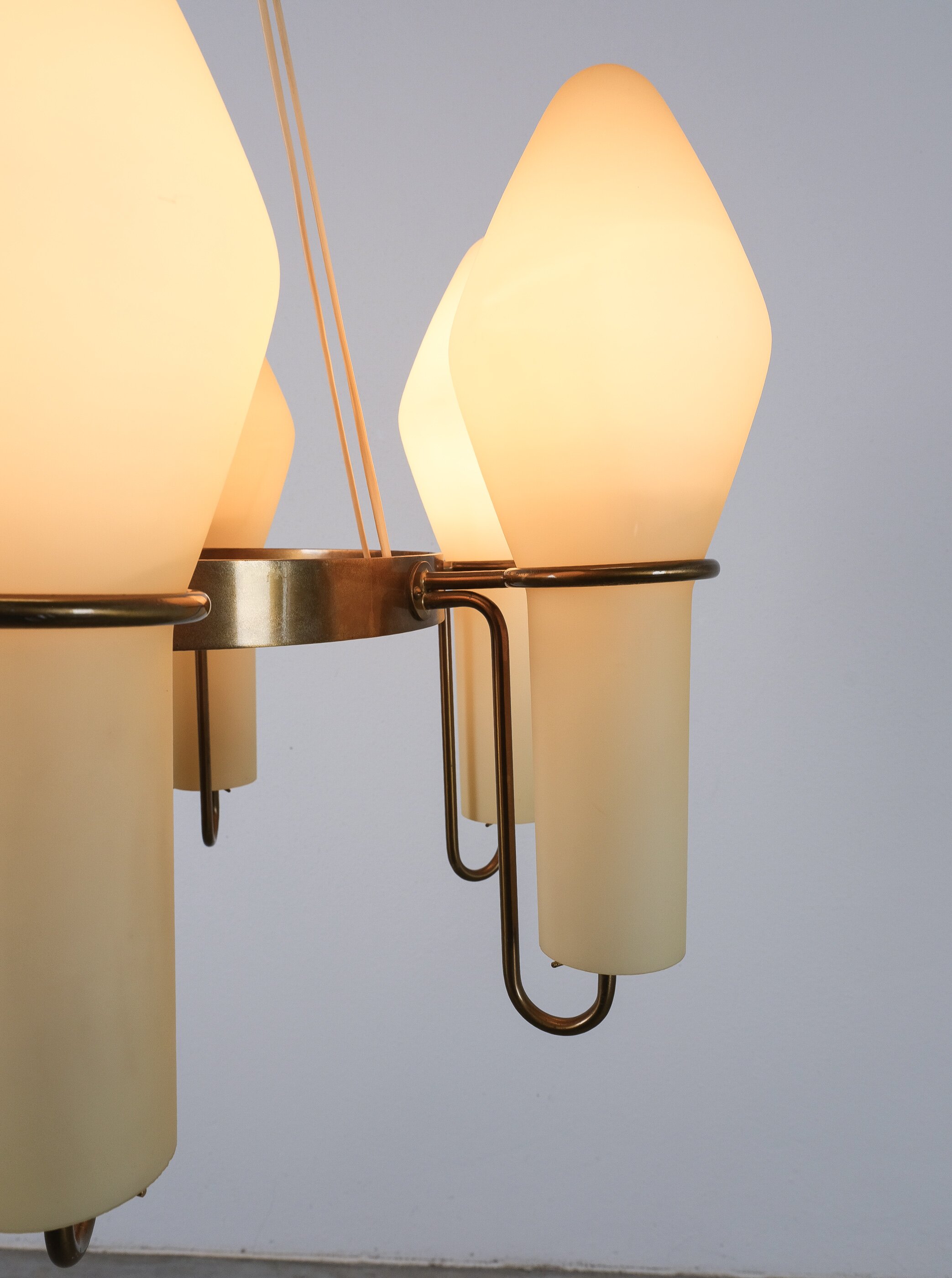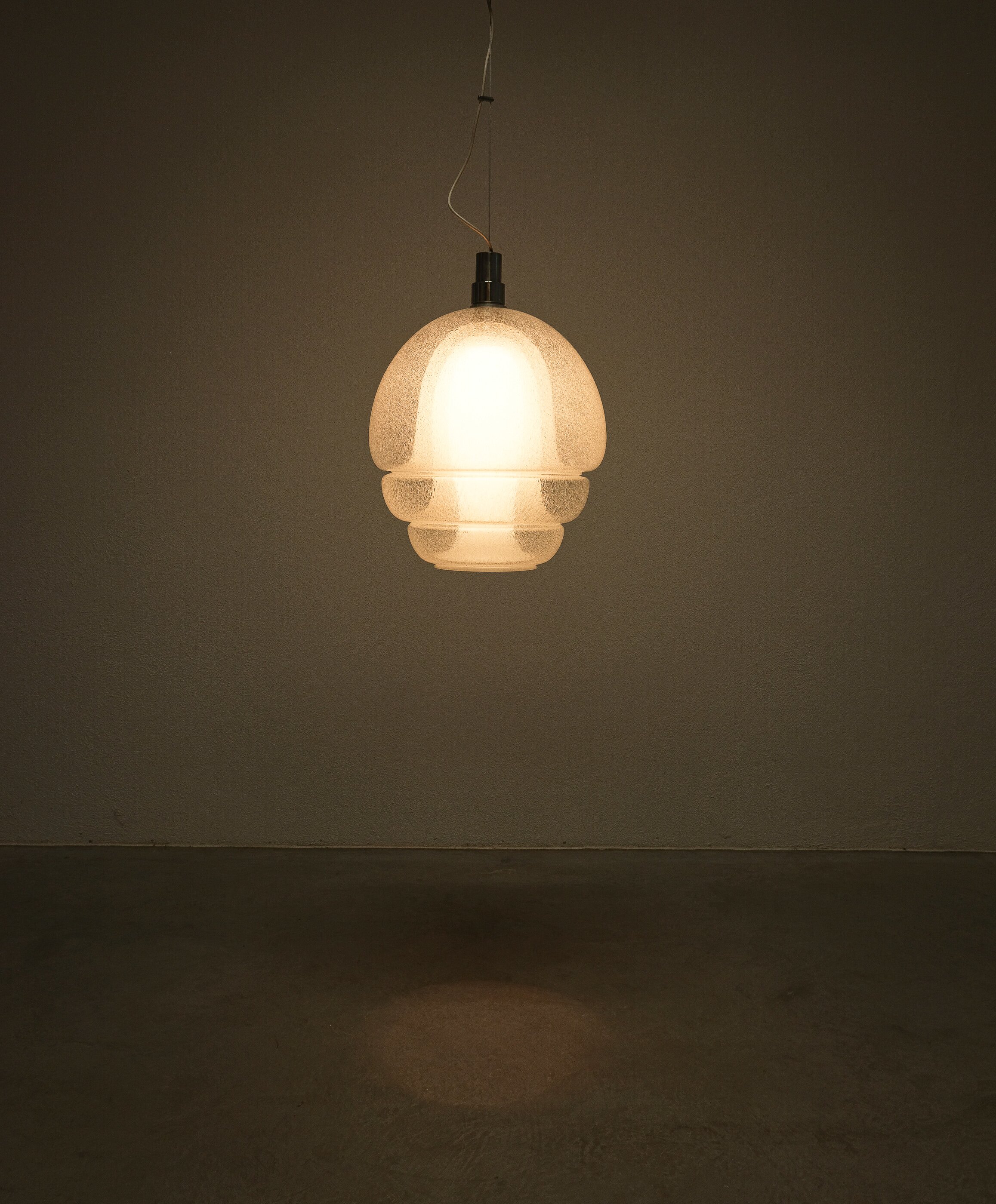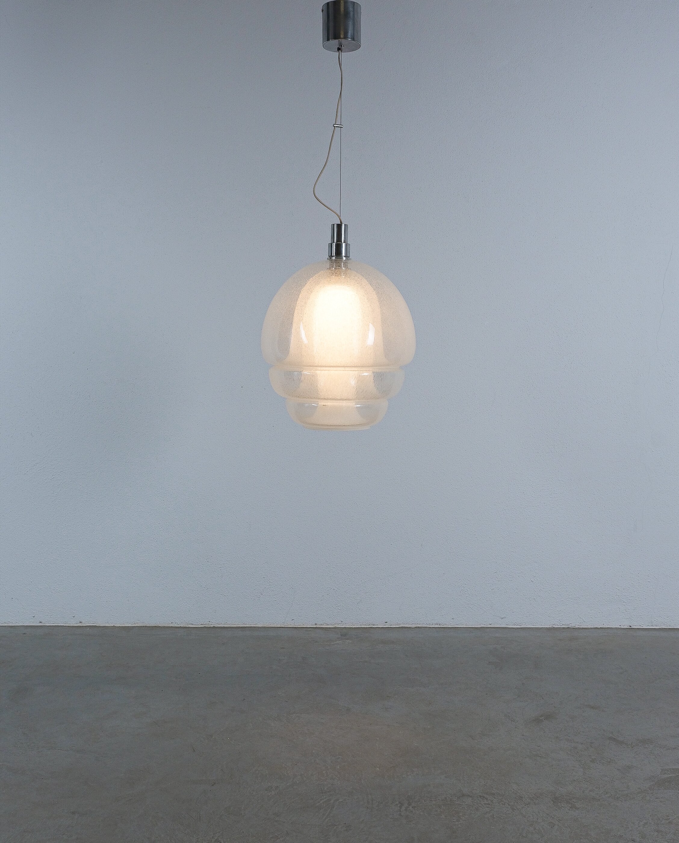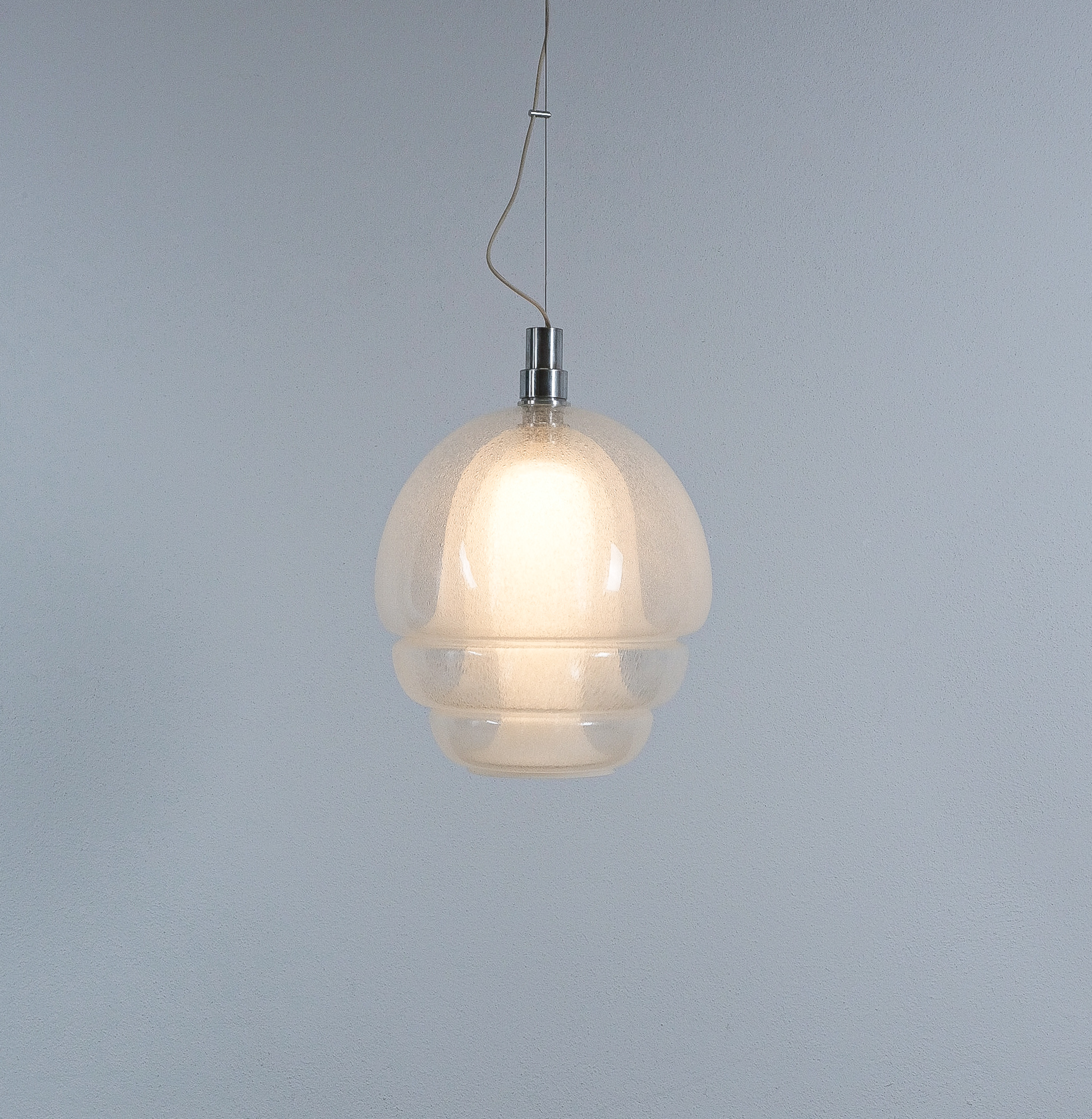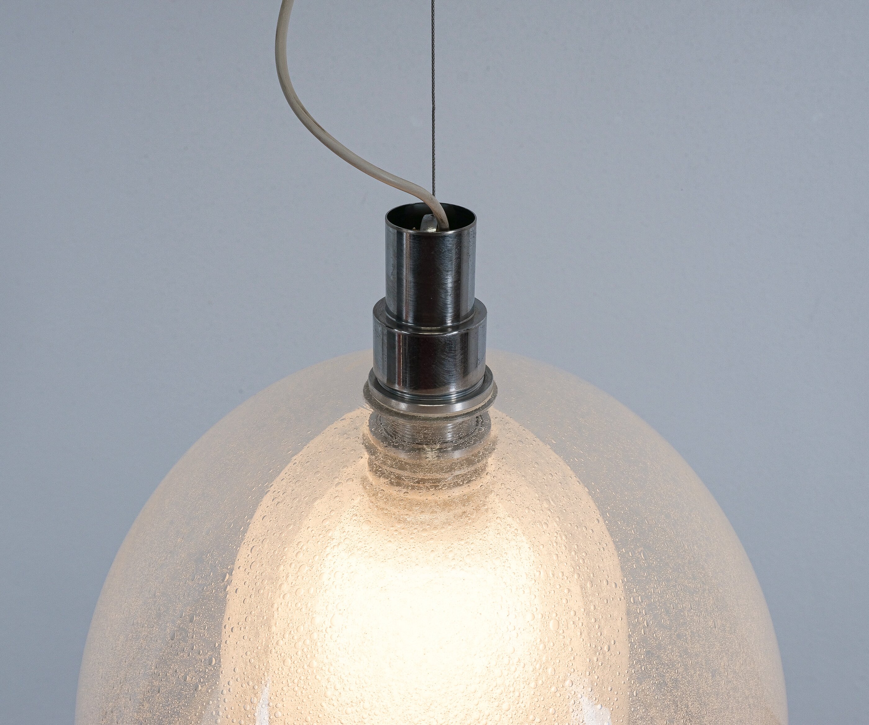 Featuring four interlocking glass parts handblown into a single mold this stunning piece is done in Pulegoso technique (bubbled glass). The LS 134 Medusa Hanging Lamp is a striking example of mid-century Italian craftsmanship. This sculptural pendant lamp features four layers of hand-blown Murano glass—a technique known as "soffiature"—each with delicate bubble inclusions that enhance its organic, fluid form. Named "Medusa," the Italian word for jellyfish, the lamp reflects its namesake’s graceful, floating appearance. The lamp is in very good, undamaged condition, it takes one large e27 bulb with 100W max (we recommend Led's for lesser heat emission).