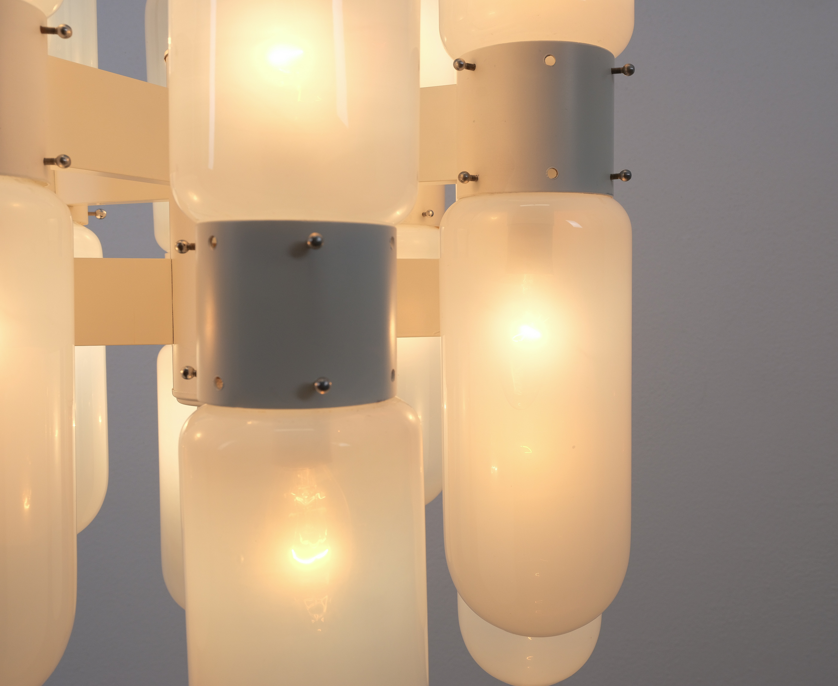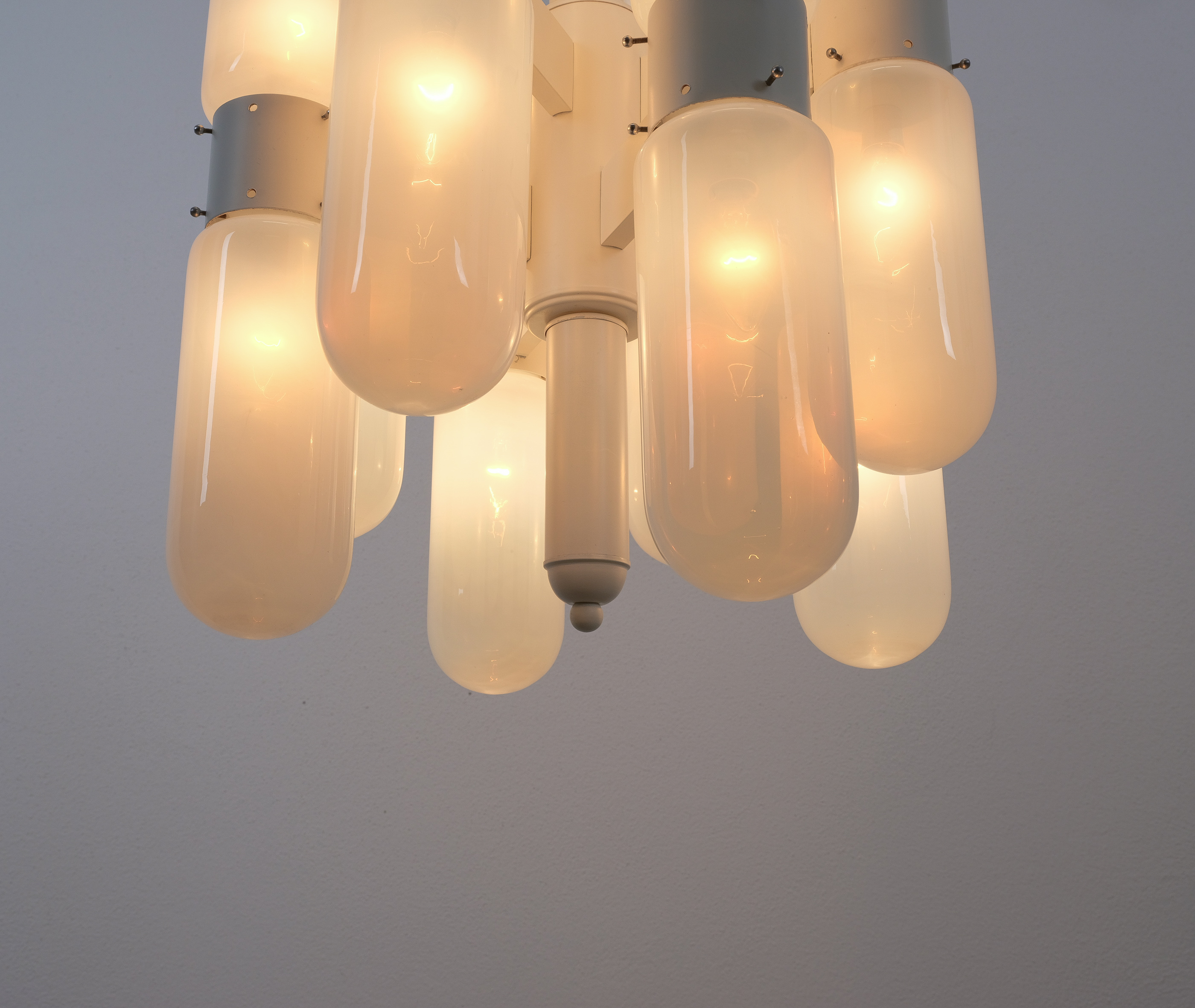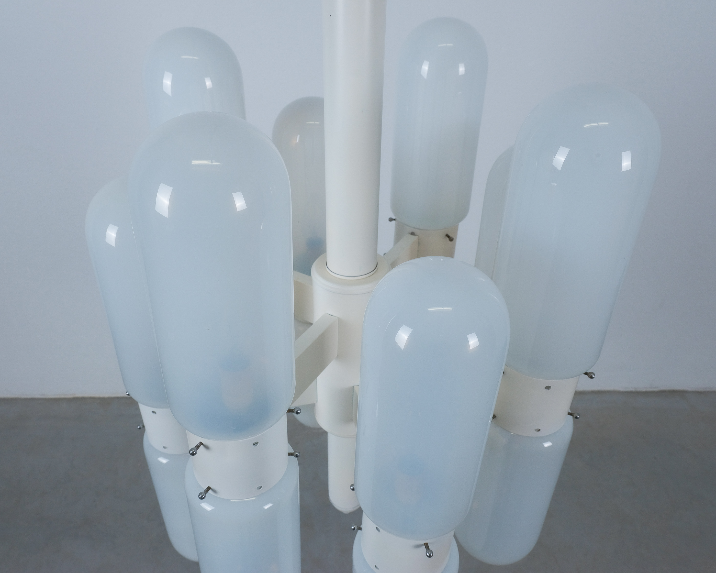 Very scarce Carlo Nason light with almost 20 inches in diameter in refurbished condition. The original creme-white paint we have renewed. This light features 16 'torpedo' glass tubes in iridescent glass. Each tube covers a small e14 bulb socket with 40W per socket. Led's are recommended. Dimensions are 19.5" (diameter) x 22.74" (height) shade only. Overall drop as pictured is 43.3". The original canopy is present.
