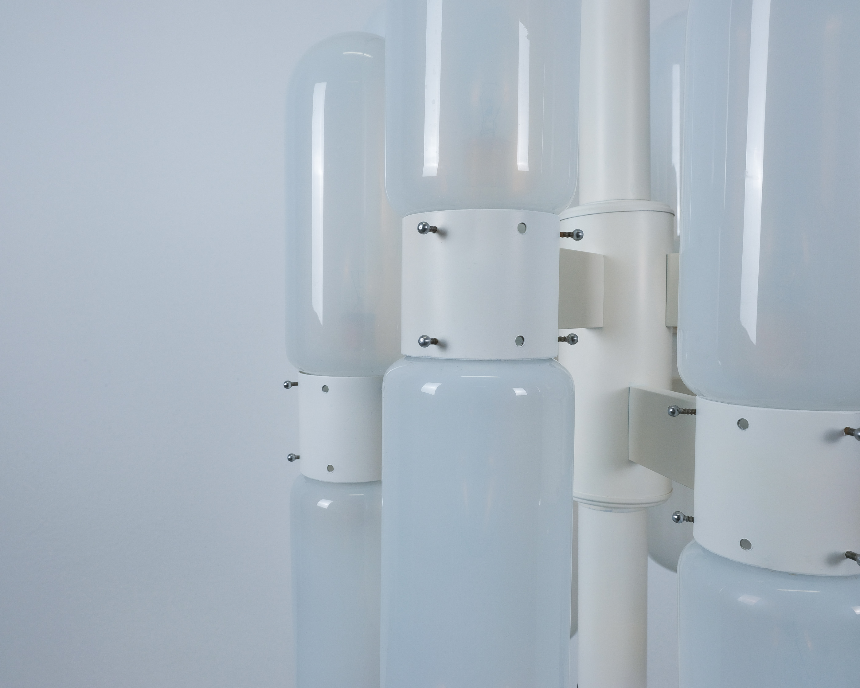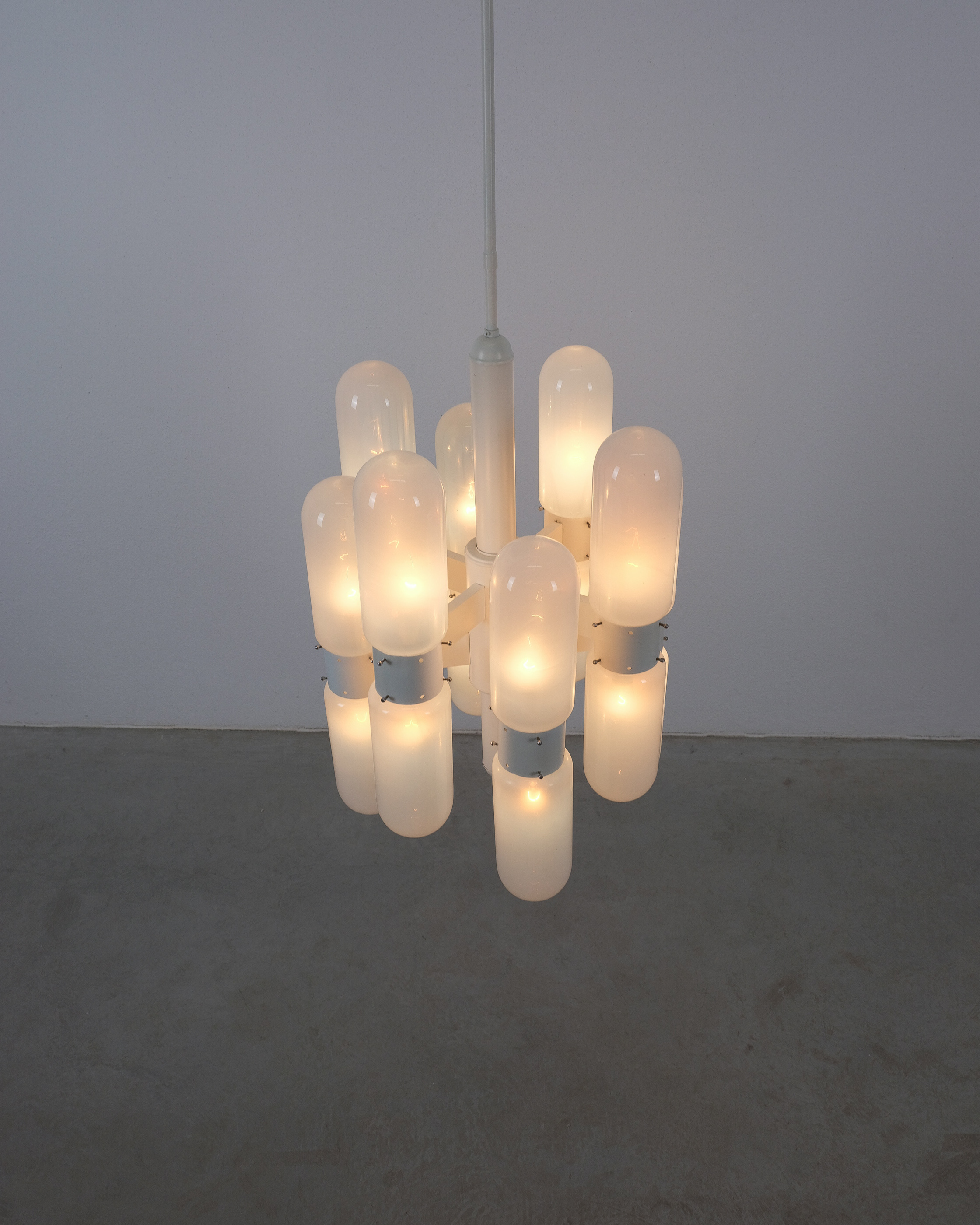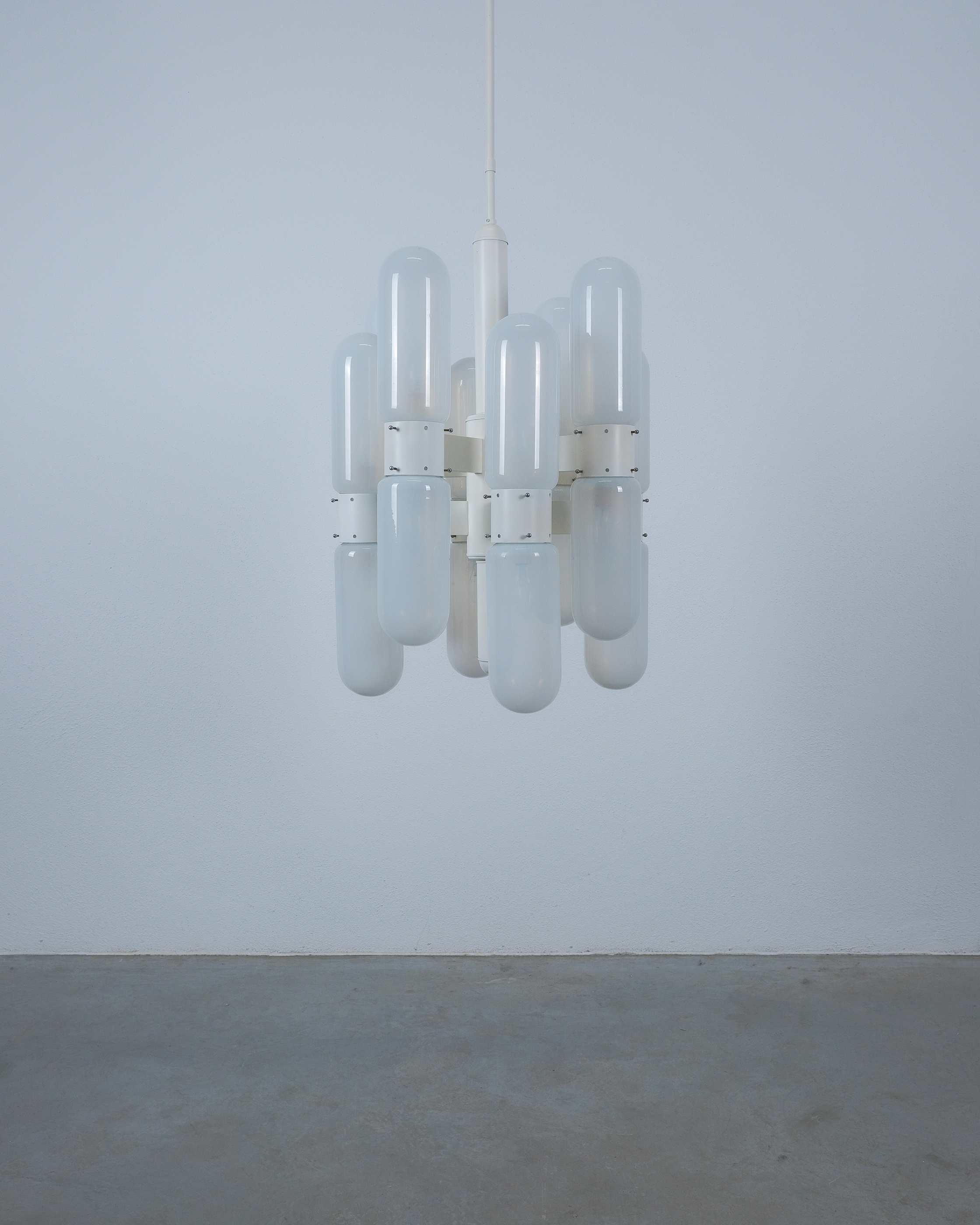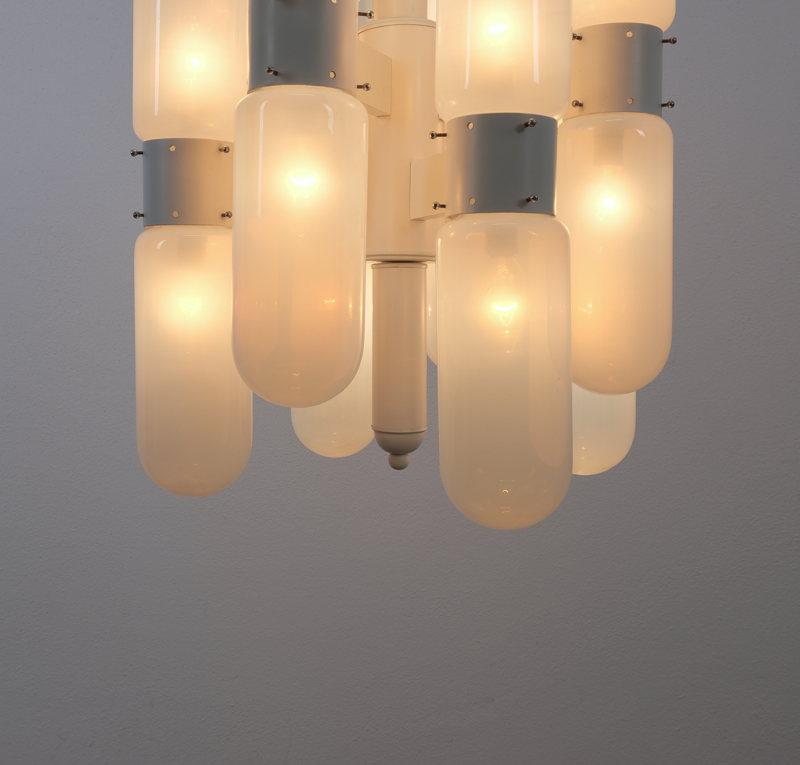Very scarce Carlo Nason light with almost 20 inches in diameter in refurbished condition. The original creme-white paint we have renewed. This light features 16 'torpedo' glass tubes in iridescent glass. Each tube covers a small e14 bulb socket with 40W per socket. Led's are recommended. Dimensions are 19.5" (diameter) x 22.74" (height) shade only. Overall drop as pictured is 43.3". The original canopy is present.