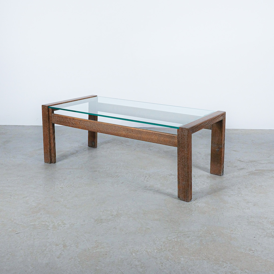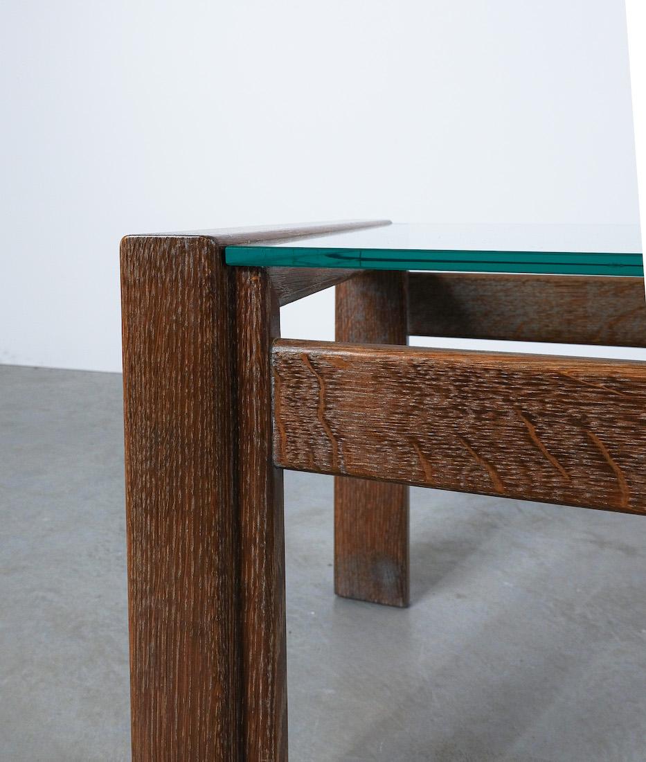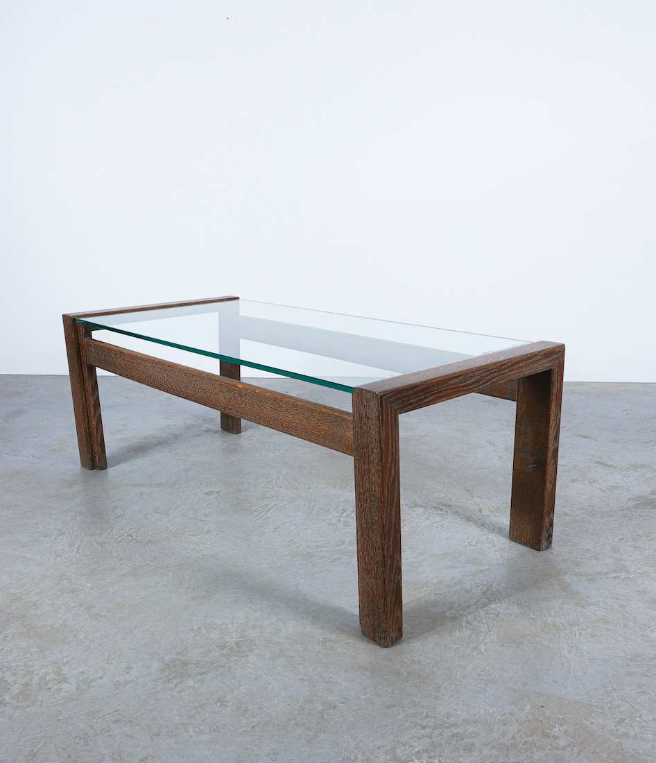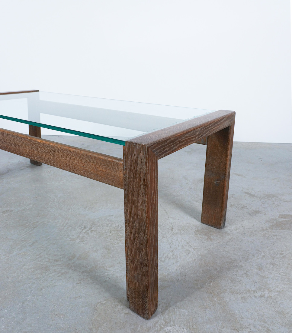 Elegant coffee table with solid, cerused oak wood and a floating thick glass top.
