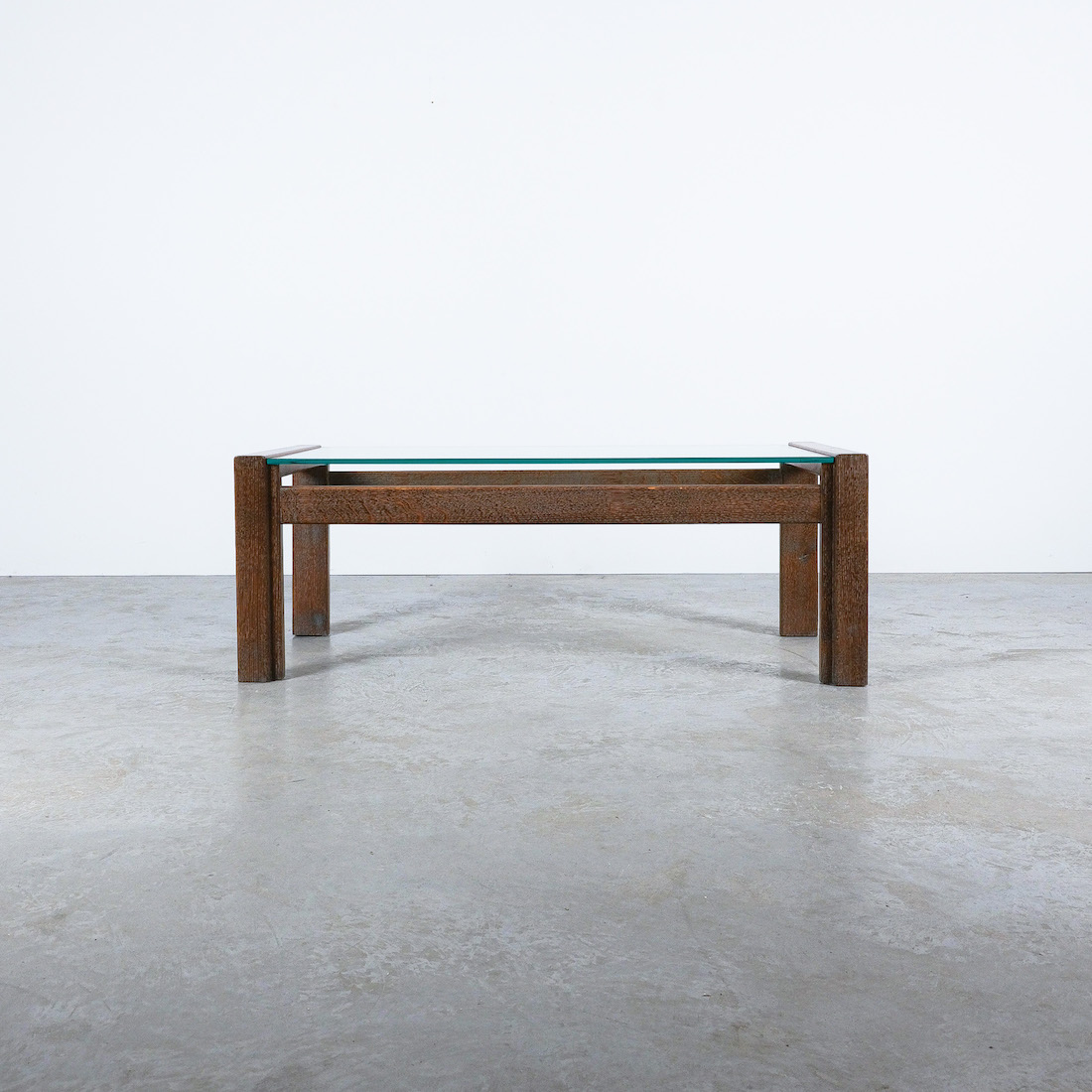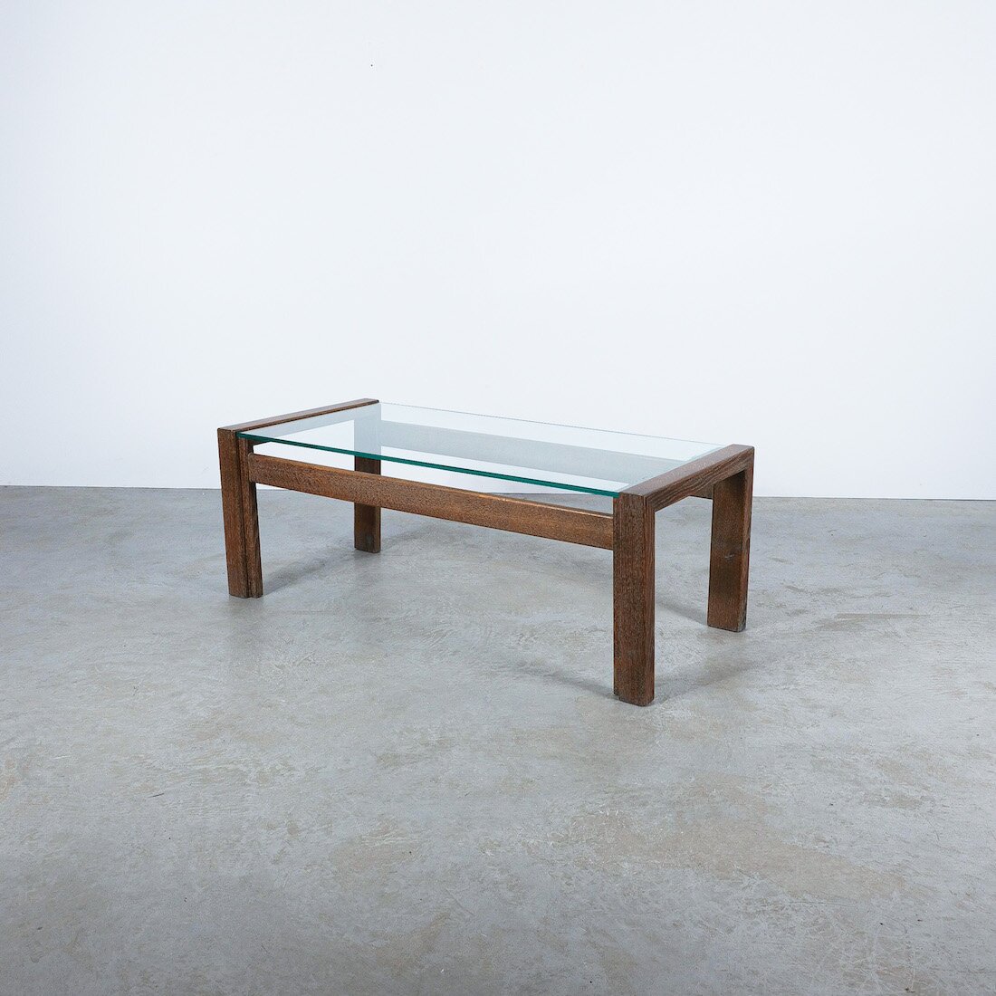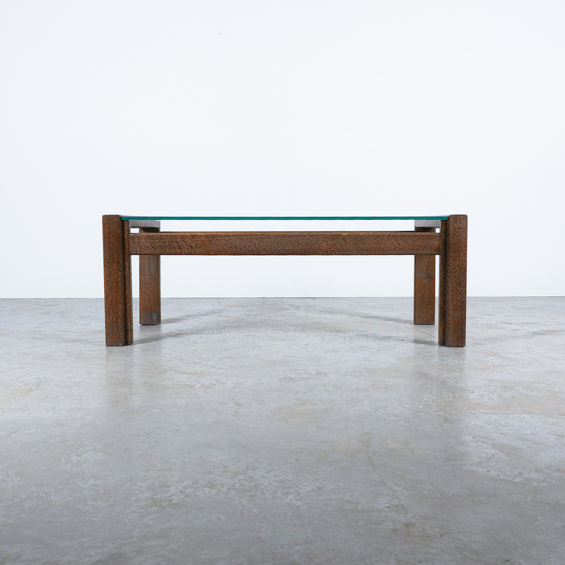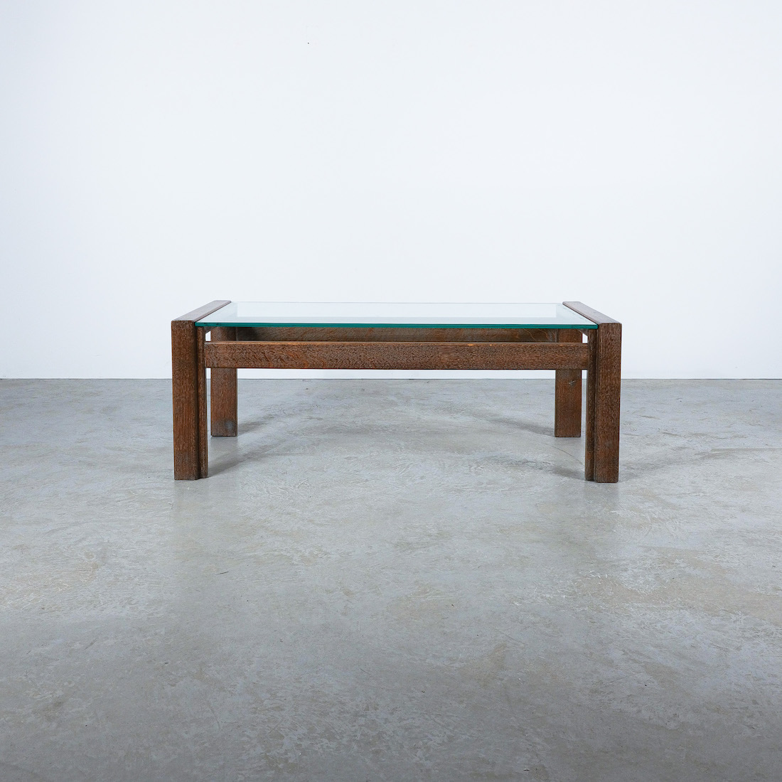 Elegant coffee table with solid, cerused oak wood and a floating thick glass top.