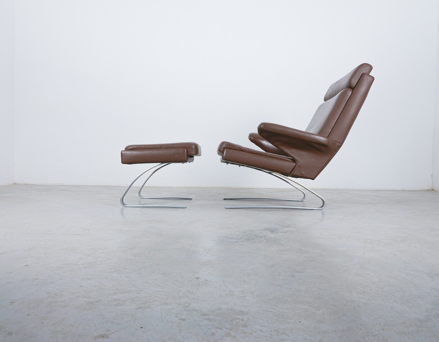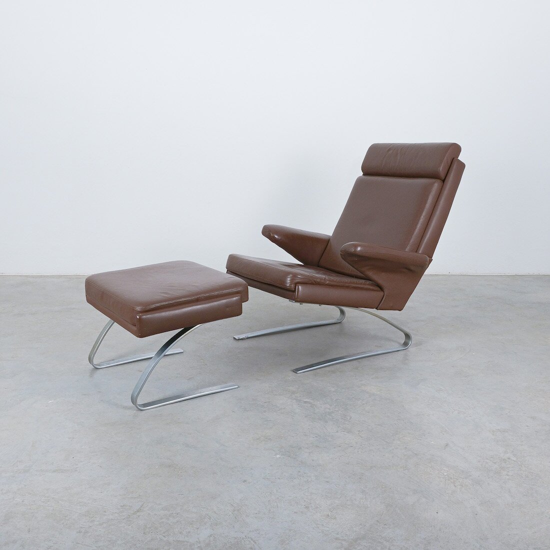 Original and rare Sinus chair + ottoman with its original smooth and unharmed aniline leather.