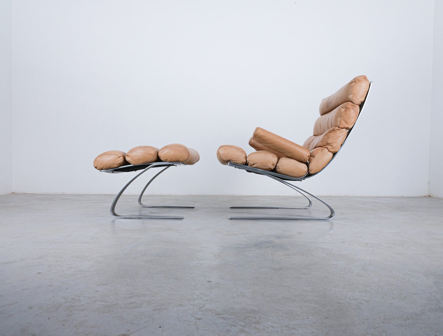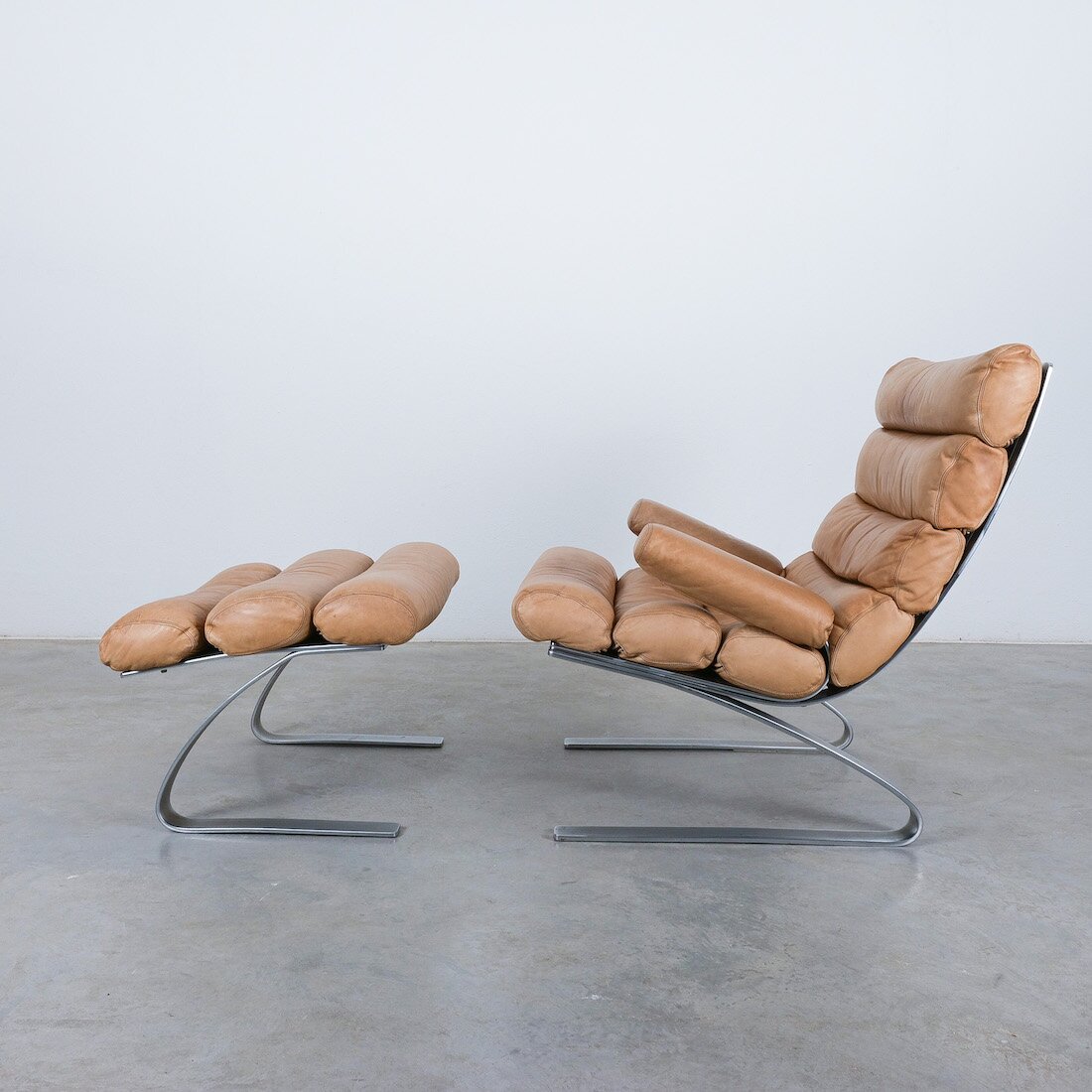 Original Swing chair + ottoman with its original smooth and unharmed aniline leather. The original leather from this chair is still in great condition and was executed in a very deep chocolate brown. There are no defects to the leather which we have treated with conditioner to make it even smoother. Also the cushioning and steel base are in top condition. Great chair and very hard to find in this condition. Dimensions (chair only) are H.36.6" x W.30.3 x D.35.5". Seat height is 17.3".