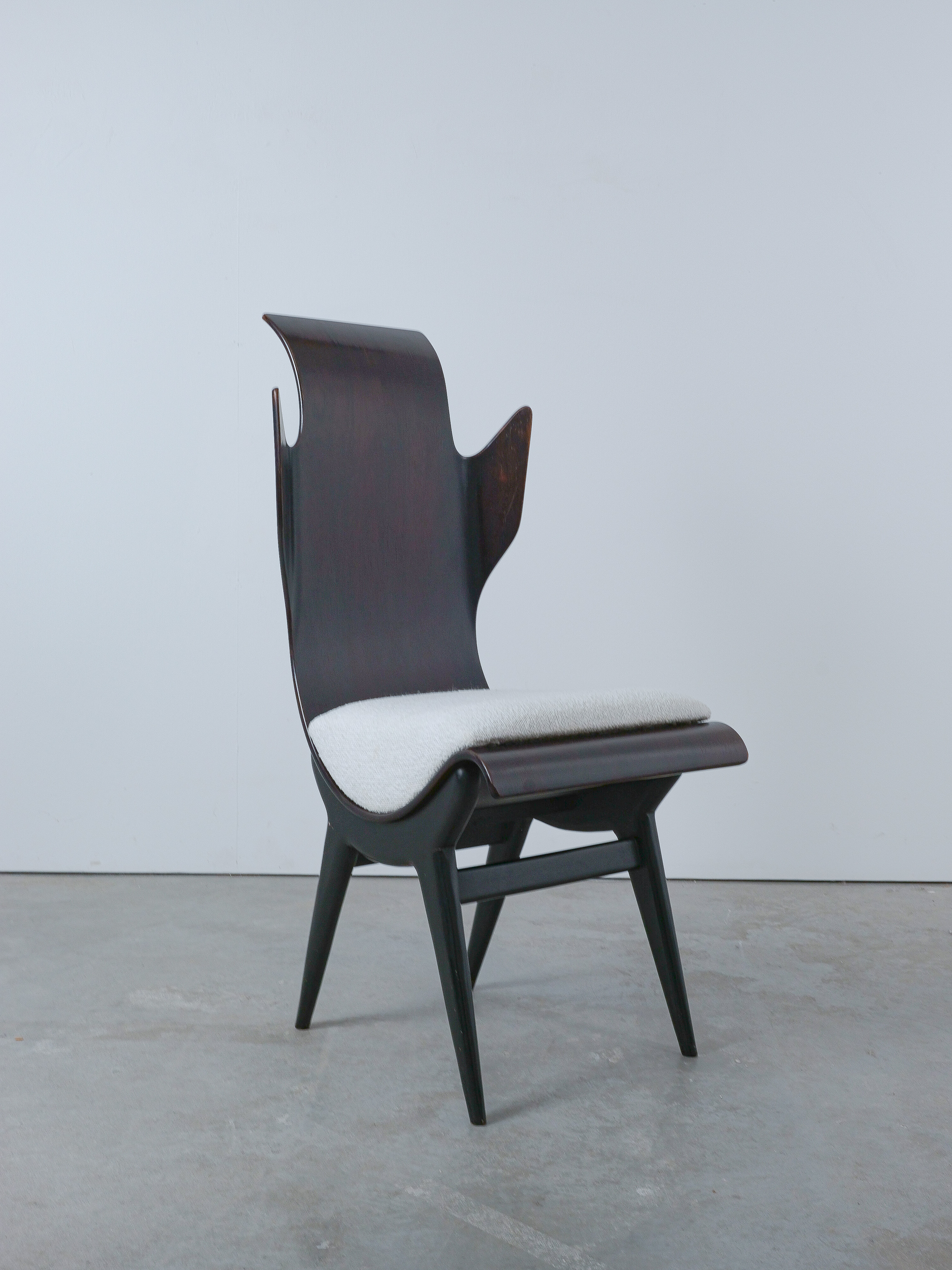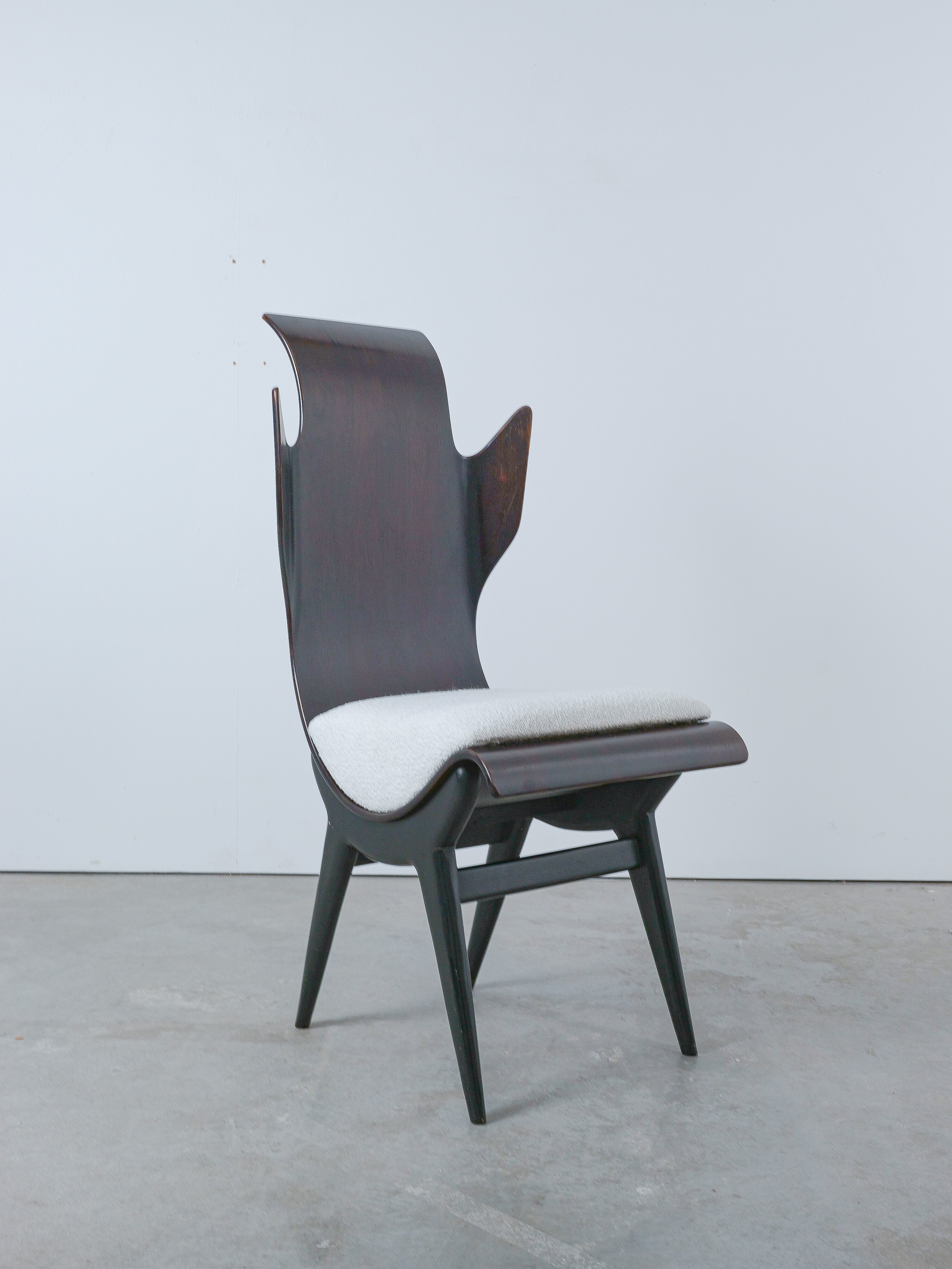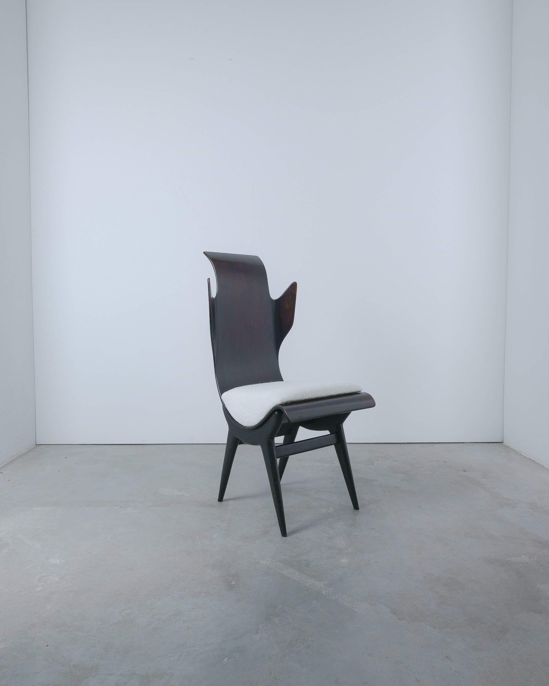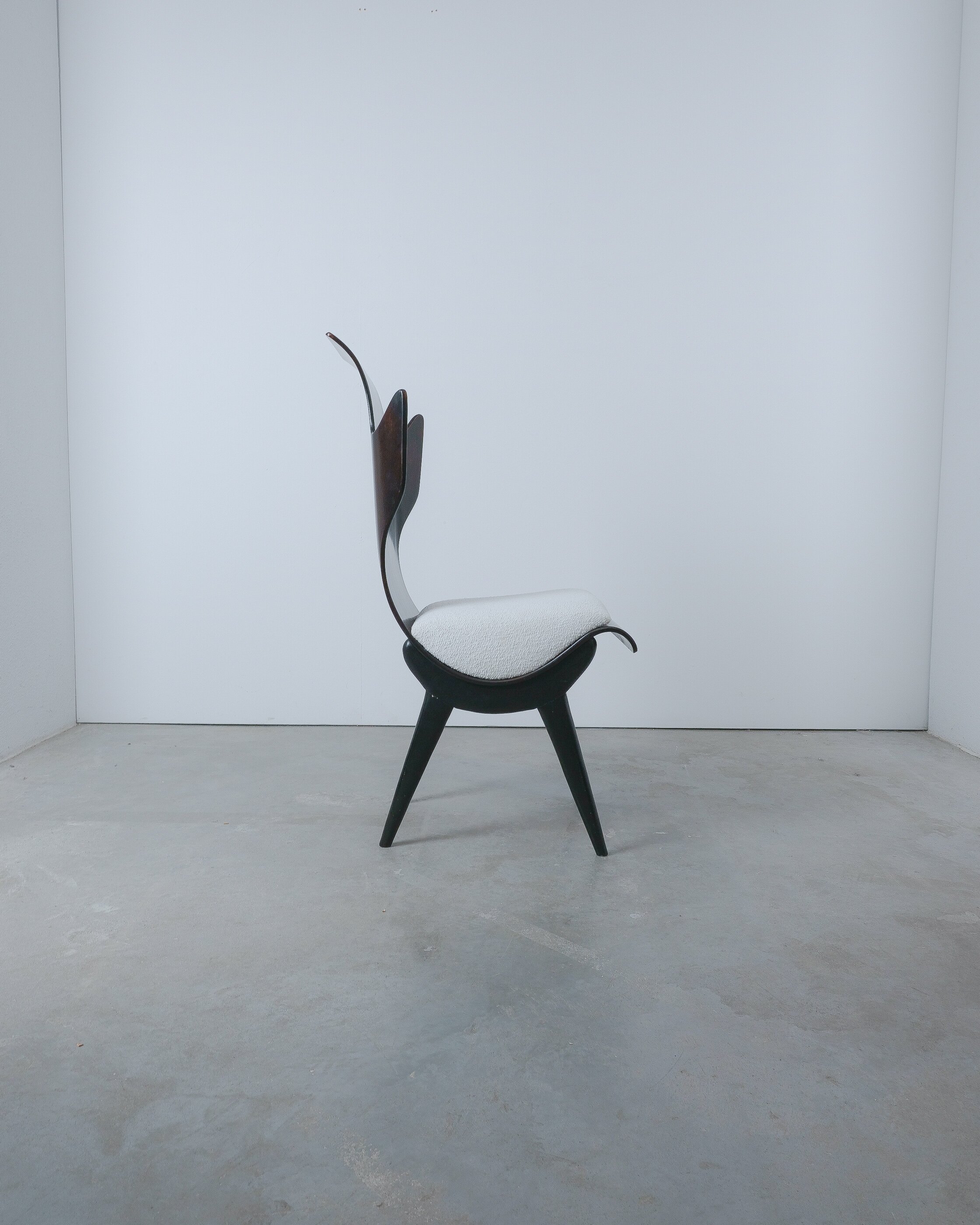 Midcentury Italian Flame chair, newly upholstered, 1960s. Sculptural Pozzi & Verga model ‘2/R’ or ''Flame'' chairs, designed by Dante LaTorre. The chair is made of bent, laminated rosewood on a black ash frame. They have fixed cushions with a new French white Bouclé wool upholstery. The rosewood has a unique shape and has a bleached finish. A very rare and beautiful occasion. The chair is in good vintage condition, the plywood veneer bent seat has been cleaned and newly oiled, the new upholstery is from French Bouclé. Only some minor surface wear here and there commensurate with age.