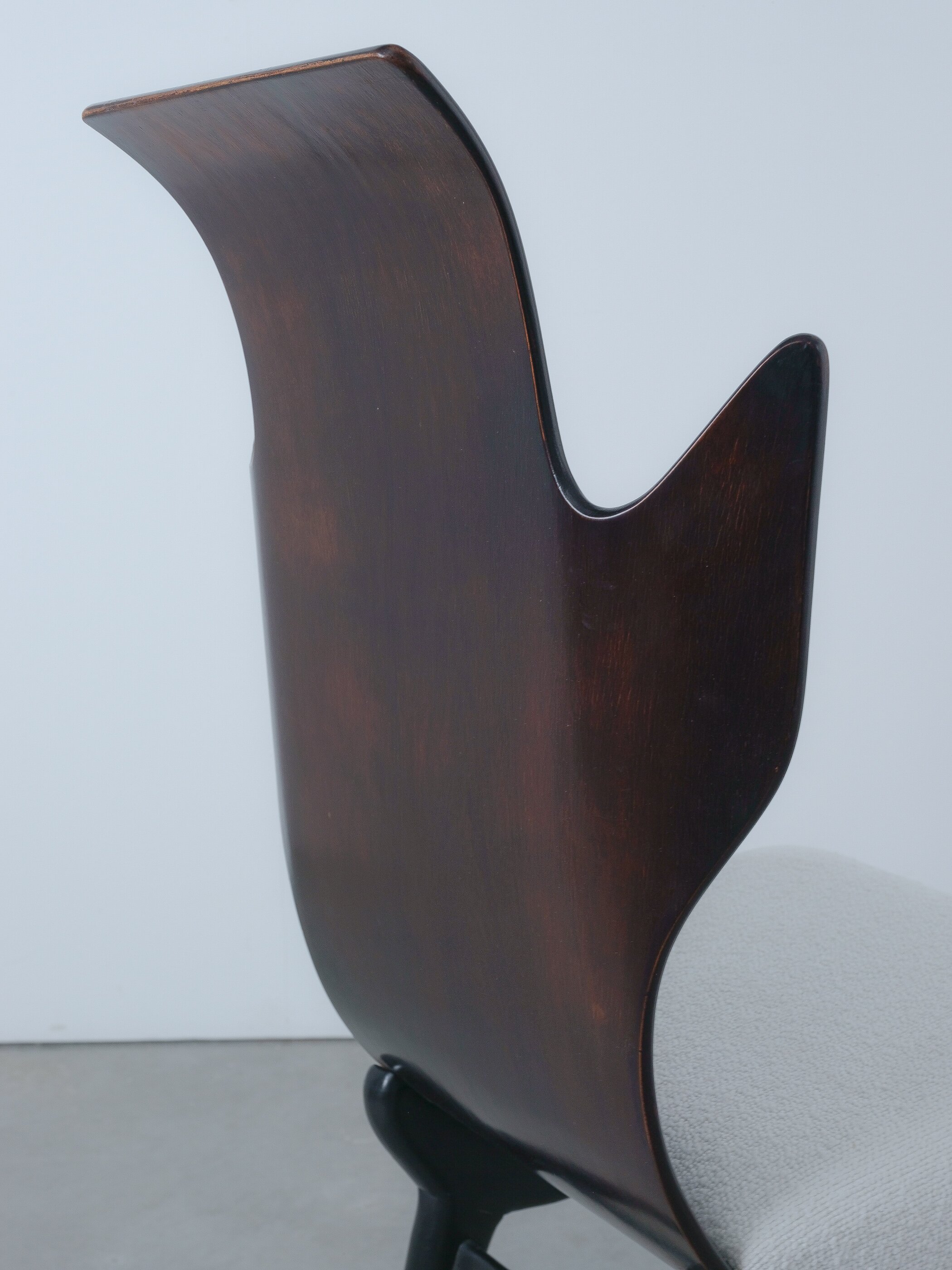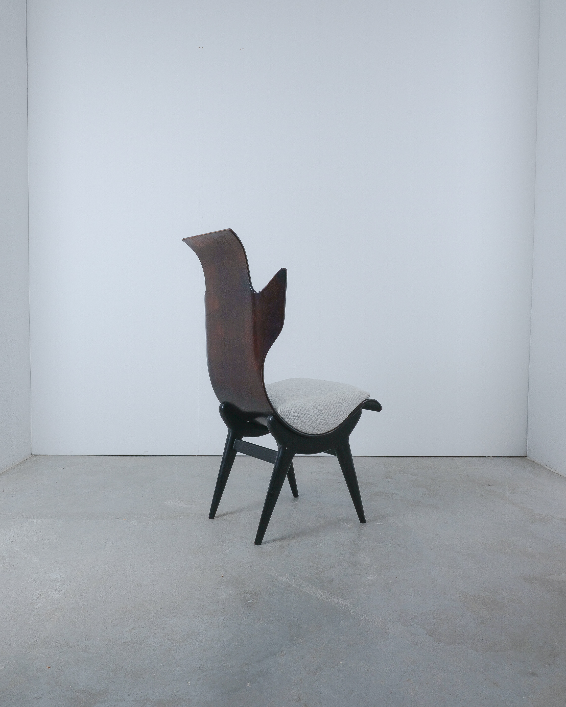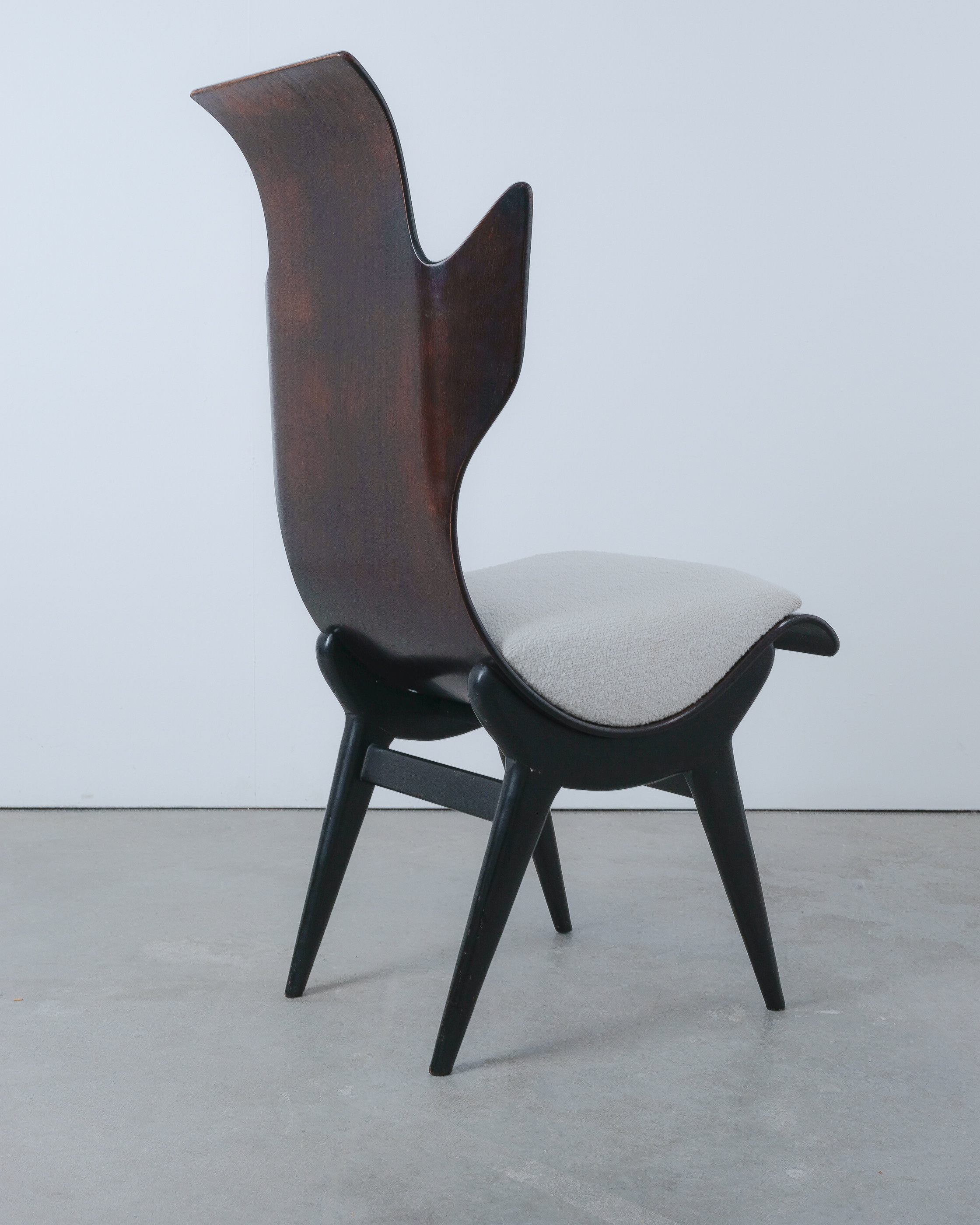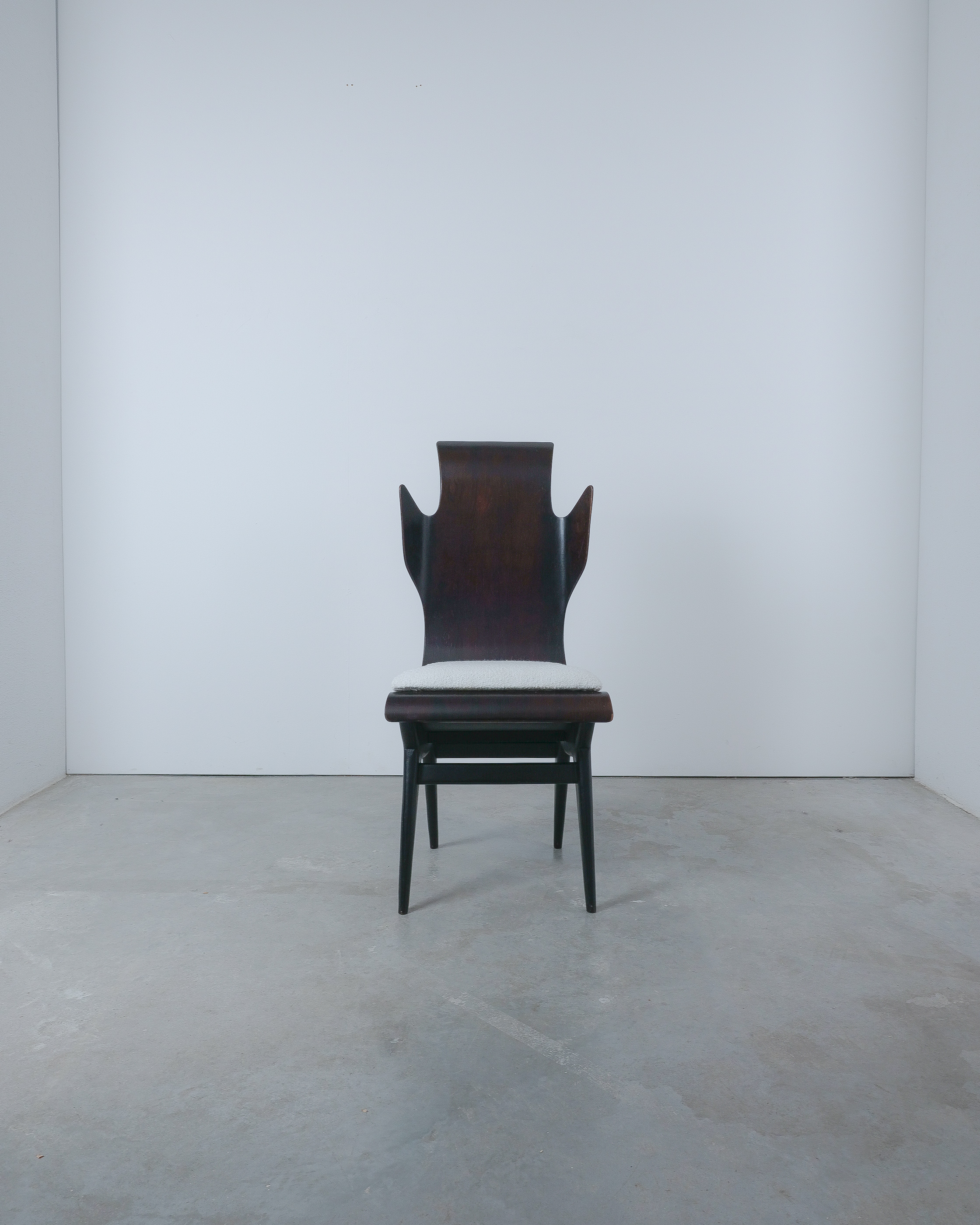 Midcentury Italian Flame chair, newly upholstered, 1960s. Sculptural Pozzi & Verga model ‘2/R’ or ''Flame'' chairs, designed by Dante LaTorre. The chair is made of bent, laminated rosewood on a black ash frame. They have fixed cushions with a new French white Bouclé wool upholstery. The rosewood has a unique shape and has a bleached finish. A very rare and beautiful occasion. The chair is in good vintage condition, the plywood veneer bent seat has been cleaned and newly oiled, the new upholstery is from French Bouclé. Only some minor surface wear here and there commensurate with age.