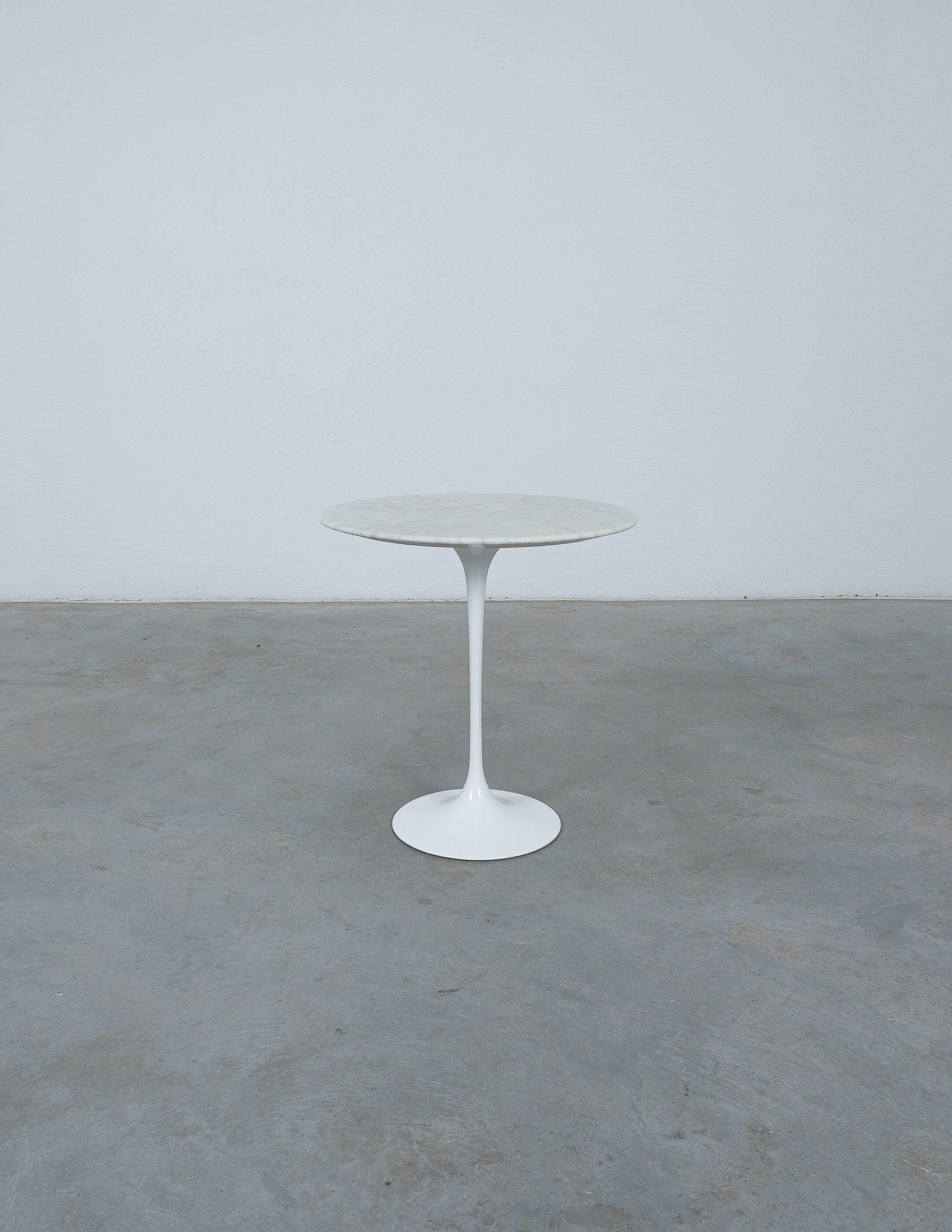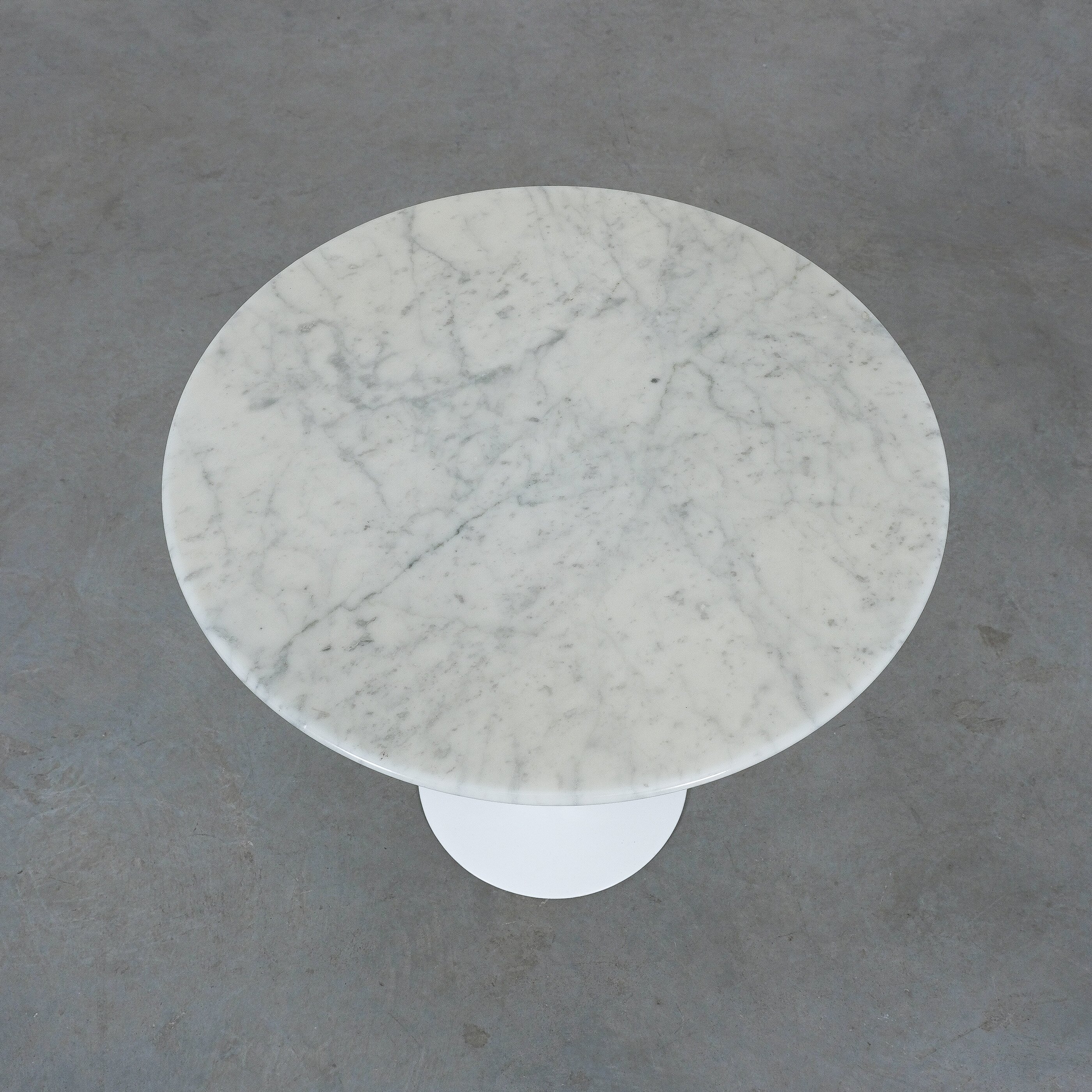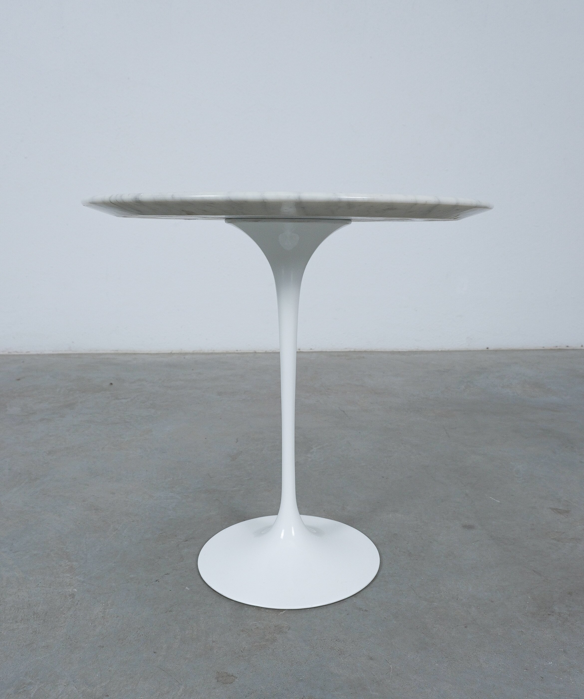 Elegant side table designed by the architect Eero Saarinen in very good original vintage condition featuring a smooth white marble top and a very slender base.