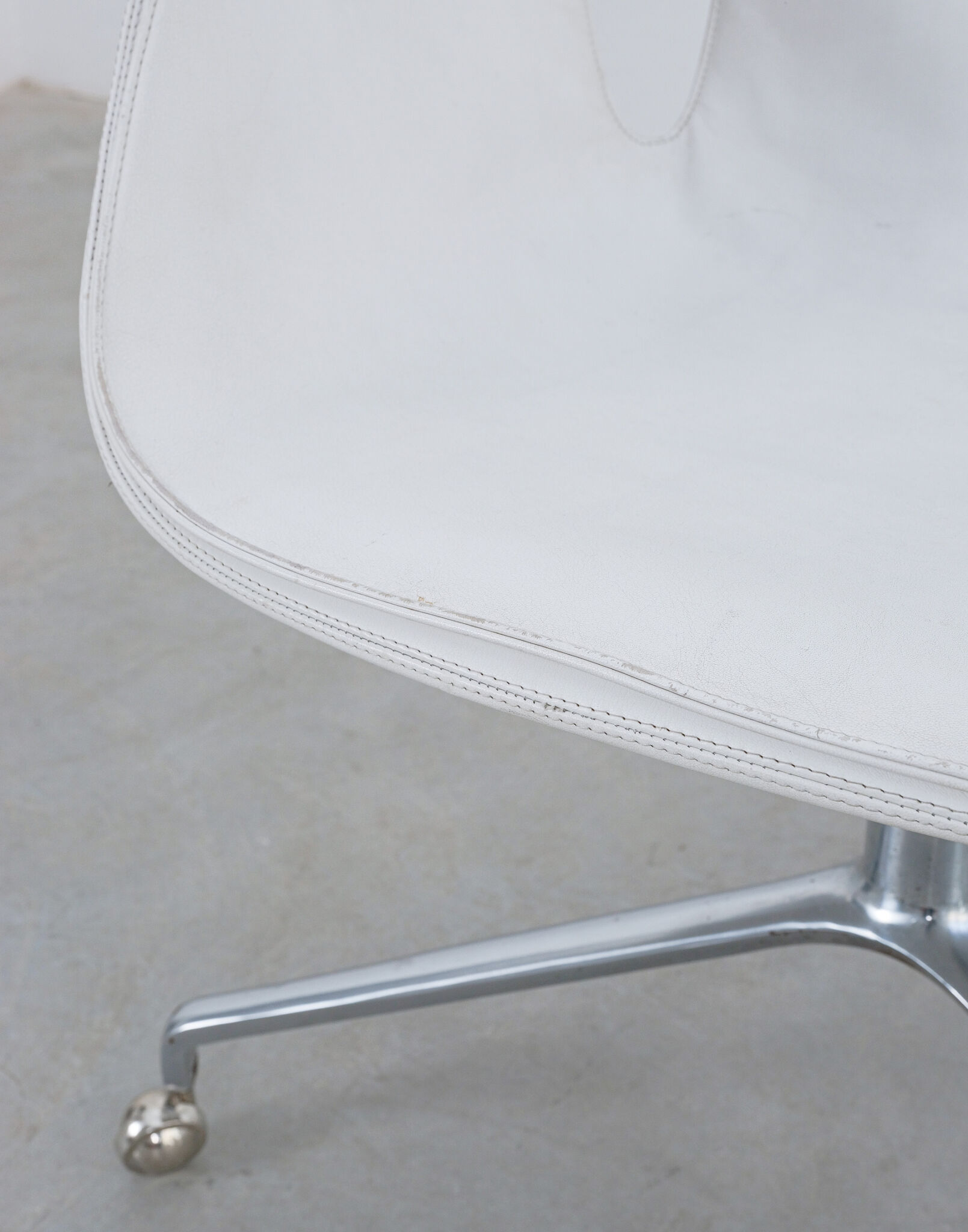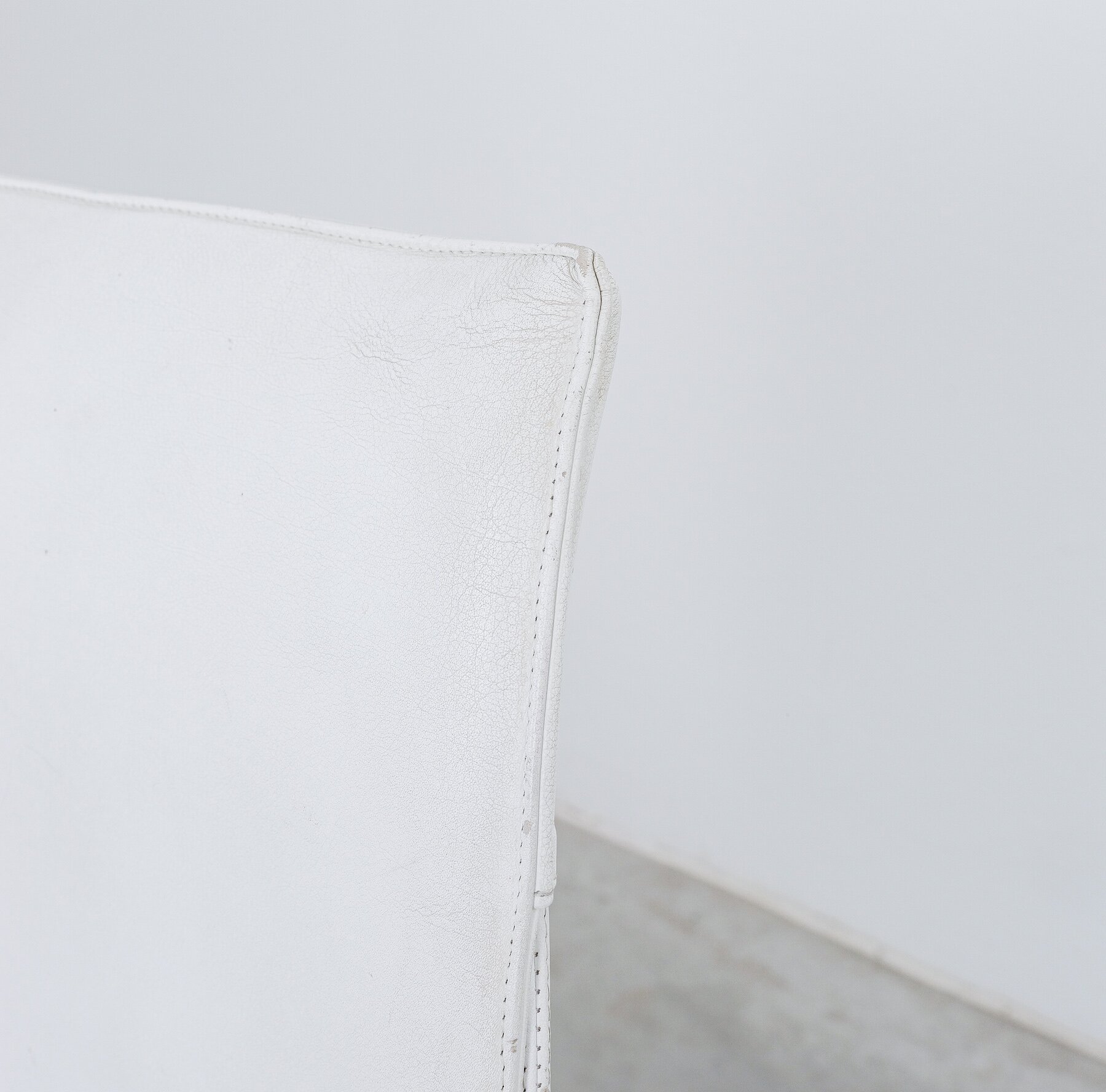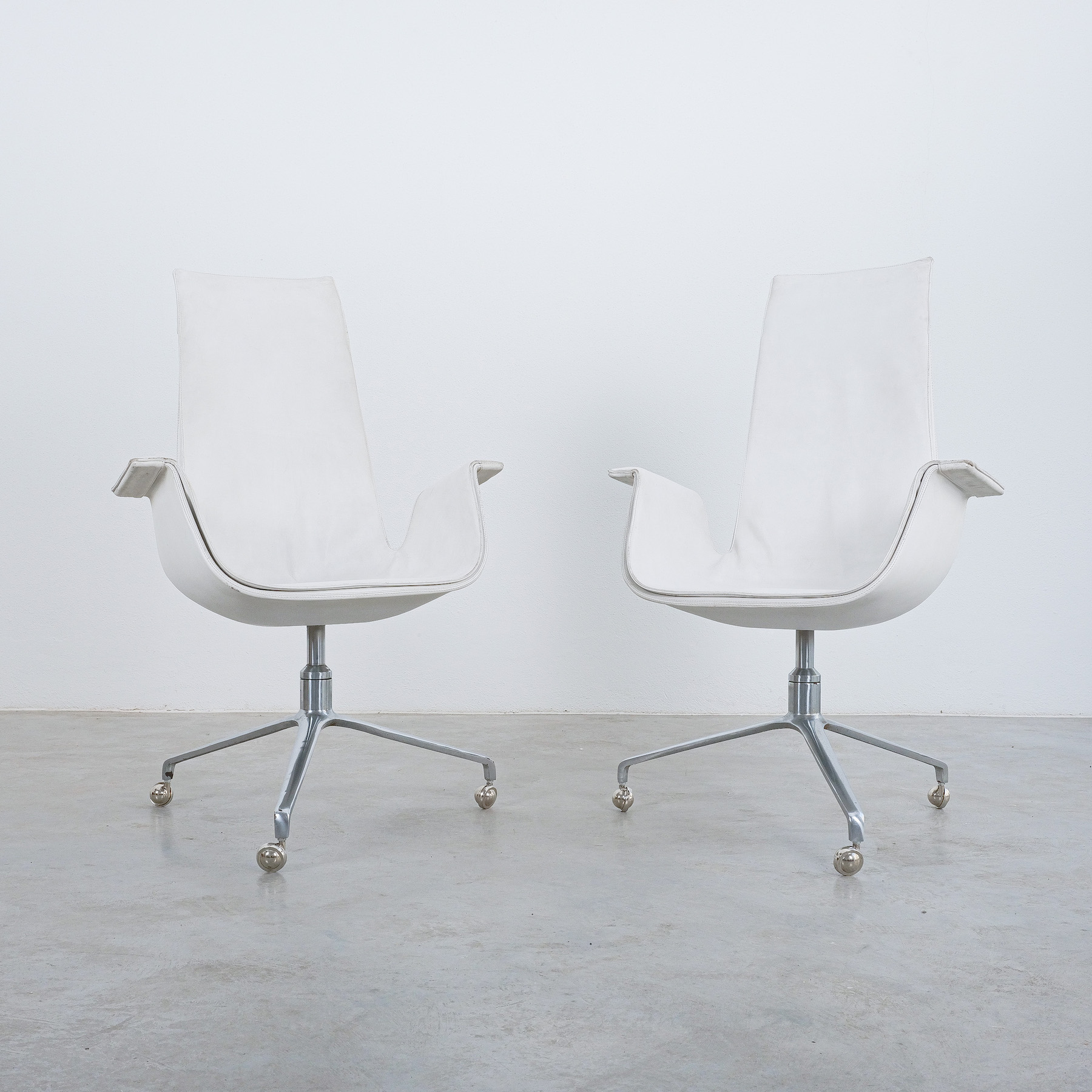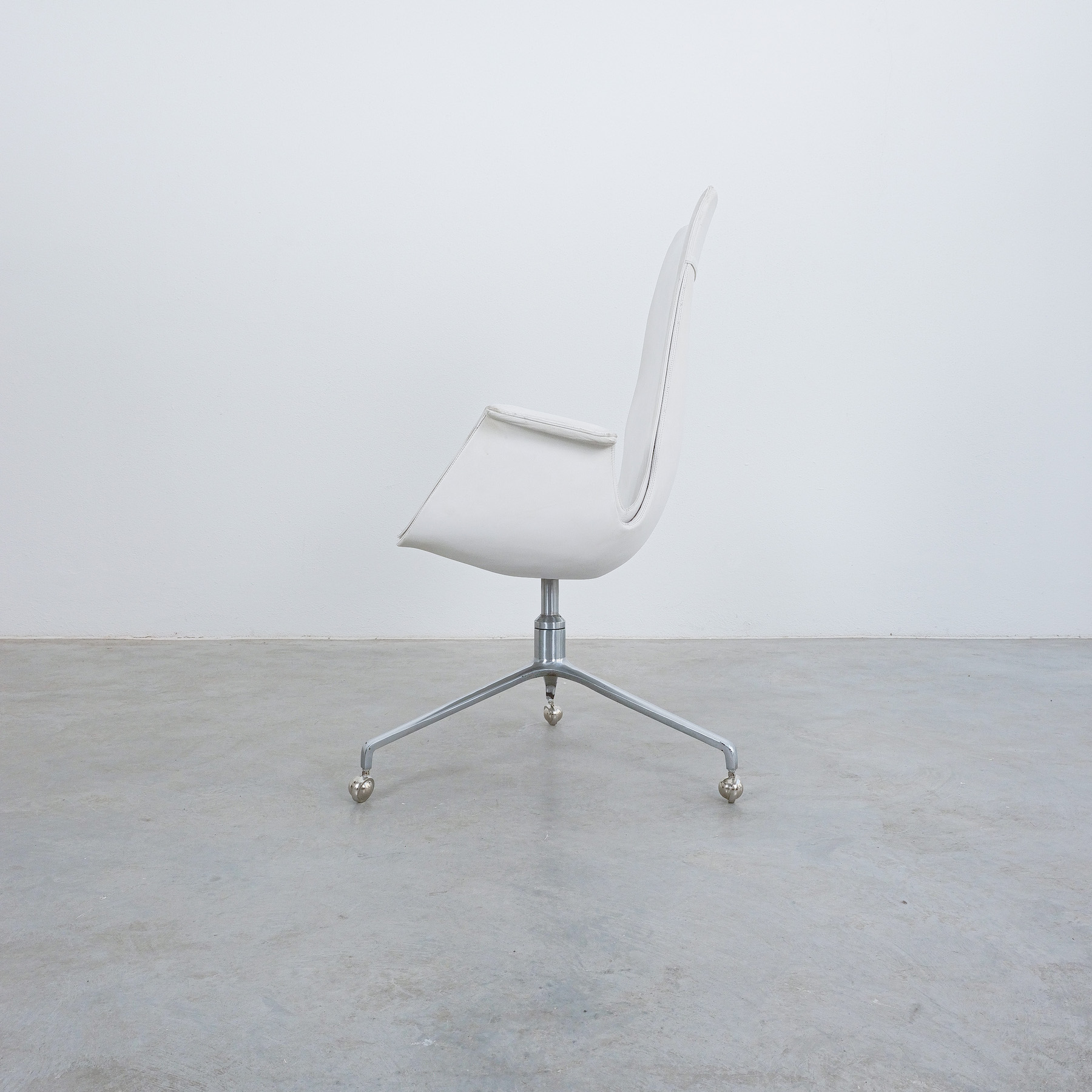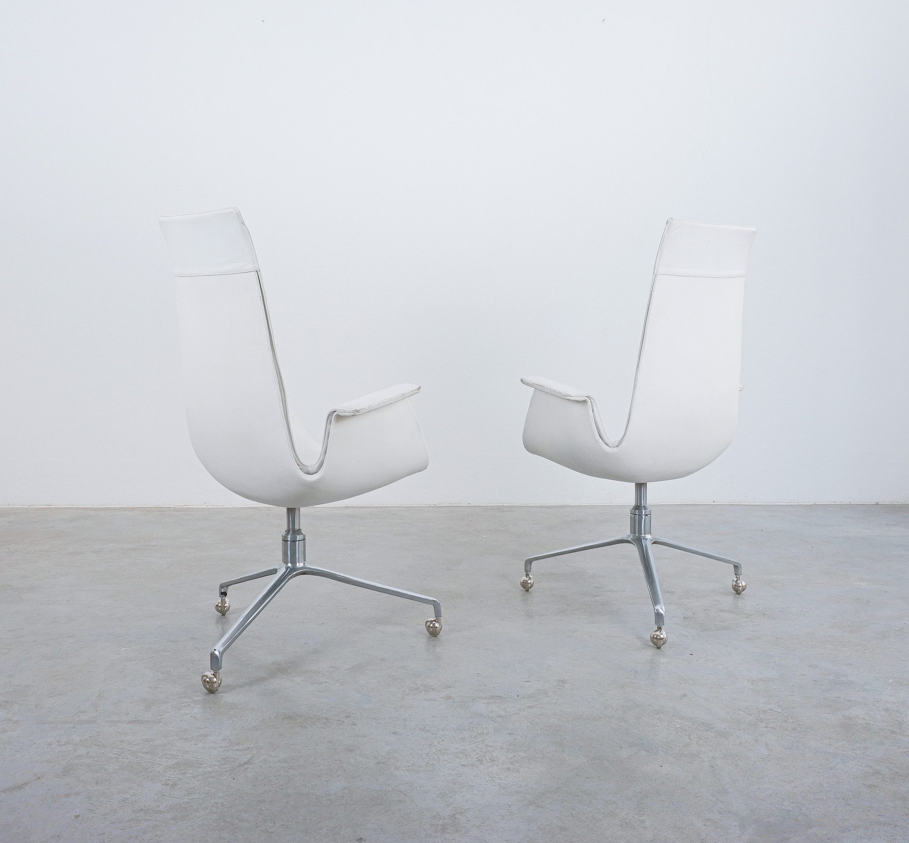 Beautiful set of swiveling high back desk chairs on casters and a tripod base of polished cast stainless steel. Early Kil (Germany) model from white dyed leather in good condition. The leather is in original condition with minor signs of wear, no holes, little scratching and rub-off. We have treated the leather 2 times with a special leather conditioner to preserve the color and smoothness for years to come. With a seat height of 19" it's the higher executive version and can be perfectly used for a desk. The oblique lines of the design especially in the front seat section, do not only shape a beautiful and iconic chair but also serve the functional aspect for a desk chair to fit under a table.