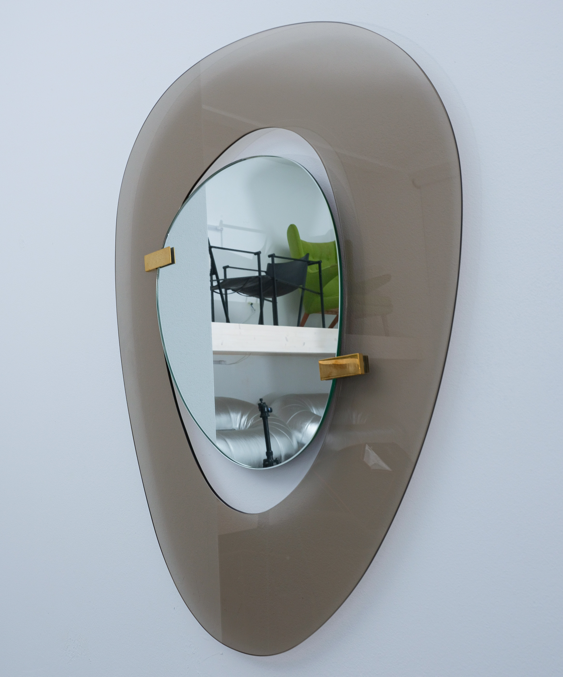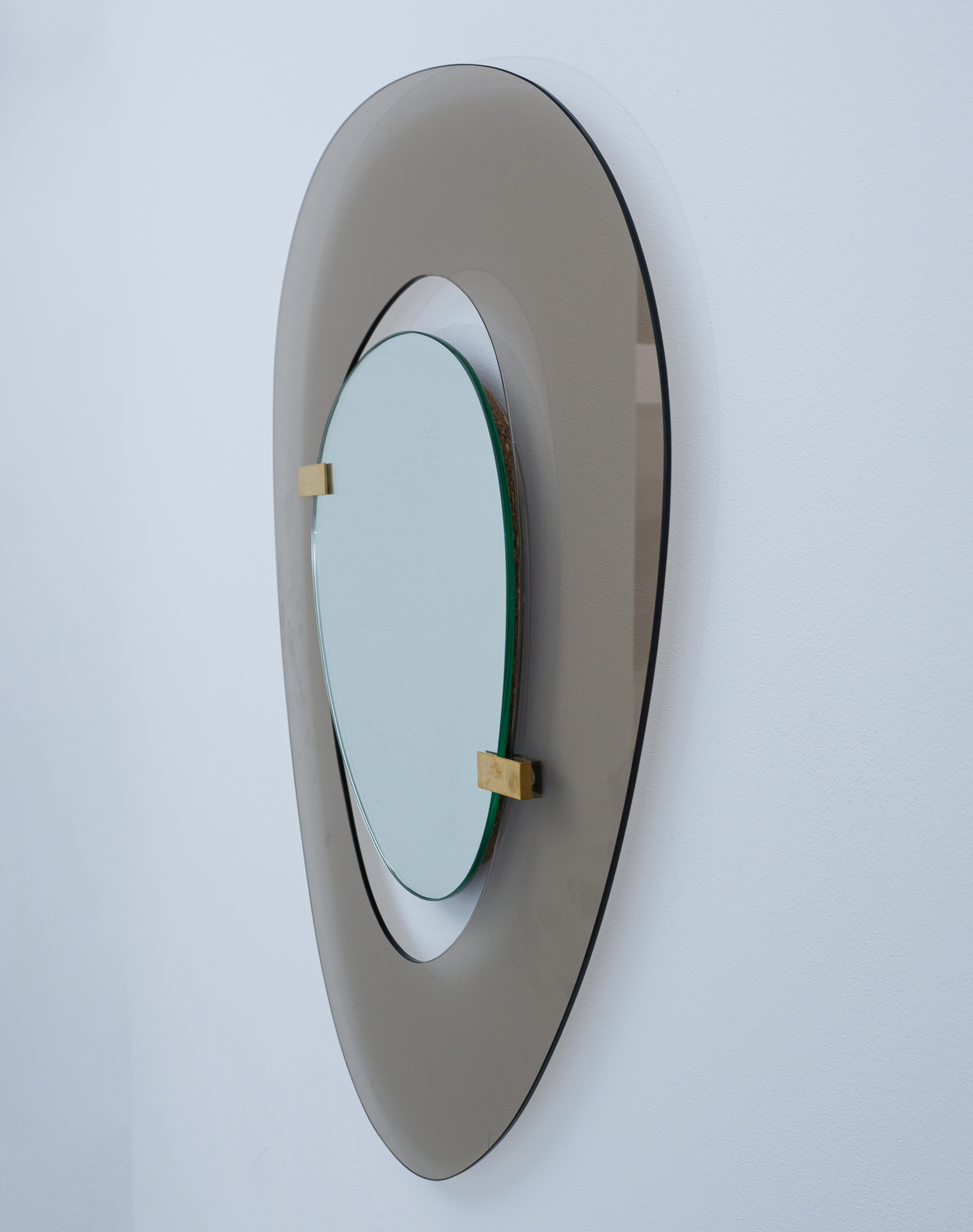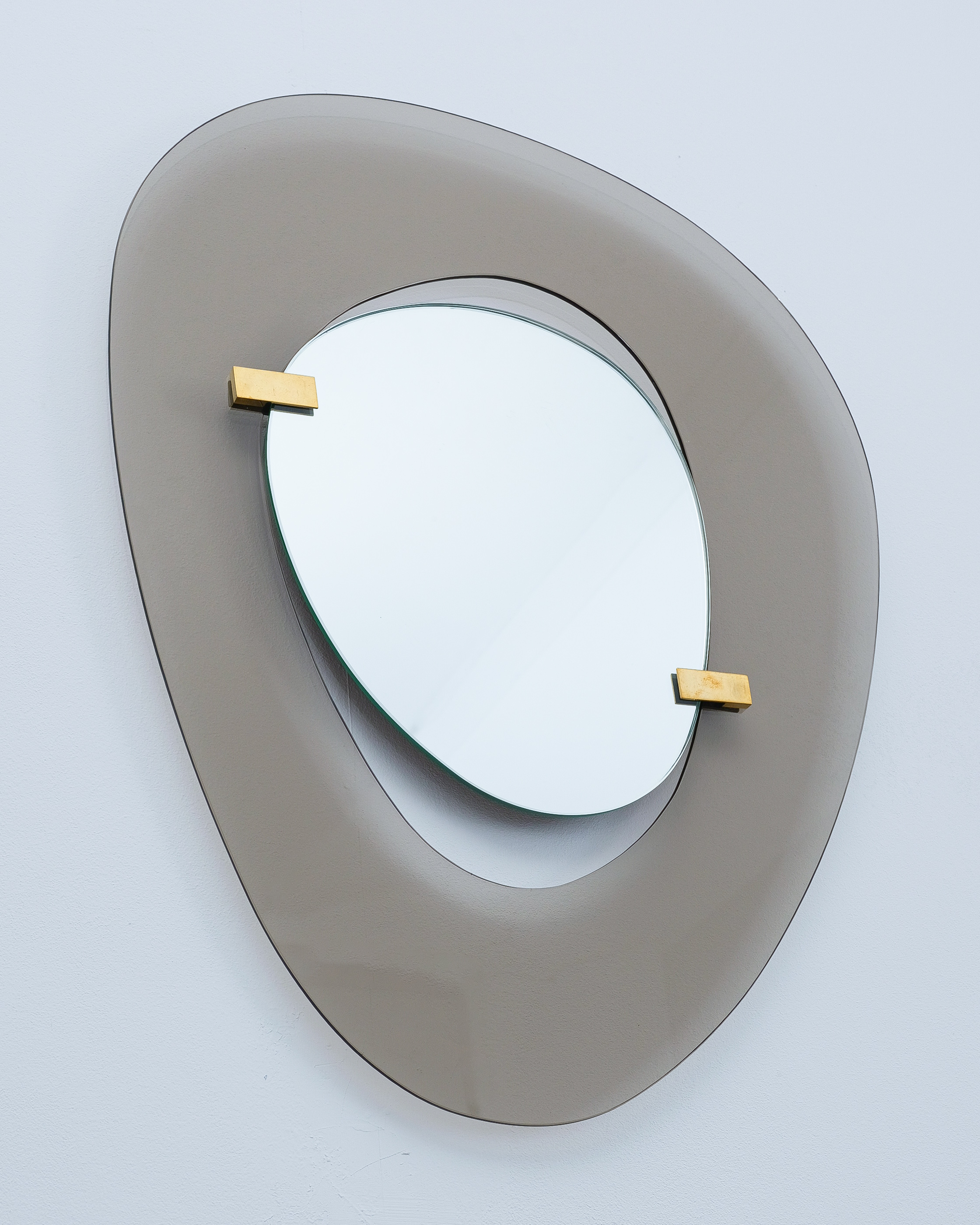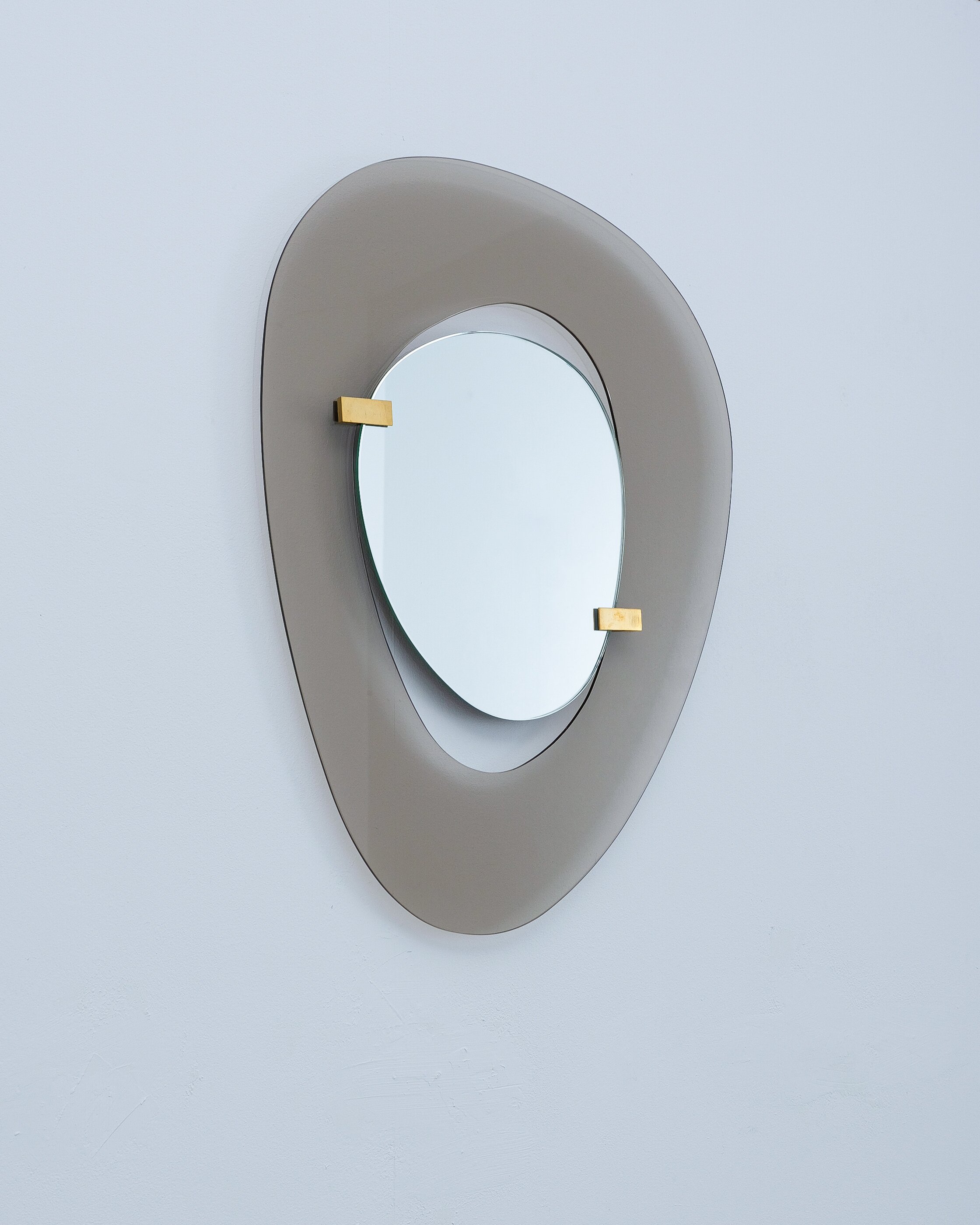 Fontana Arte mirror by Max Ingrand, Italy, circa 1958. Beautiful mirror with an anomic grey-smokey smooth glass frame and anomic floating mirror attached with two brass clasps. Good condition, no chips, some minimal scratches, little to none aging stains or discolorations and losses to the mirror glass present. The brass clamps show an even patina. Overall good to very good condition with regards to the age of 70 years.