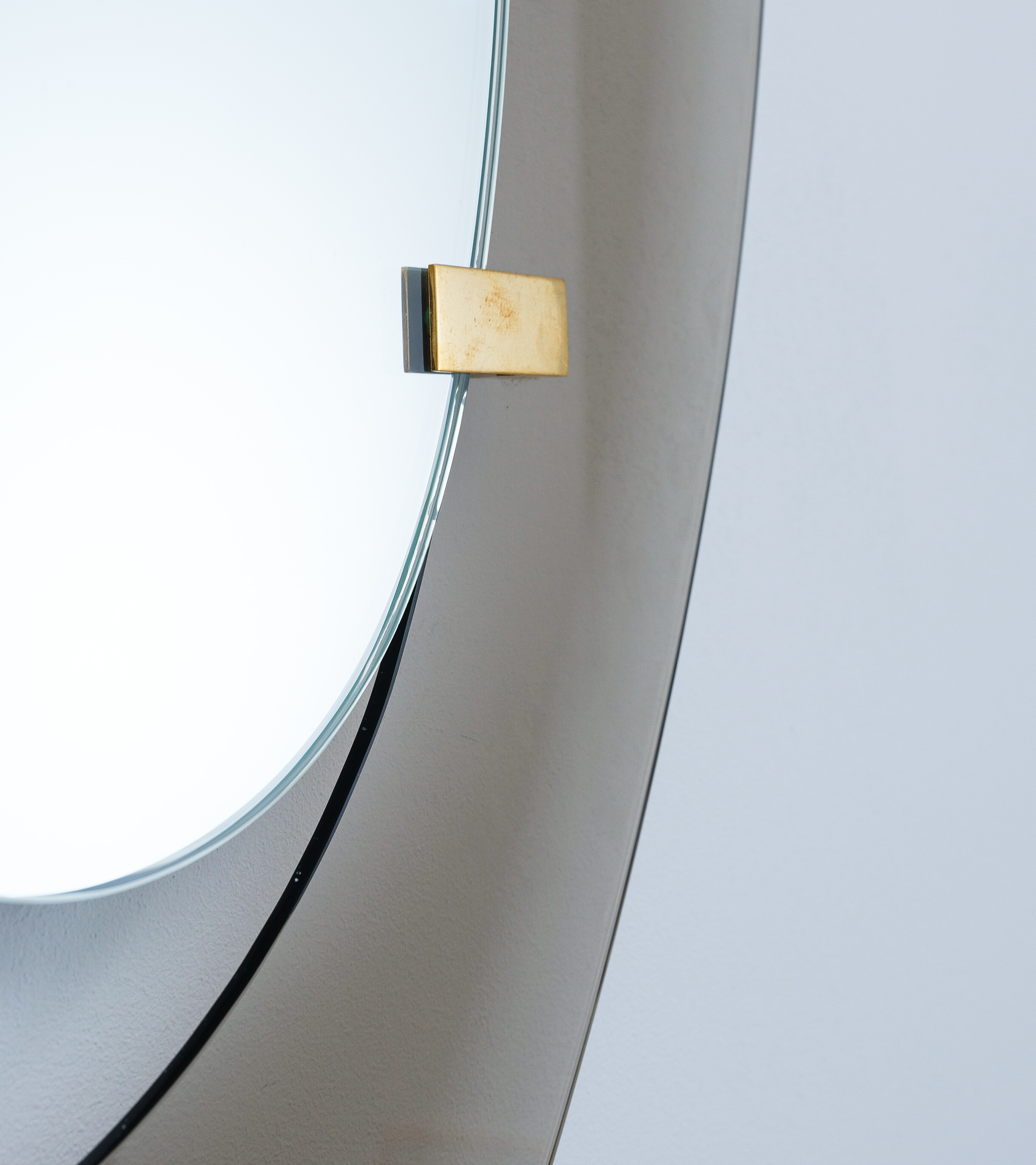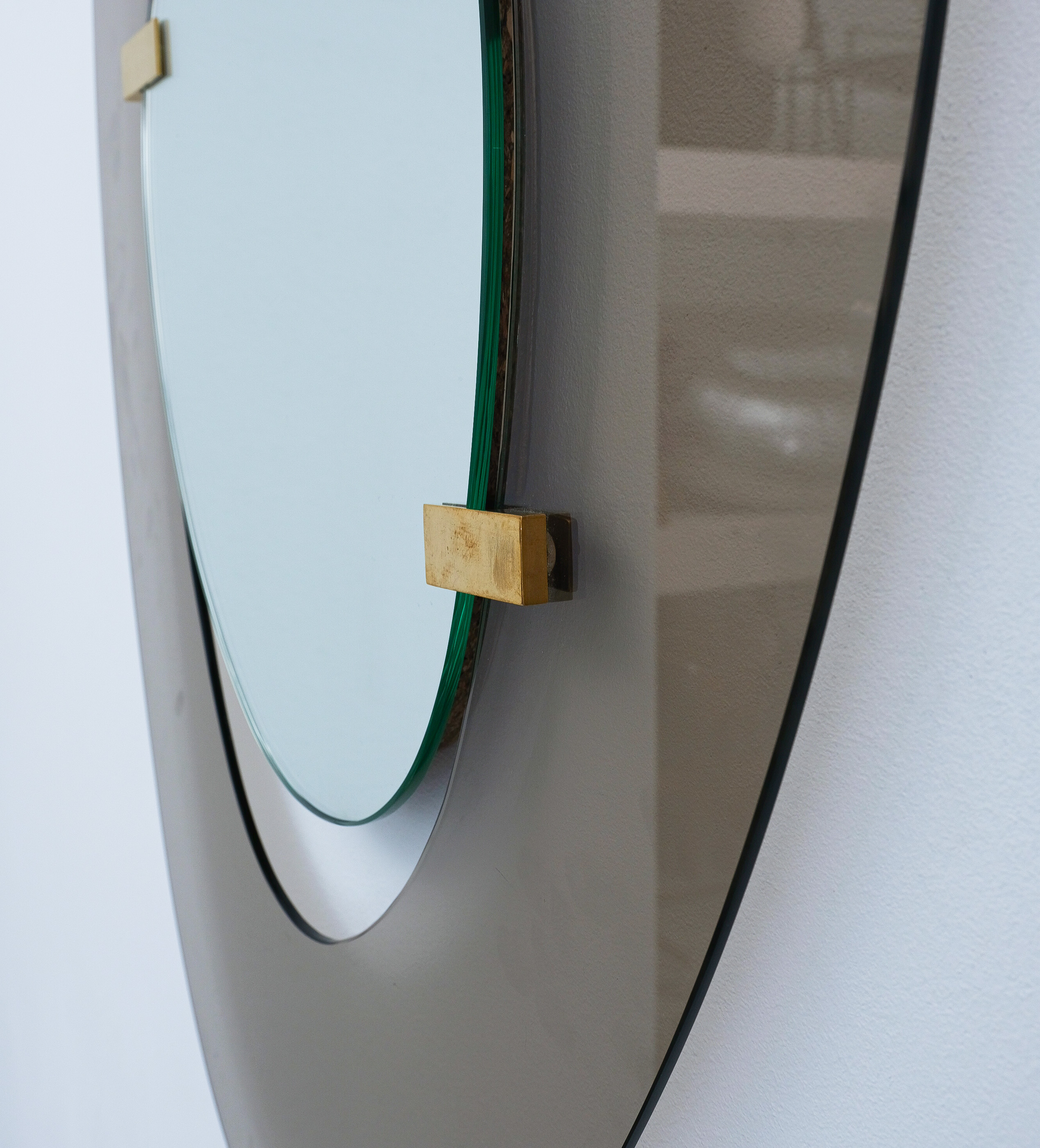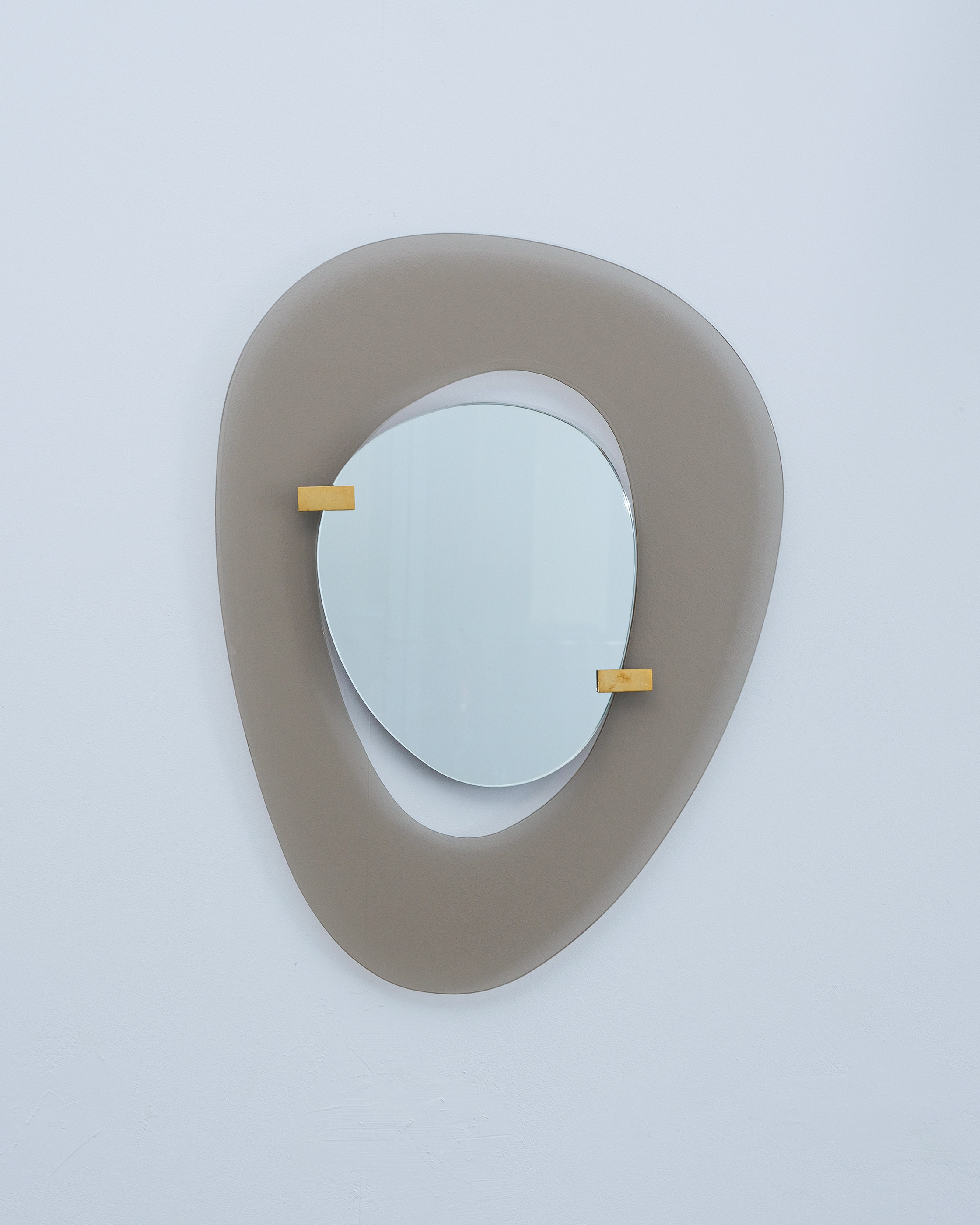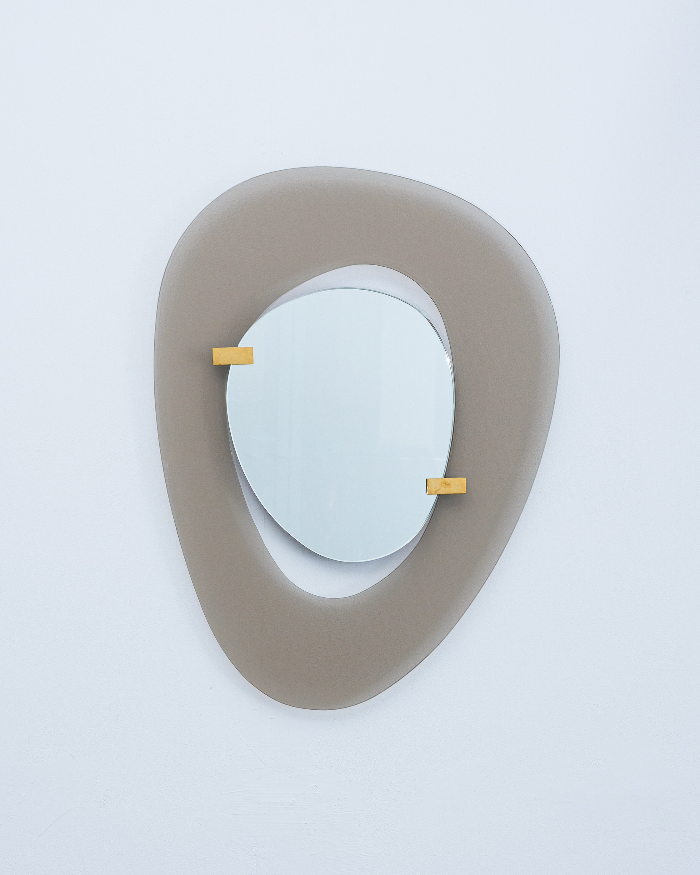 Fontana Arte mirror by Max Ingrand, Italy, circa 1958. Beautiful mirror with an anomic grey-smokey smooth glass frame and anomic floating mirror attached with two brass clasps. Good condition, no chips, some minimal scratches, little to none aging stains or discolorations and losses to the mirror glass present. The brass clamps show an even patina. Overall good to very good condition with regards to the age of 70 years.