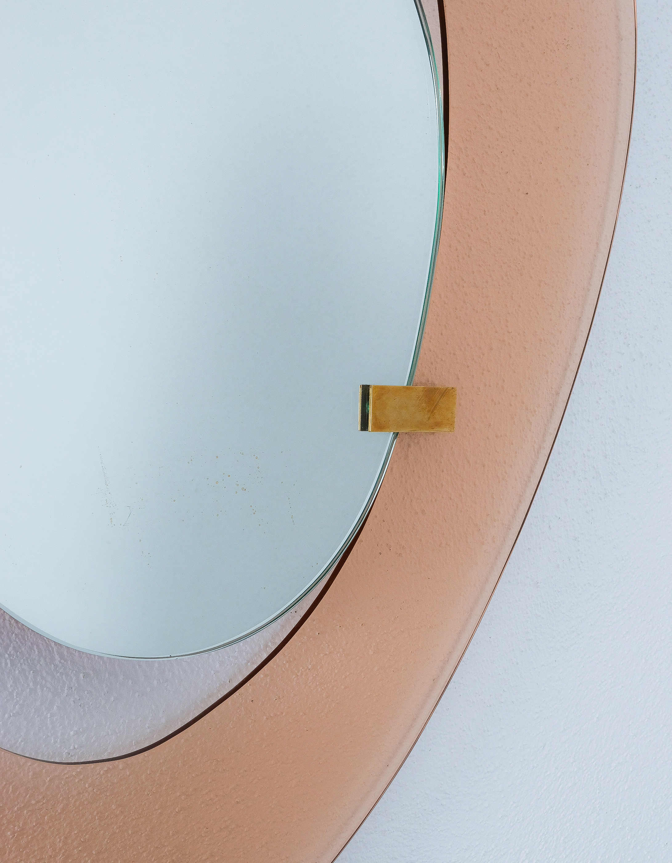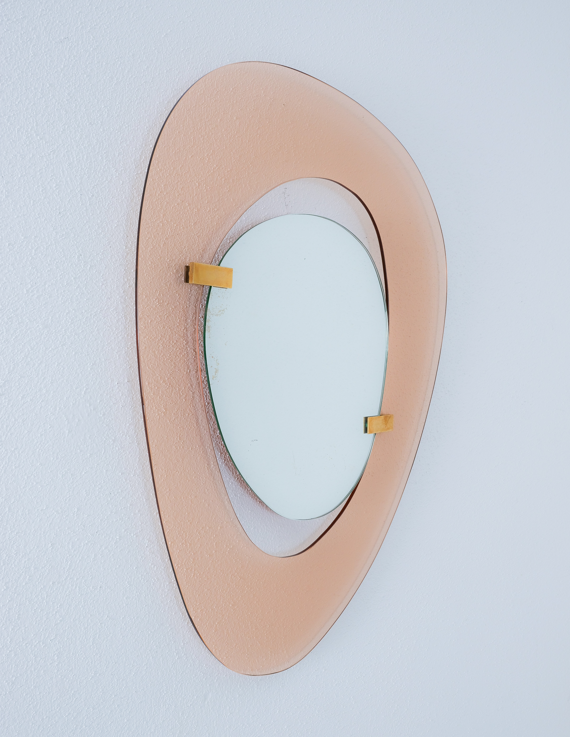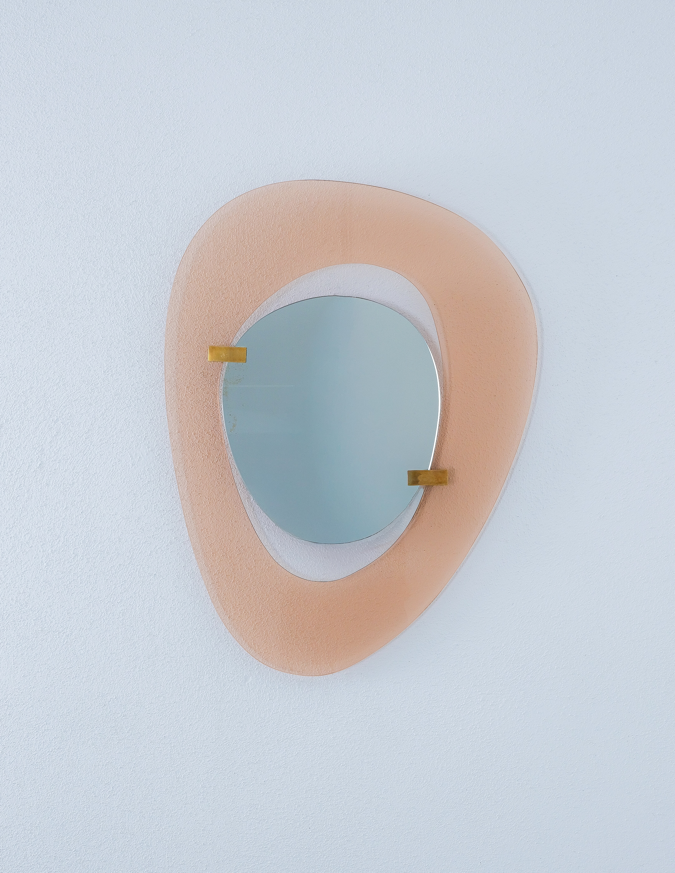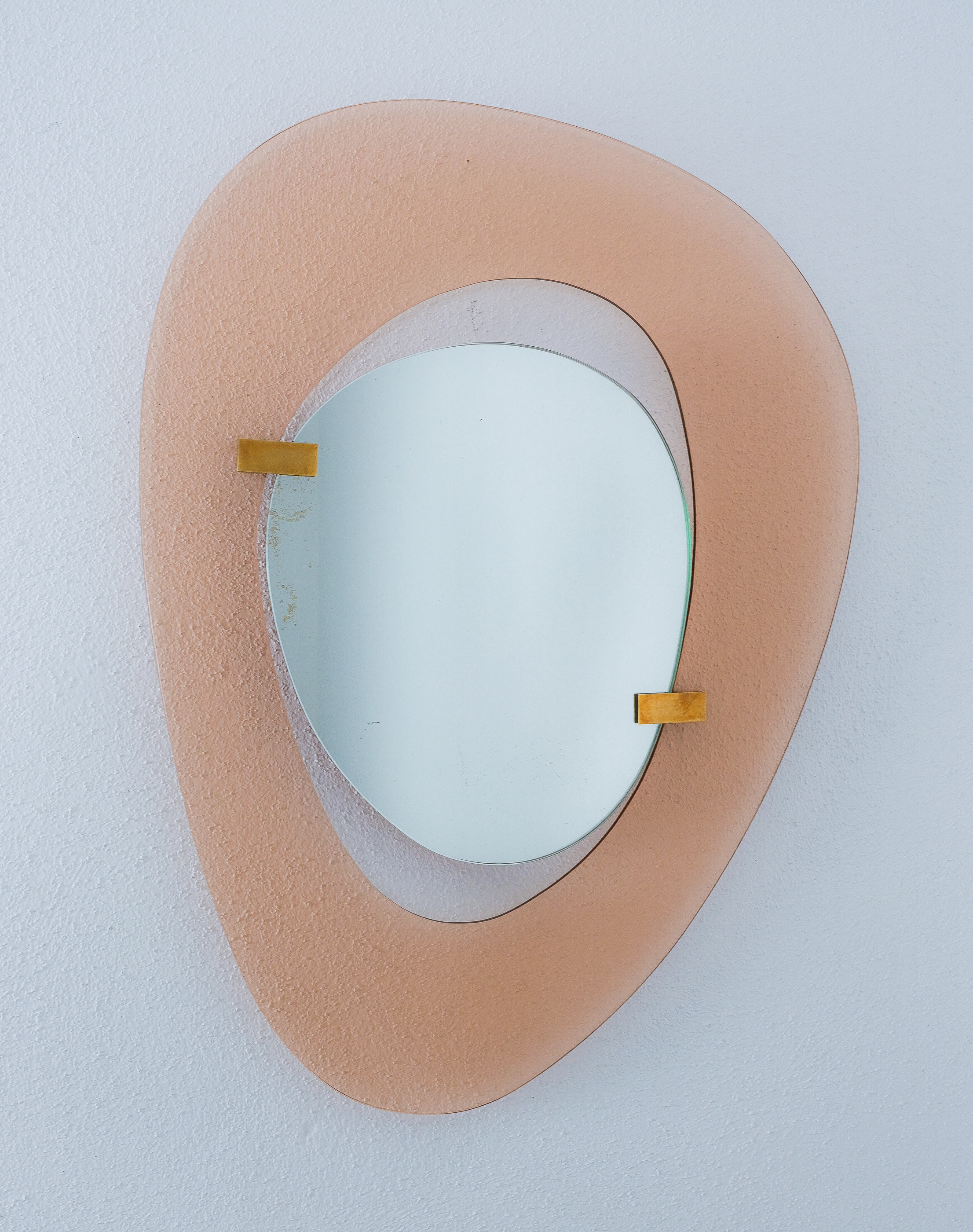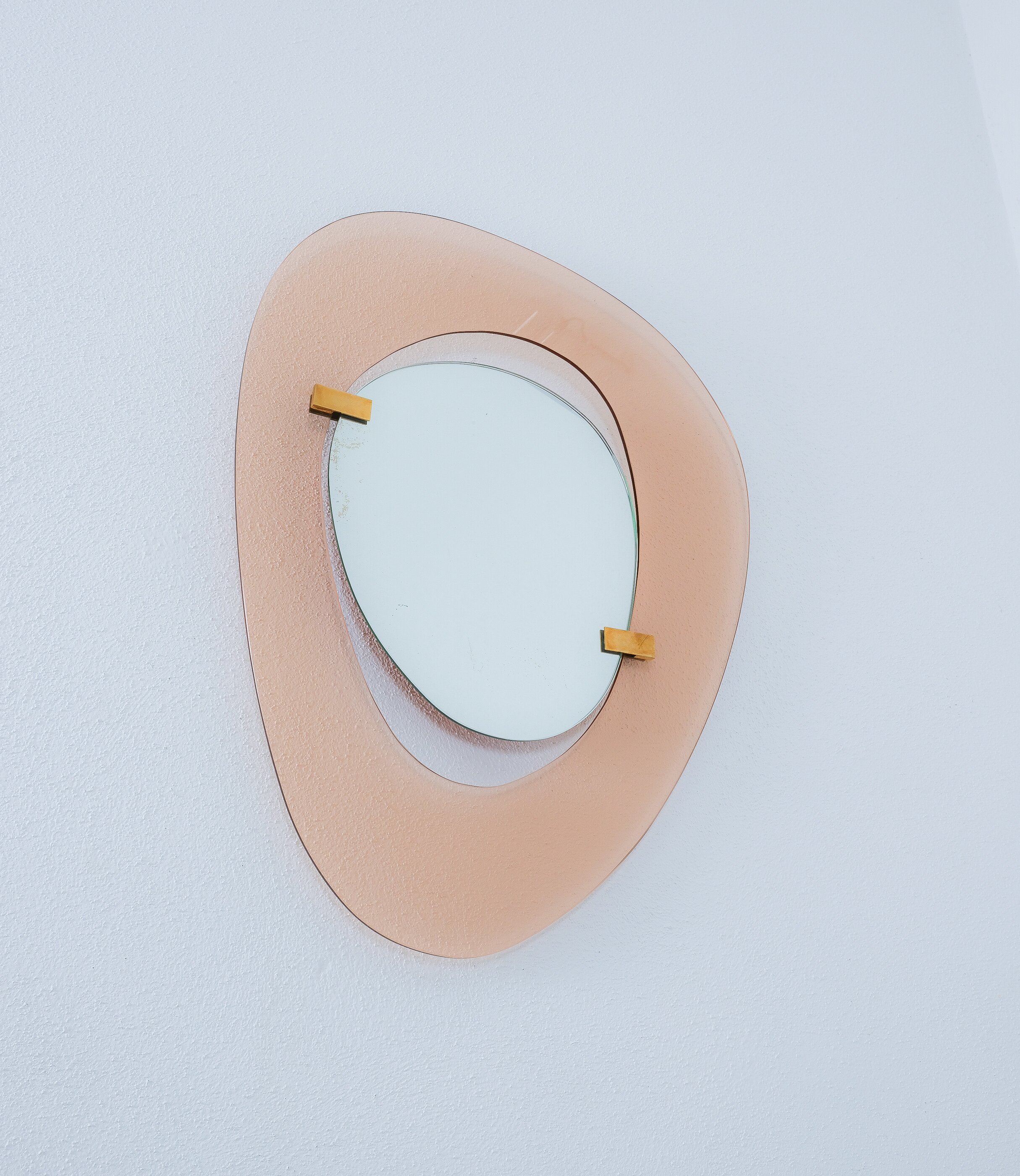 Fontana Arte mirror by Max Ingrand, Italy, circa 1958. Beautiful mirror with an anomic (non-geometrical or organic) orange smooth glass frame and anomic floating mirror attached with two brass clasps. Good condition, no chips, some minimal scratches, little aging stains or discolorations and losses to the mirror glass are present which is normal for these pieces and the age. The brass clamps show an even patina. Overall good to very good condition with regards to the age of 70 years.