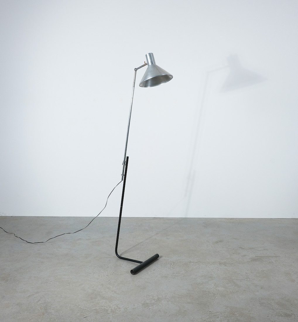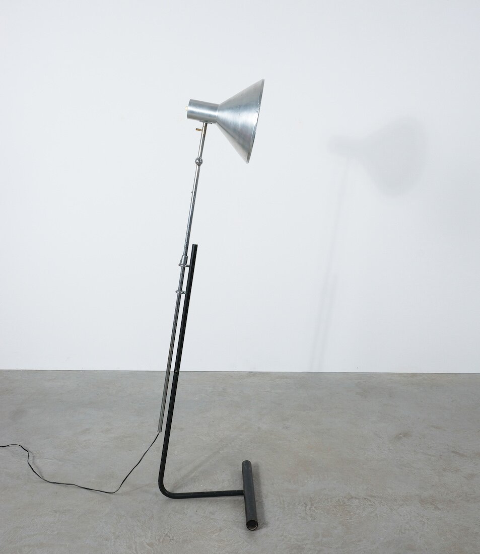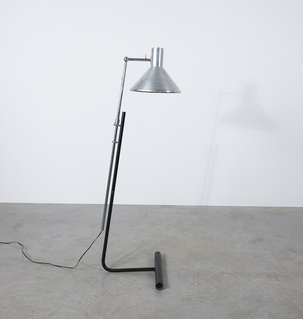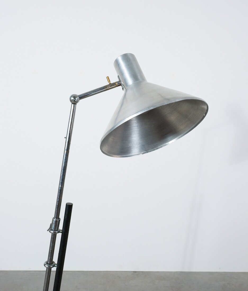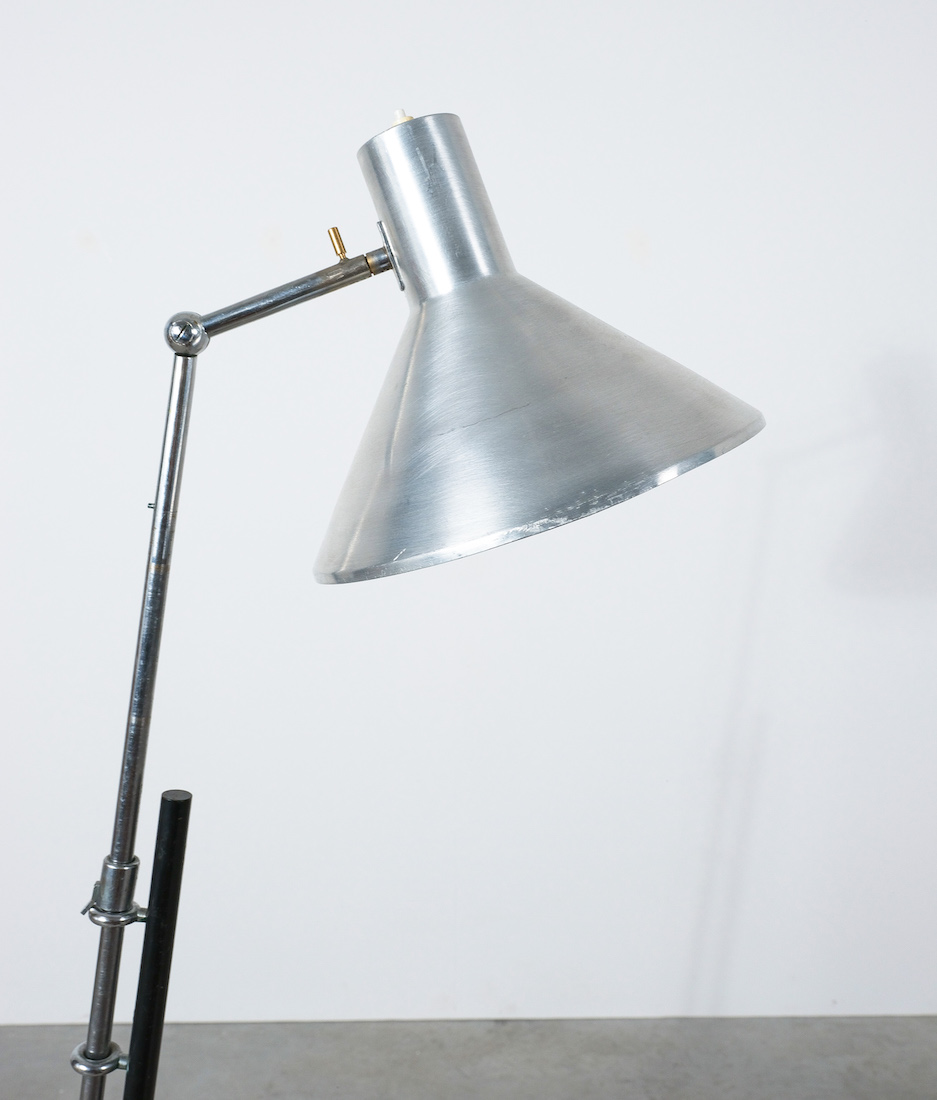 Designed in 1948 this example probably dates from the 1950's and shows the rawest version of this famous articulate floor light with aluminum shade and blackened, nickeled brass base. The black enameled metal base with its adjustable supporting upper arm in nickel plated brass is adjustable in height between 39" - 63" approximately. A simple hook mechanism allows very simple height adjustment , the upper arm section is connected via a pivoting knuckle meaning the shade can be tilted back and forward as shown.