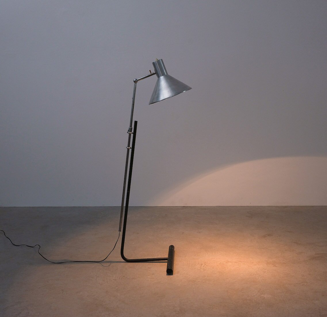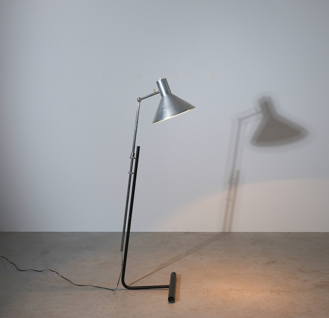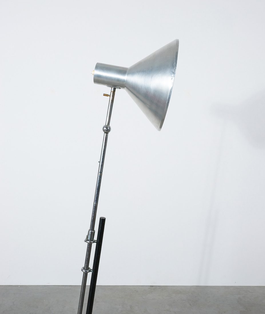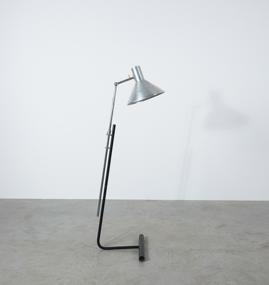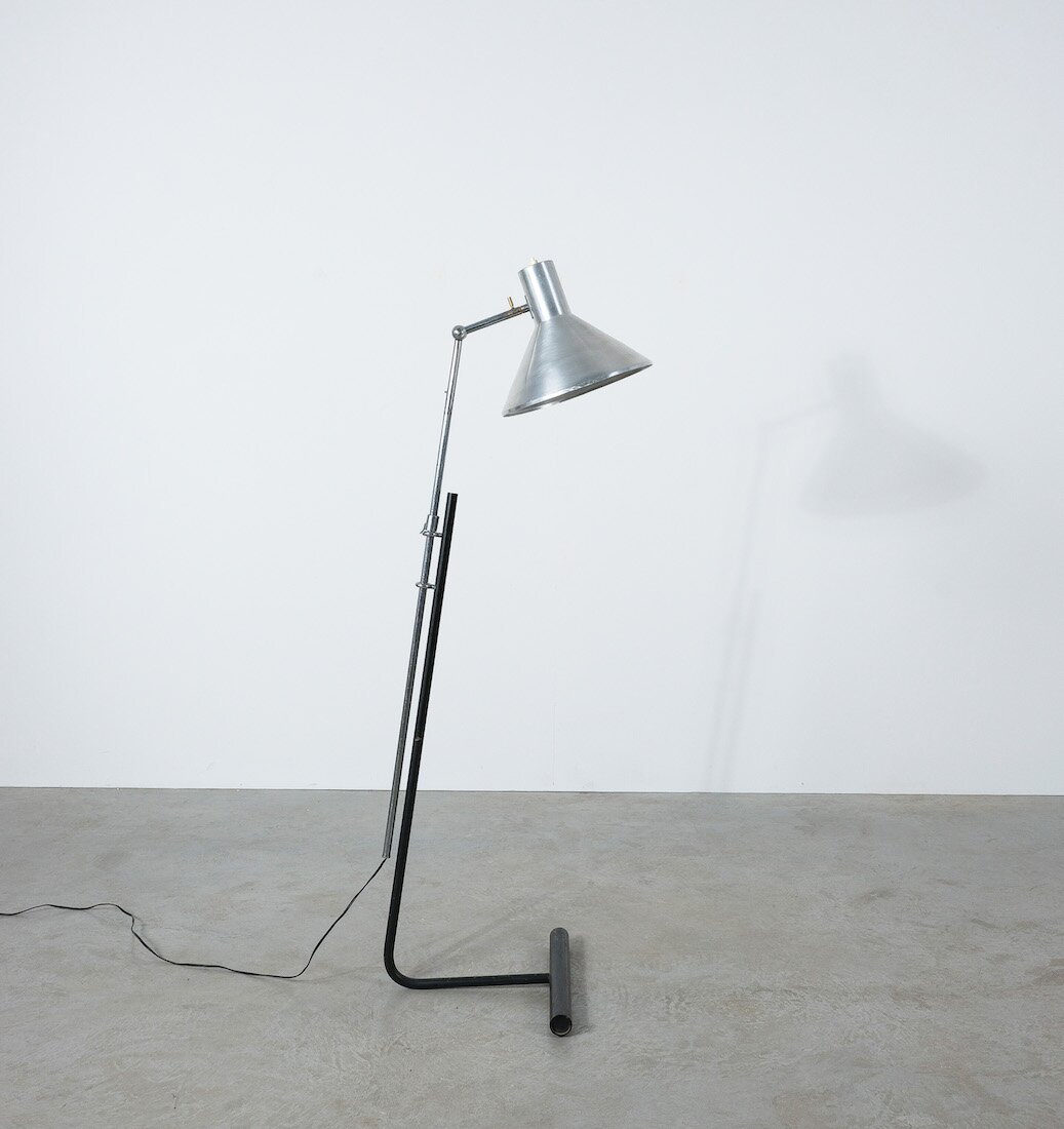 Designed in 1948 this example probably dates from the 1950's and shows the rawest version of this famous articulate floor light with aluminum shade and blackened, nickeled brass base. The black enameled metal base with its adjustable supporting upper arm in nickel plated brass is adjustable in height between 39" - 63" approximately. A simple hook mechanism allows very simple height adjustment , the upper arm section is connected via a pivoting knuckle meaning the shade can be tilted back and forward as shown.