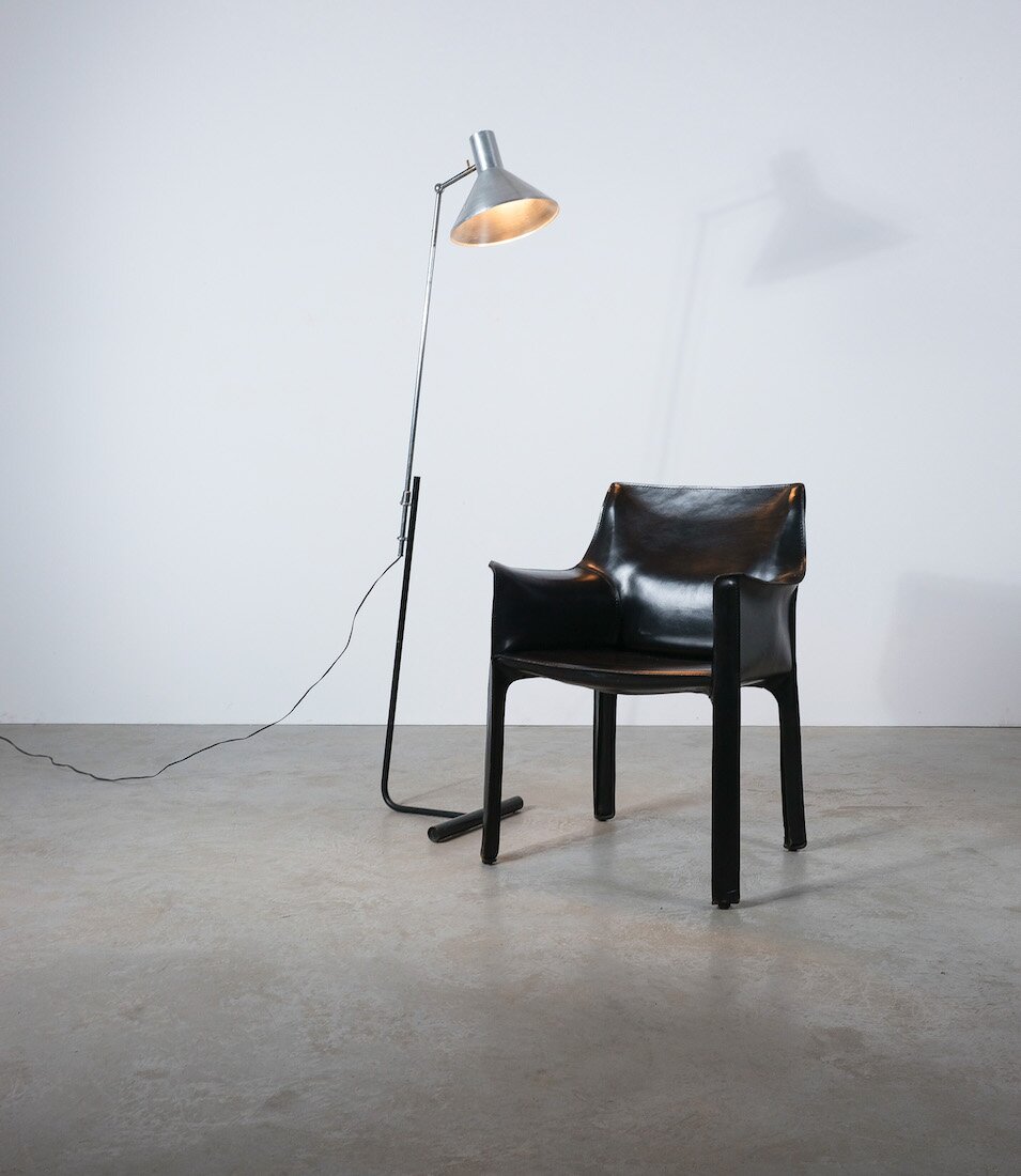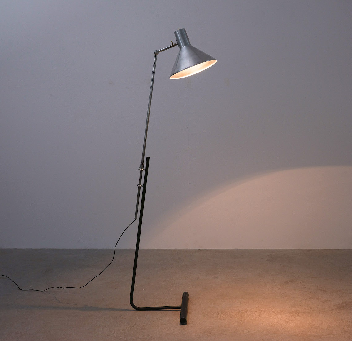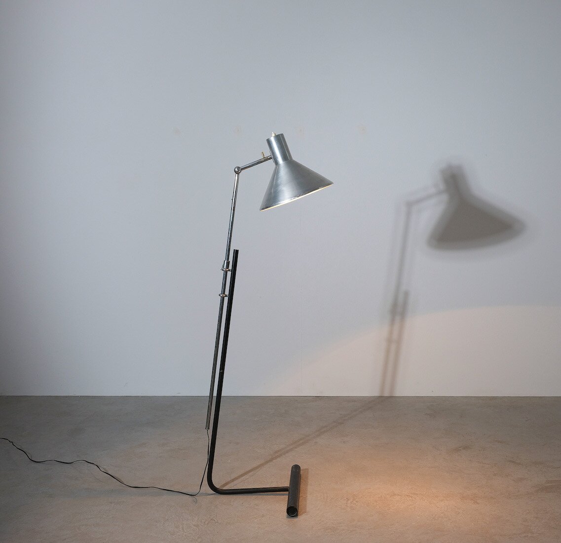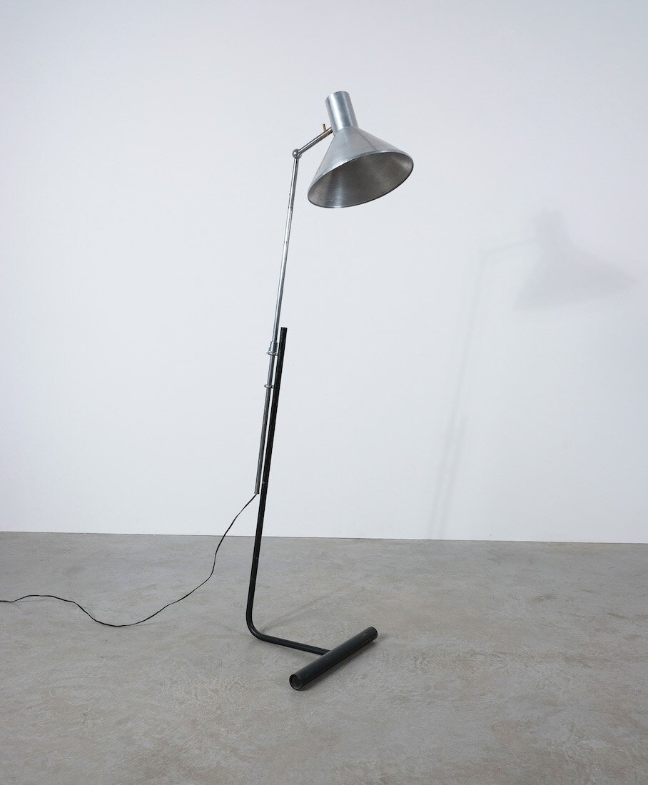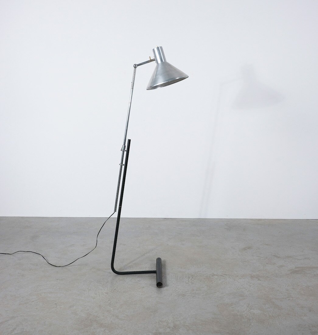 Designed in 1948 this example probably dates from the 1950's and shows the rawest version of this famous articulate floor light with aluminum shade and blackened, nickeled brass base. The black enameled metal base with its adjustable supporting upper arm in nickel plated brass is adjustable in height between 39" - 63" approximately. A simple hook mechanism allows very simple height adjustment , the upper arm section is connected via a pivoting knuckle meaning the shade can be tilted back and forward as shown.
