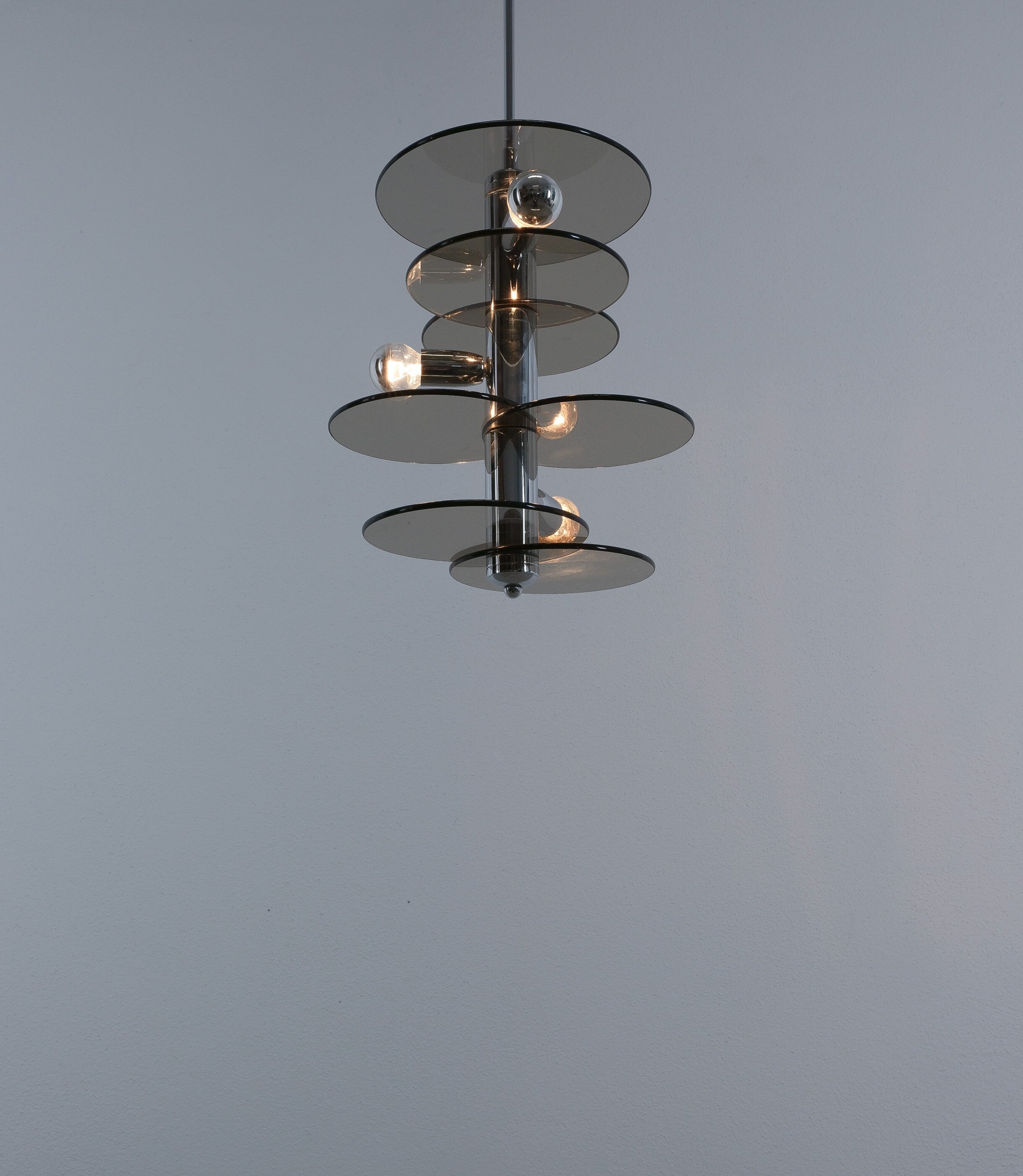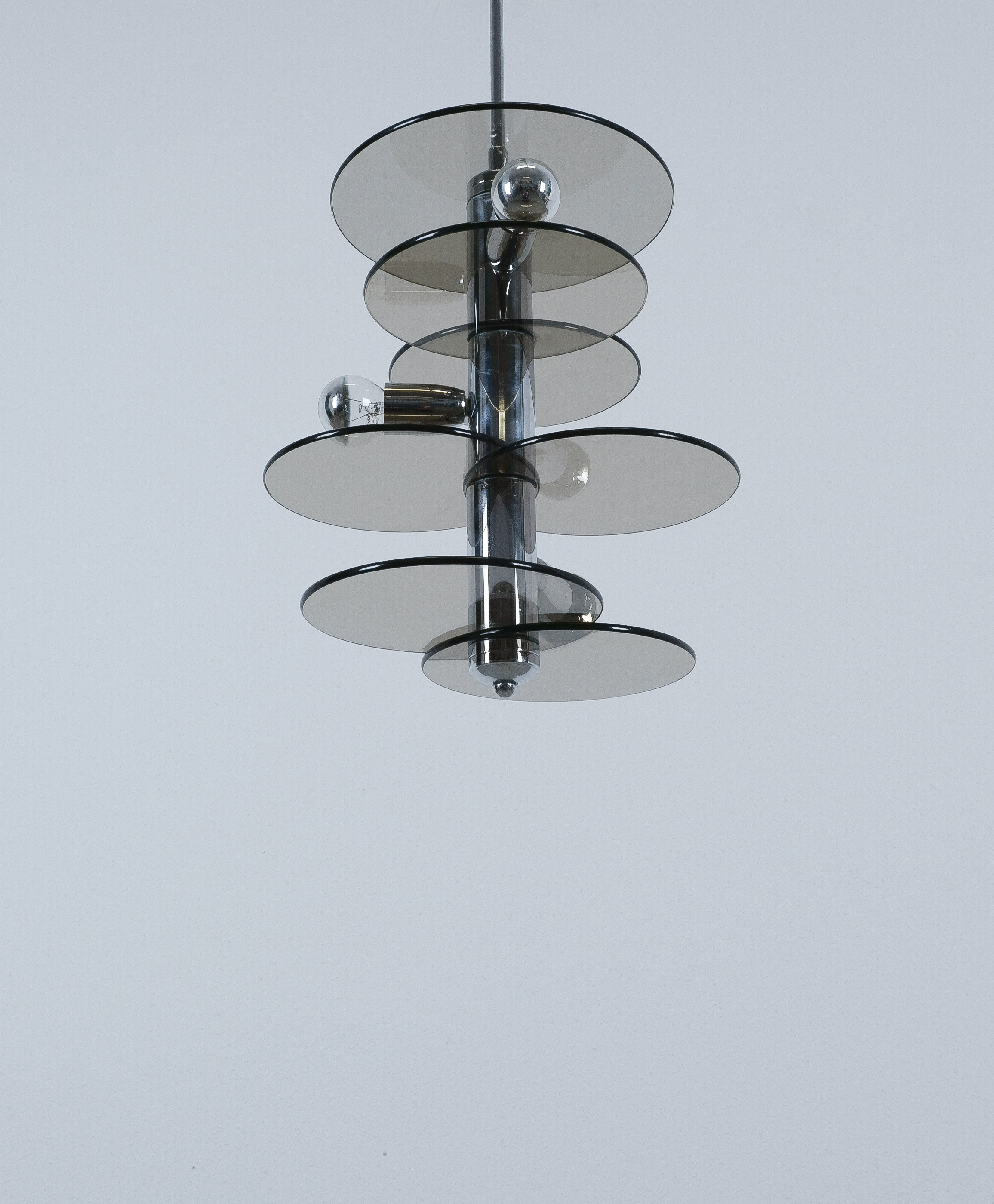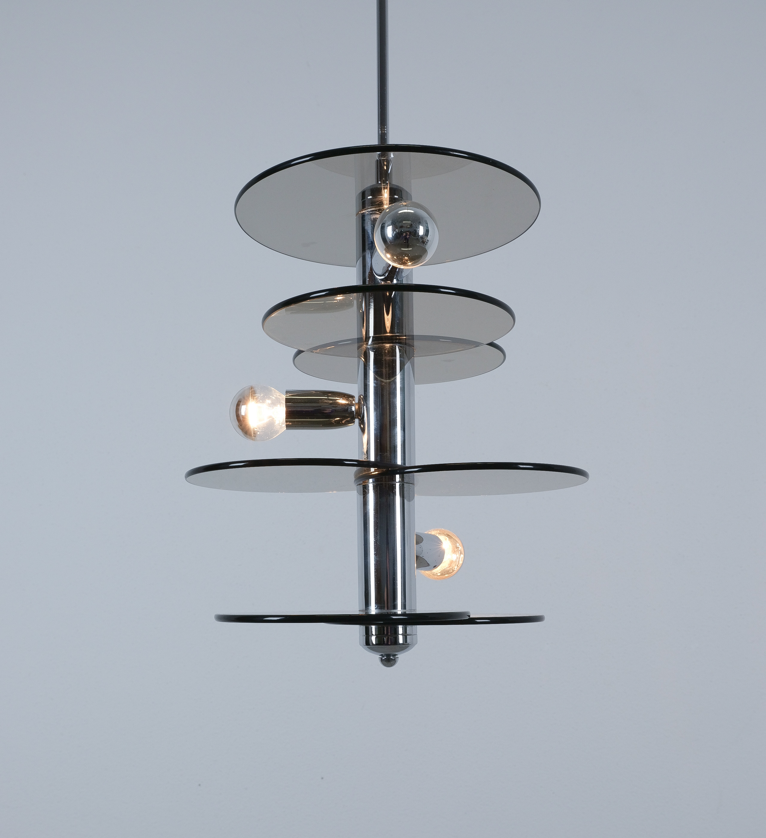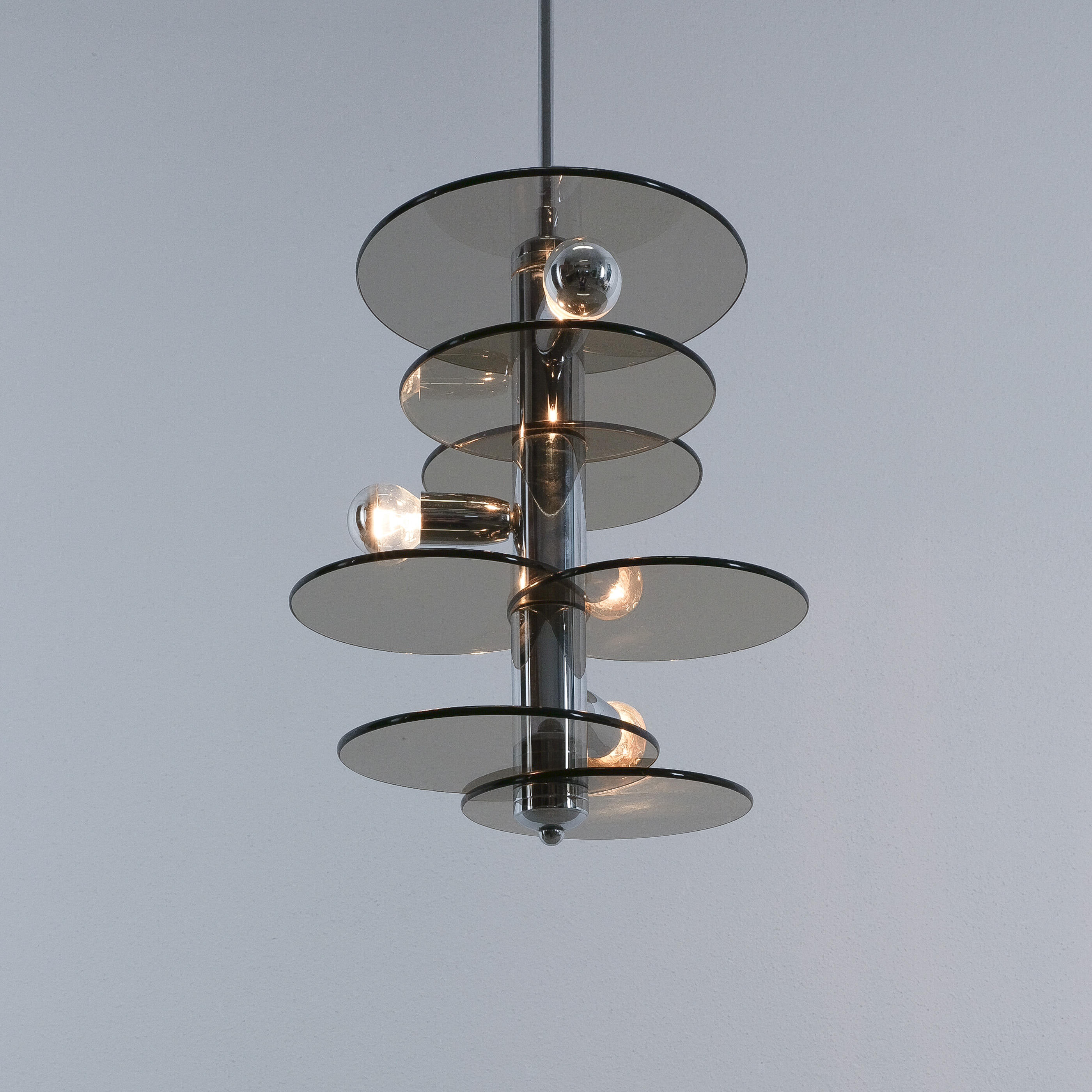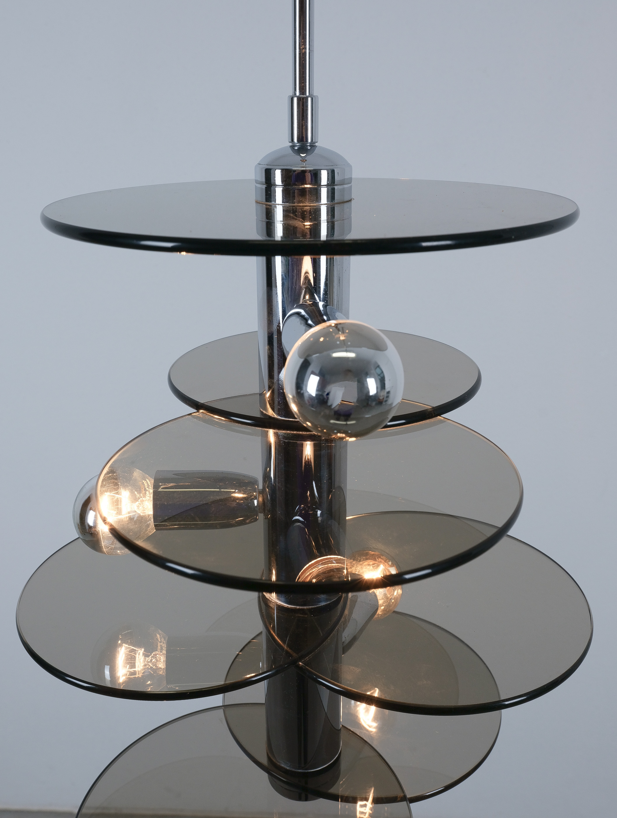 Nice architectural light with stacked glass discs, orbiting around a chrome stem. Made from thick grey-charcoal smokey glass pieces with polished edges and chromed brass. It holds 3 bulbs in total. Dimensions are: 15,74" x 12 x 31,5"