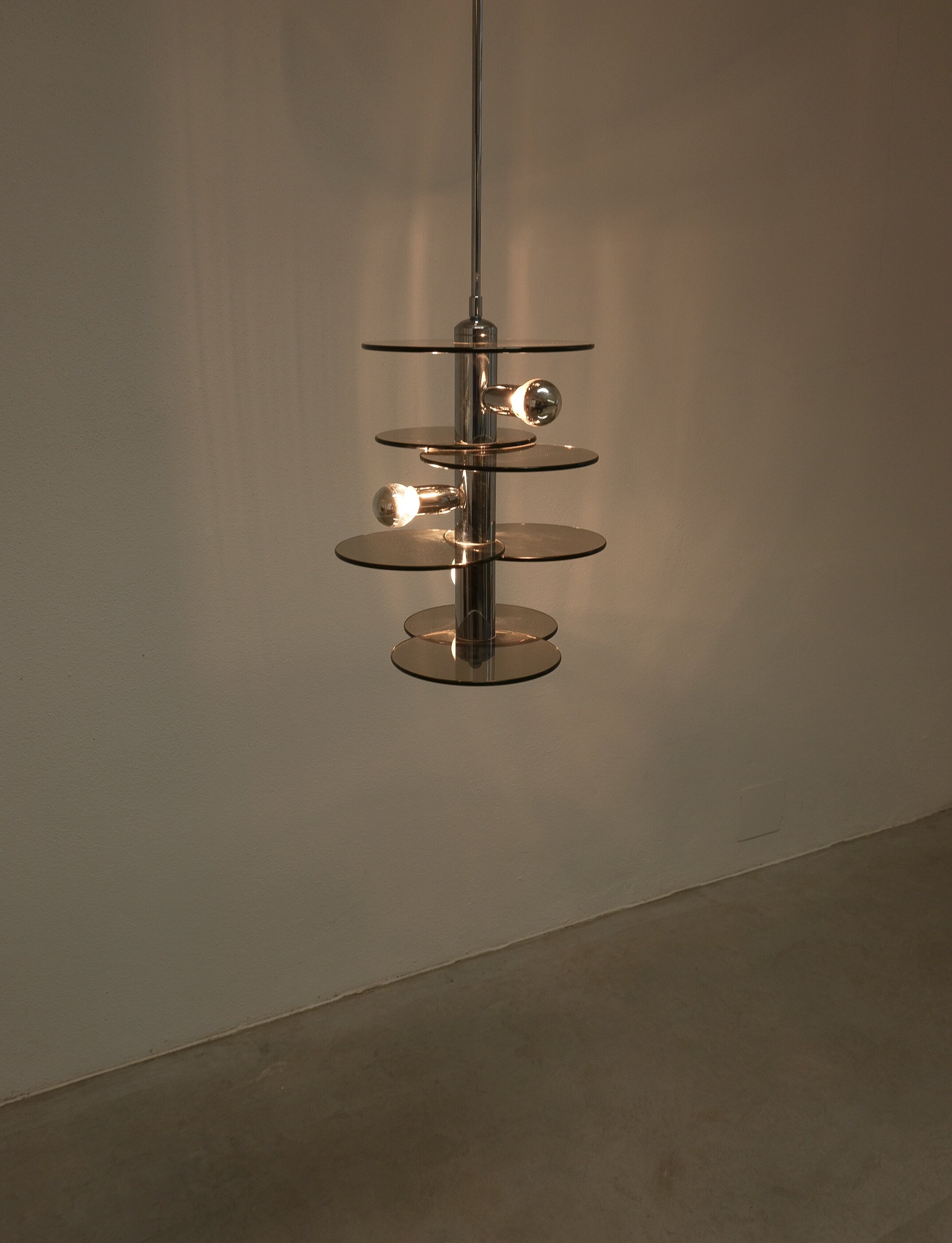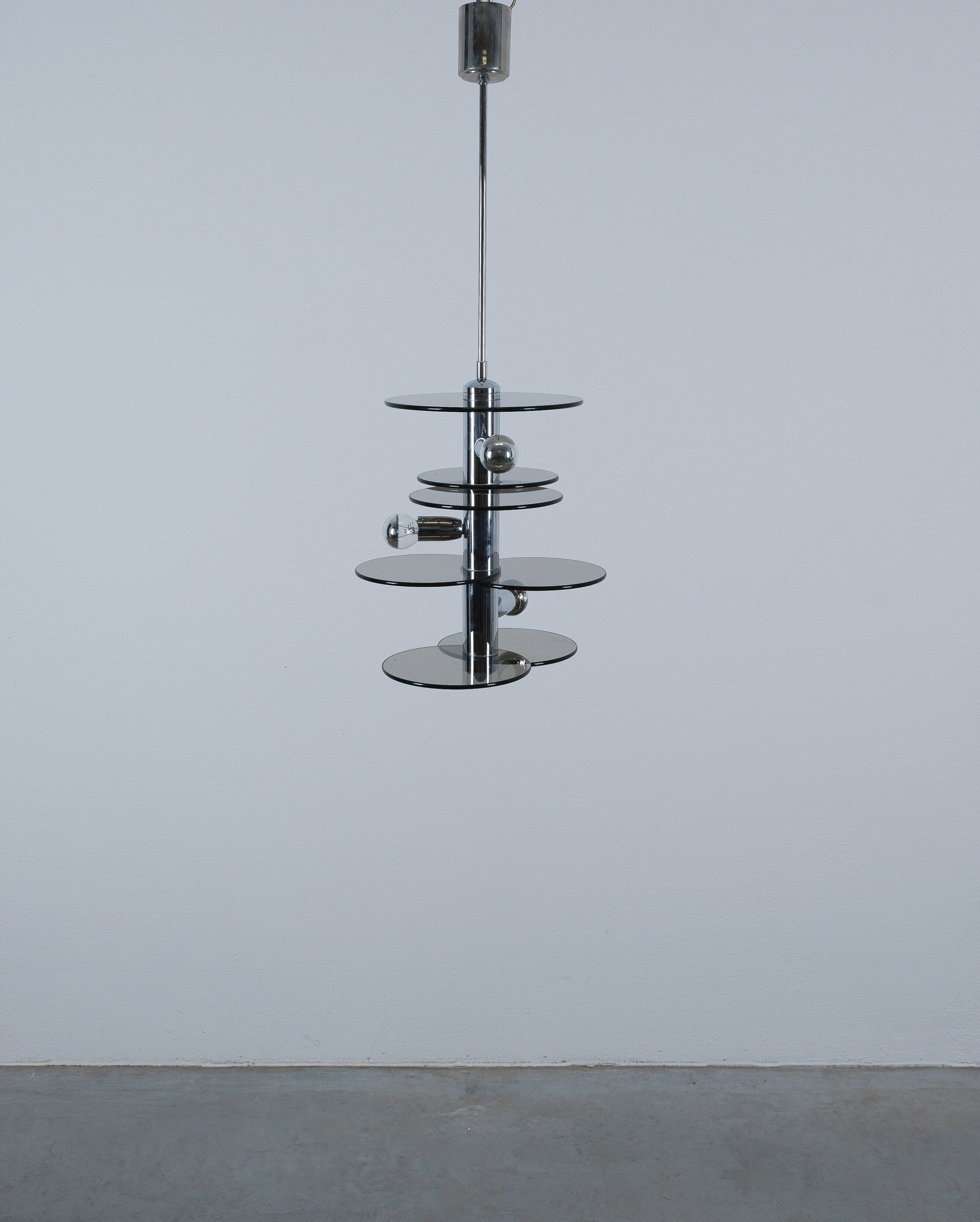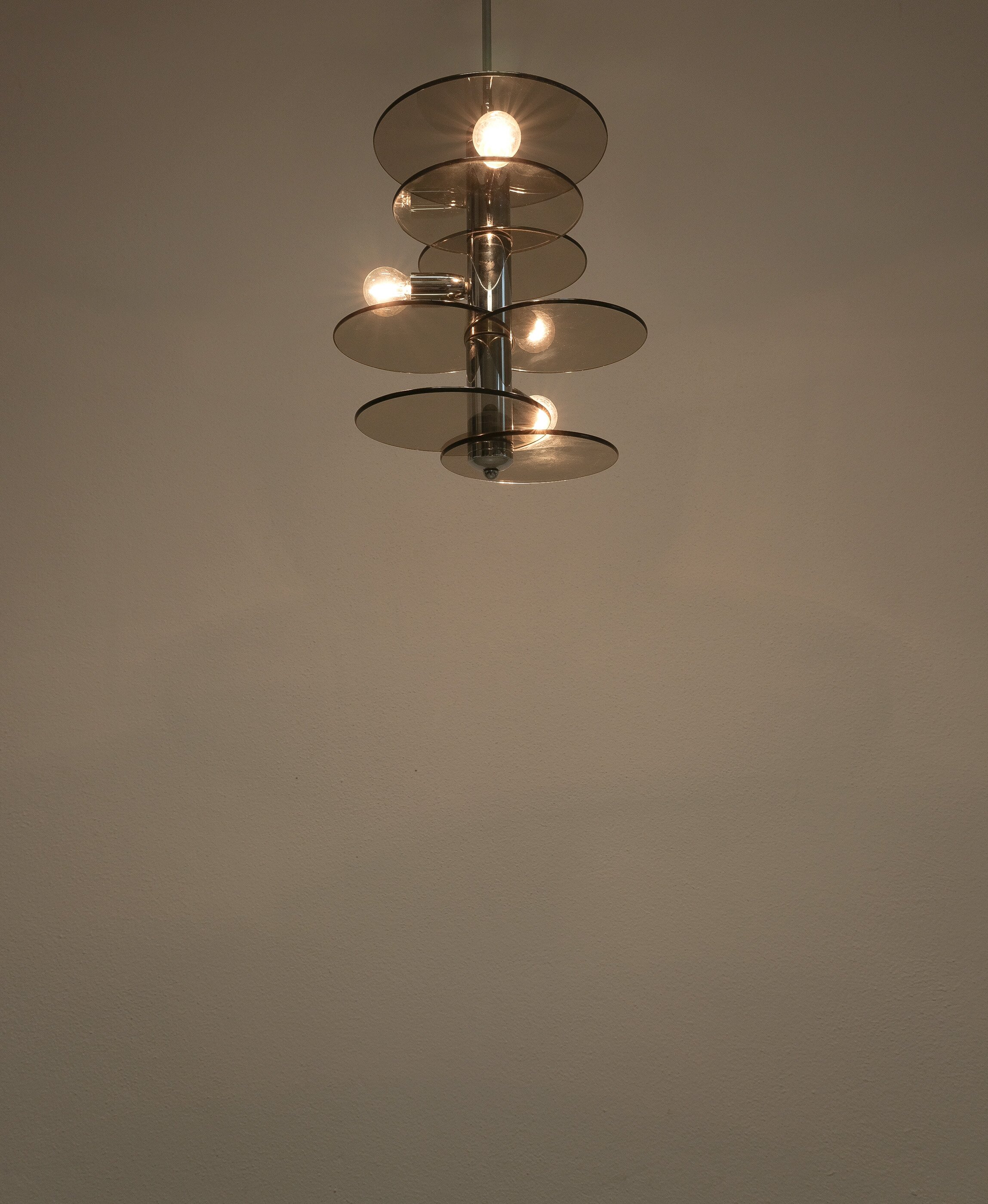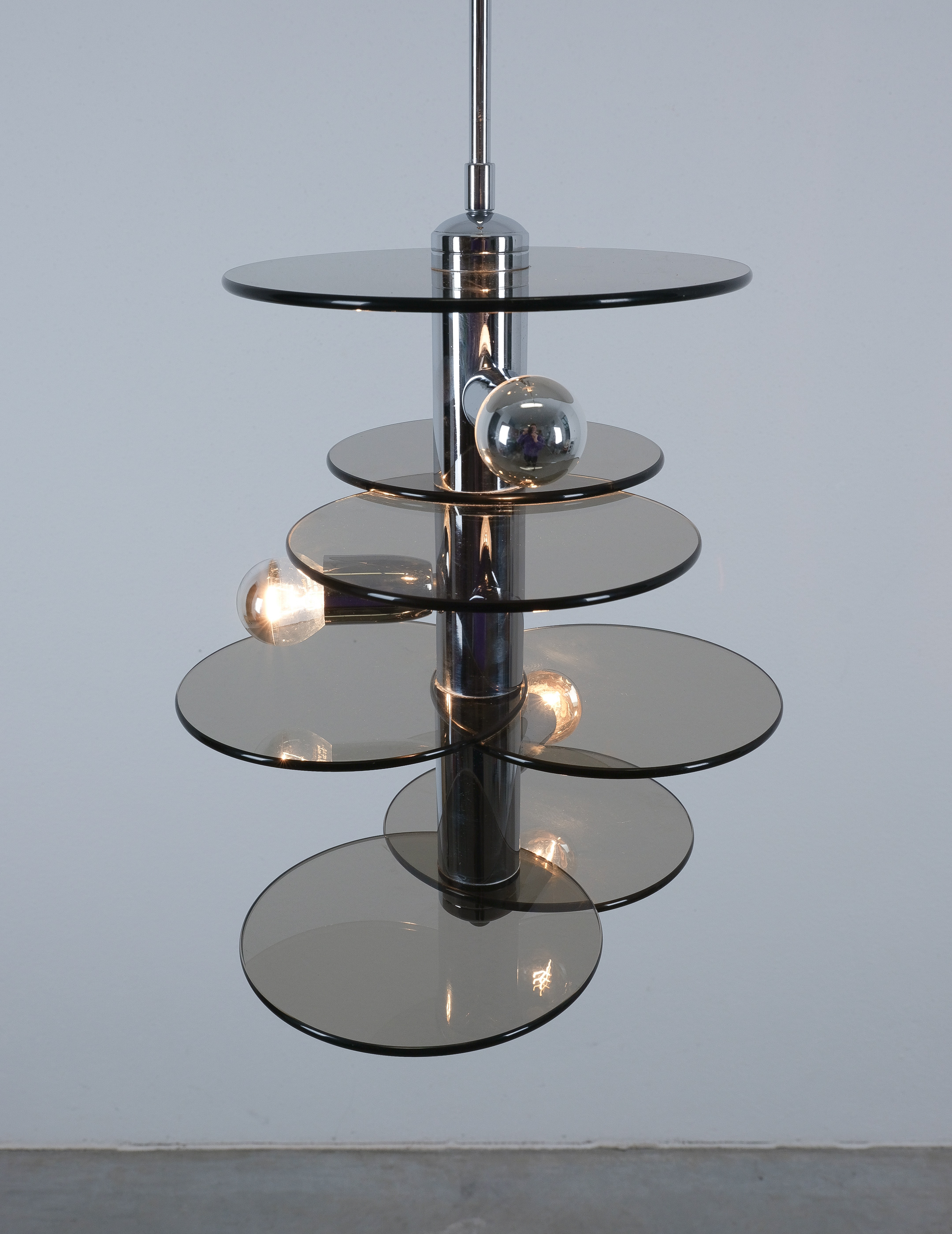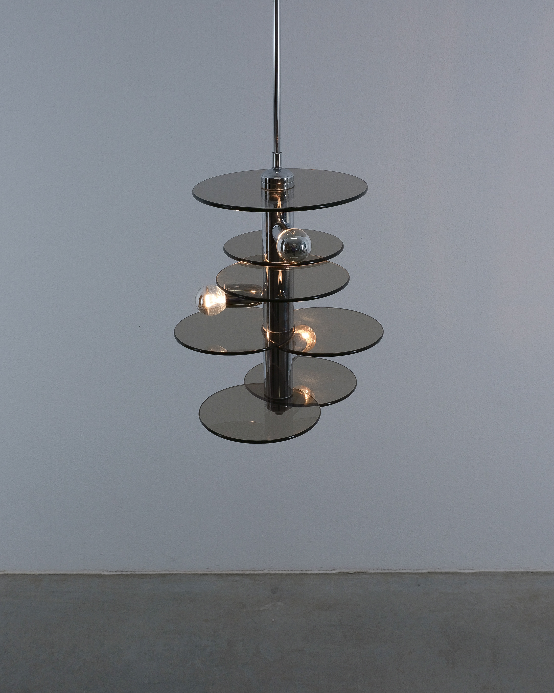Nice architectural light with stacked glass discs, orbiting around a chrome stem. Made from thick grey-charcoal smokey glass pieces with polished edges and chromed brass. It holds 3 bulbs in total. Dimensions are: 15,74" x 12 x 31,5"