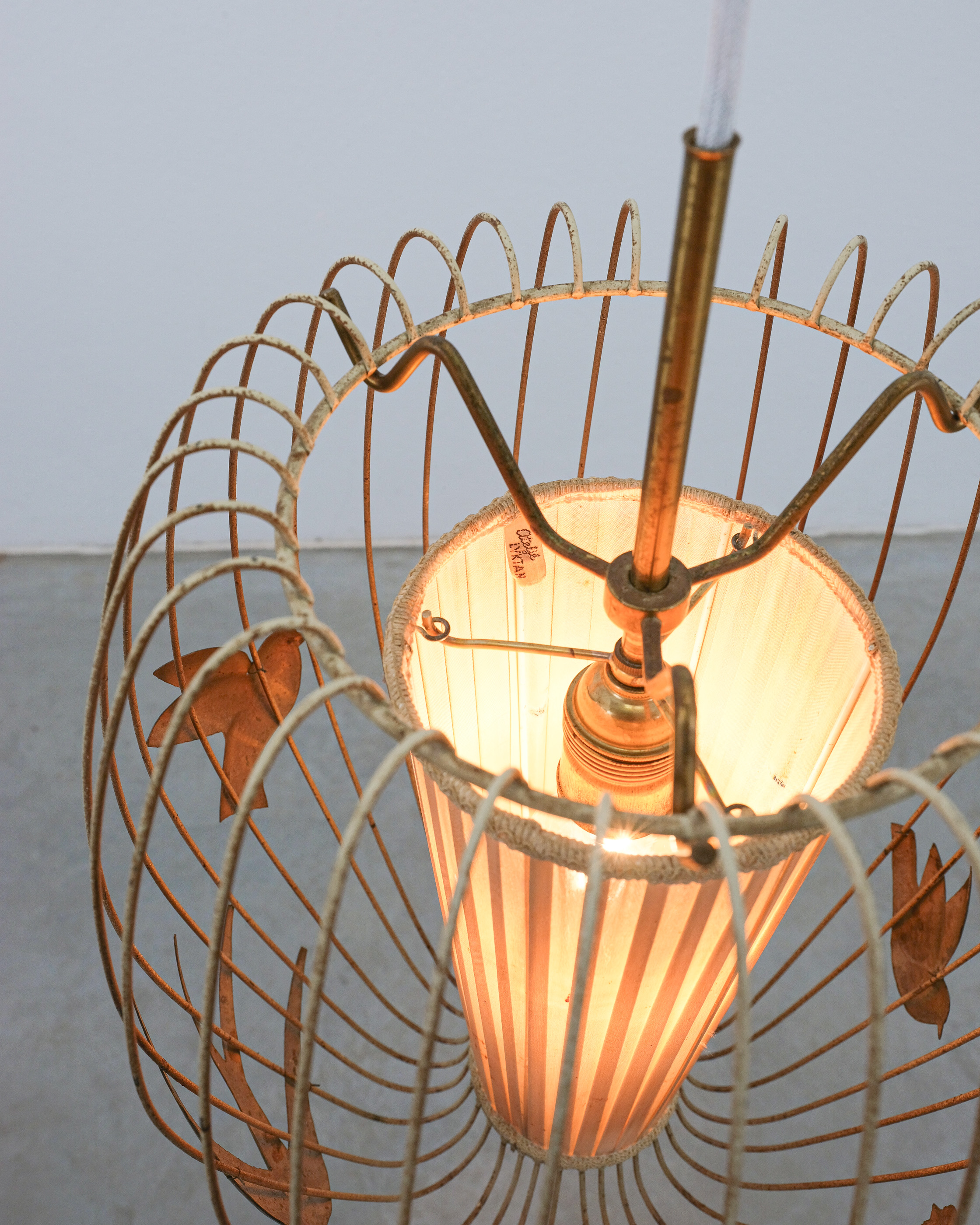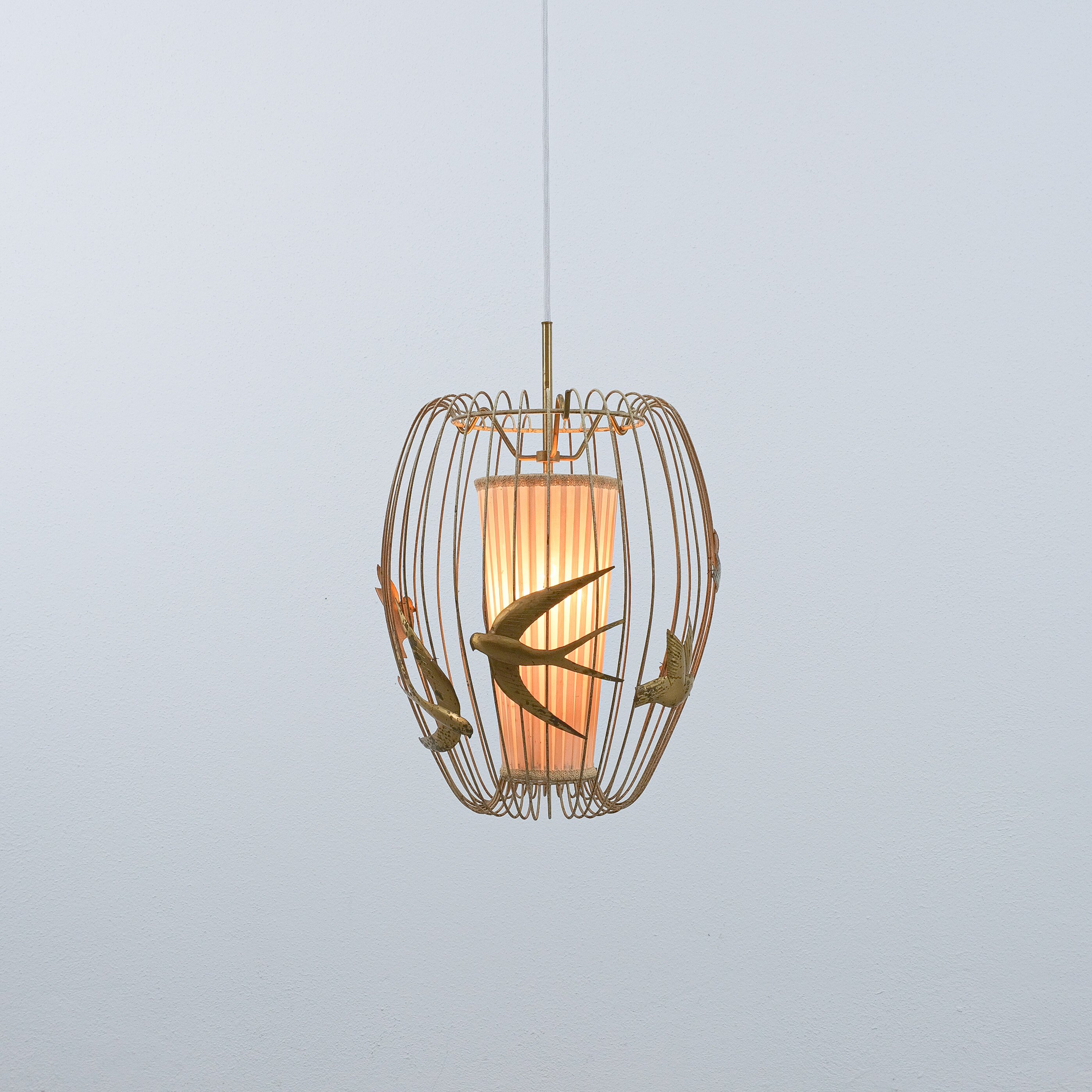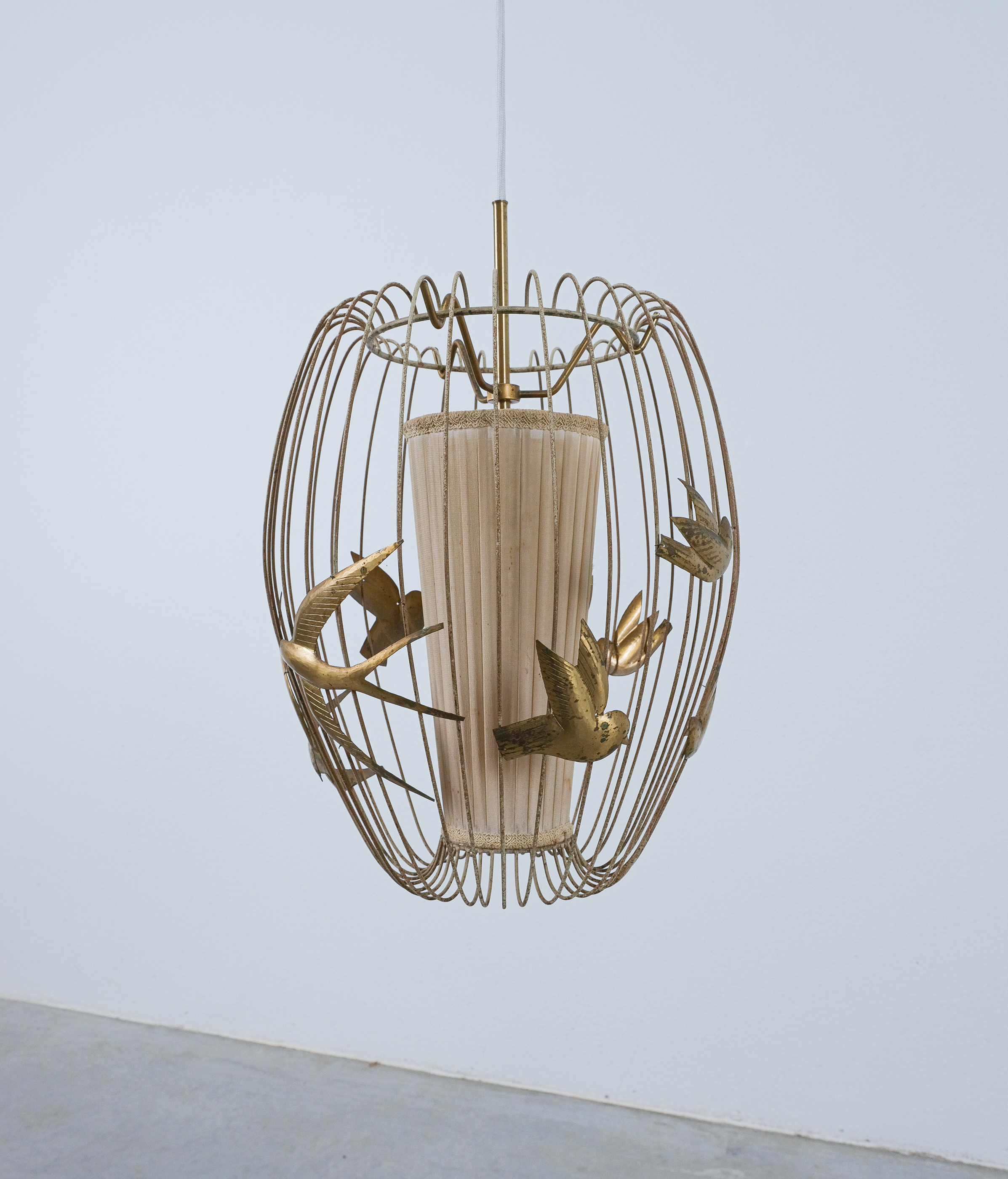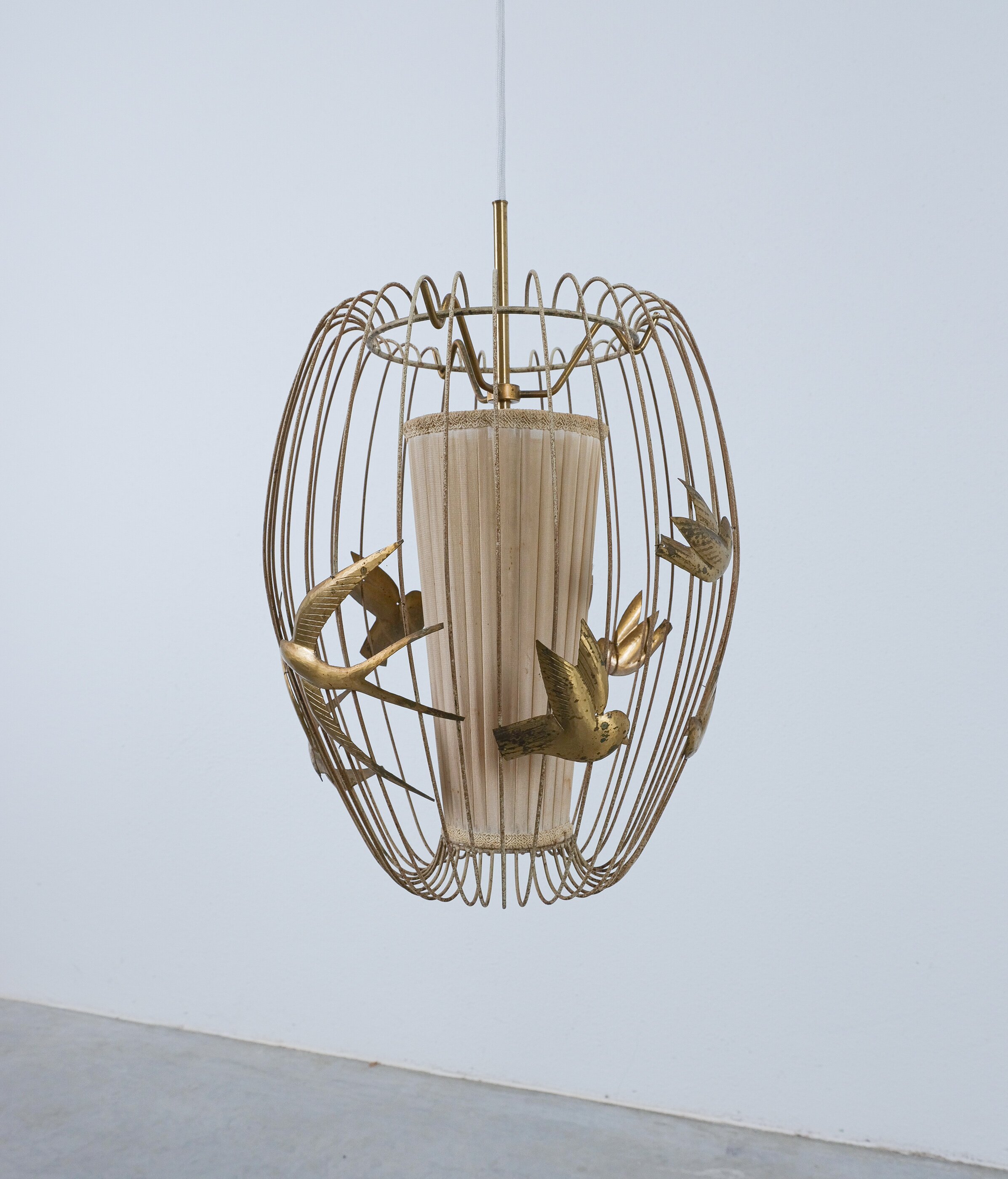 This light rarely pops up in the retail market and has a magical playfulness to it. The detailed birds flying out side a cage and still being present in the play of light and shadow. It consist of a brass frame from brass, lacquered white. The lacquer shows signs of wear, patina and rub-offs. (we can restore it if requested). The inner textile screen we left untouched though it has some minor holes in it, however it's the original shade with the original label. It takes one bulbs e26/27; we recommend Led's du to less heat emission. The shade can also be repaired or replaced, at this point we limited the restoration at cleaning and rewiring to preserve as much of its originality as possible.