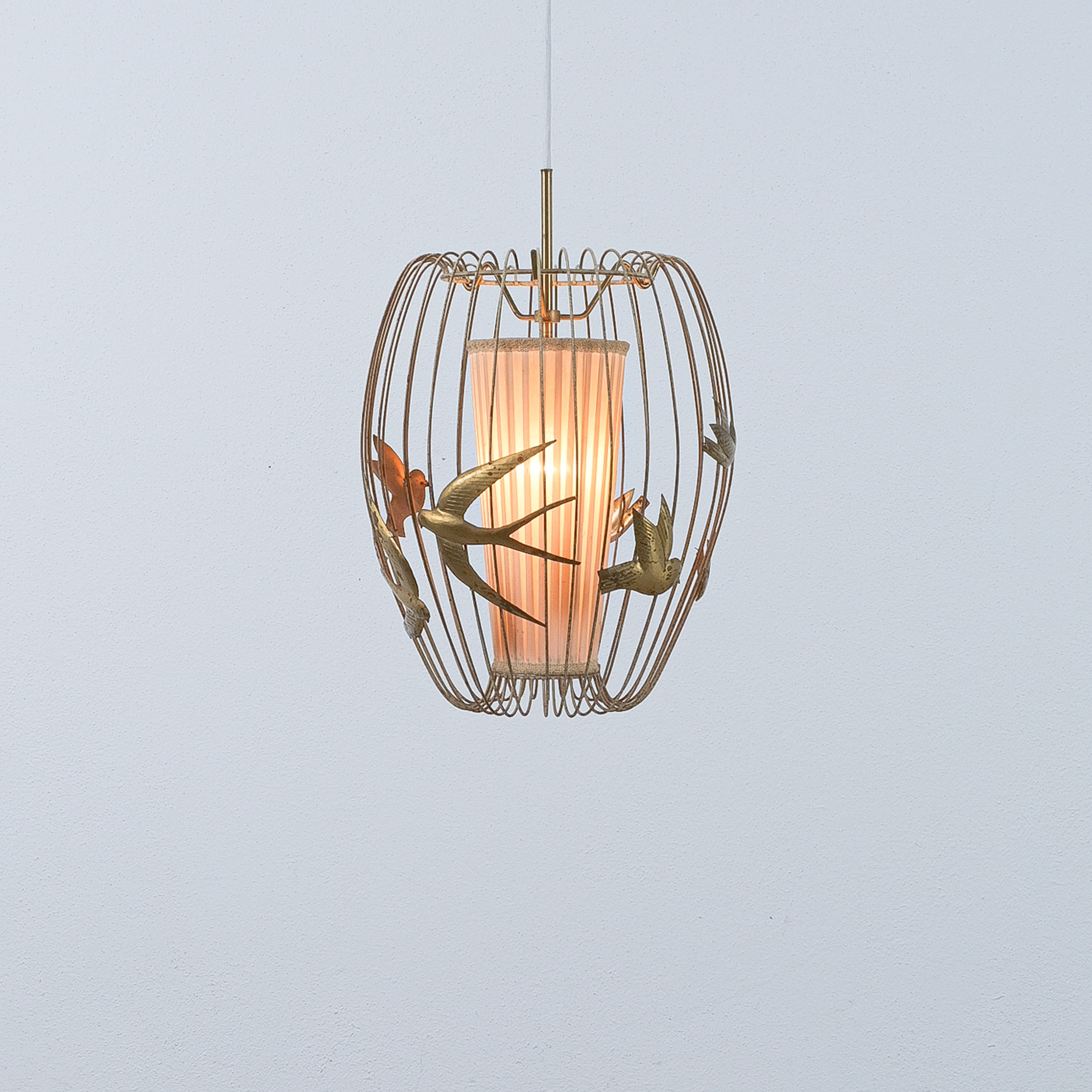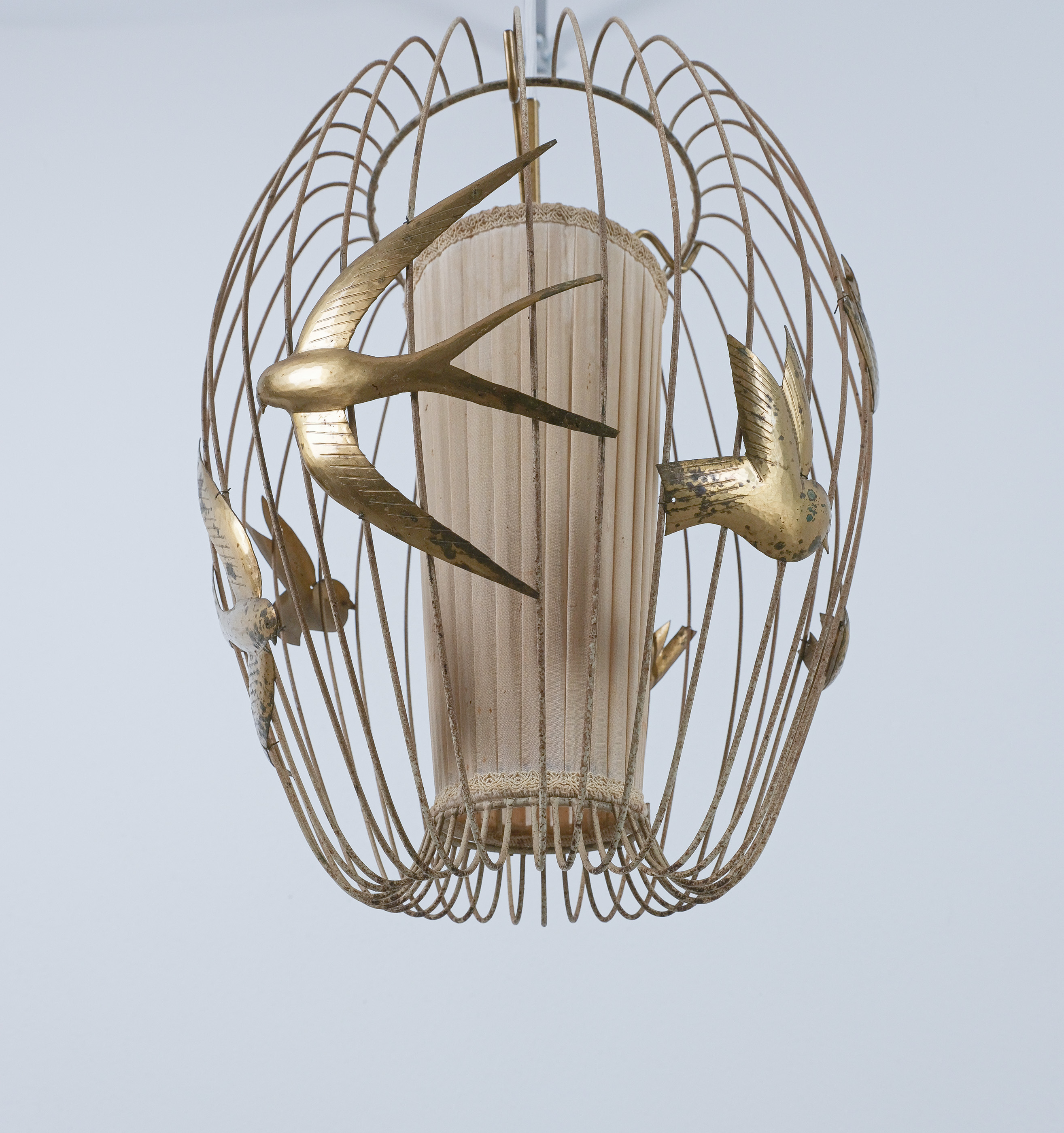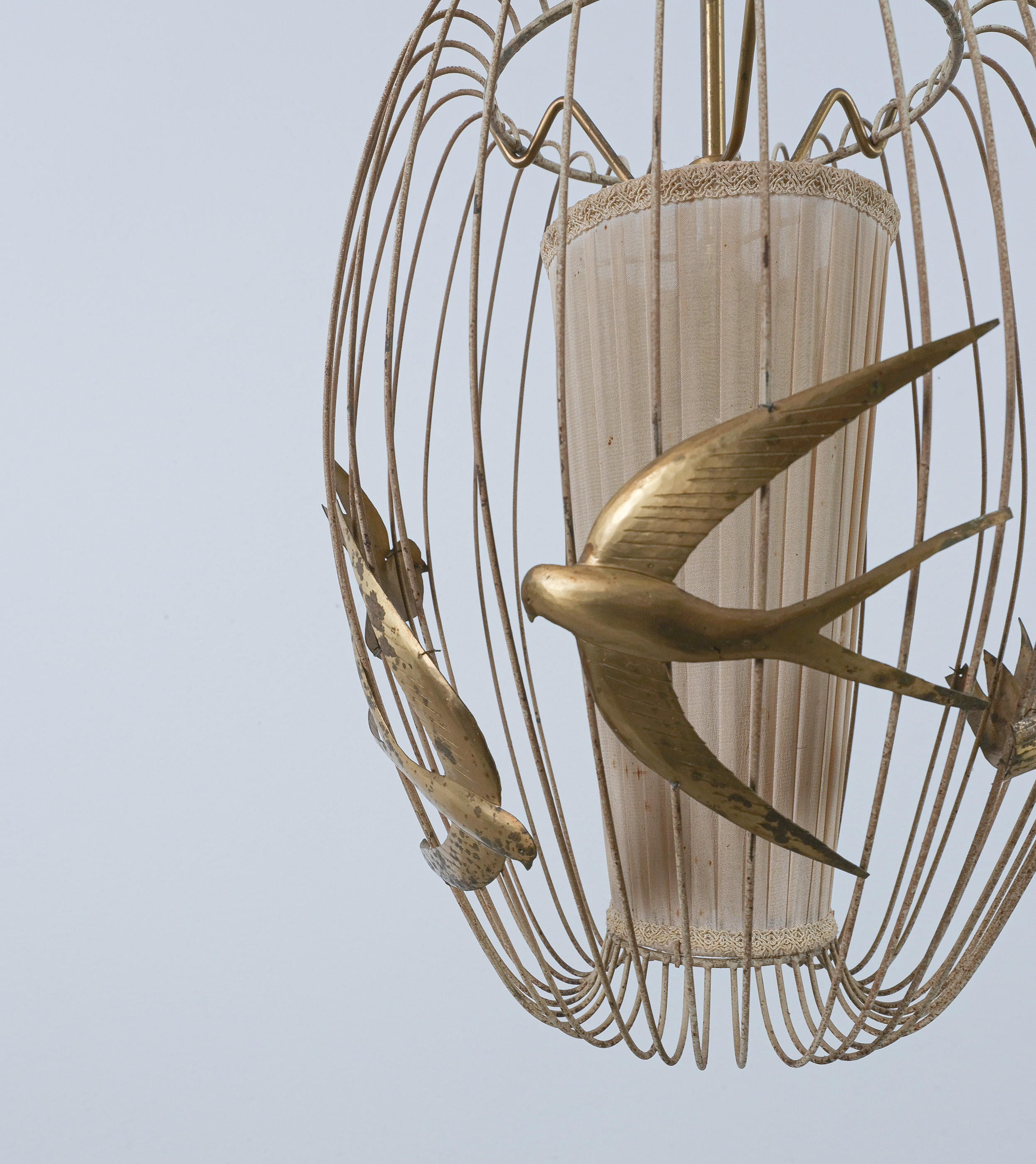 This light rarely pops up in the retail market and has a magical playfulness to it. The detailed birds flying out side a cage and still being present in the play of light and shadow. It consist of a brass frame from brass, lacquered white. The lacquer shows signs of wear, patina and rub-offs. (we can restore it if requested). The inner textile screen we left untouched though it has some minor holes in it, however it's the original shade with the original label. It takes one bulbs e26/27; we recommend Led's du to less heat emission. The shade can also be repaired or replaced, at this point we limited the restoration at cleaning and rewiring to preserve as much of its originality as possible.