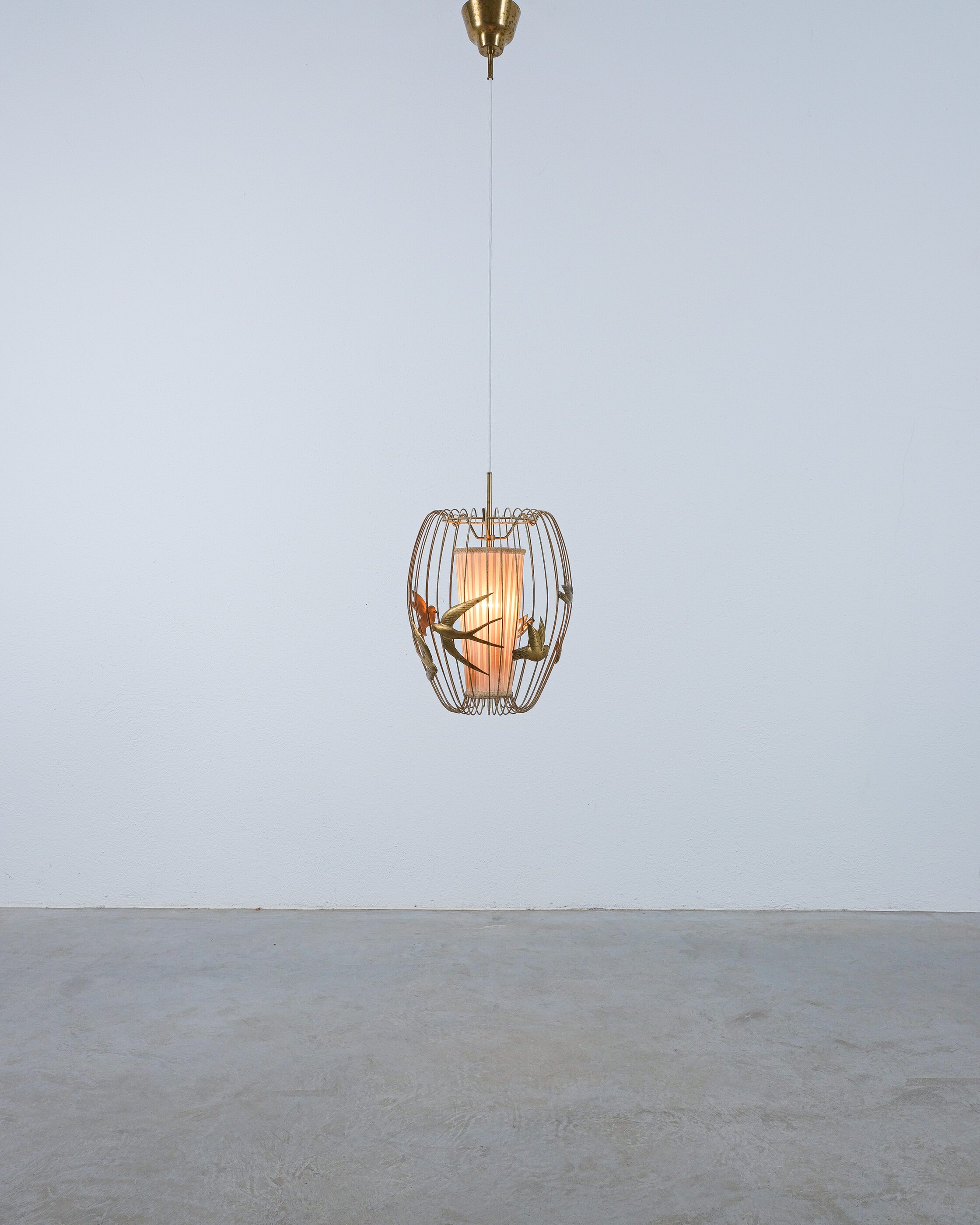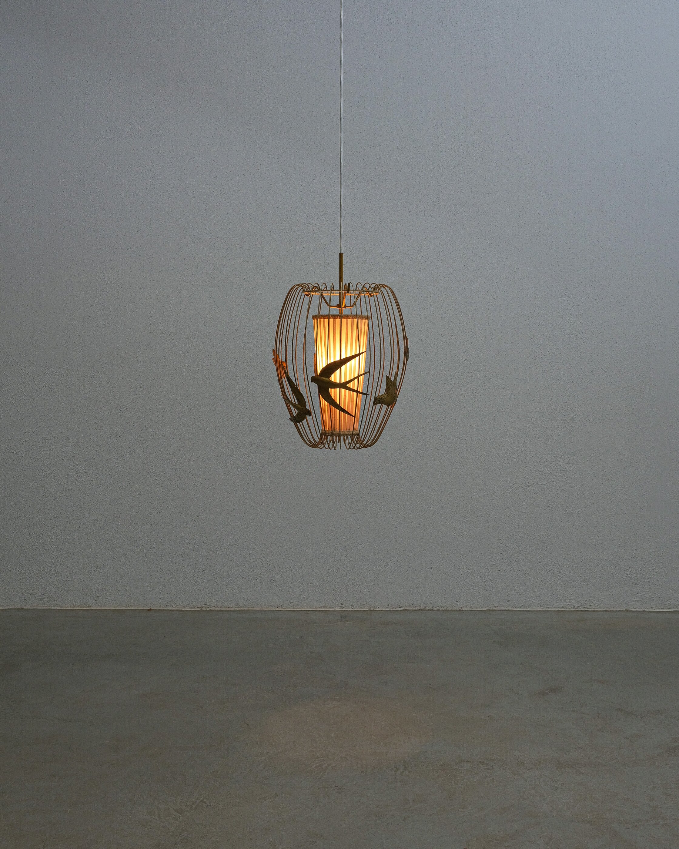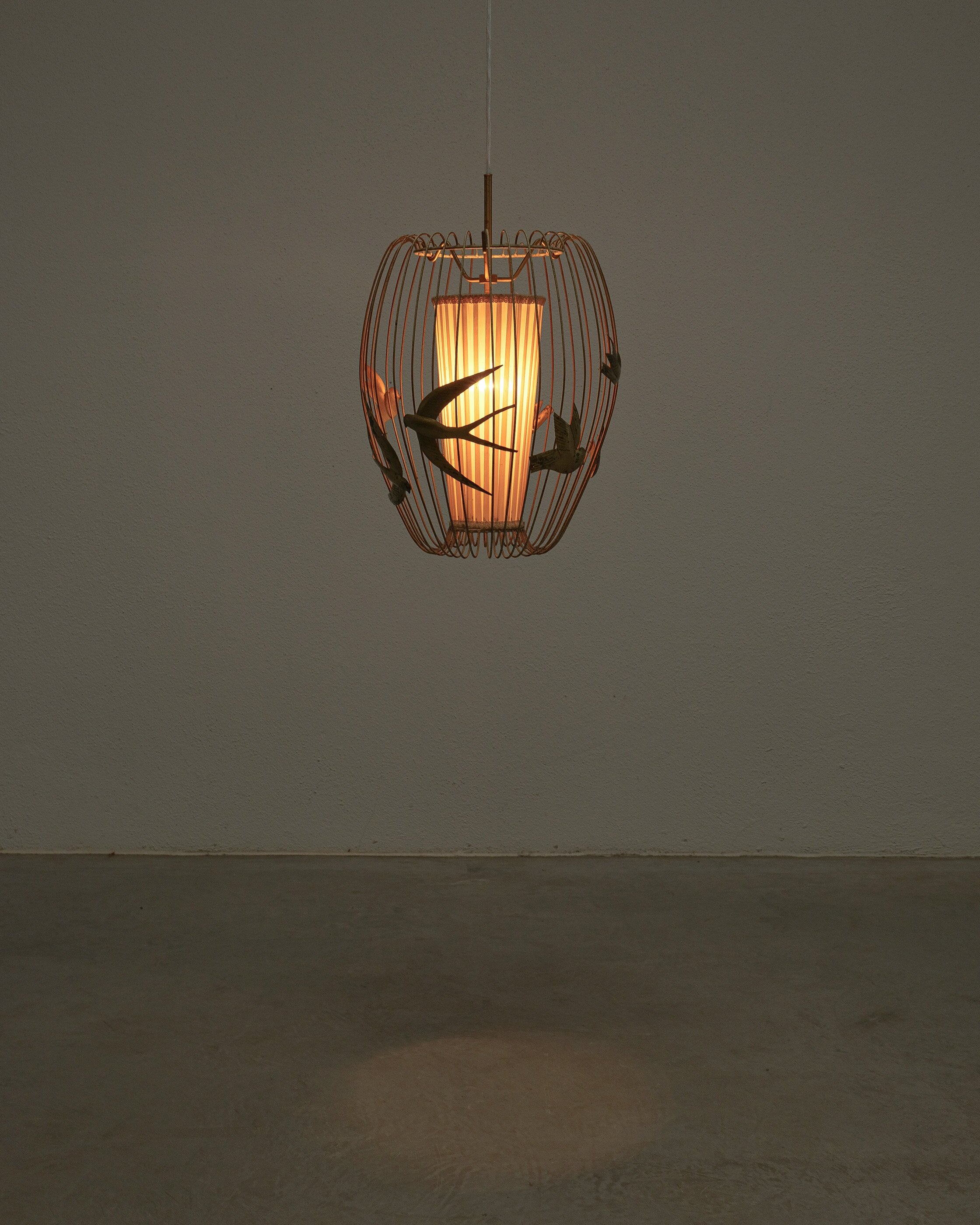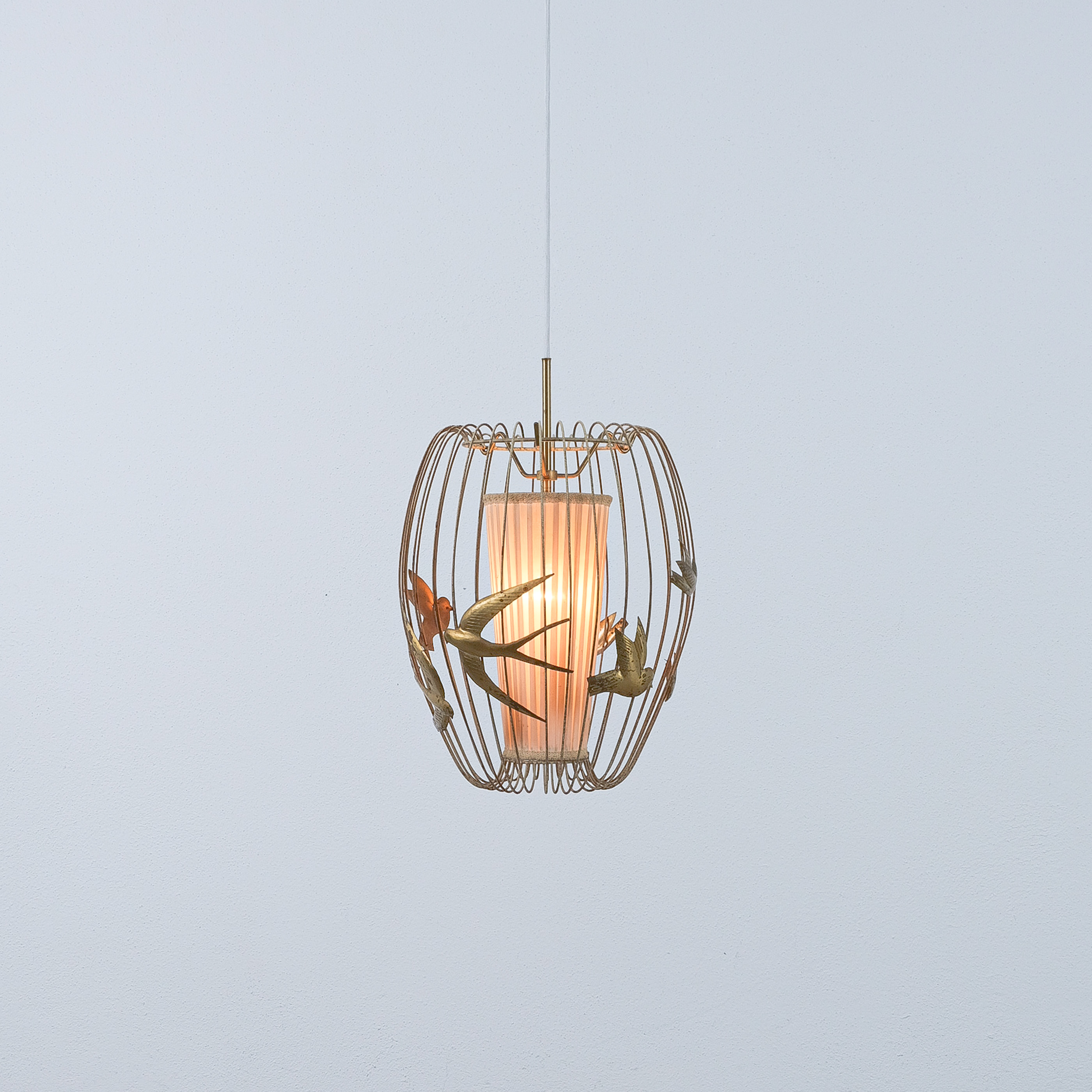 This light rarely pops up in the retail market and has a magical playfulness to it. The detailed birds flying out side a cage and still being present in the play of light and shadow. It consist of a brass frame from brass, lacquered white. The lacquer shows signs of wear, patina and rub-offs. (we can restore it if requested). The inner textile screen we left untouched though it has some minor holes in it, however it's the original shade with the original label. It takes one bulbs e26/27; we recommend Led's du to less heat emission. The shade can also be repaired or replaced, at this point we limited the restoration at cleaning and rewiring to preserve as much of its originality as possible.