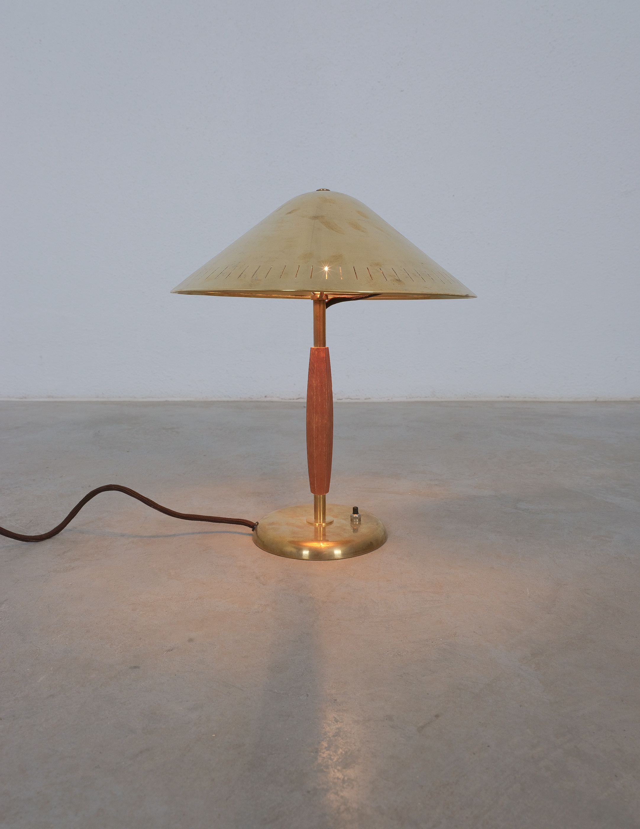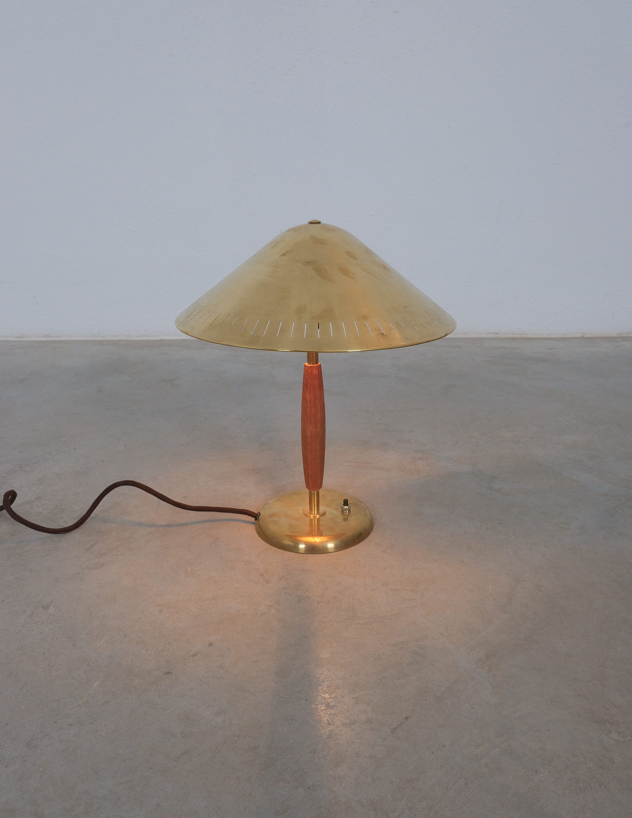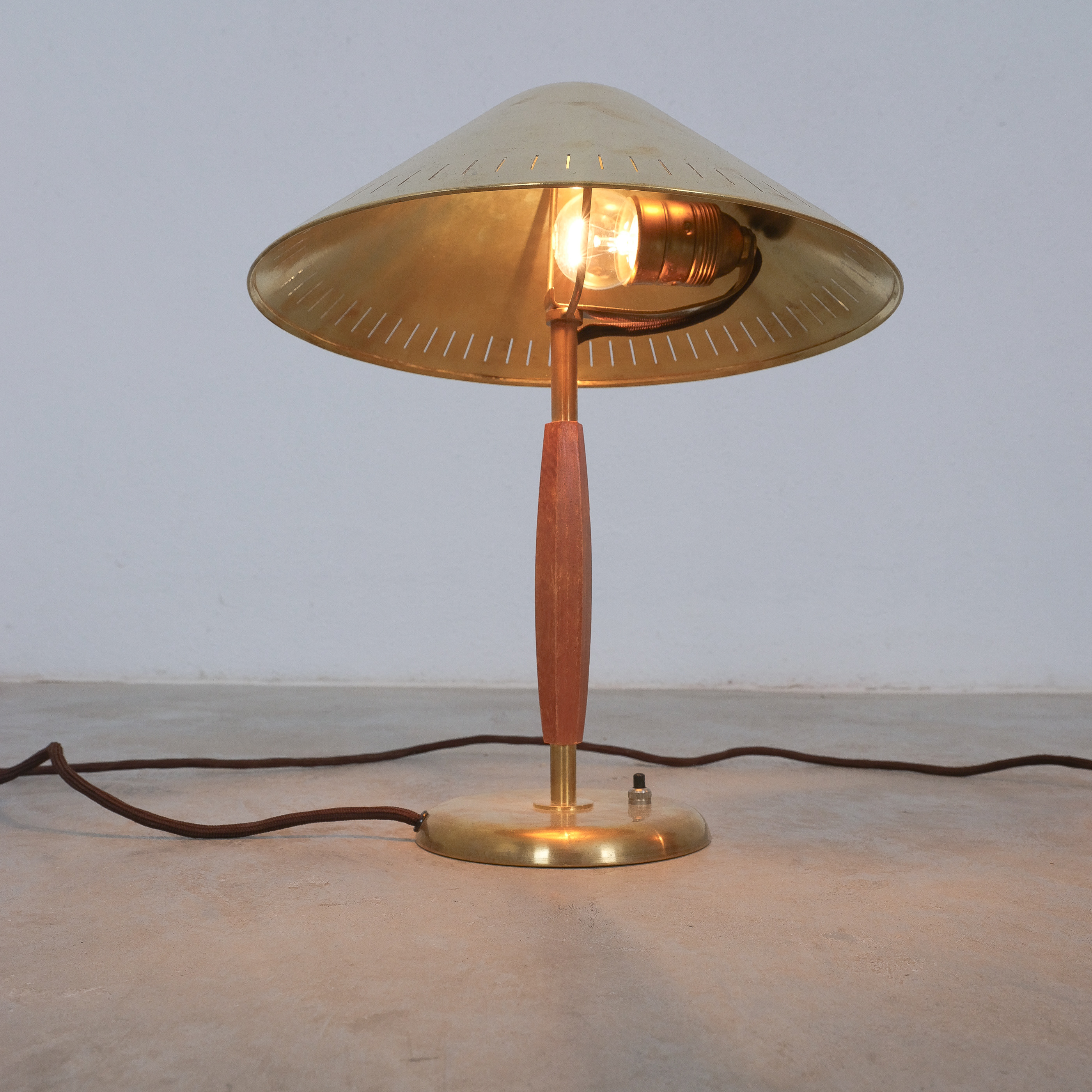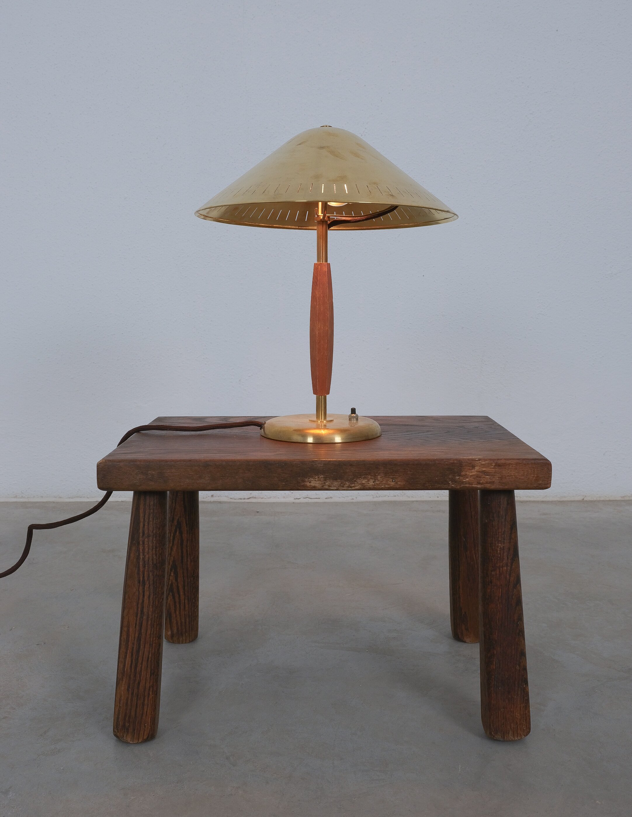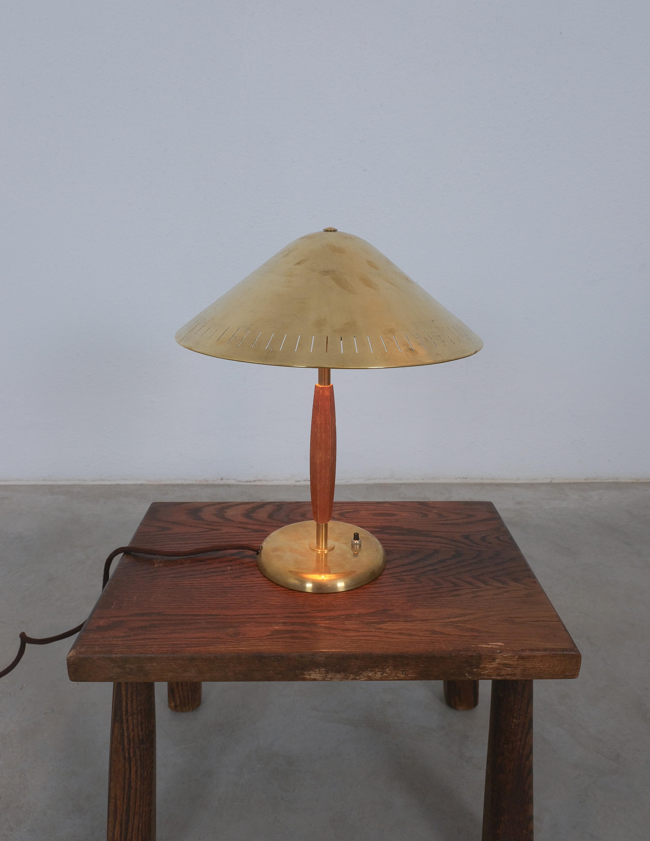 A brass and elm-wood table lamp, model 15296, marked at the bottom, produced by Arvid Böhlmarks Lampfabrik, Sweden, c. 1940s.