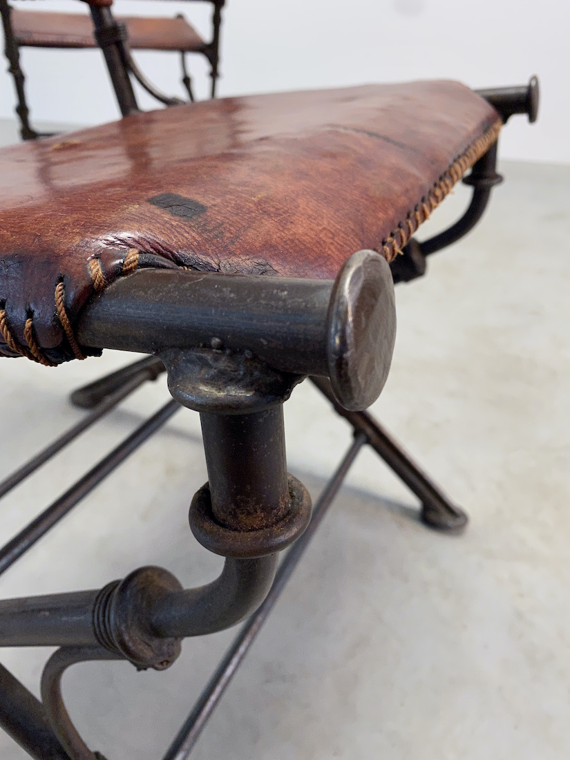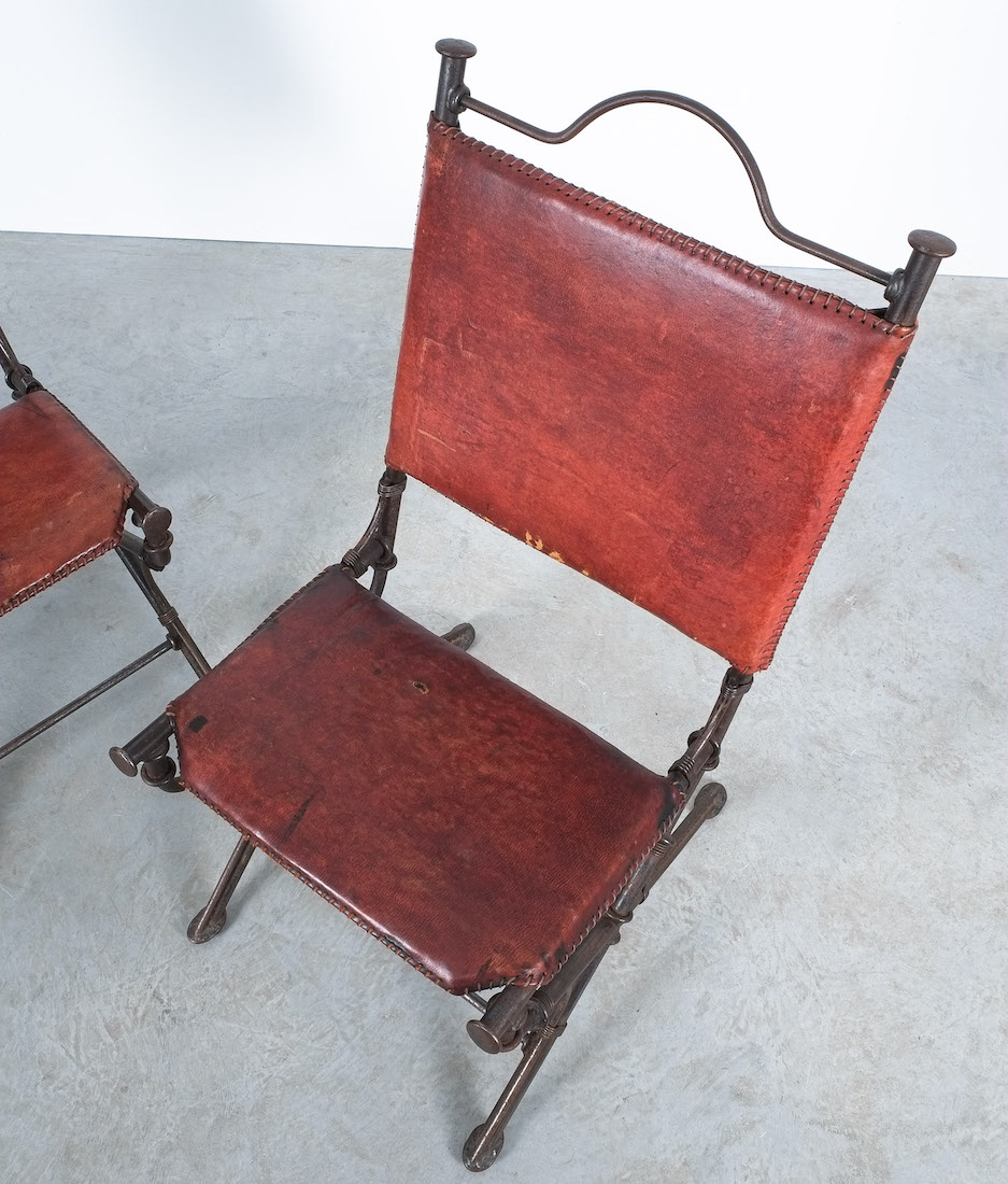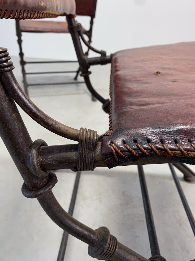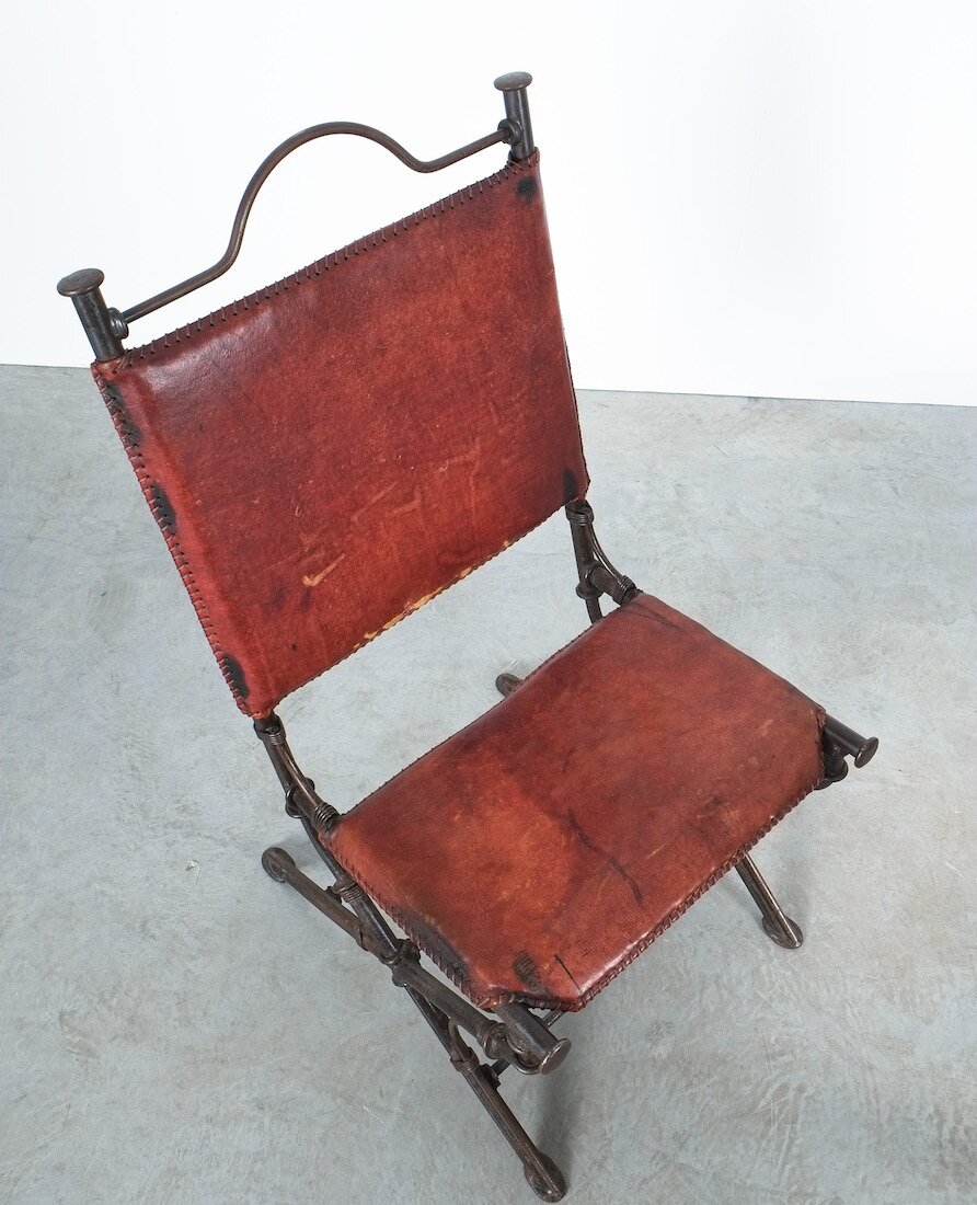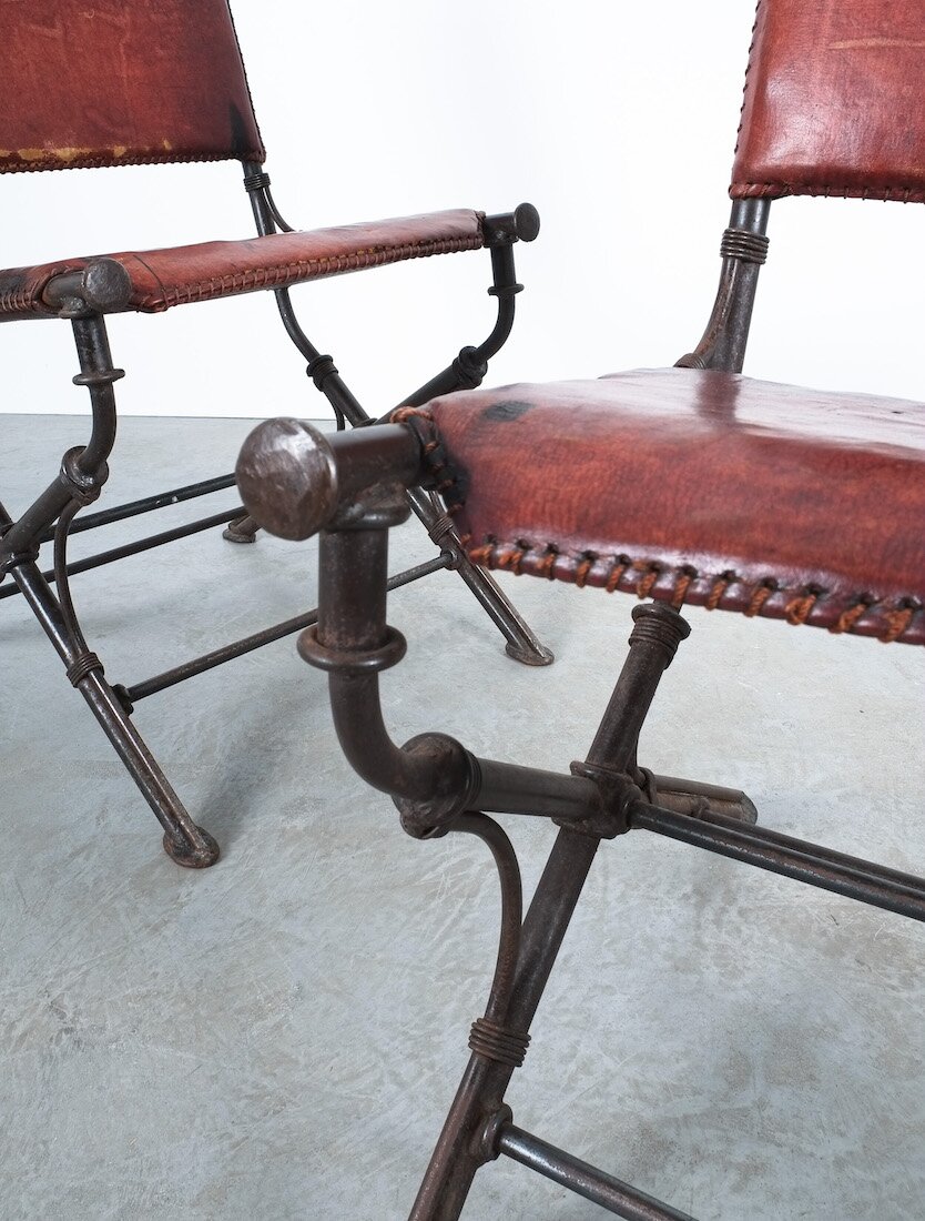 Nice iron and leather chair in a 19th garden folding chair manner. It's in fact a sturdy heavy 12,5kg per chair and carefully manufactured. Great quality thick leather with a stitched seam and wonderful patina.