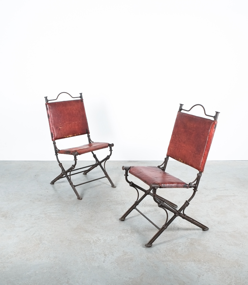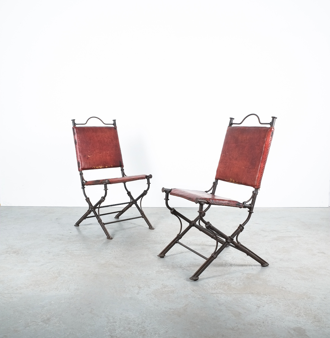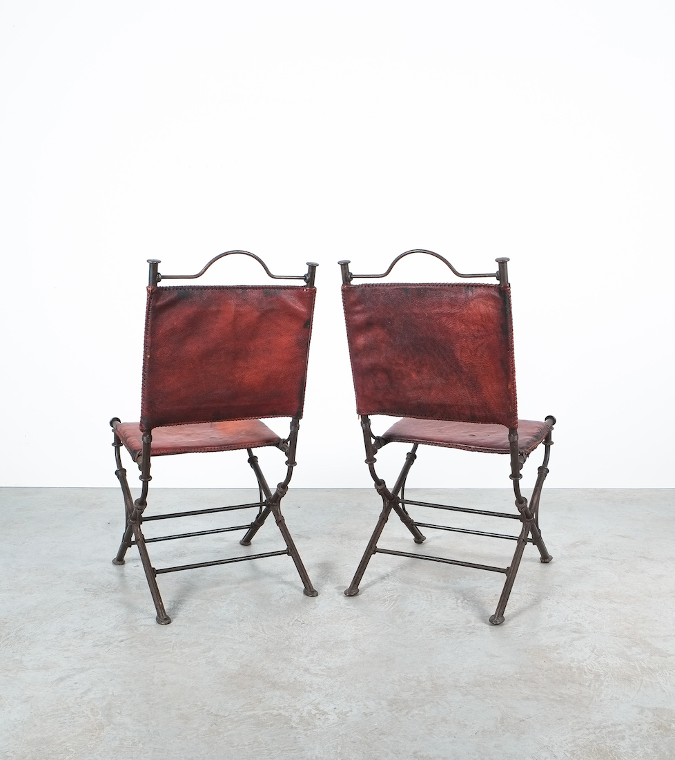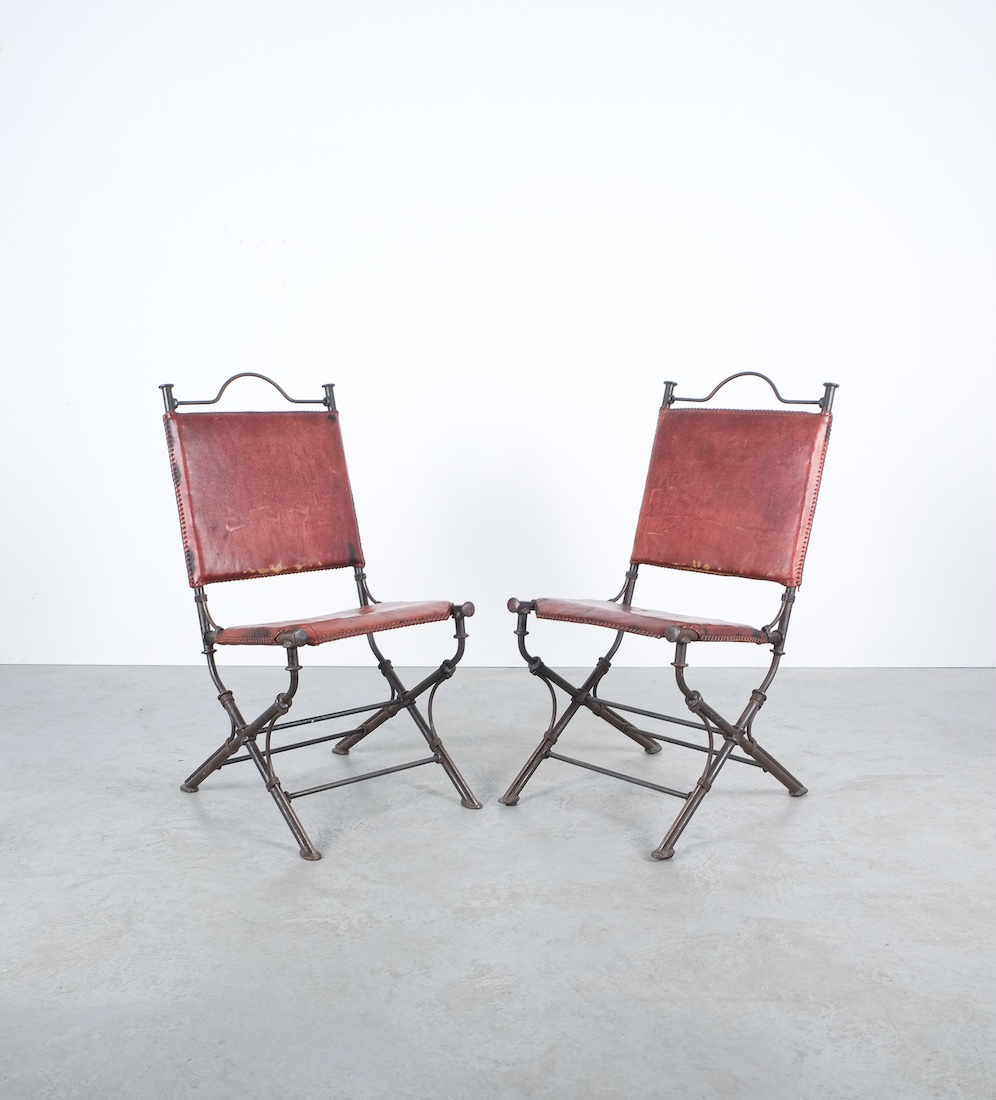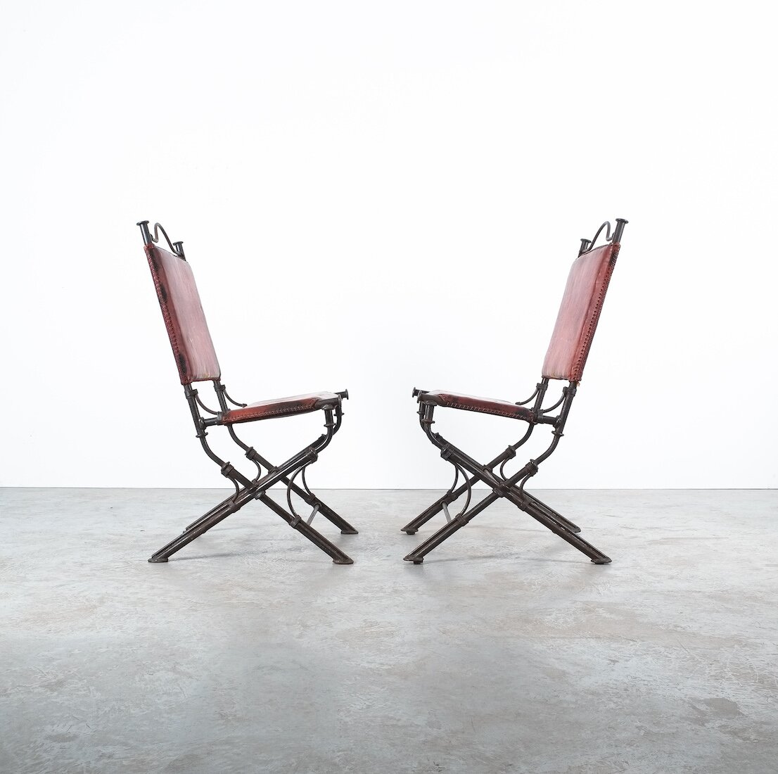 Nice iron and leather chair in a 19th garden folding chair manner. It's in fact a sturdy heavy 12,5kg per chair and carefully manufactured. Great quality thick leather with a stitched seam and wonderful patina.