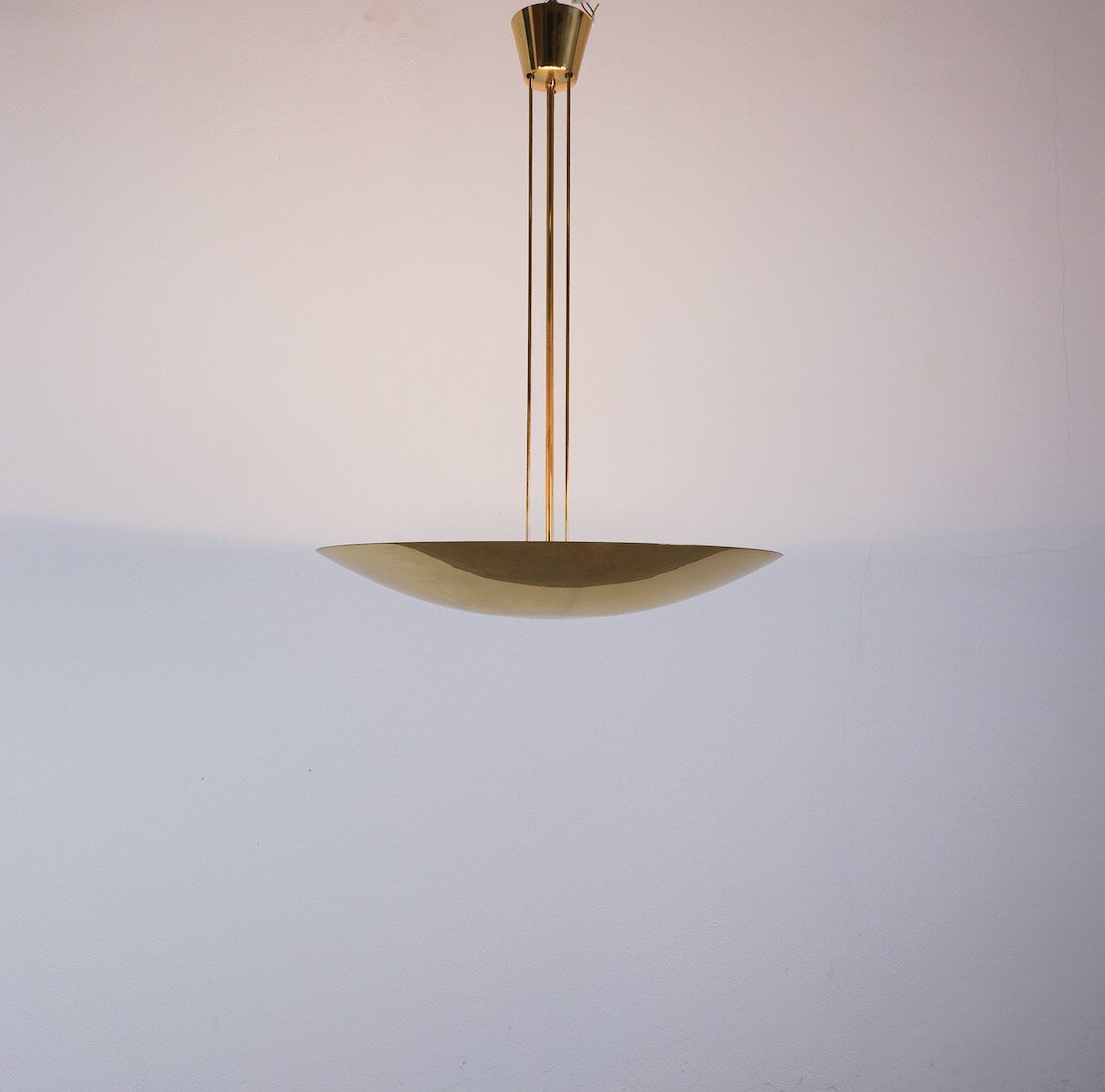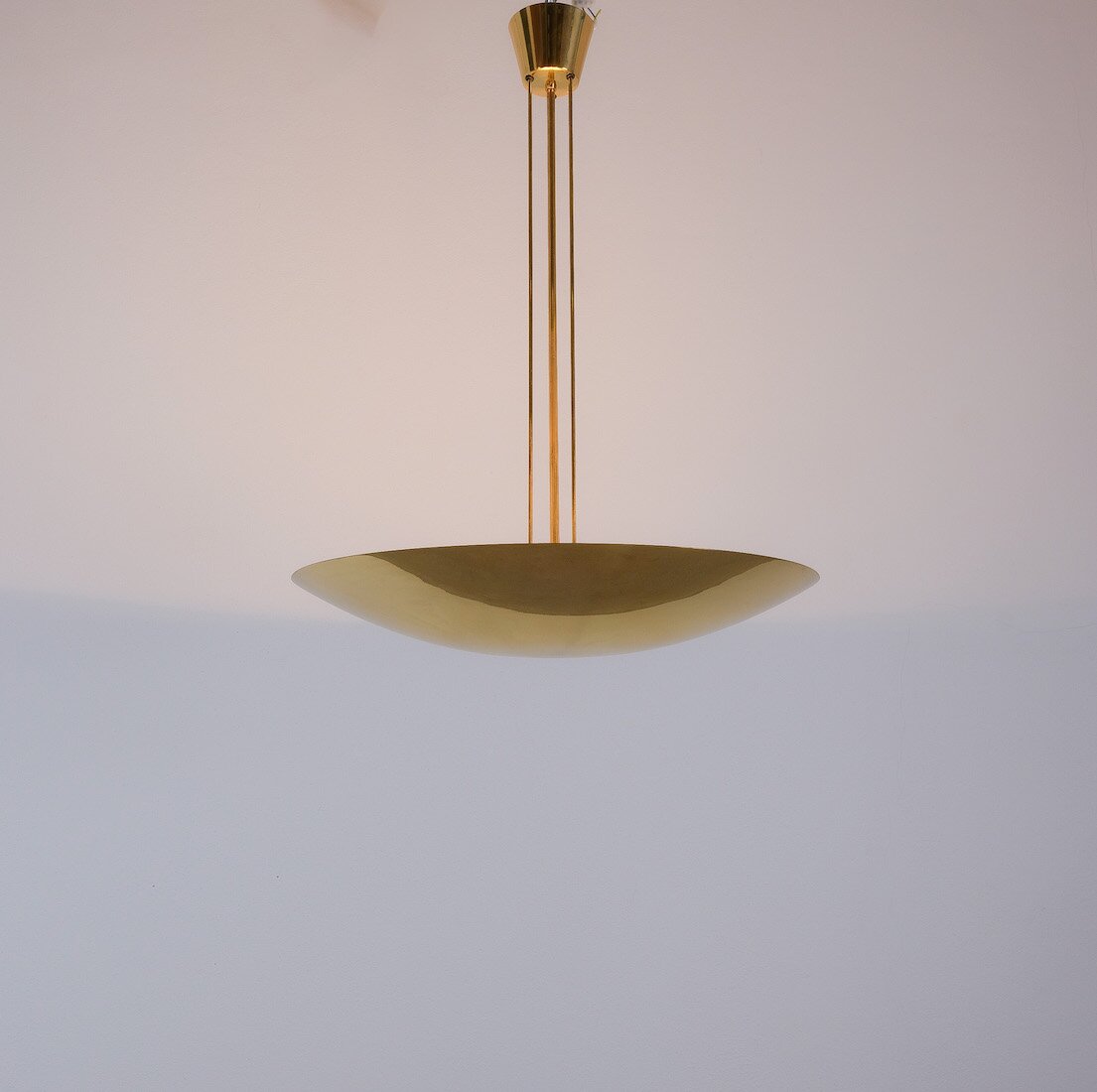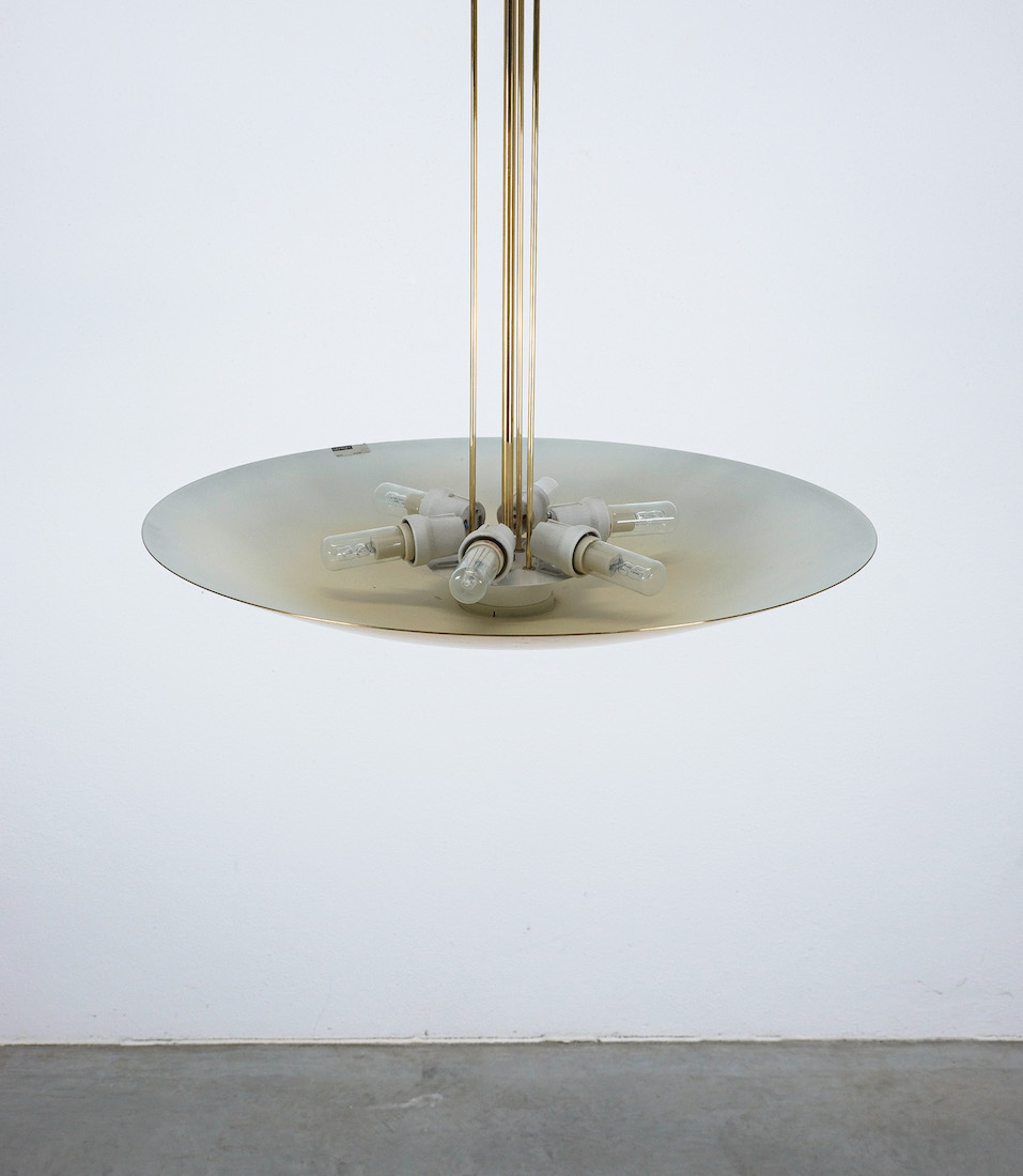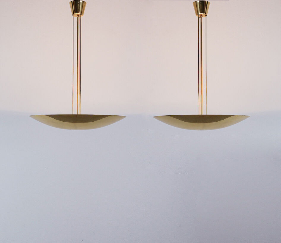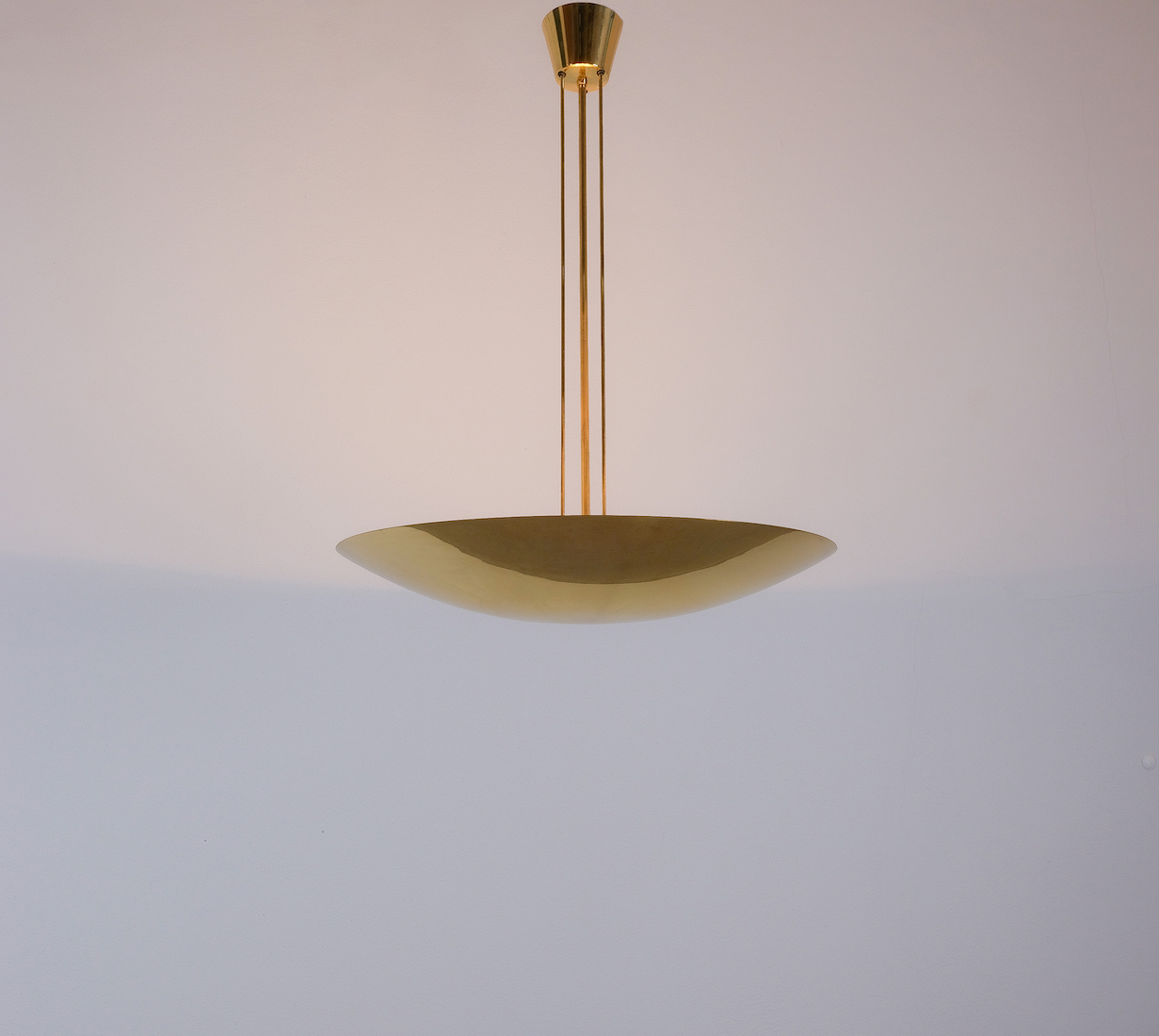 Consisting of a single brass dish basically this light is all about passiv lighting. 6 bulbs with up to 900W in total flood the ceiling with light and reflect it back covering the environment evenly in a wonderful light. The two ceiling lamps are in very well-preserved shape, with no damages and a beautiful golden patina (lacquered against tarnishing). Perfectly suited for hanging in a hallway or larger rooms. It can equipped with six bulbs e26/27 (150W per bulb max). It has been tested and will be working in the US as well as in Europe.