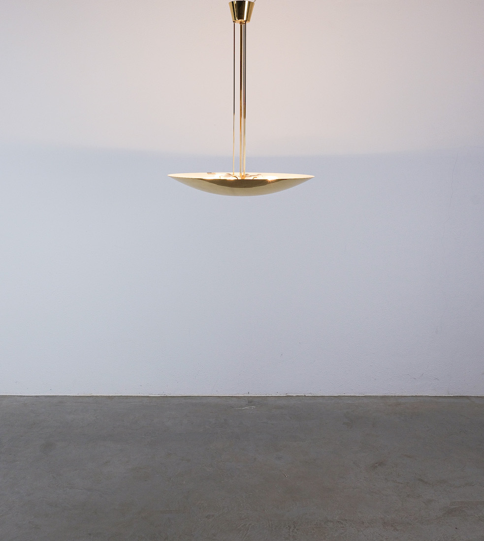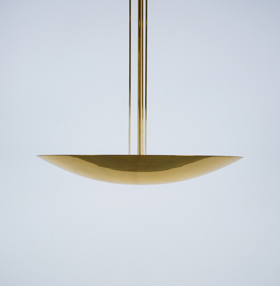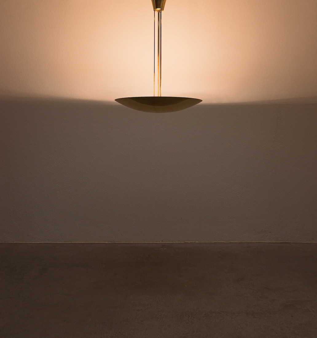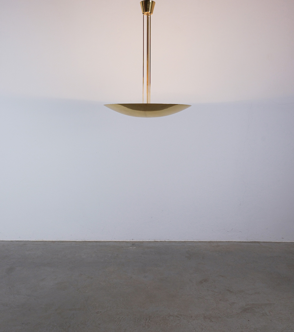 Consisting of a single brass dish basically this light is all about passiv lighting. 6 bulbs with up to 900W in total flood the ceiling with light and reflect it back covering the environment evenly in a wonderful light. The two ceiling lamps are in very well-preserved shape, with no damages and a beautiful golden patina (lacquered against tarnishing). Perfectly suited for hanging in a hallway or larger rooms. It can equipped with six bulbs e26/27 (150W per bulb max). It has been tested and will be working in the US as well as in Europe.