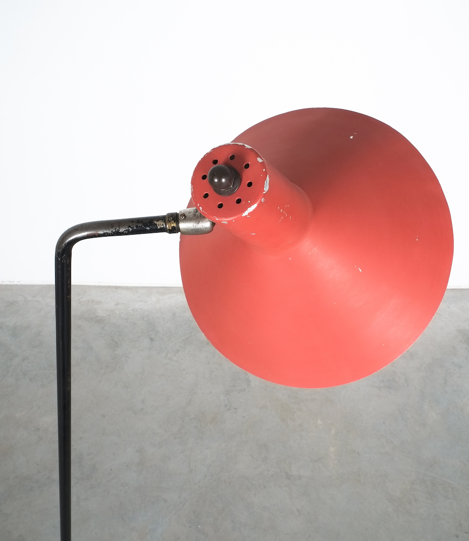 Comprised of brass, lacquered brass and iron and red painted aluminum this lamp a beautiful example of Dutch design from the 1950.